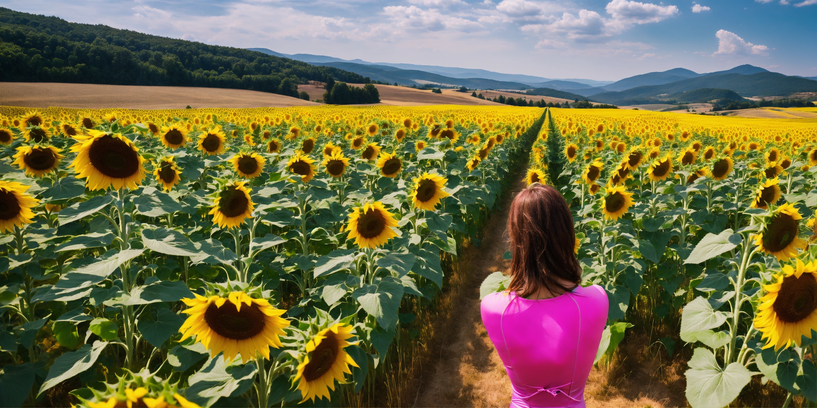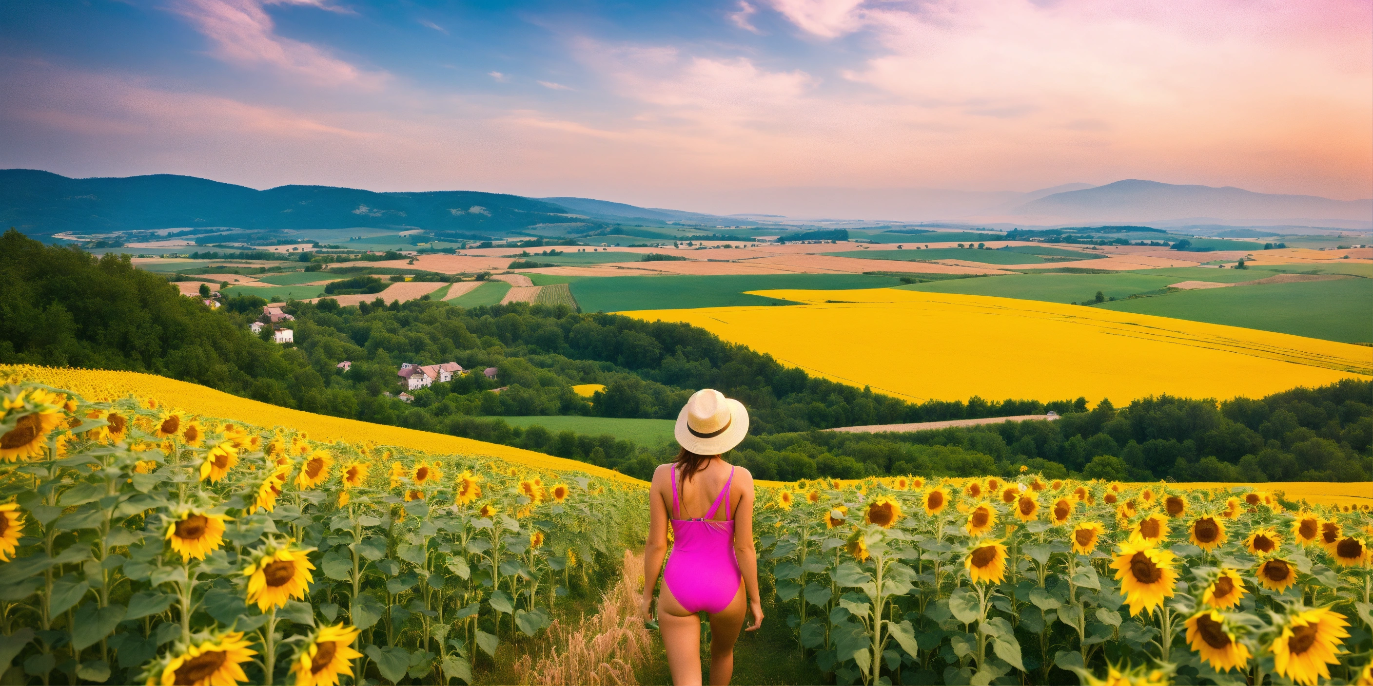Lady in a pink swimming suit watching on many field of wheat and sunflowers from the top of a high mountains