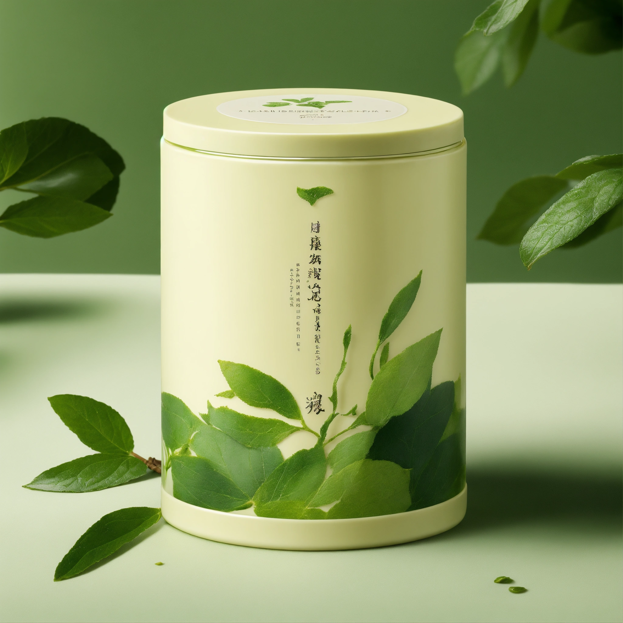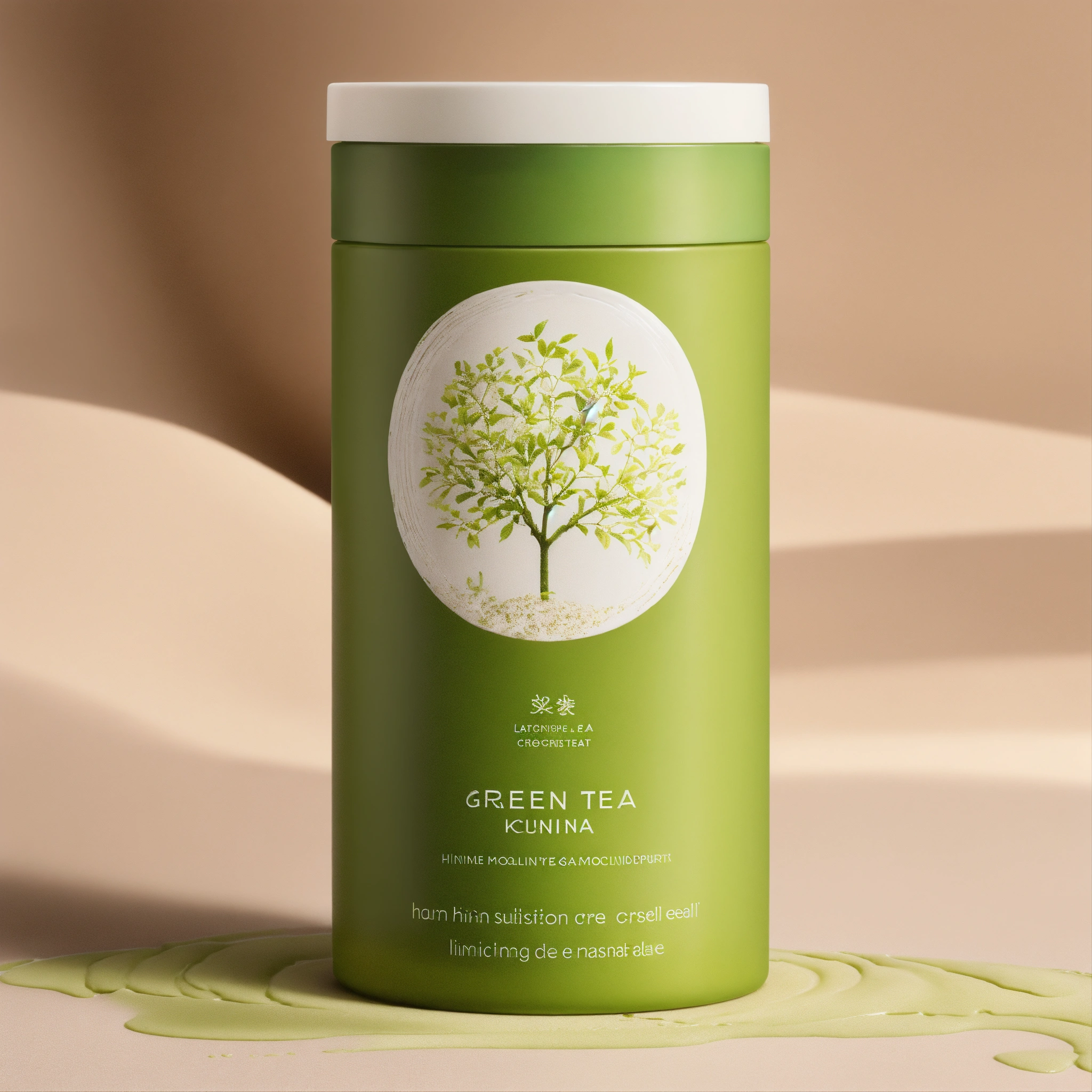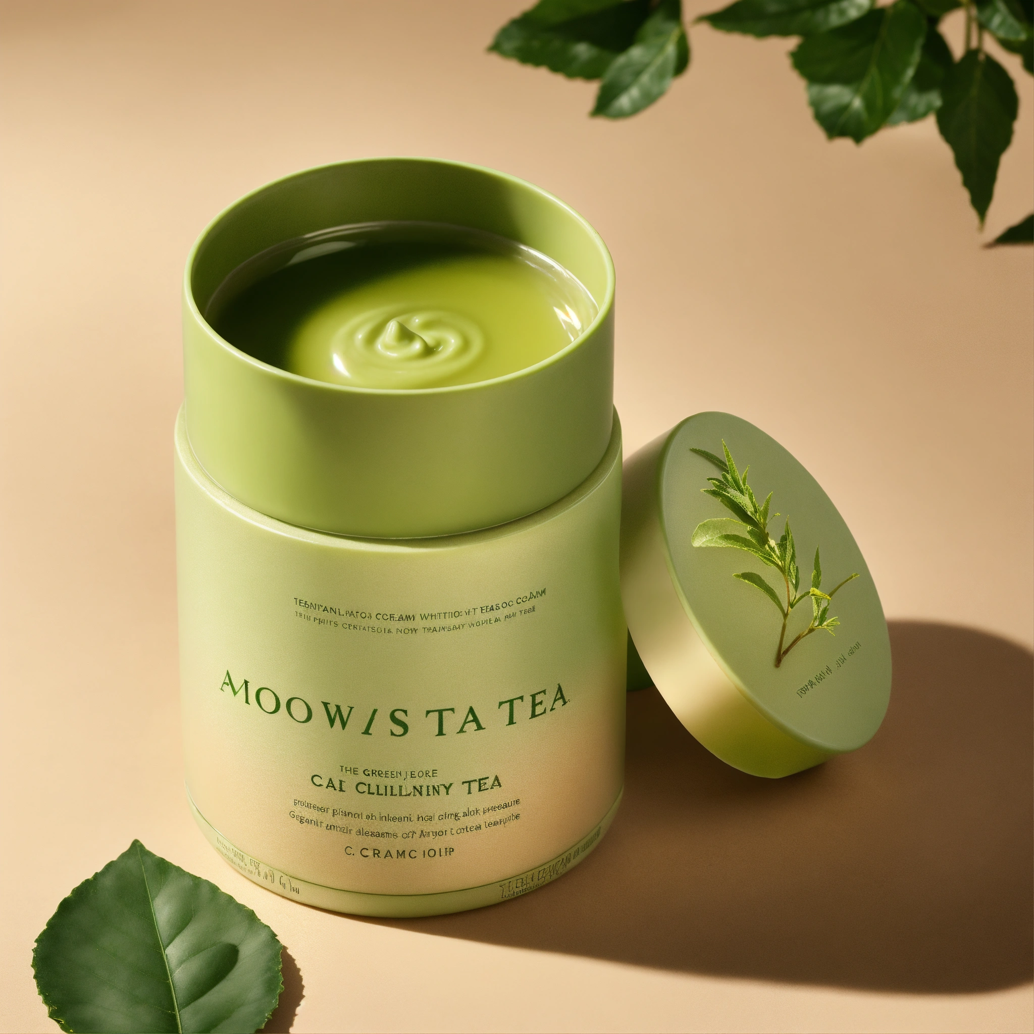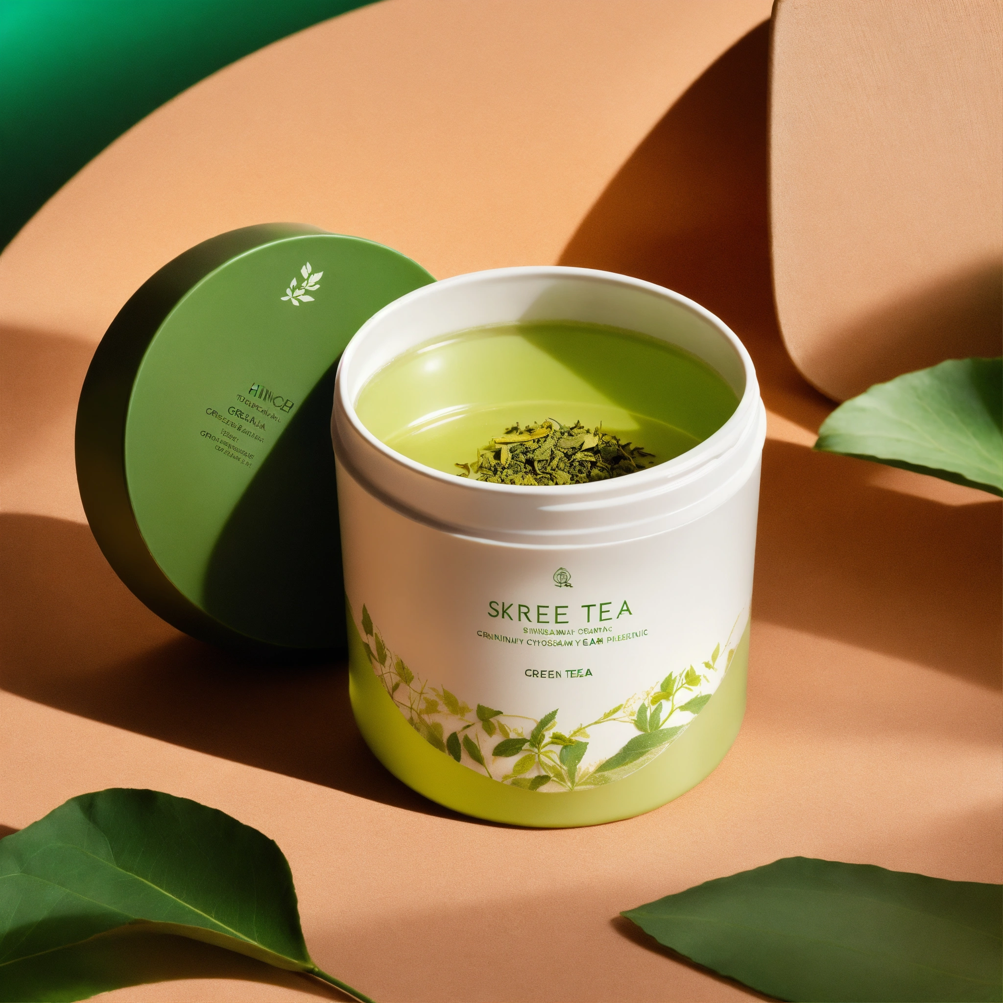 The image should showcase a skincare cream container, possibly cylindrical or in a subtle organic shape, to align with the green tea concept. the primary colors should be white, for purity, and shades of green, representing green tea leaves. perhaps there could be delicate illustrations or imprints of green tea leaves on the packaging. the product label should emphasize that it's inspired by or contains green tea extracts. the lighting should be soft and even, casting minimal shadows to ensure that the product stands out against the white backdrop. the texture of the cream could be slightly visible, either through a translucent section of the packaging or by depicting a small amount of the product outside of its container, hinting at its creamy and soothing nature.