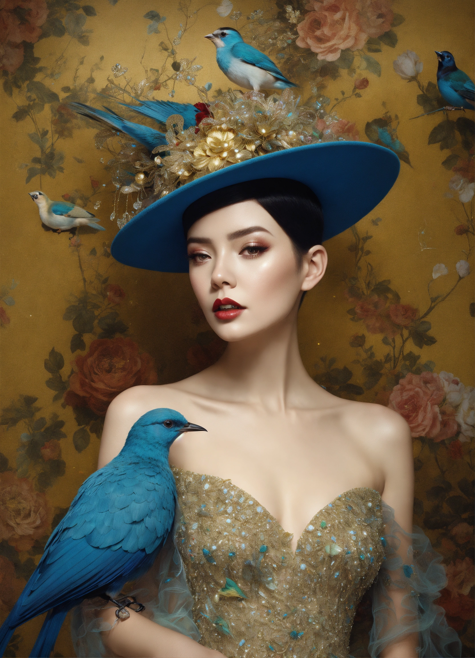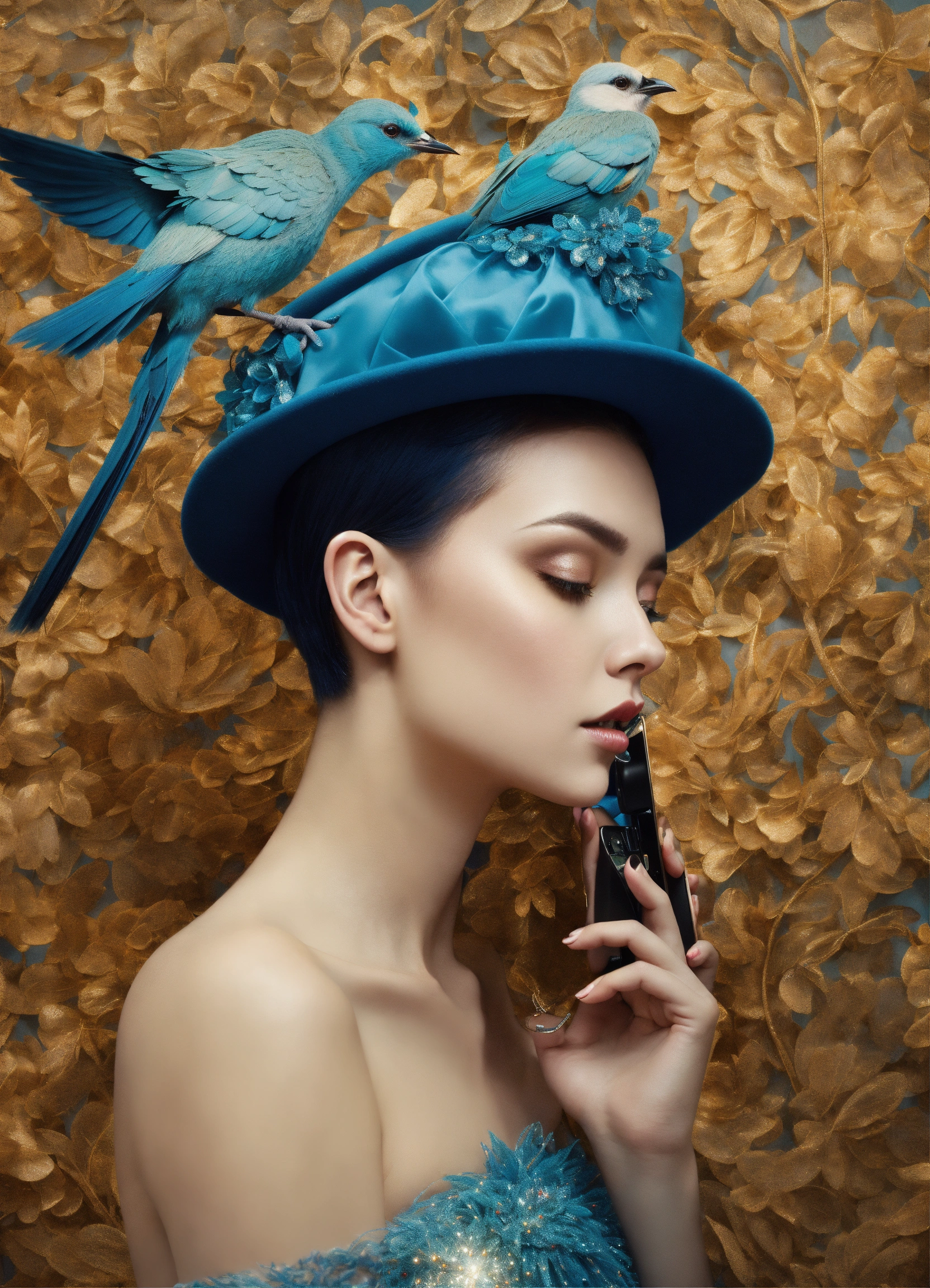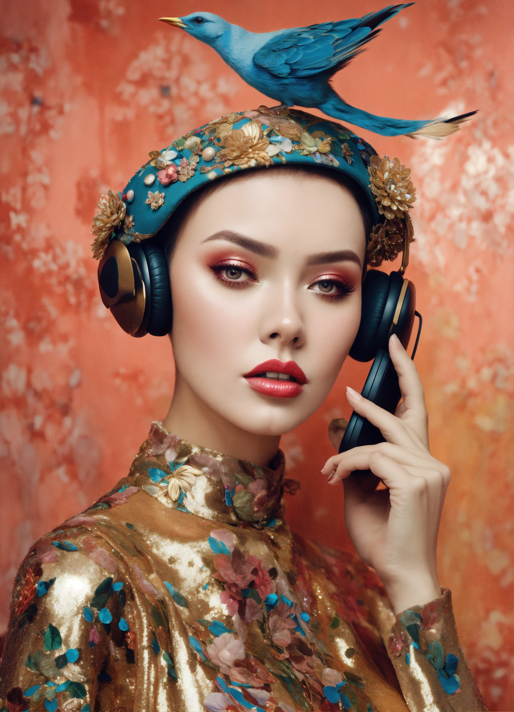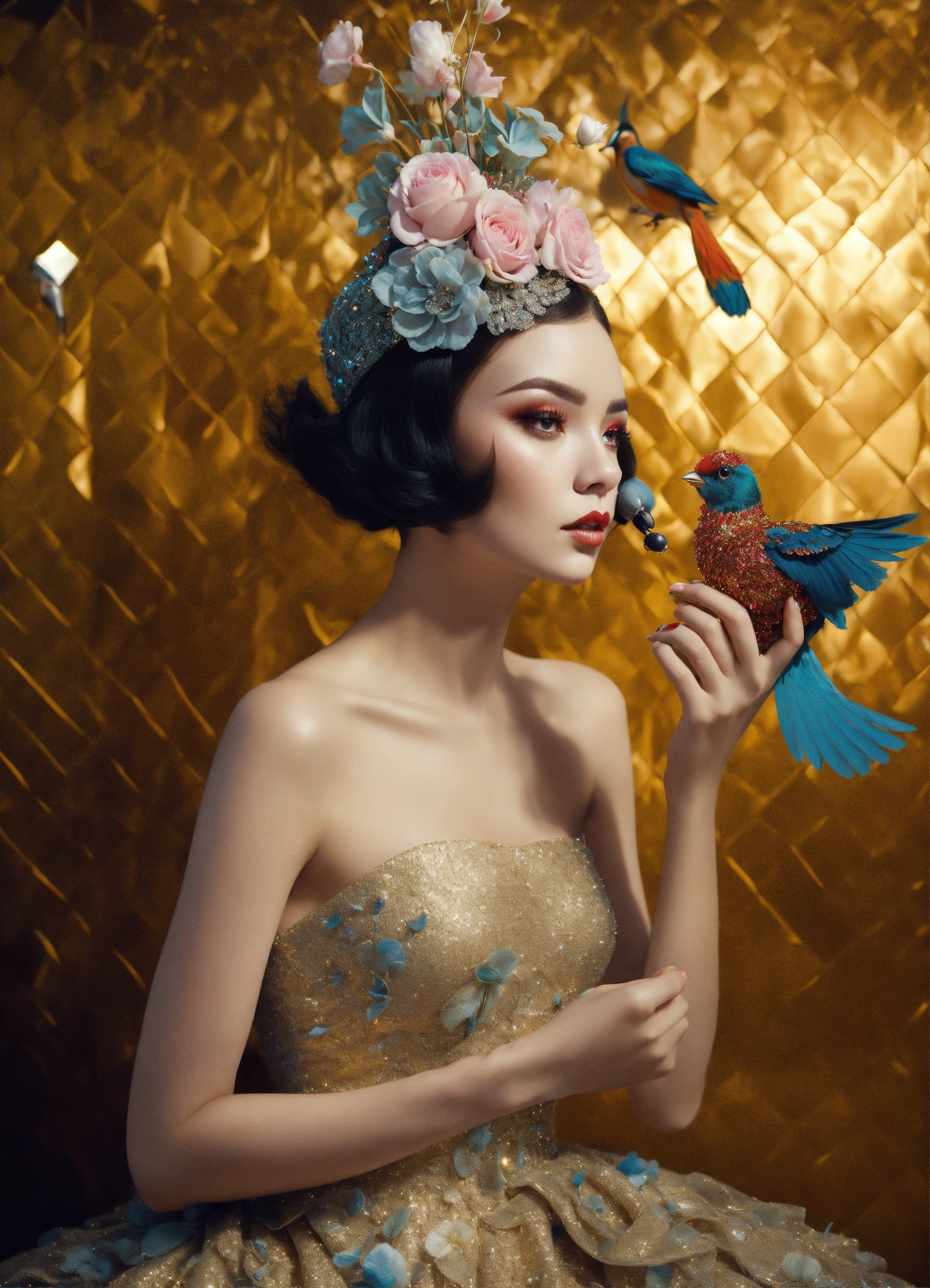 Front profile half body collage, in a shooting studio, a modele woman with short hair, in a sparkly gown and hear phone hat, bird's eye view, art by sergio lopez, natalie shau, james jean and salvador dali