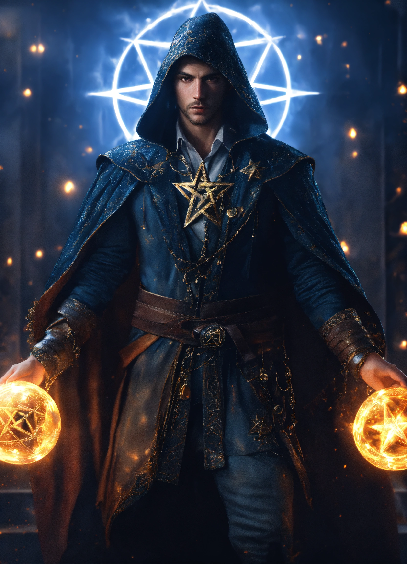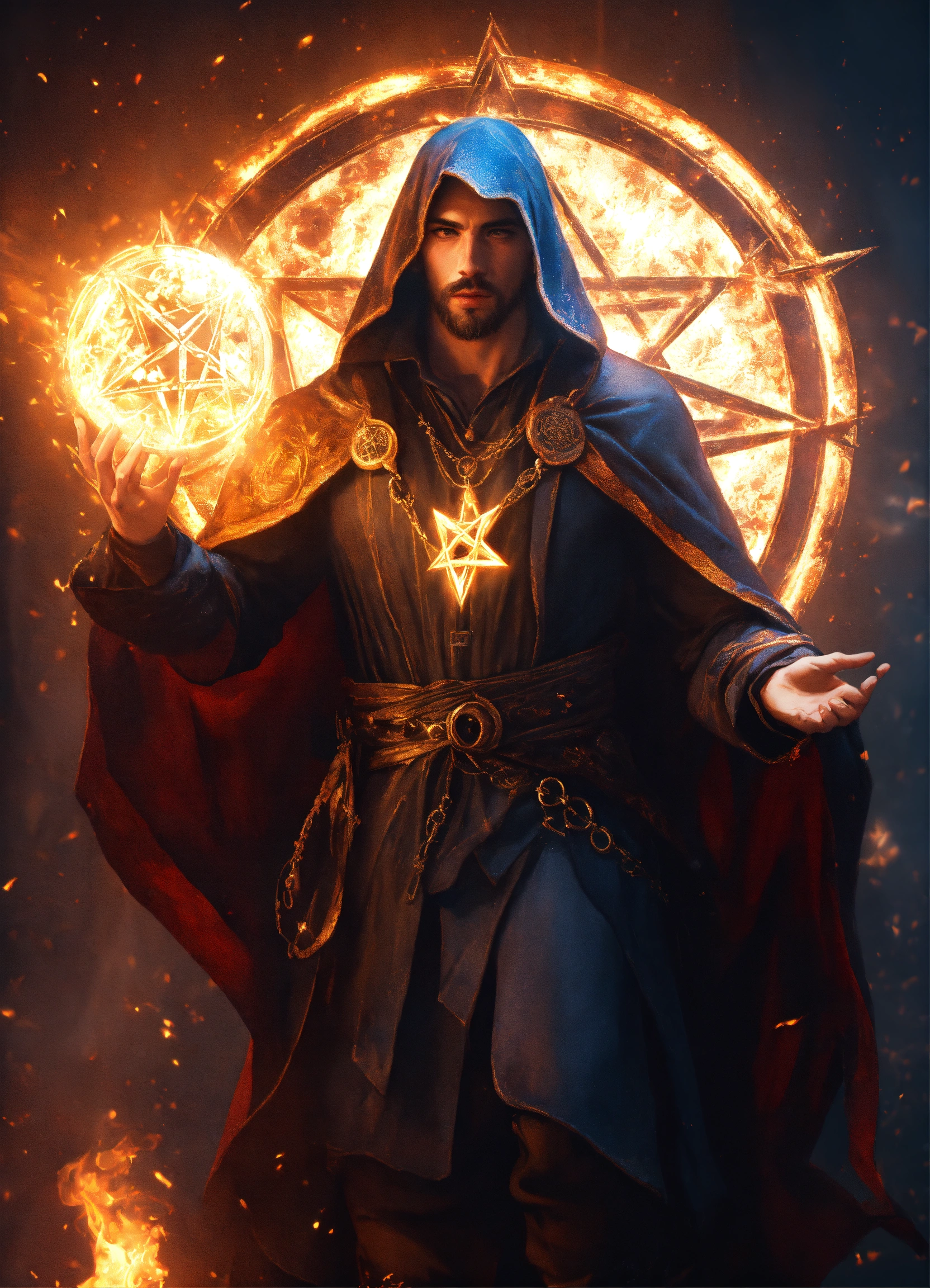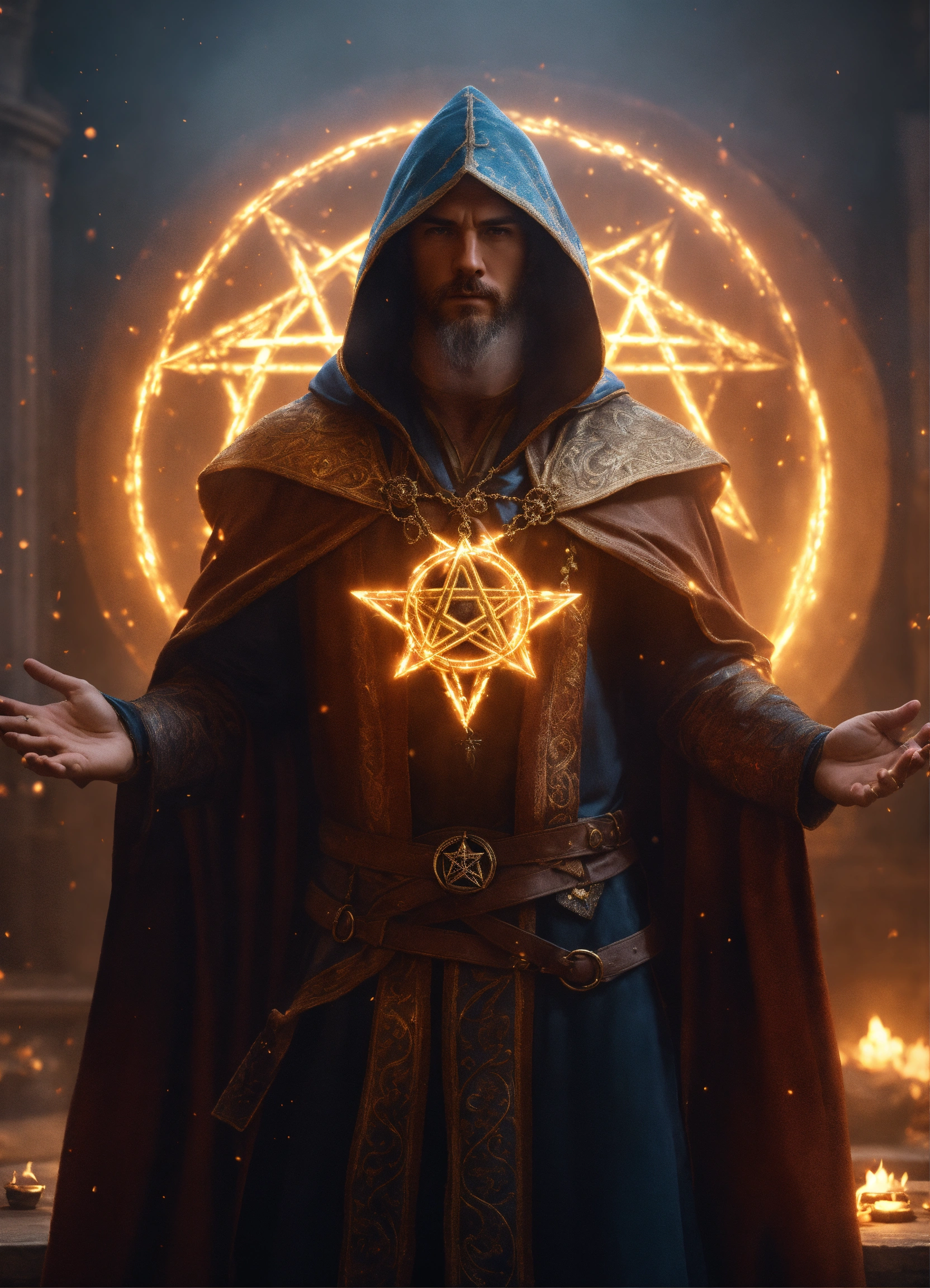 A realistic full body portrait of a powerful male sorcerer, mighty arcane magic, pentagram, neutral background, moody, photorealistic, cinematic scene, super detailed, hyper realistic, bright lights, 8 k
