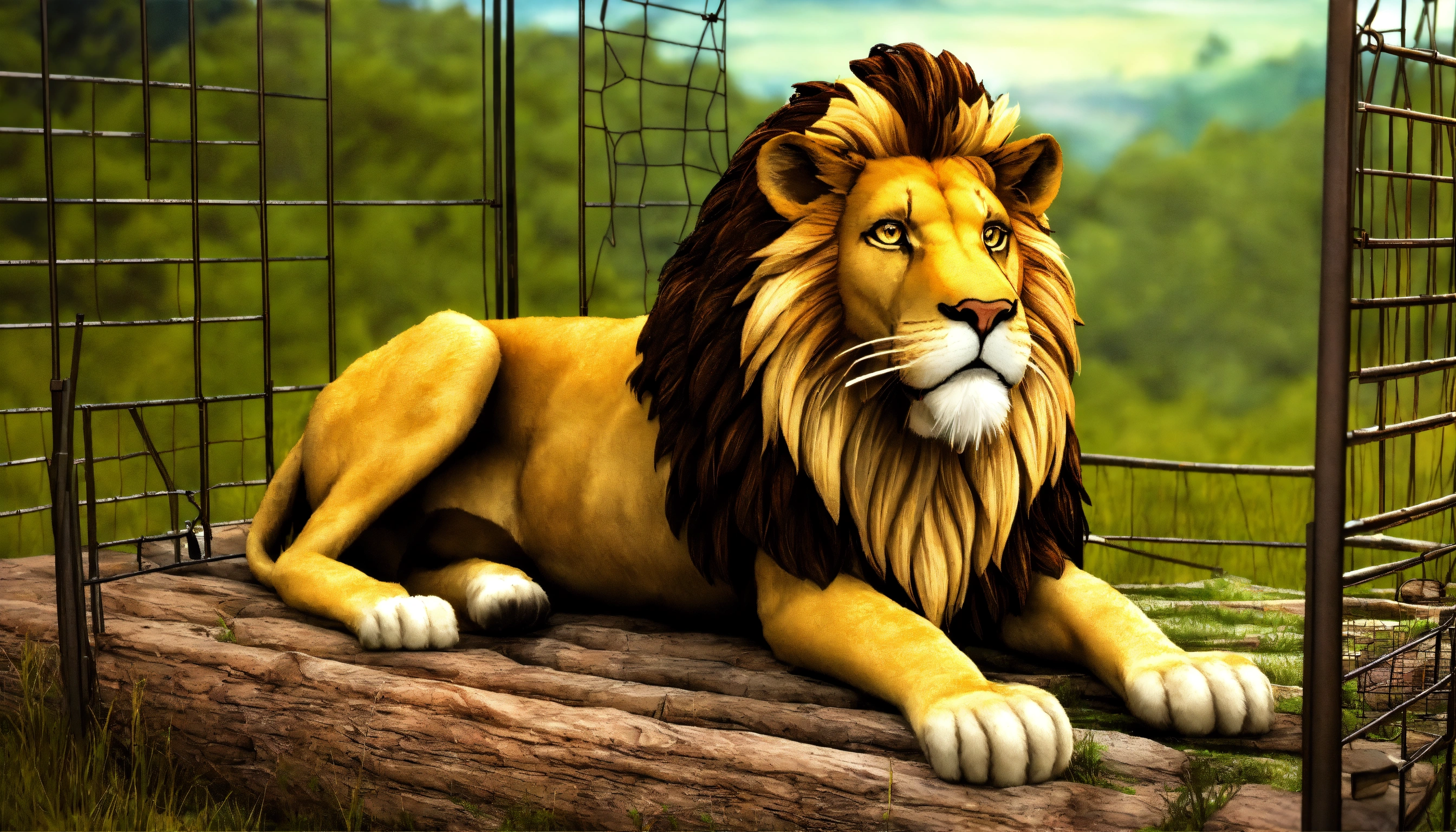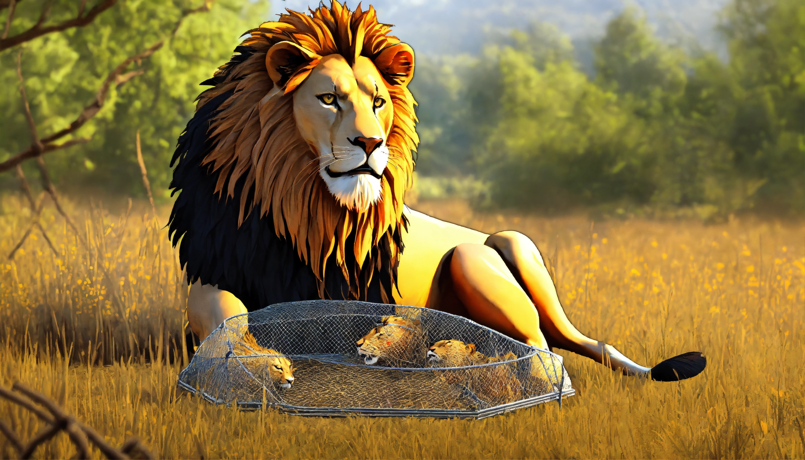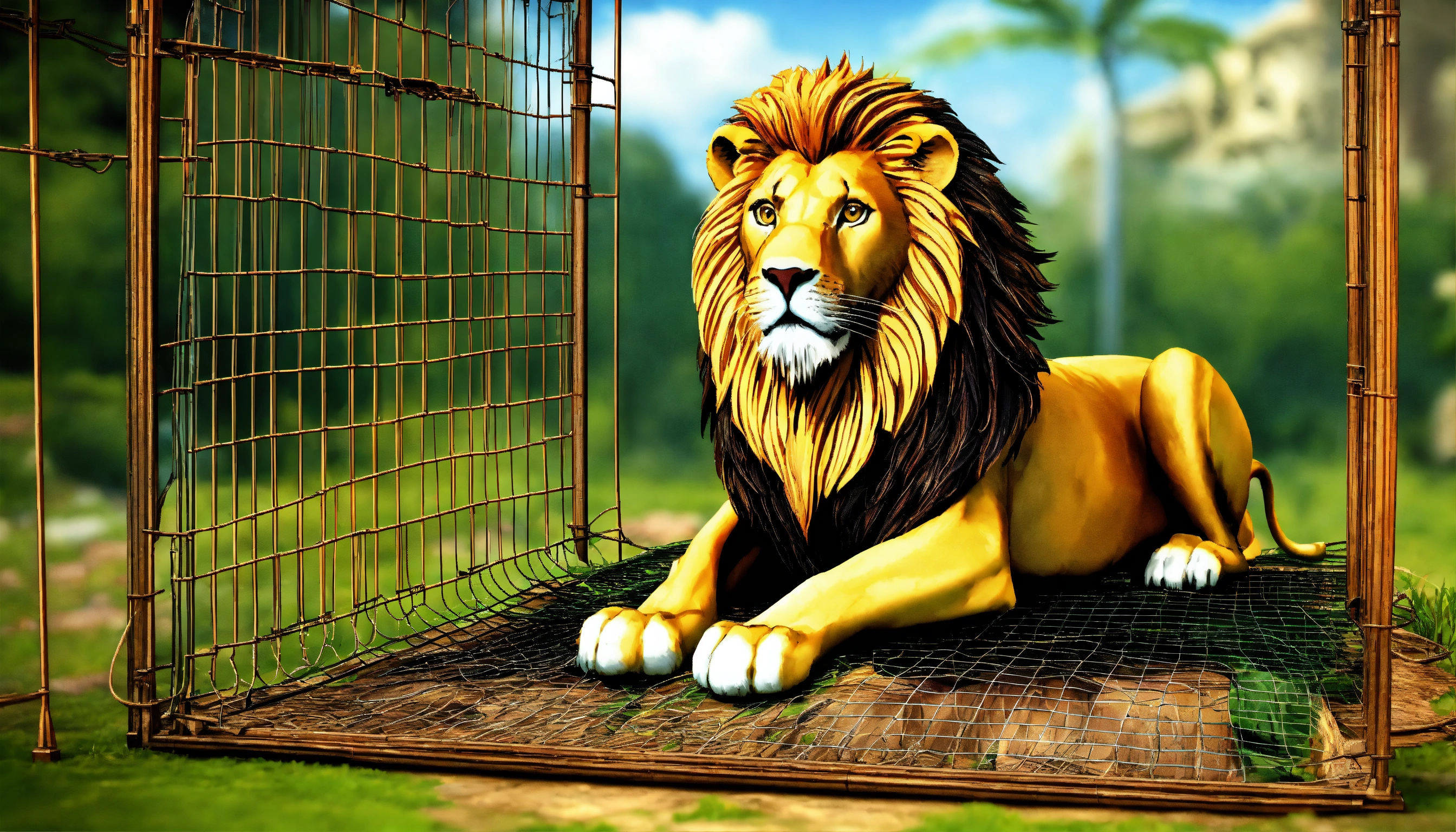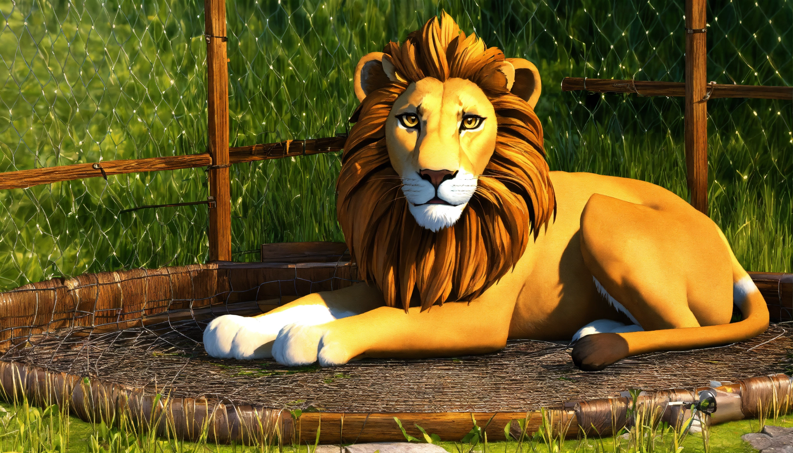 Generate an image of the lion in a hunter's net trap ", 3d pictures, storybook illustration, digital art, professional, high quality, detailed.
