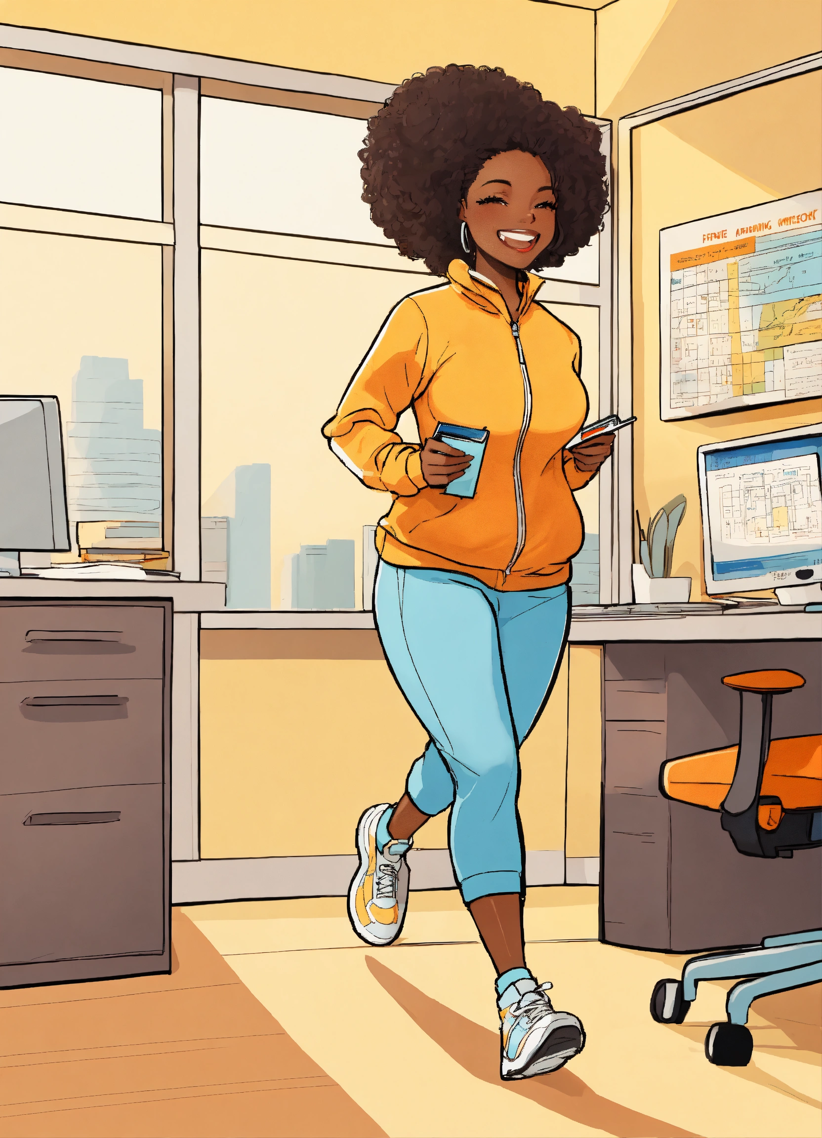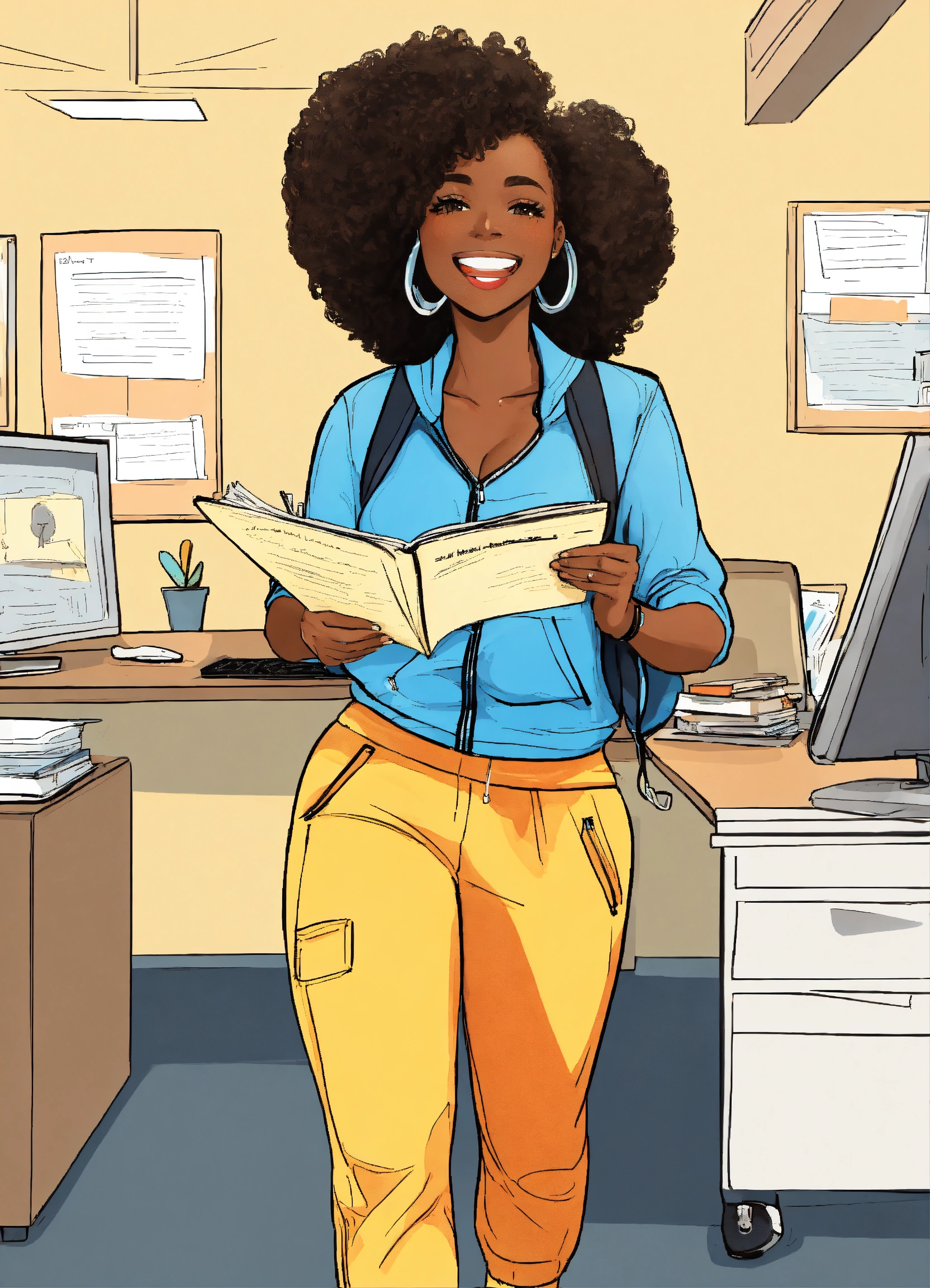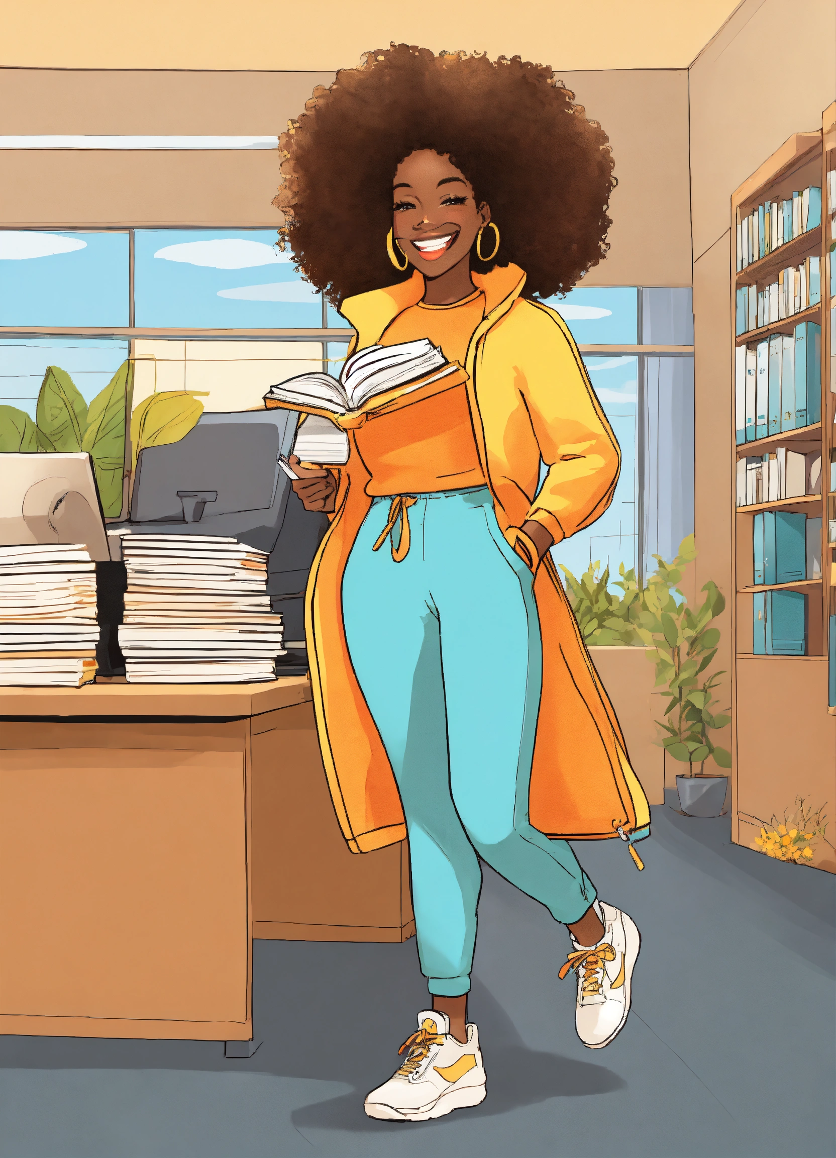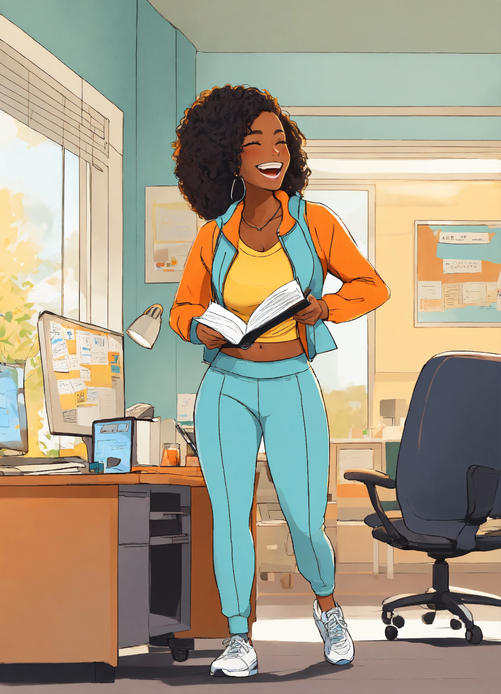 Illustrated cartoon cheerful african american woman with a big smile jogging suit and pastel blue yellow and orange black whitewriting in a journal in an office setting high detail illustration for book