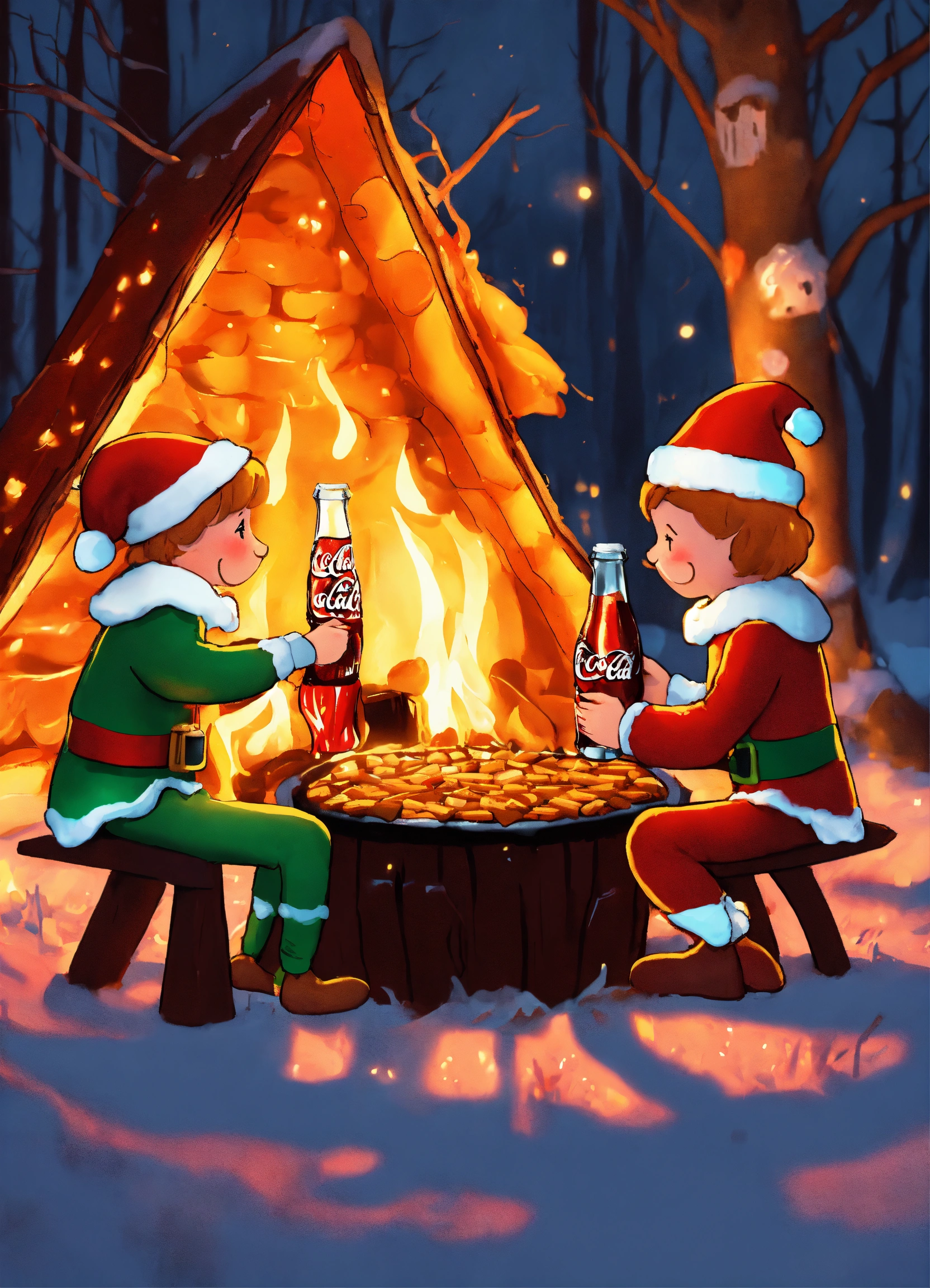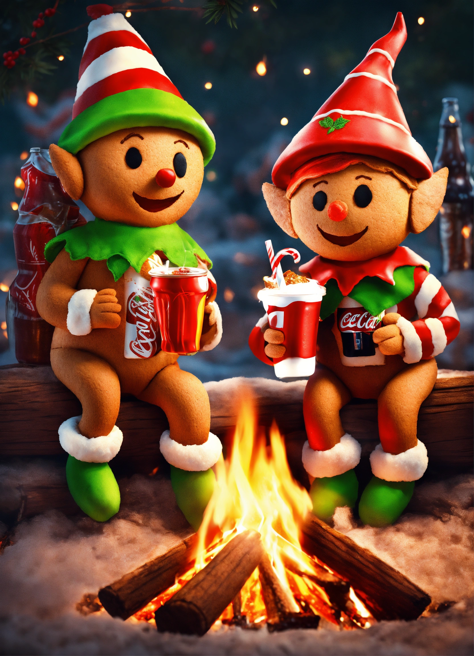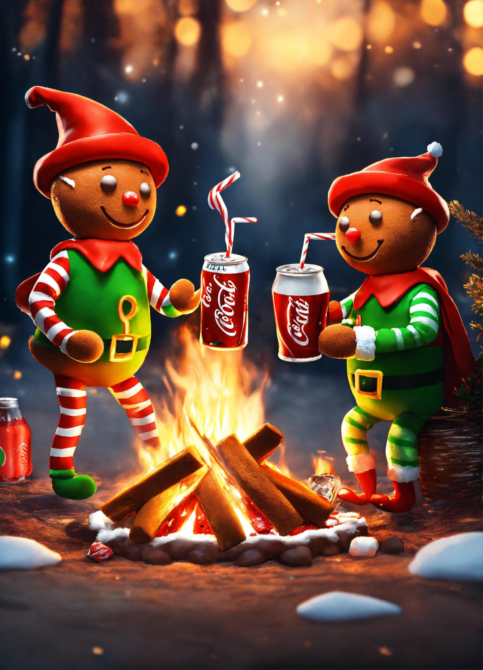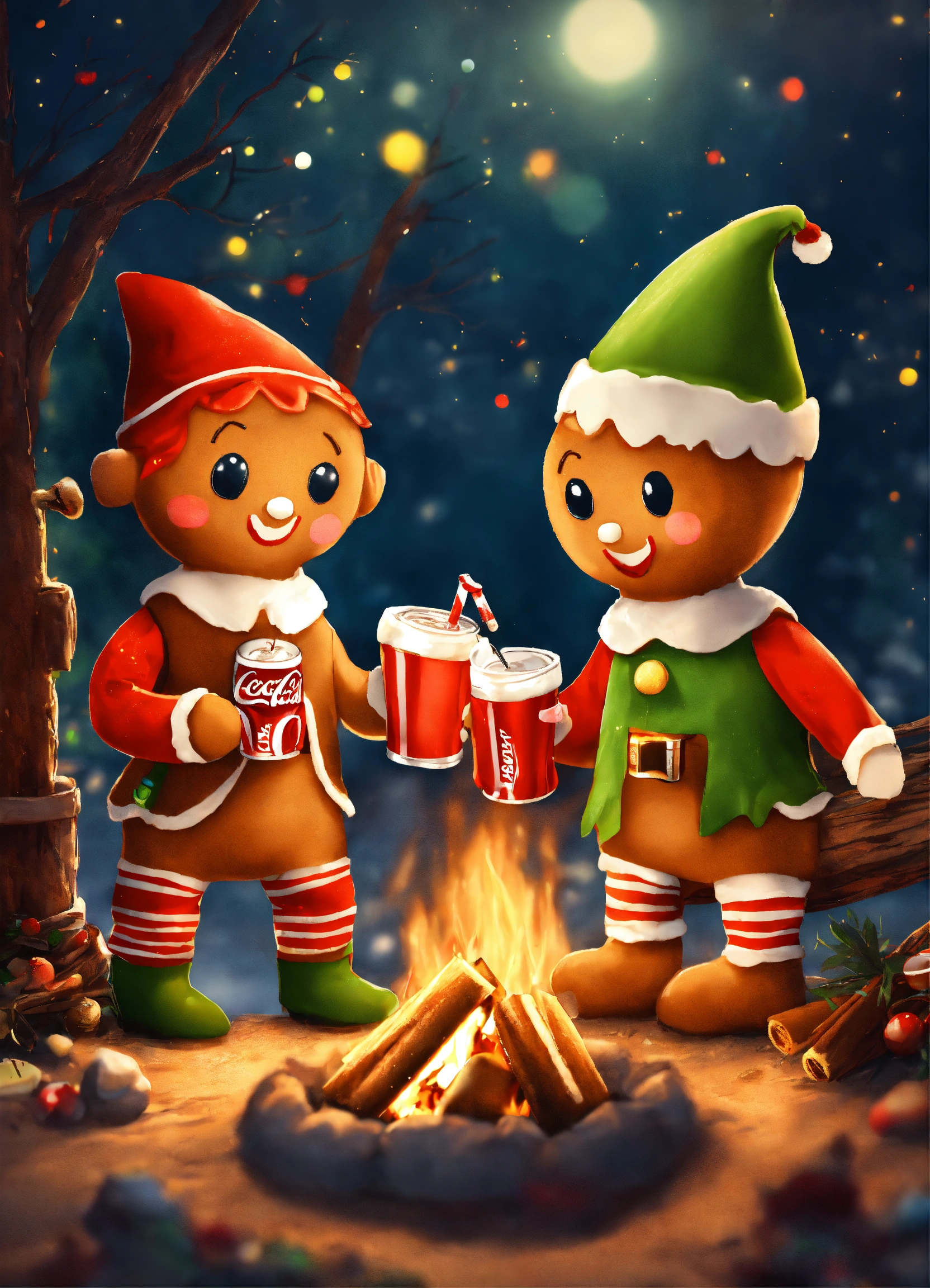 Funny couple of gingerbread man and elf drinking cocacola around a bonfire digital illustration