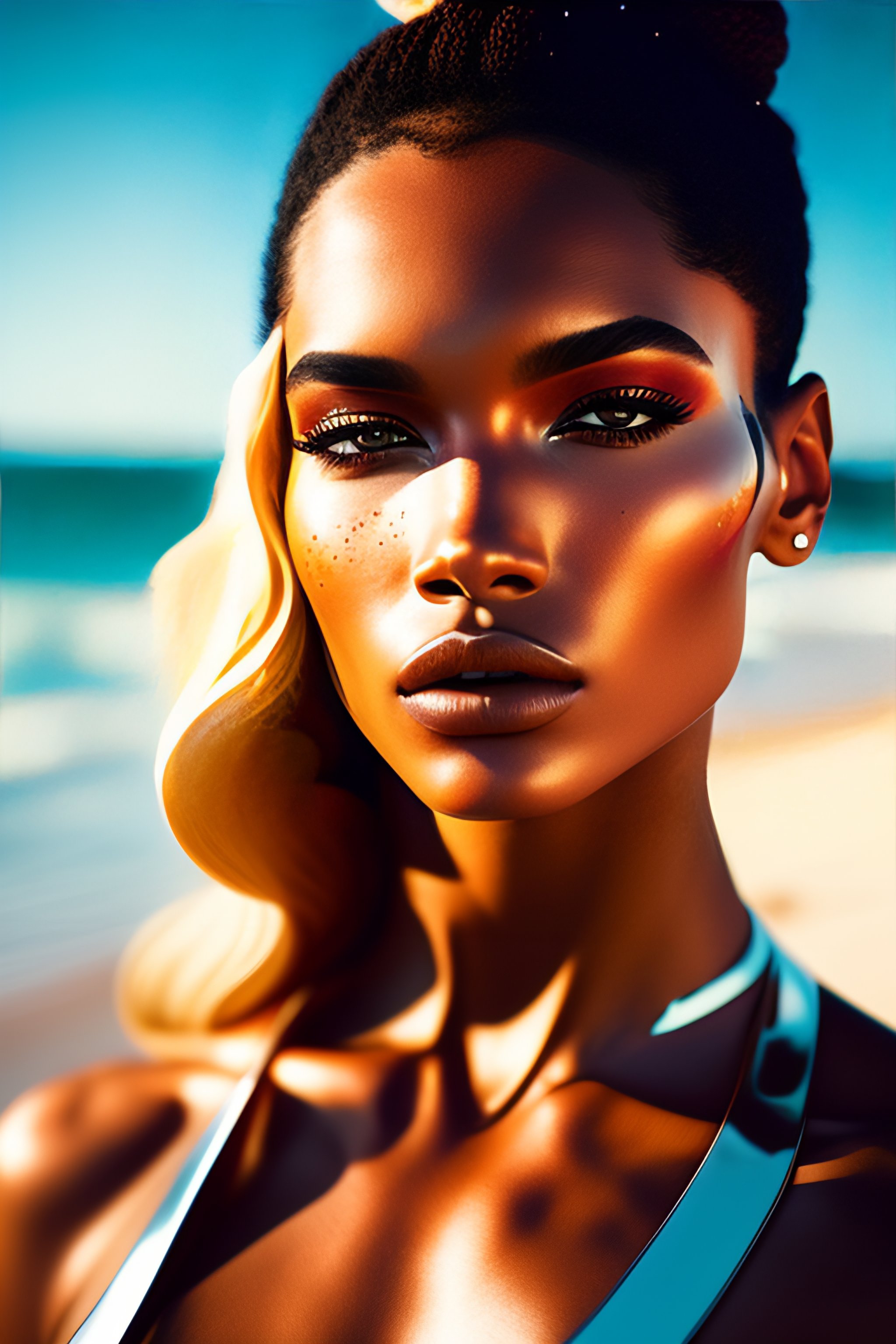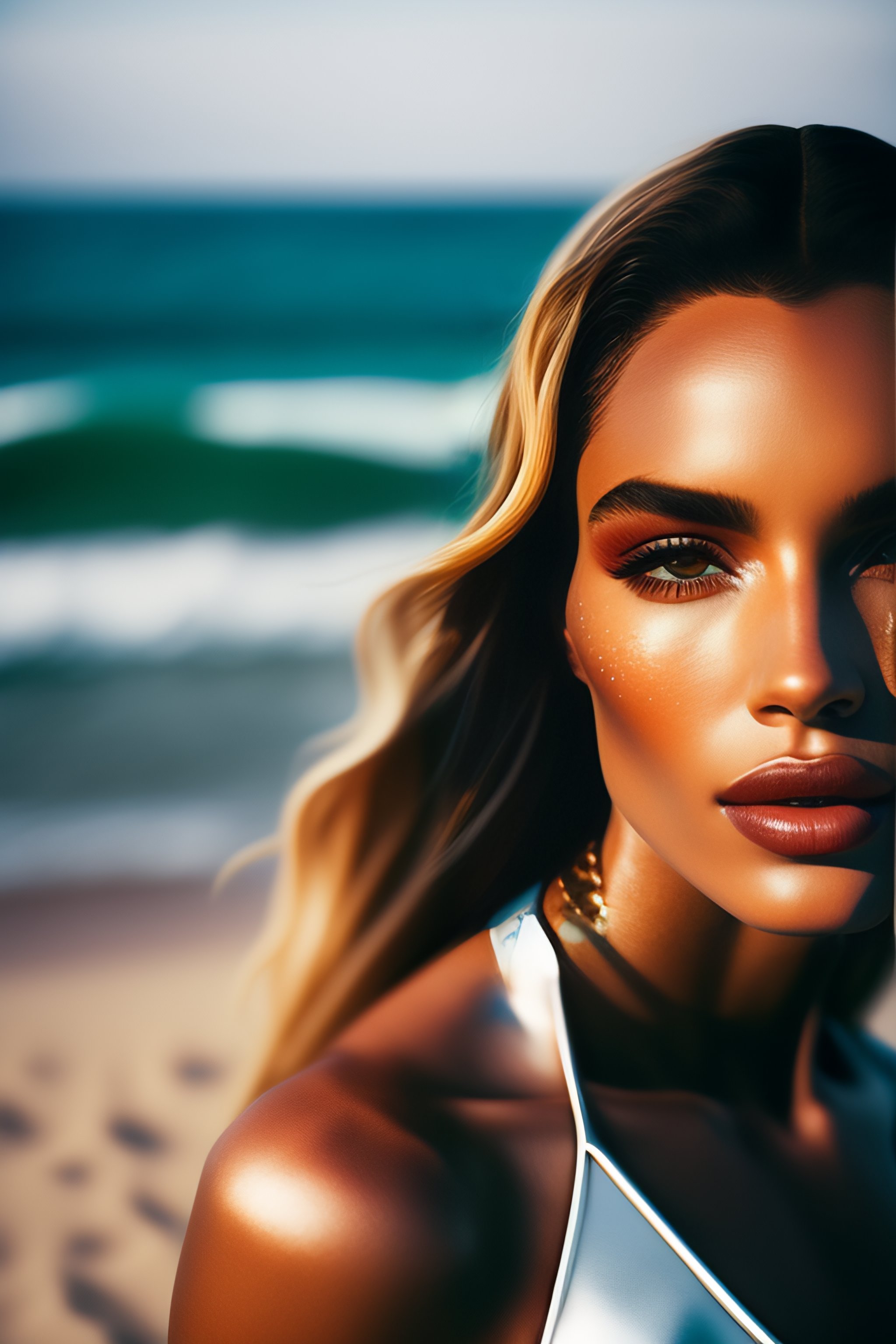 Ultra hd! realistic! marc jacobs fashion magazine photoshoot, beach fashion, most beautiful faces in the world, female posing, chrome outfit, real landscape, photo in 2022's fashion style, medium format, fuji superia 400, iso 400, cinematic, realistic, 8k