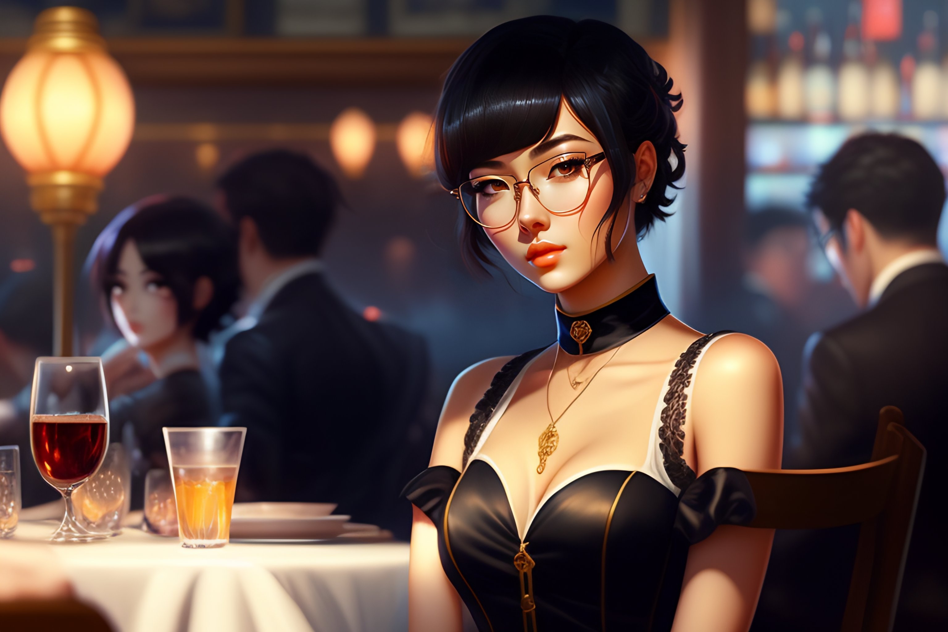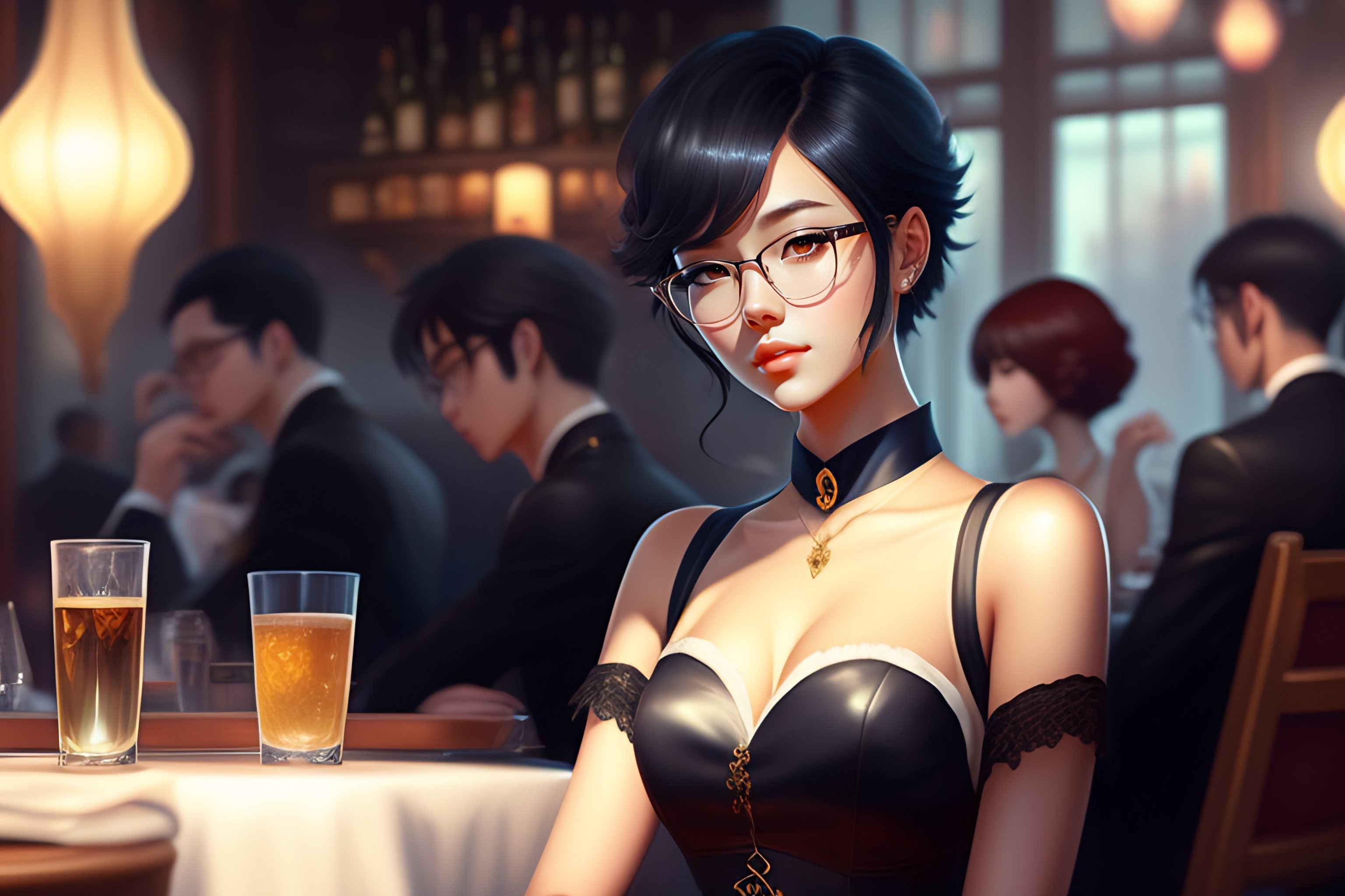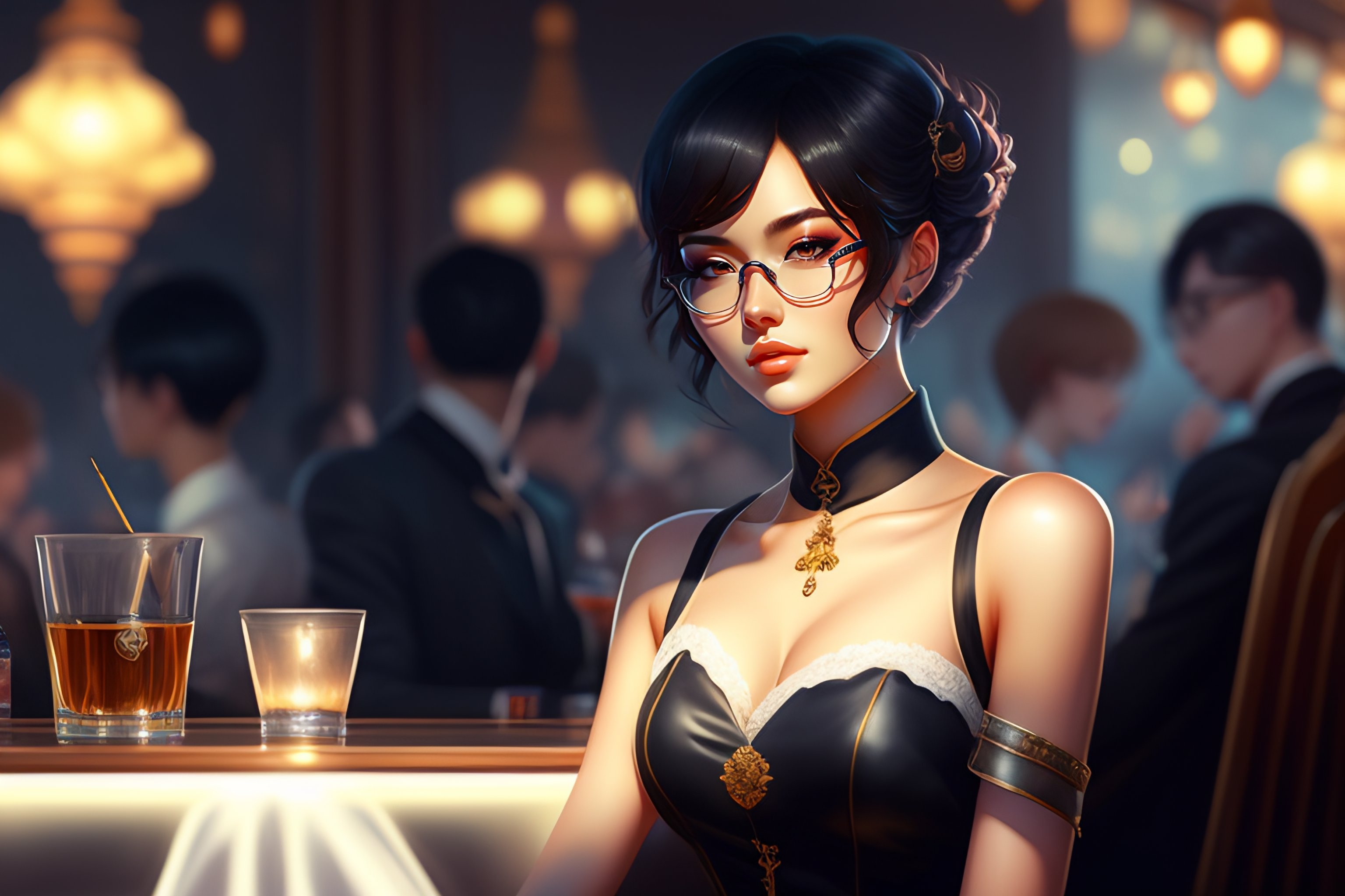 Beautiful anime girl with short black hair, glasses, bar, sitting at the table, cigarette smoke, twilight neckline, short dress, general view of the character, 1 9 6 0 s, intricate, elegant, very detailed, digital painting, art station, concept art, smooth, sharp focus, illustration, art by wlop, charlie bowater and alexandra fomina