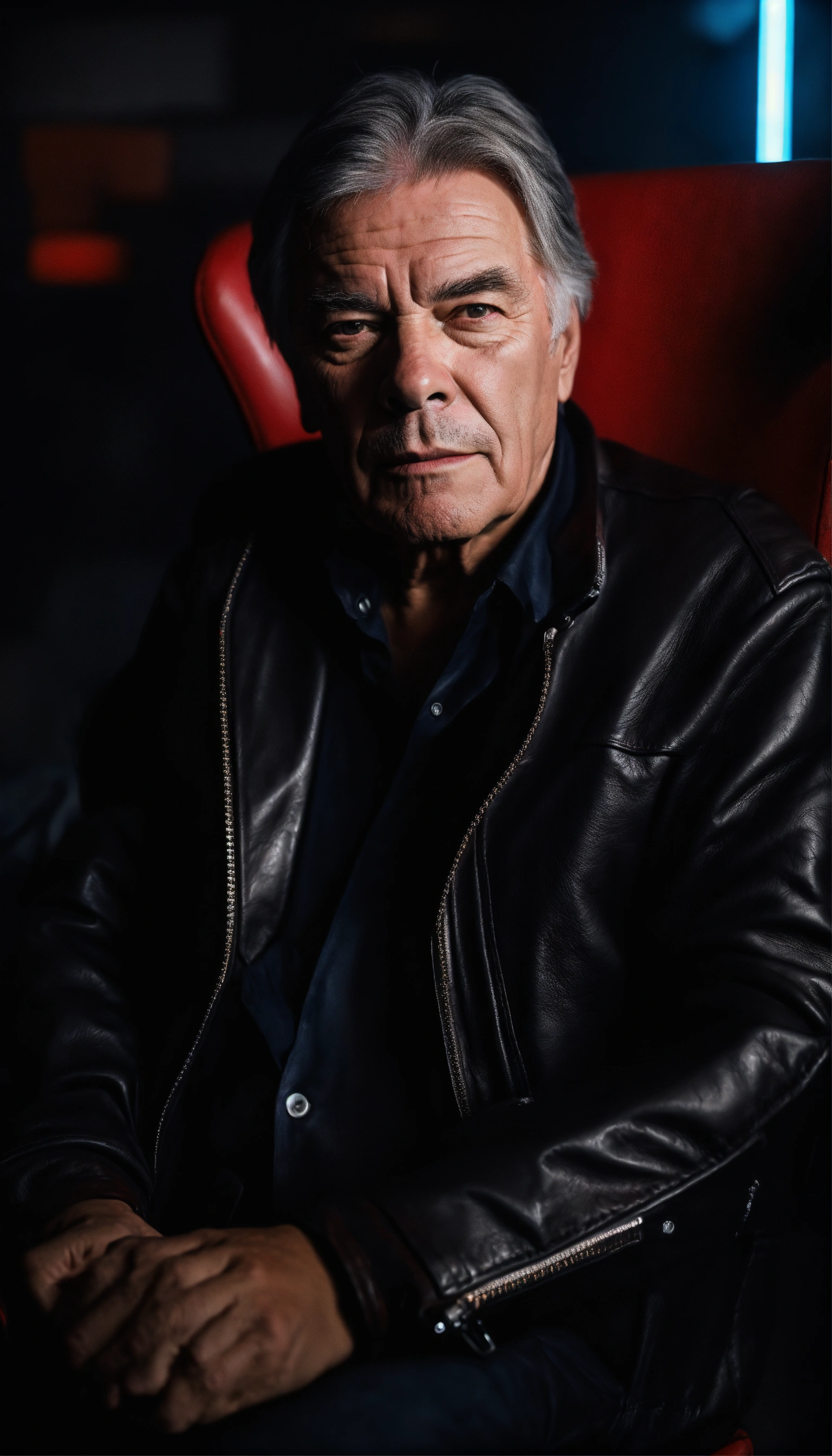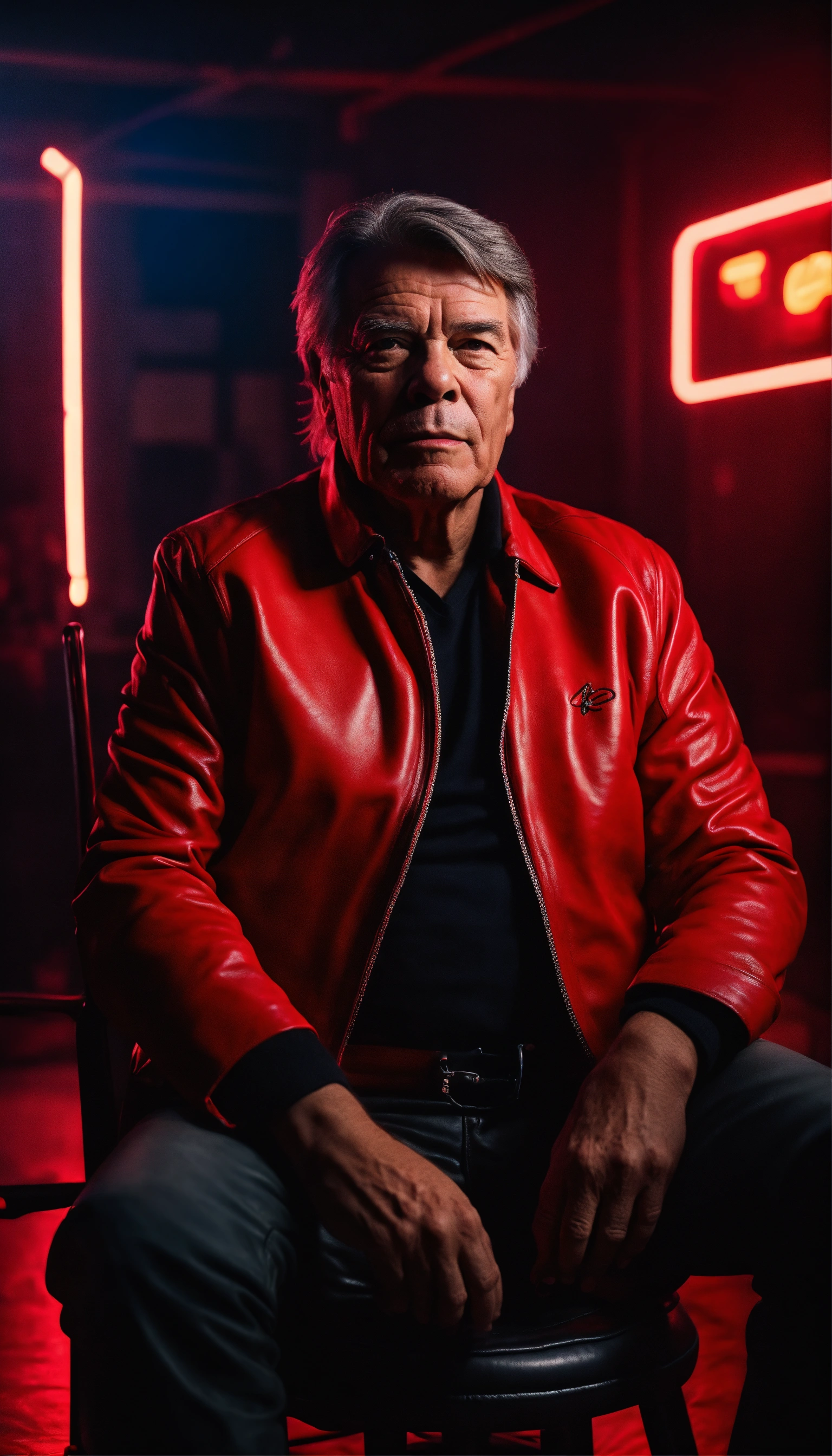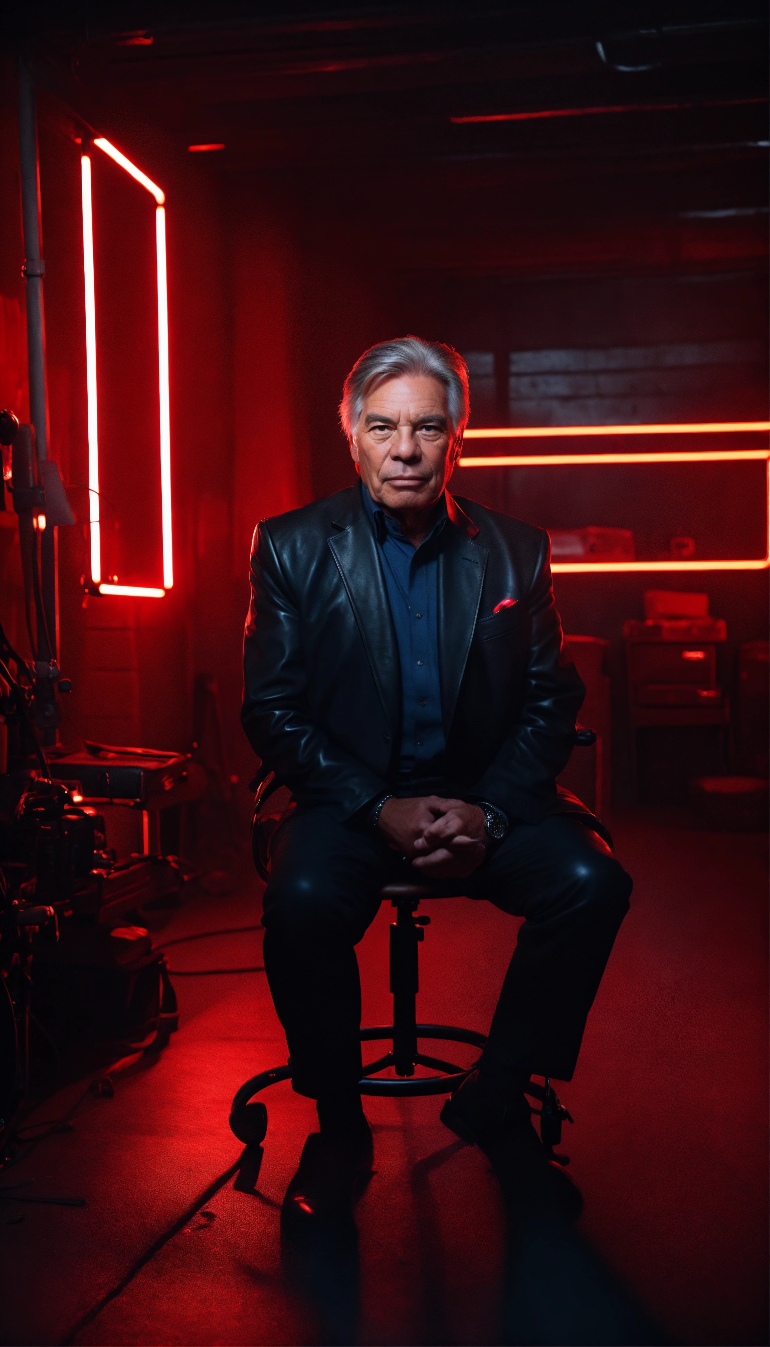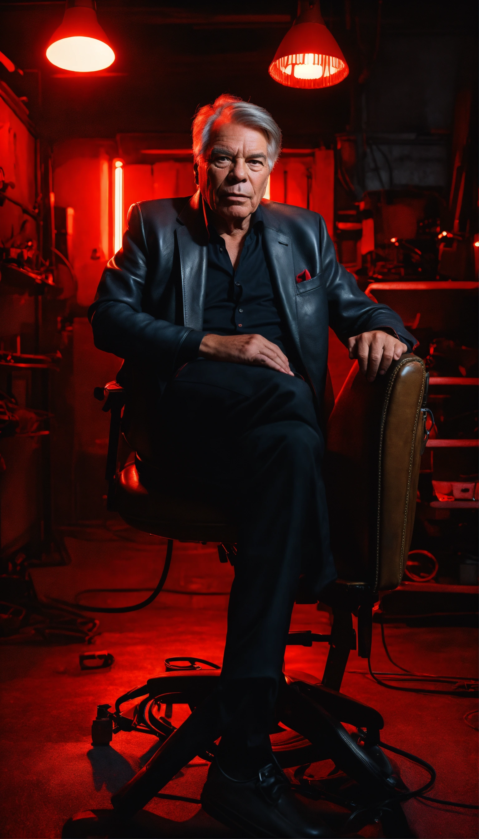 Portrait realistic of bernard tapie seat on a chair in leather in a darkness garage face infront the camera with large angle with red neon 8k high quality