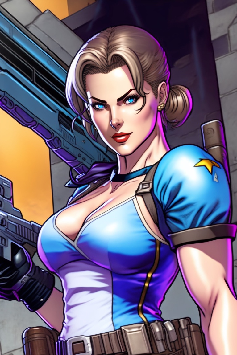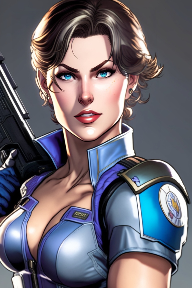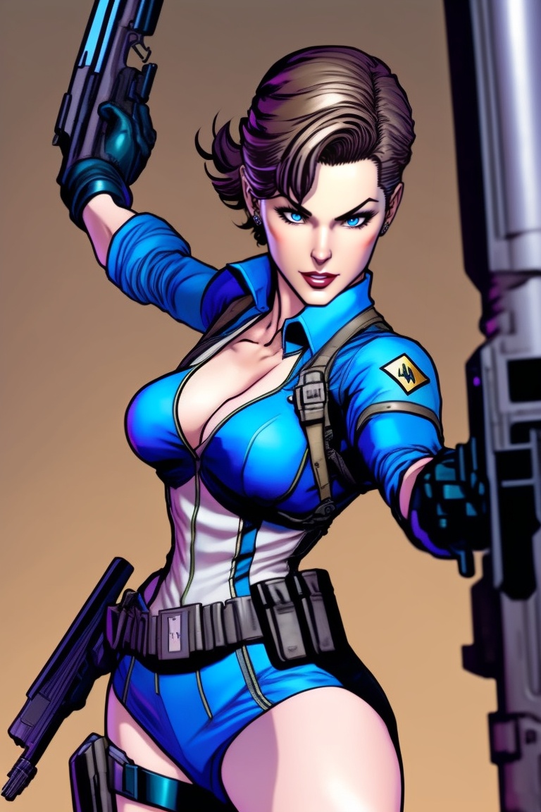 Jill valentine from resident evil, depicted in a comic book style, aiming her powerful magnum handgun forward with unwavering determination. jill stands tall and confident, embodying her role as a skilled and fearless protagonist. the composition captures her in a dynamic pose, with her arm extended, showcasing the strength and precision of her aim. the art style draws inspiration from acclaimed comic book artists like mike mignola, frank miller and jim lee.