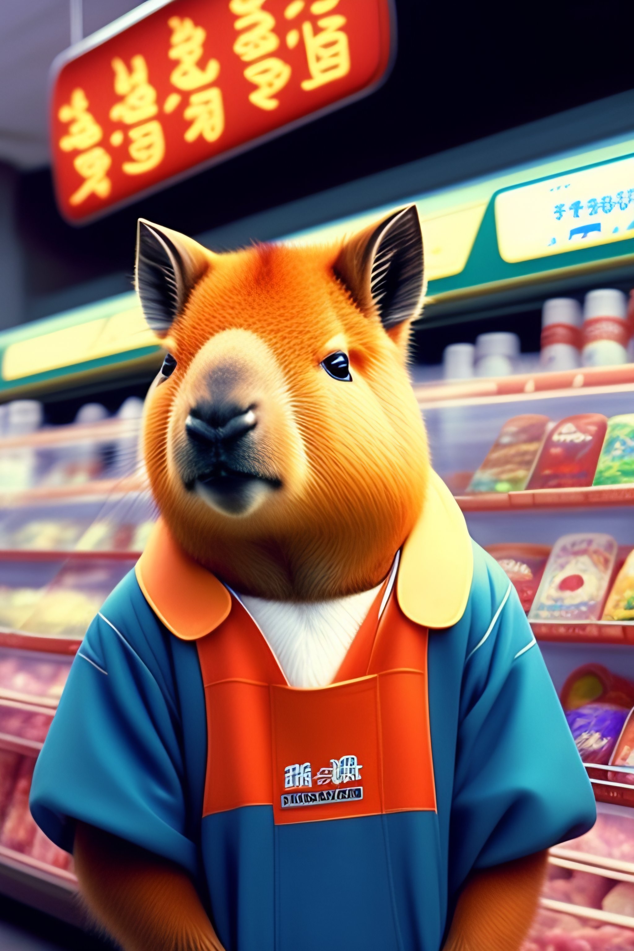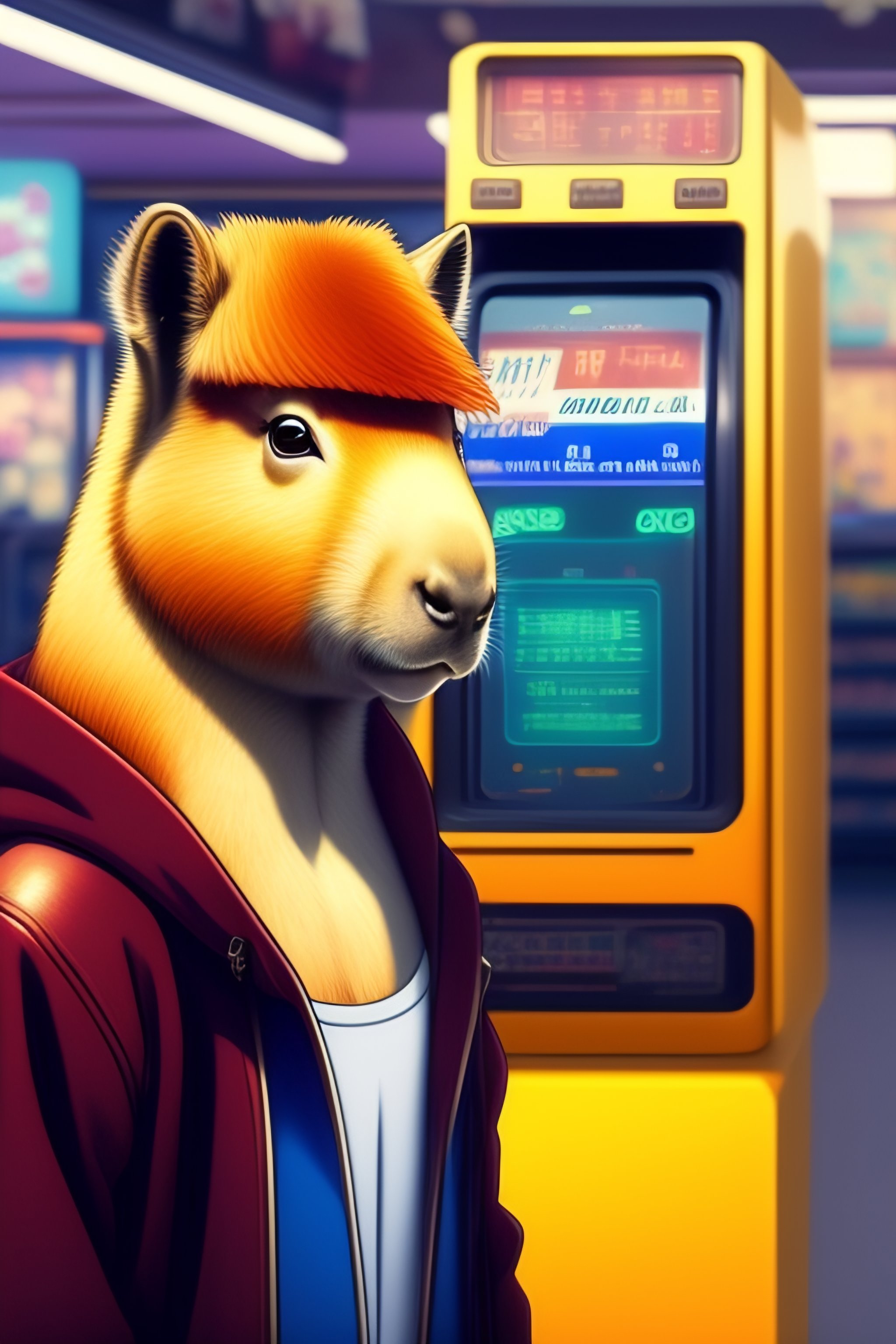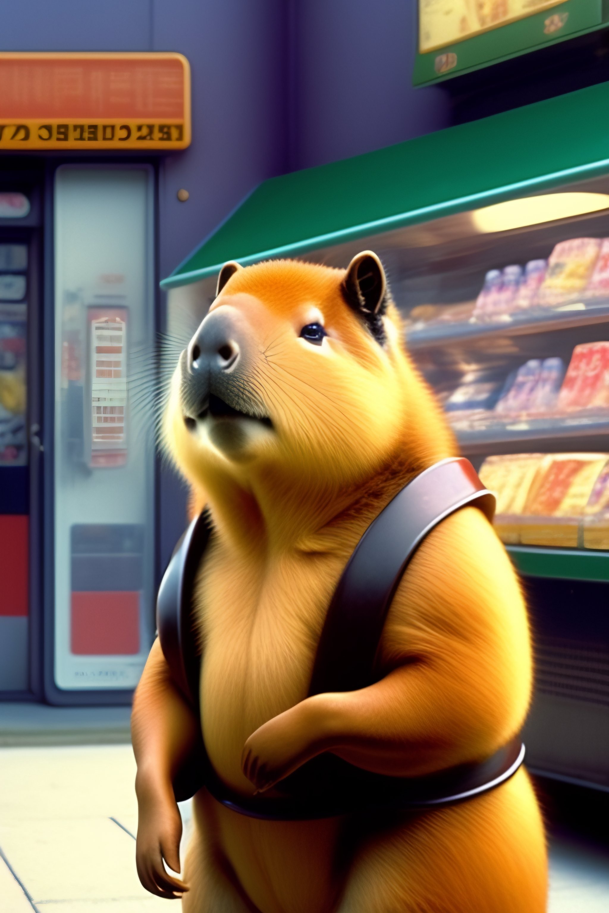 vintage 90's anime style. stylish capybara in 7/11 convenience store.