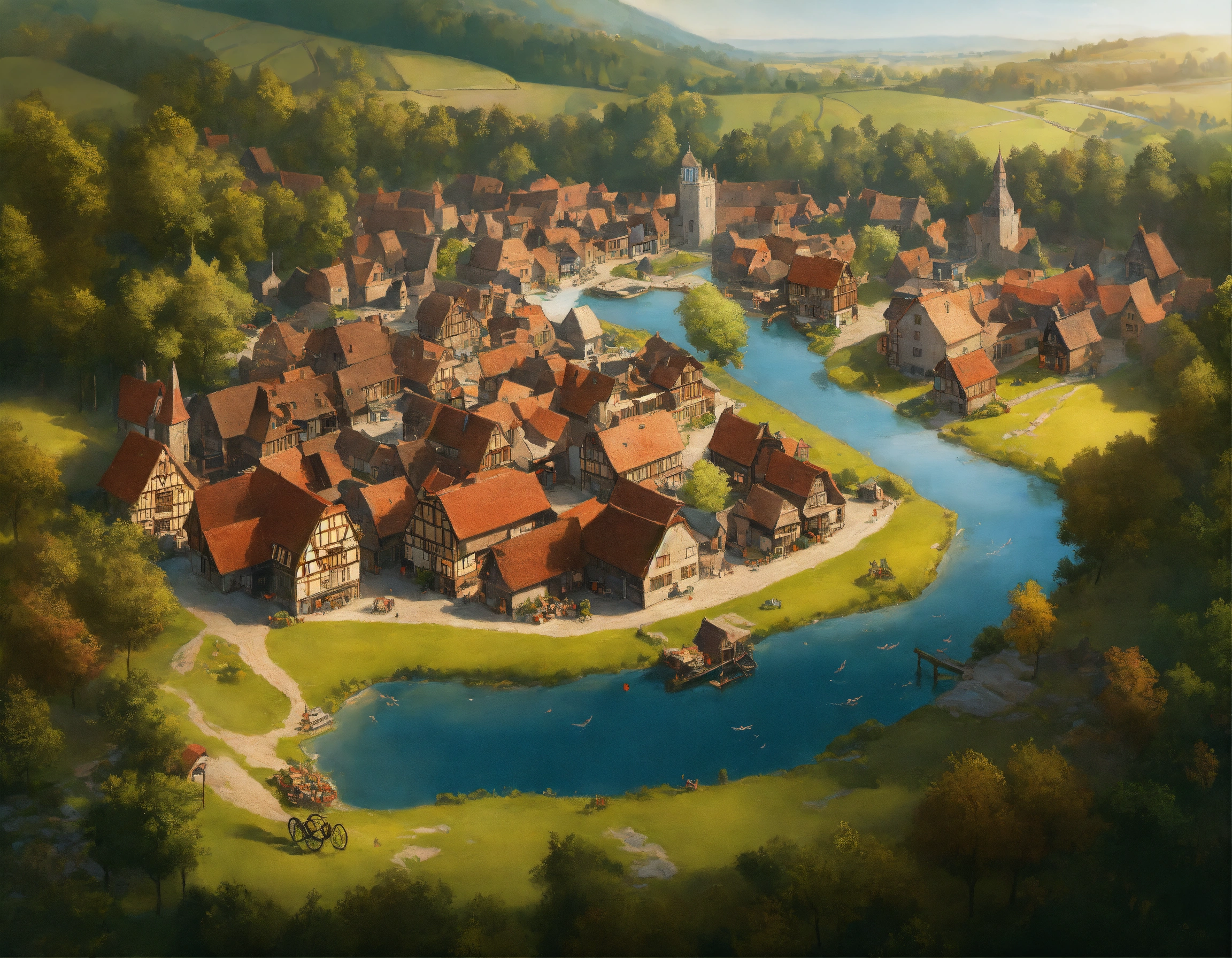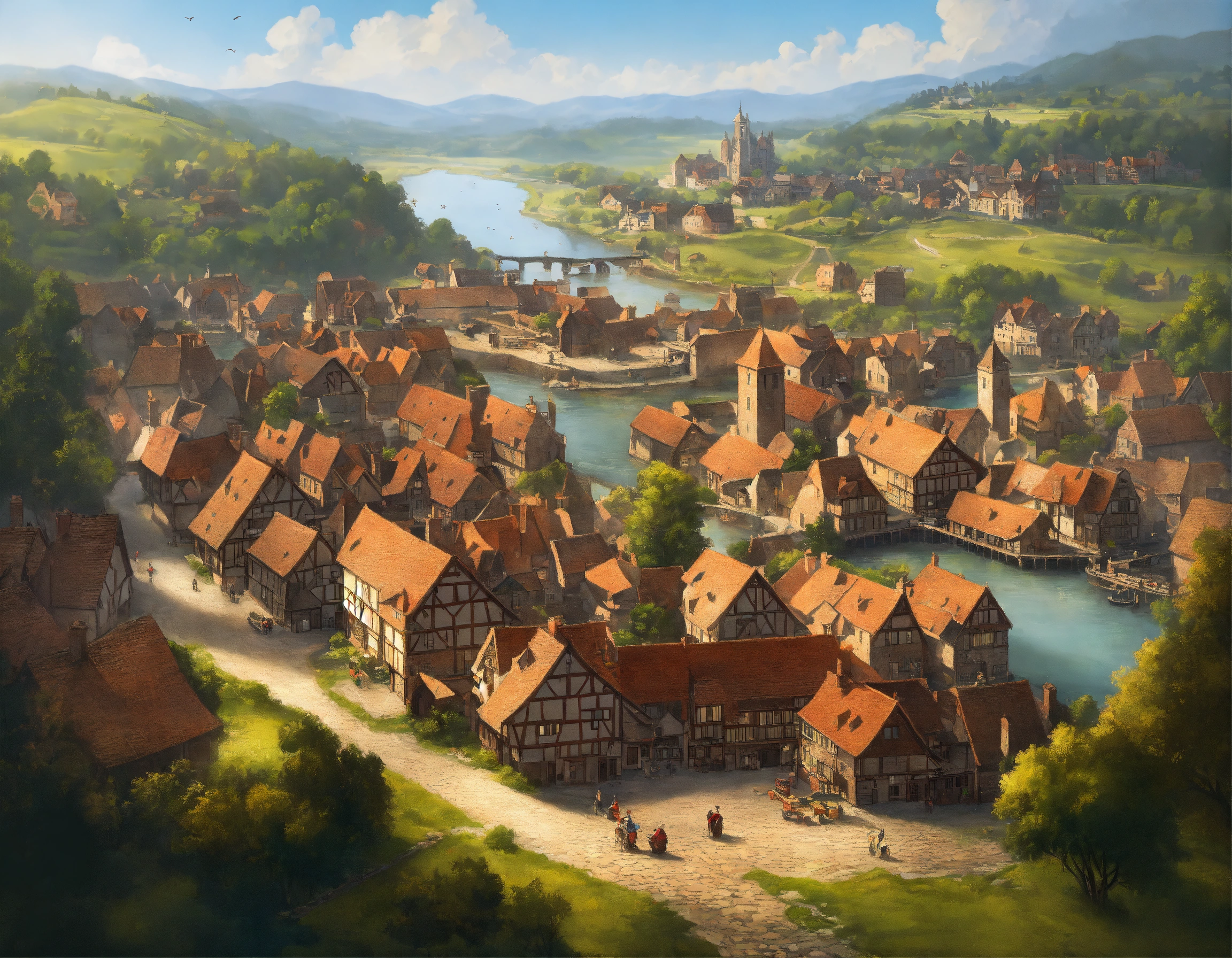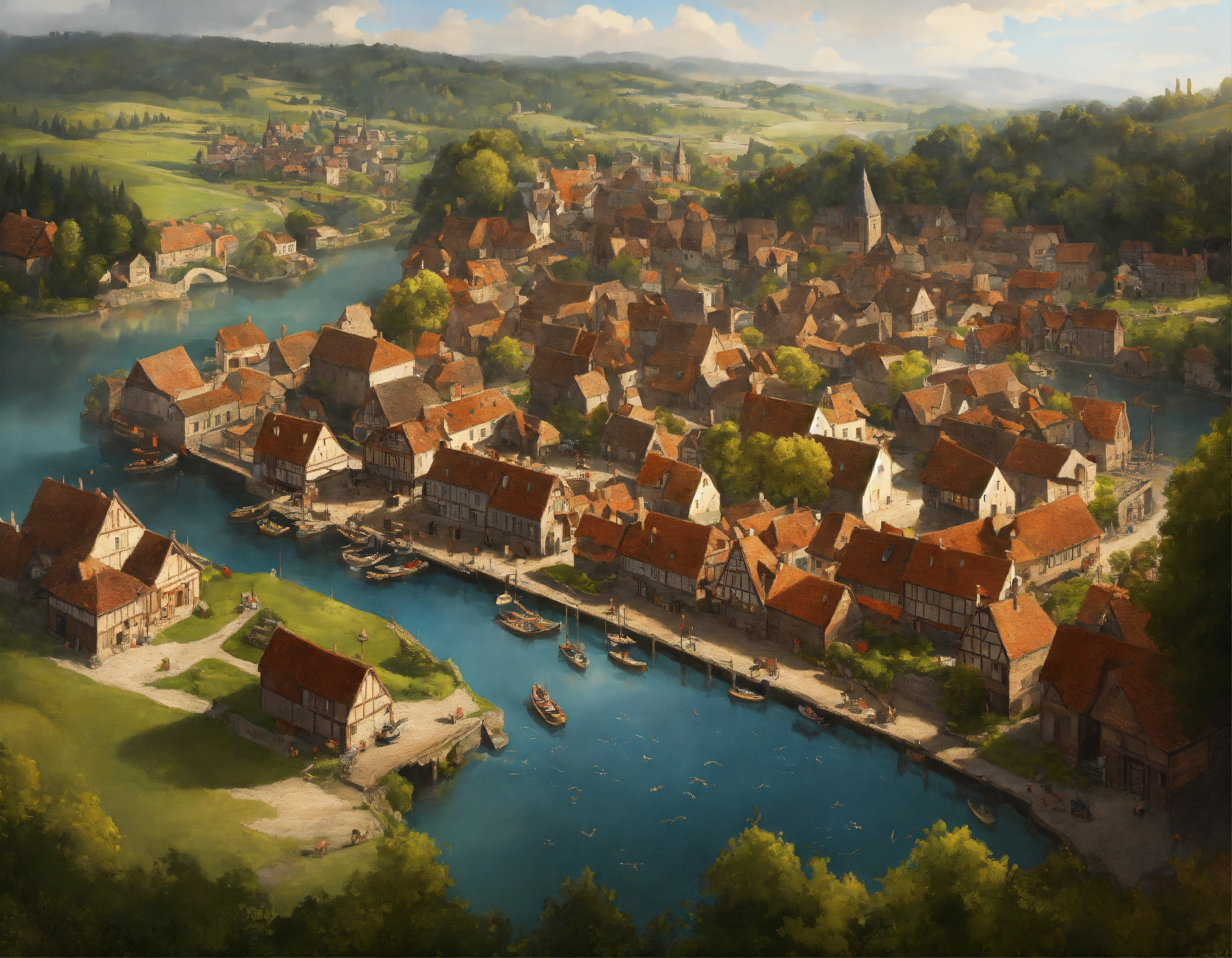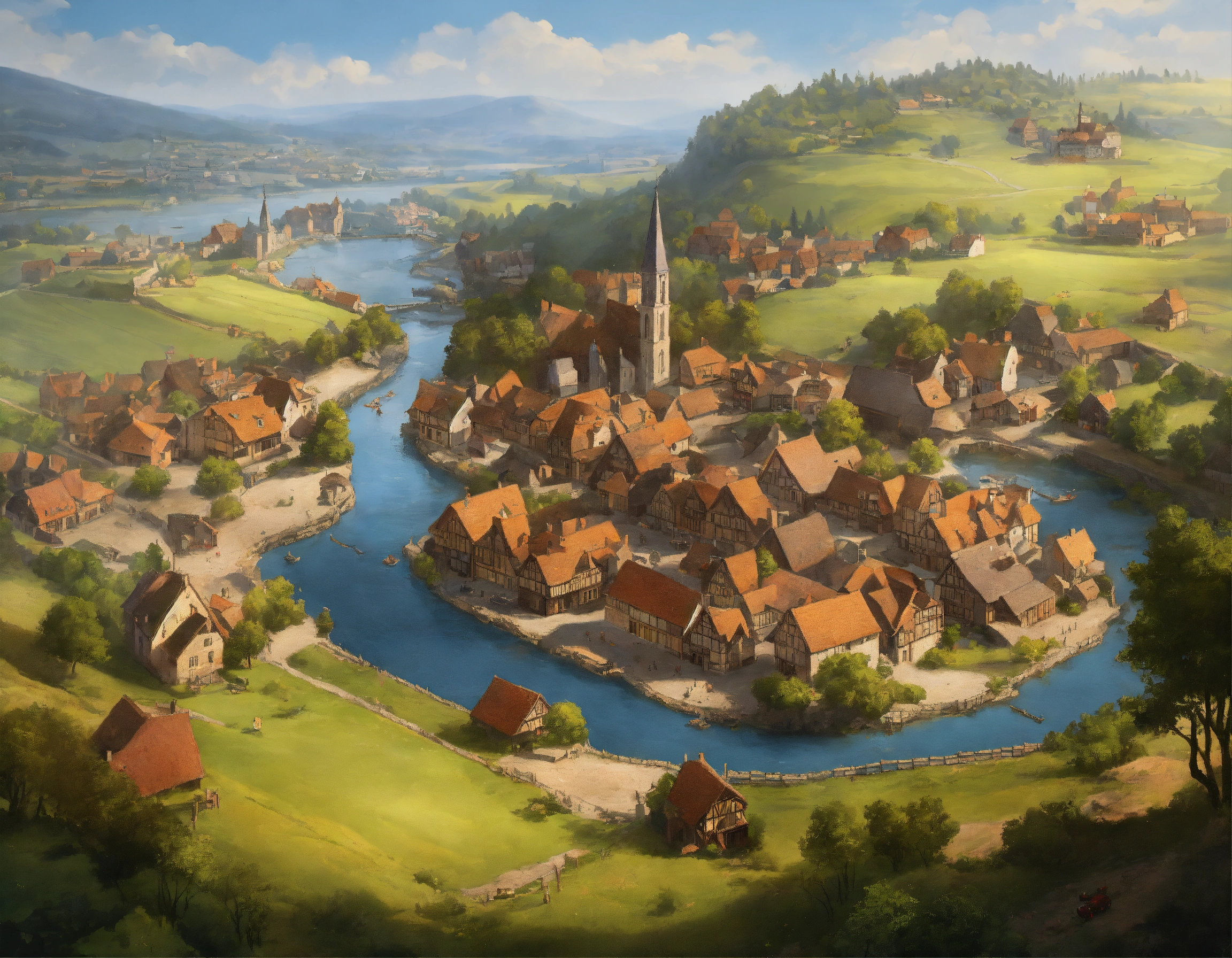 Highly realistic, photography, bird's eye view of a medieval town with 500 inhabitants, one-storey and two-storey wooden houses, half-timbered houses and a few stone houses, no dense building, large open market square in the town center, fortified small jetty with drift, a river in front of the town, a trade route runs through the town, individual farms and homesteads lie around the town, densely wooded rolling hills behind the town, highly detailed, oil painting, ornamented, in the style of nicolas poussin, sharp contours, detailed, morning light, 8k, fantasy