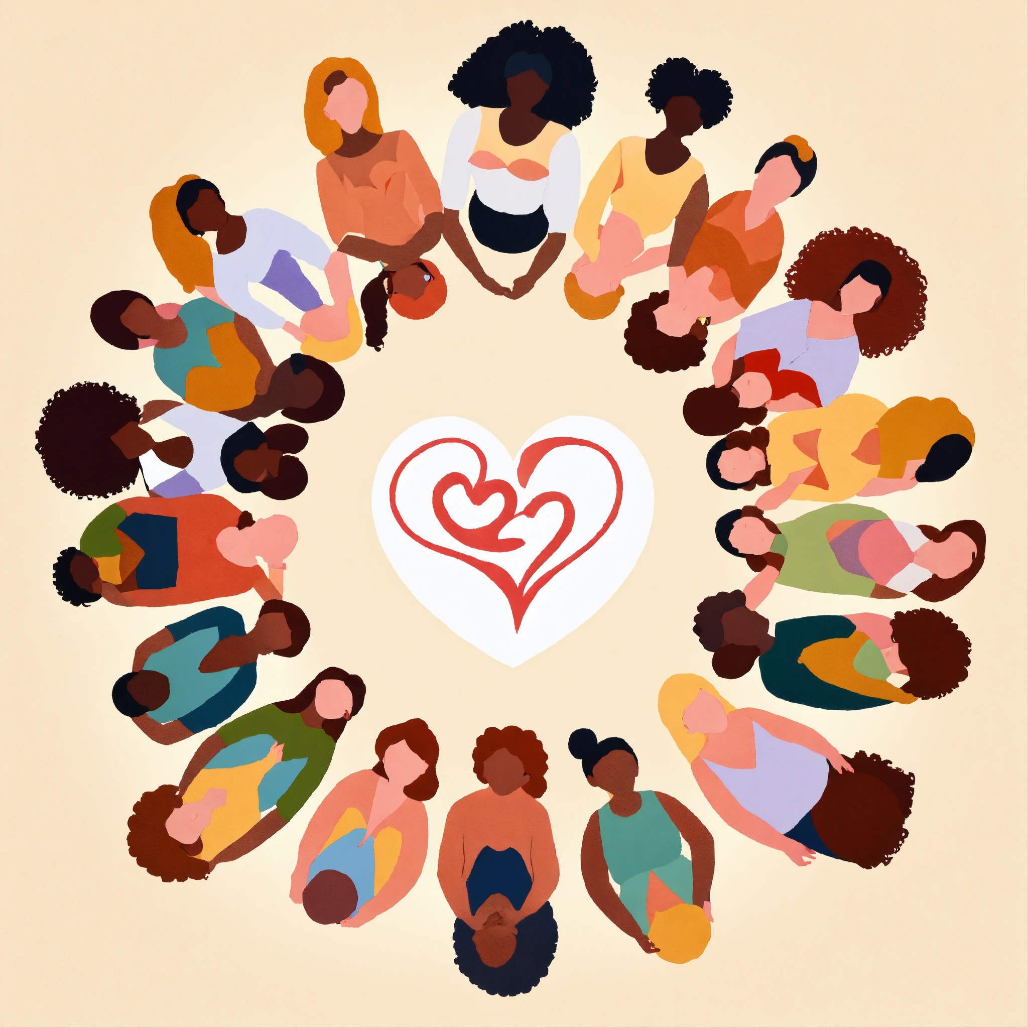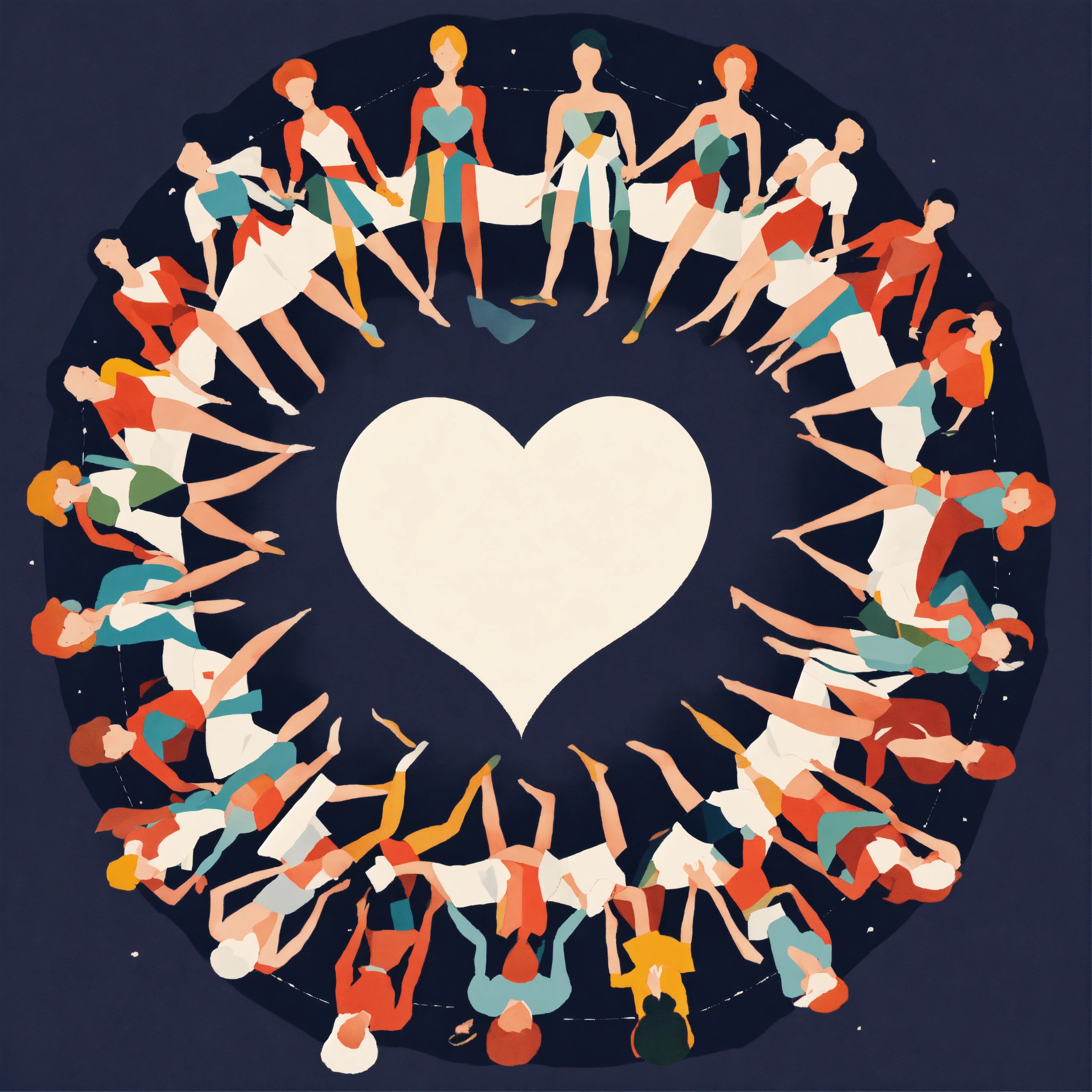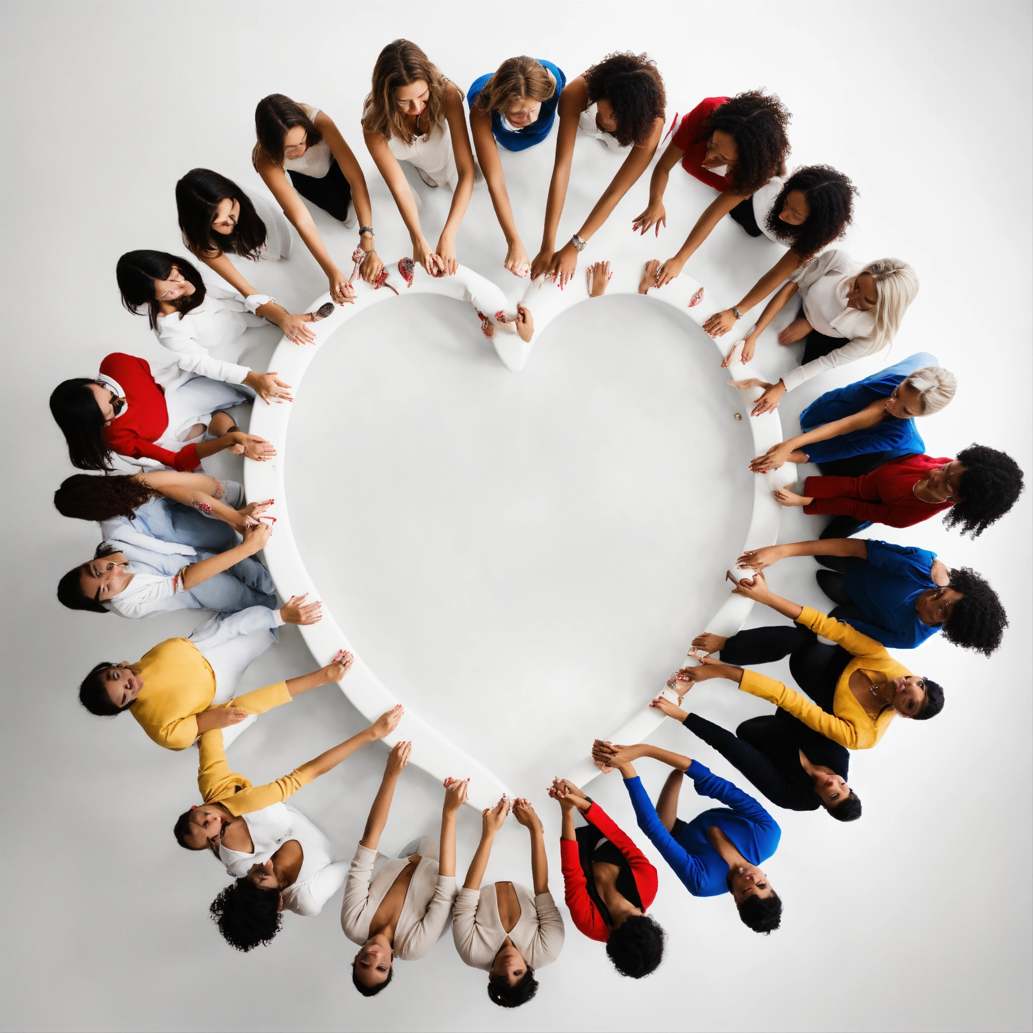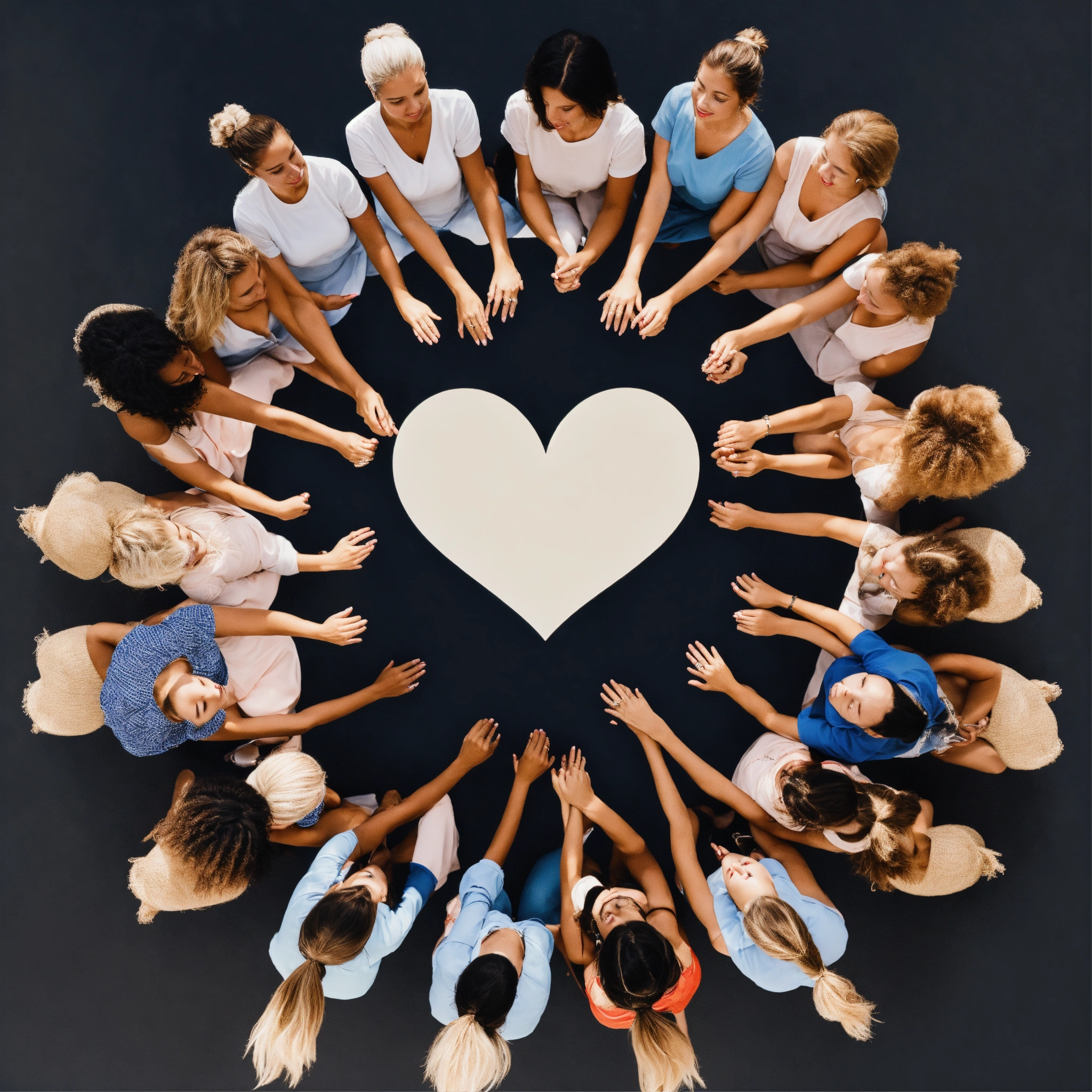 Large white heart in the center with 8 caucasian women standing around the outside, in a circle, holding hands, bird's eye view, minimalist