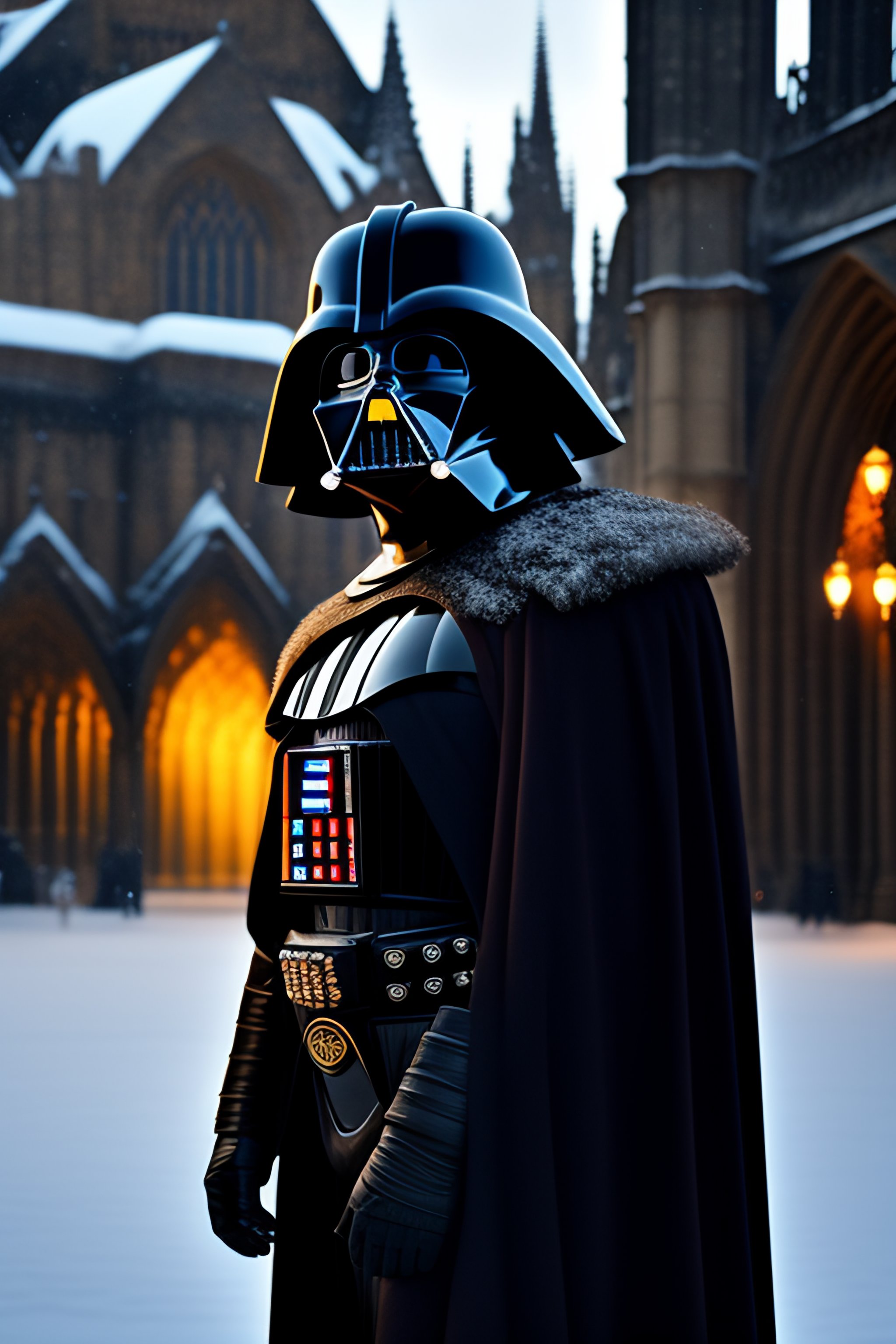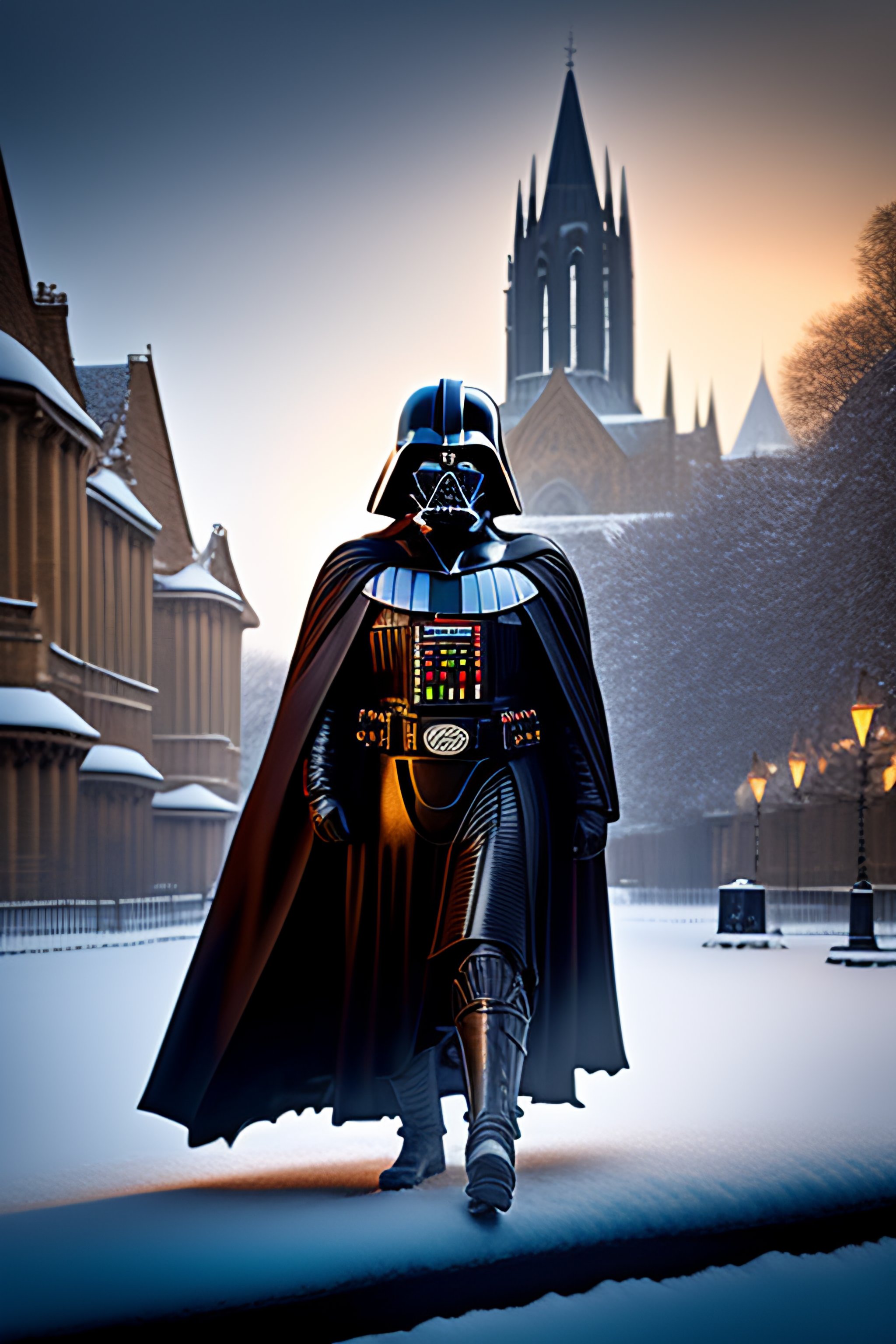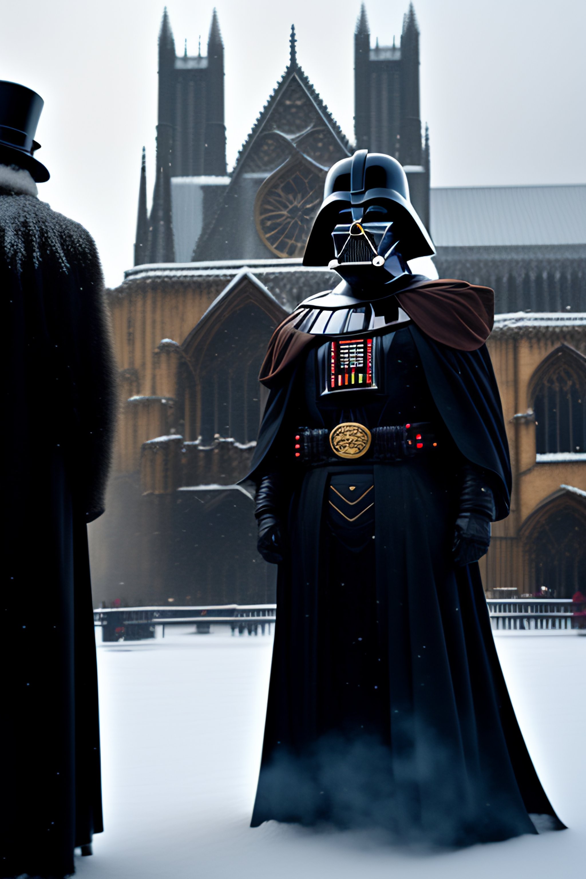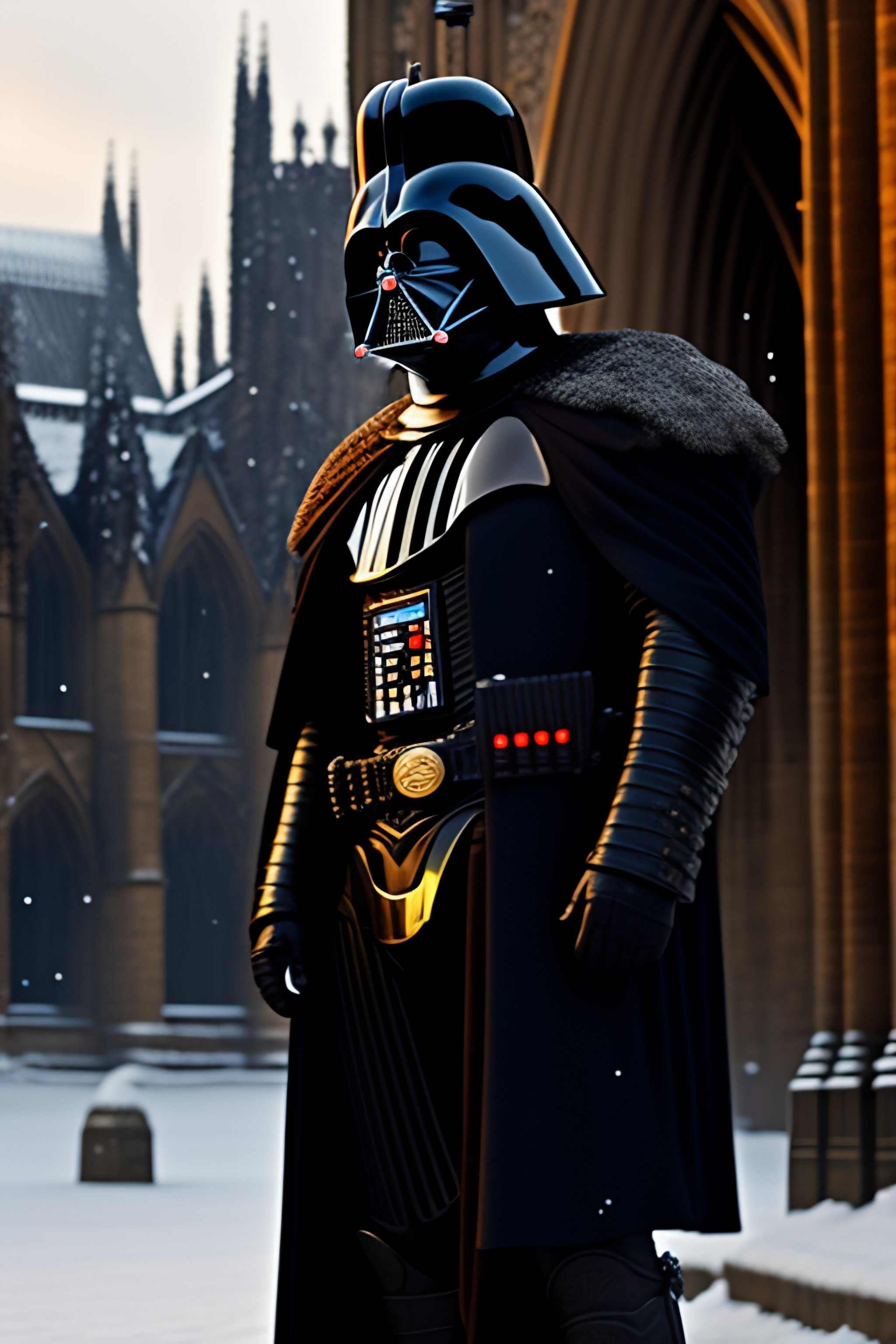 Picture of a steampunk darth vader set infront of lincoln cathedral in a dystopian winter