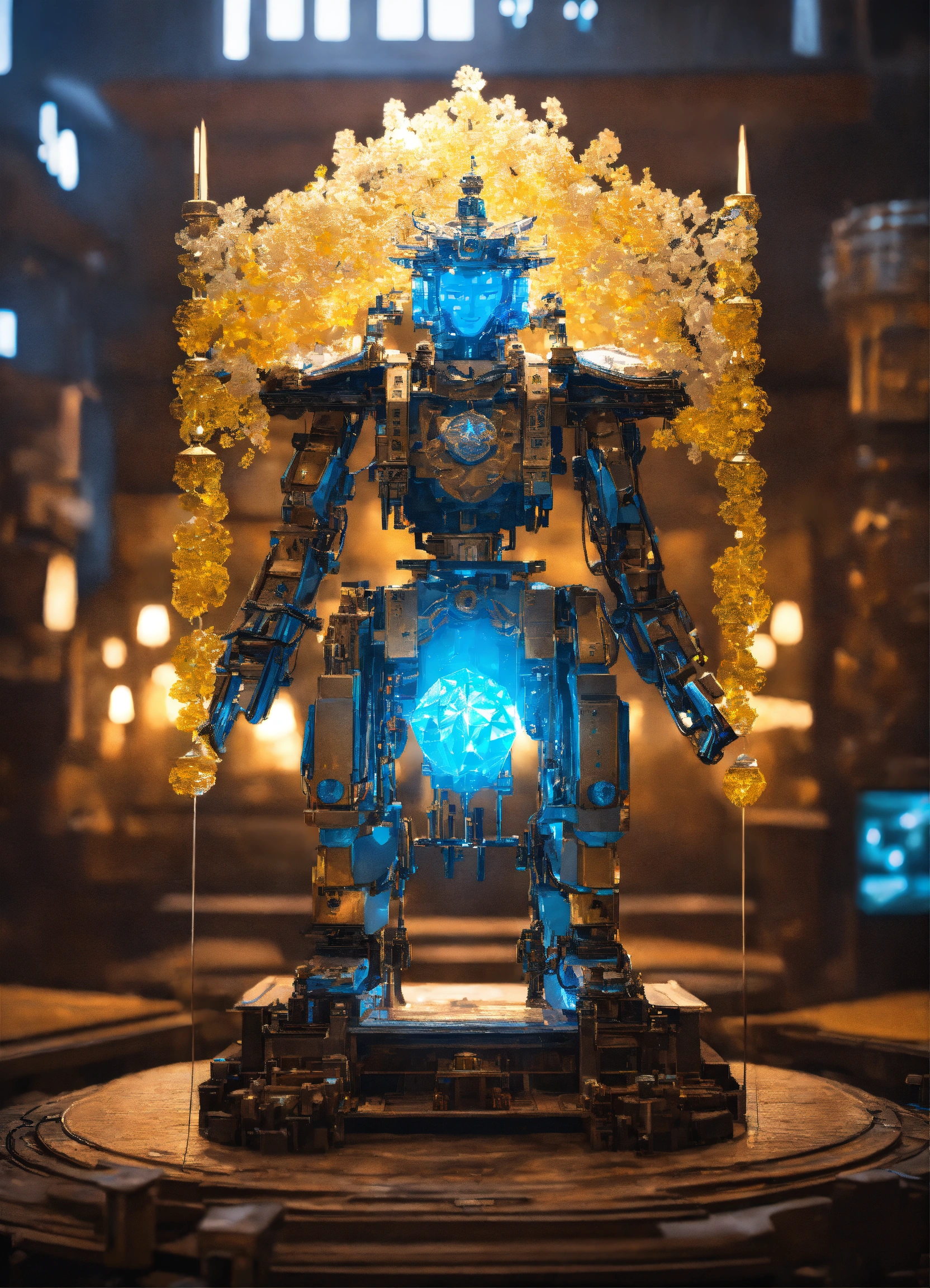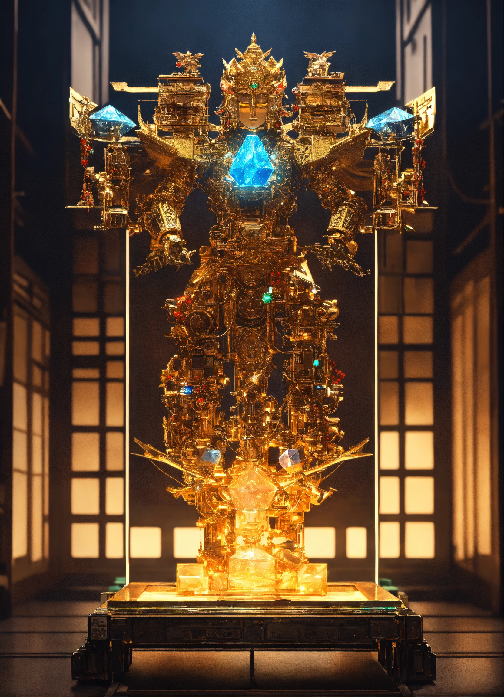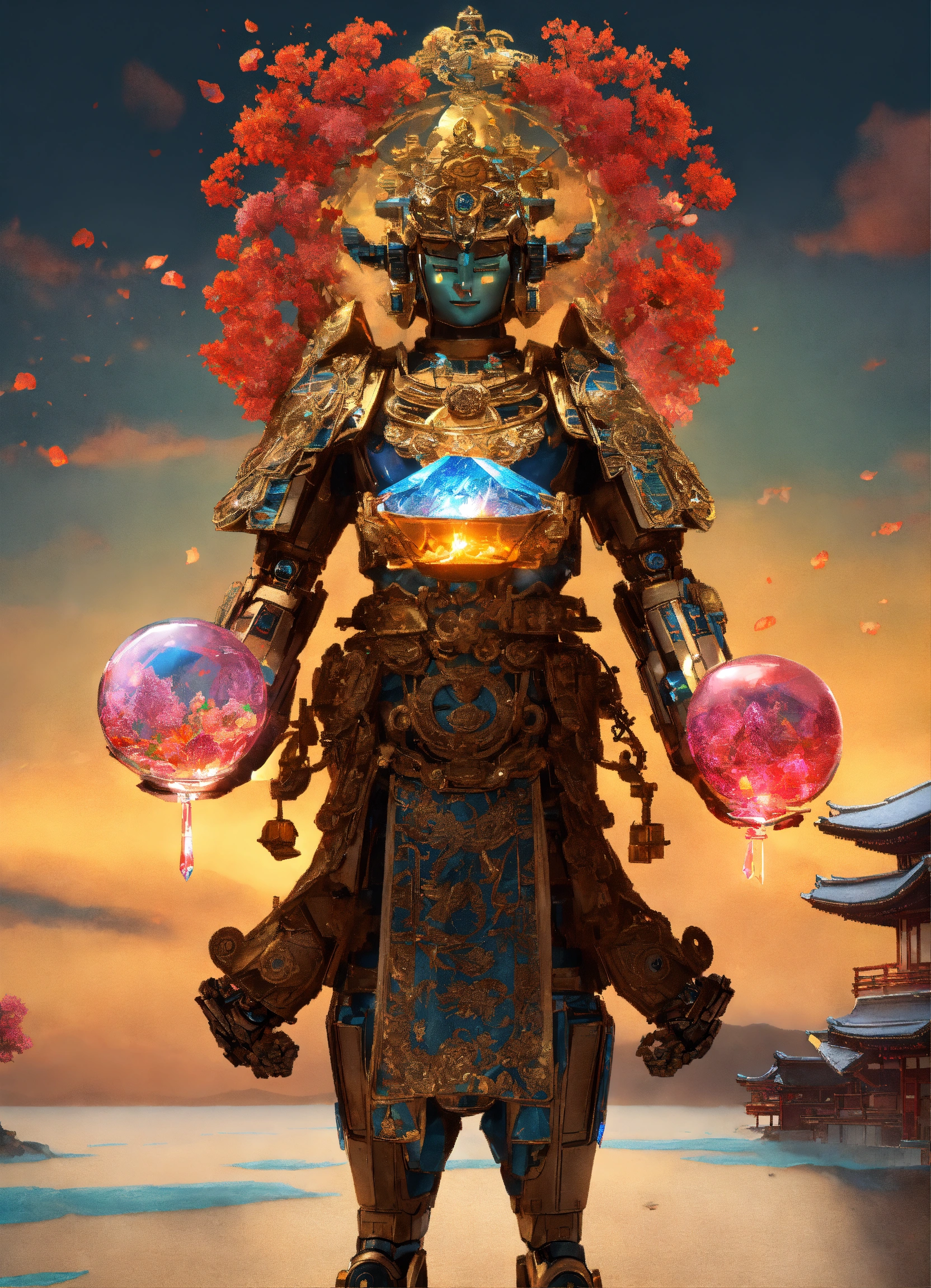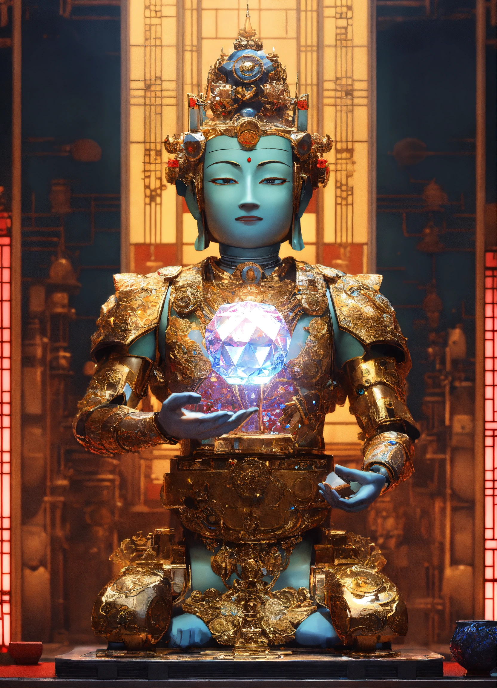 Please design a japanese god offering a floating crystal that represents robotic automation in his hand, make it enthusiastic