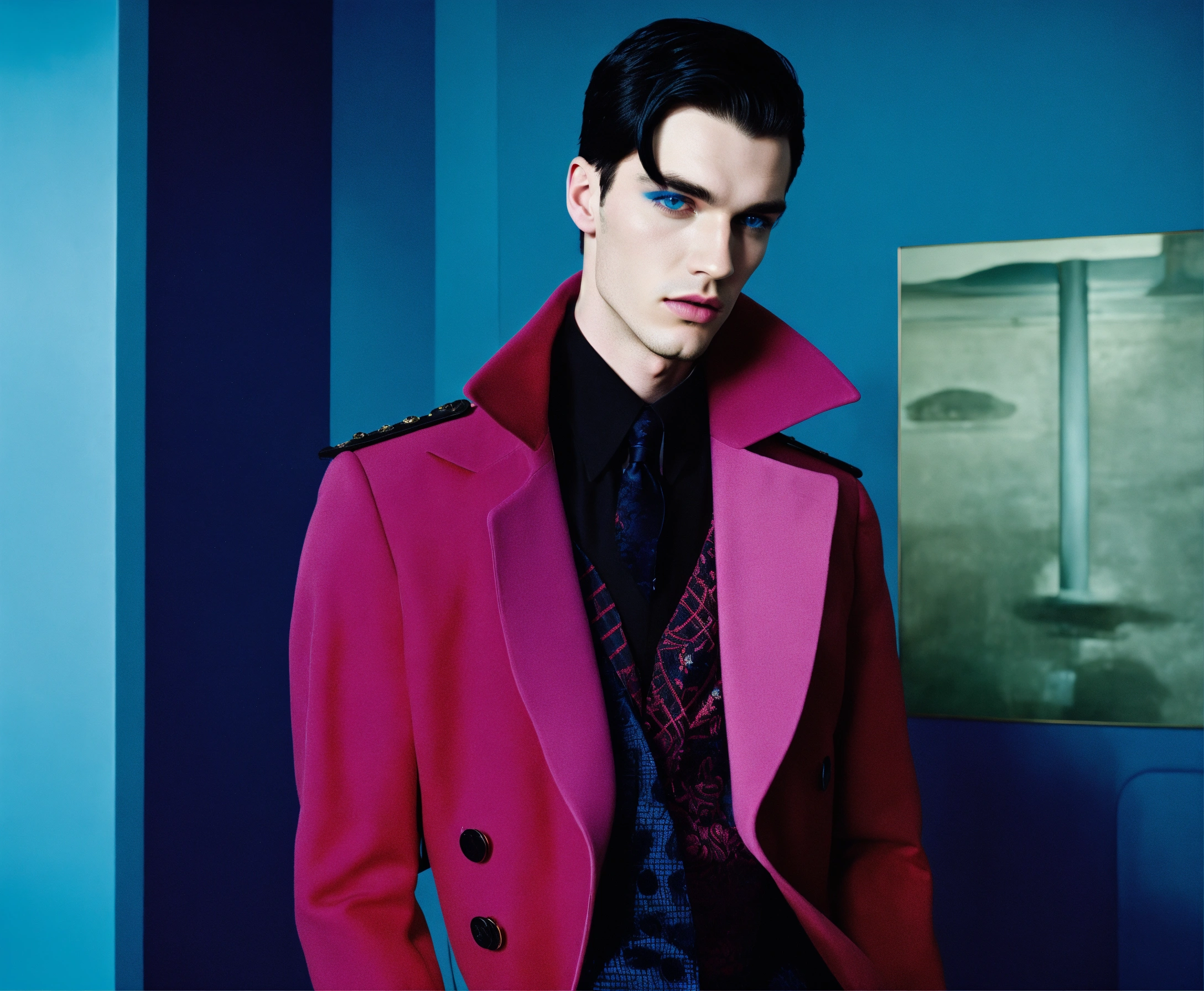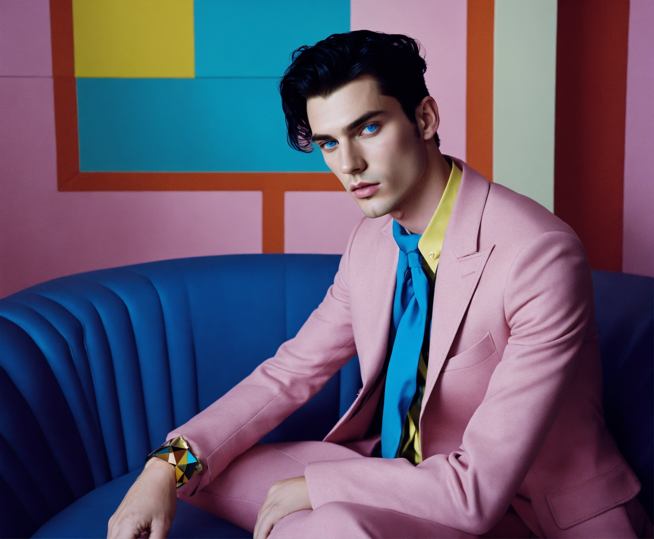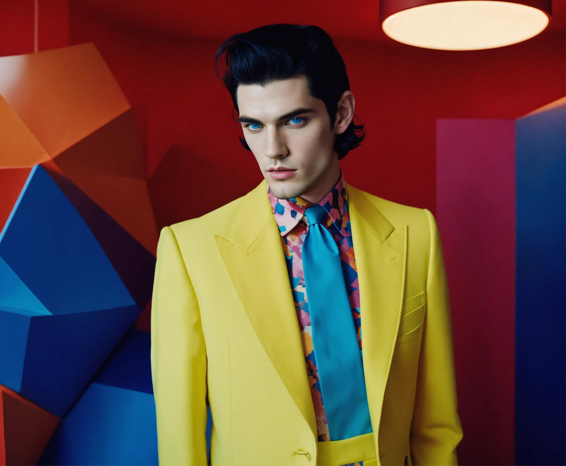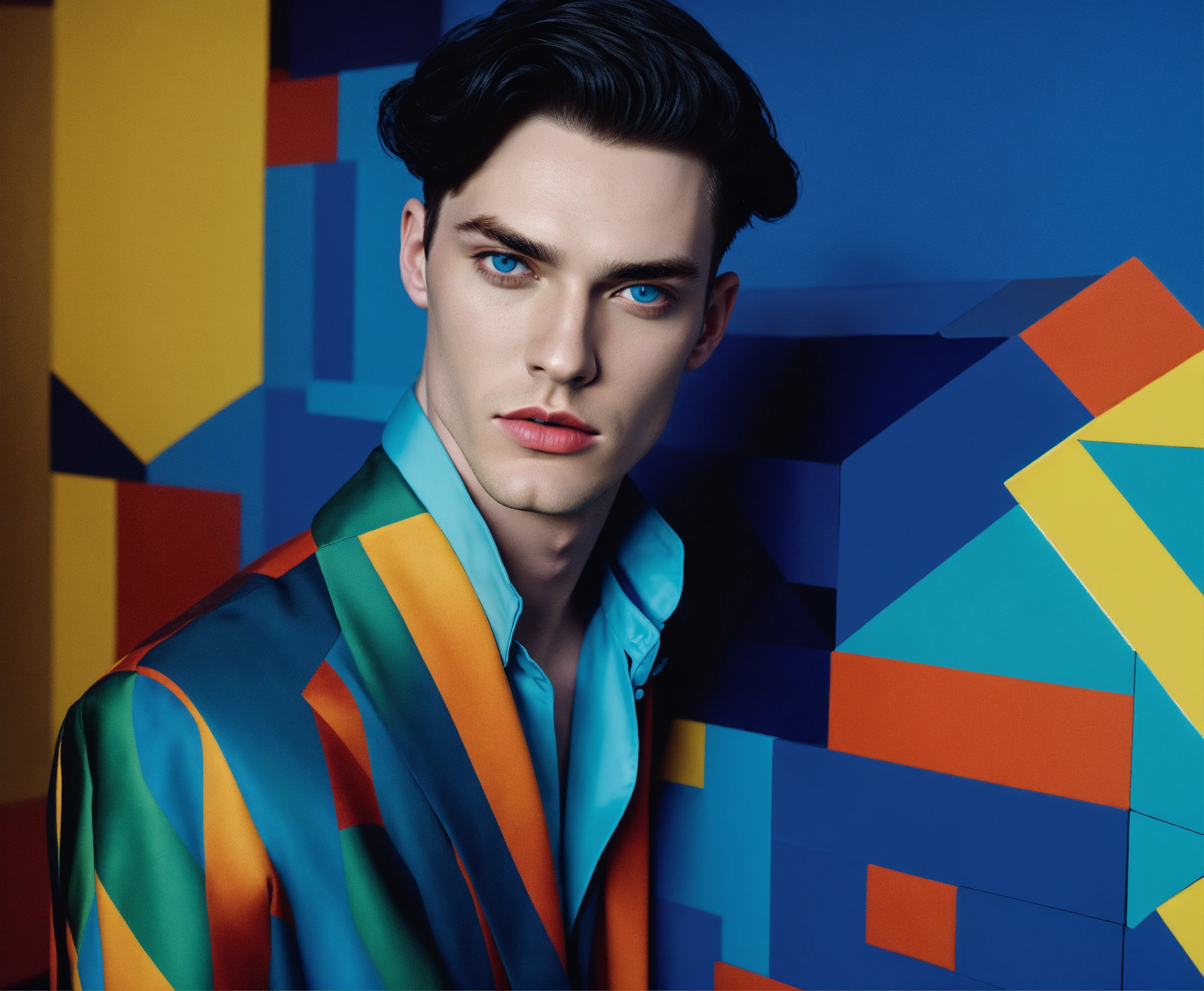 Handsome male model, pale skin, black hair, blue eyes, glasgow interior, editorial fashion, unusual colors, geometric shapes by miles aldridge