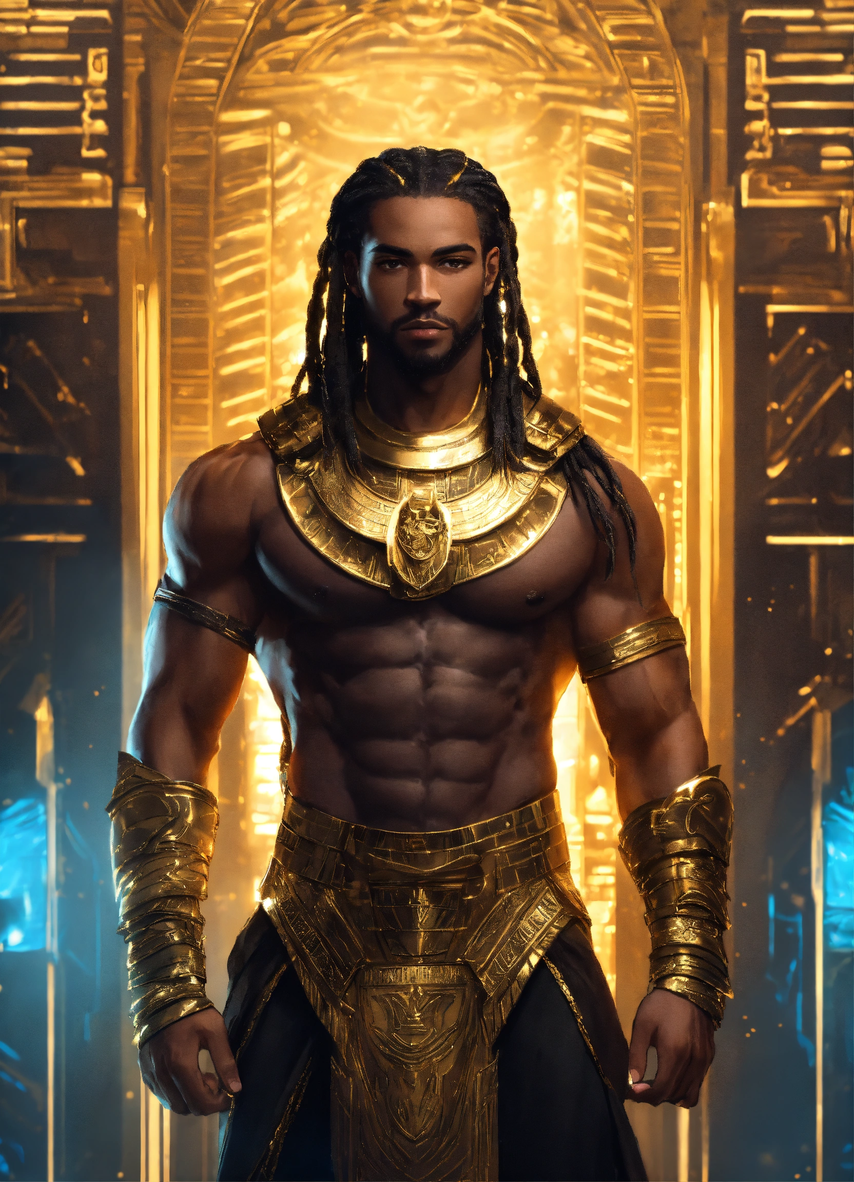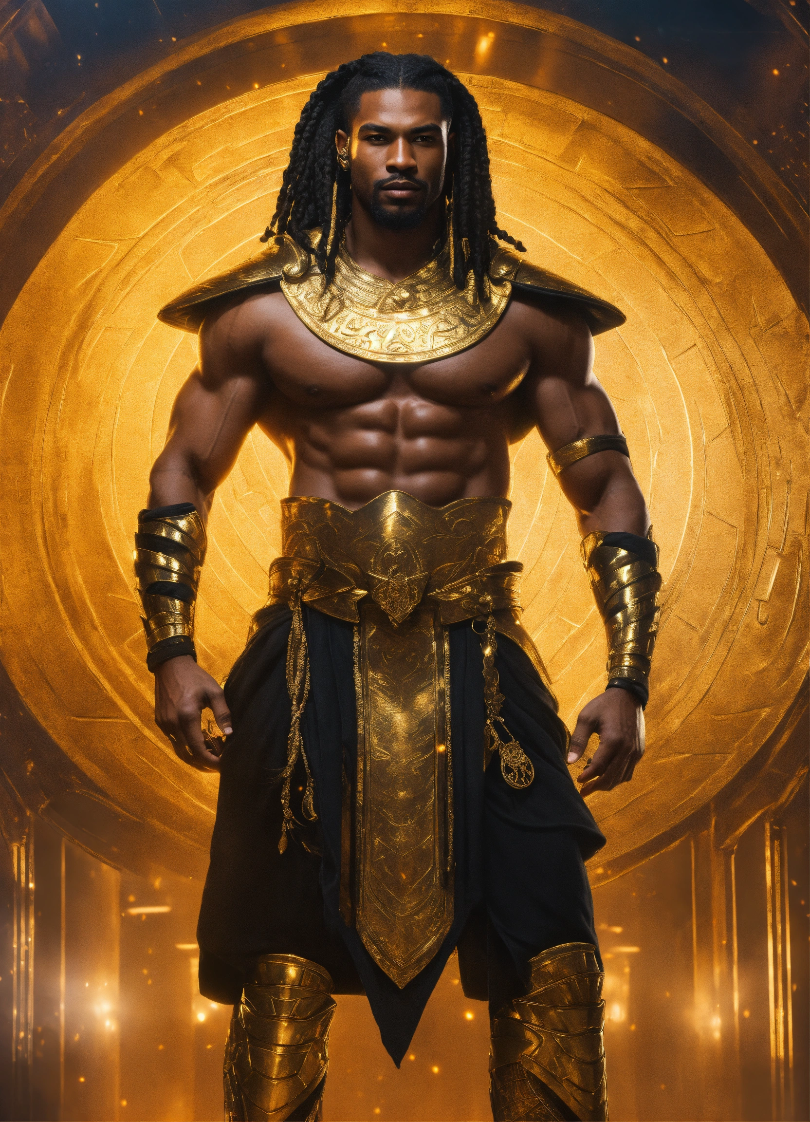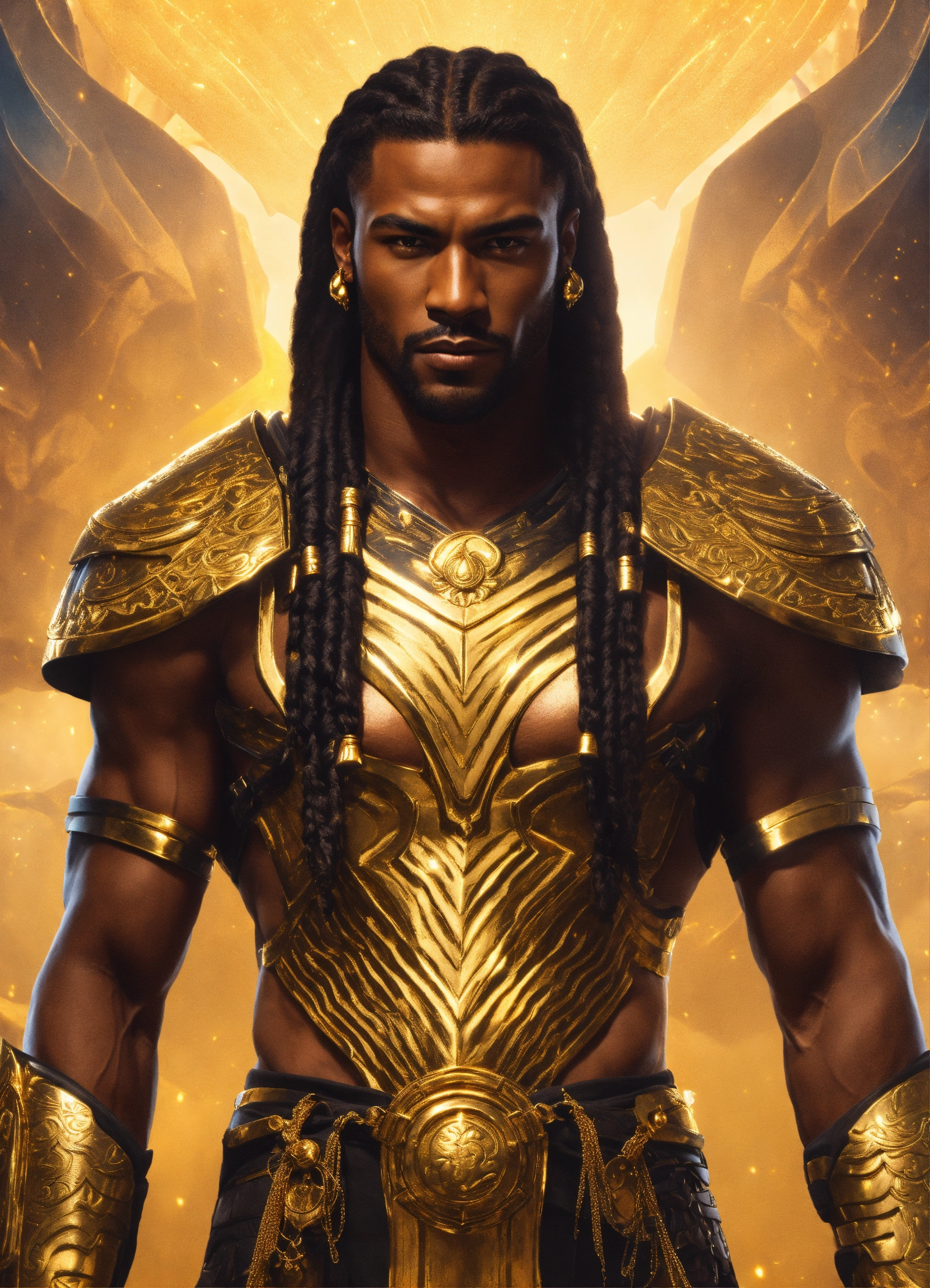 Full body, nubian sky god, handsome muscular black egyptian futuristic fantasy warrior man with gold and black armor, manly man, long braided hair