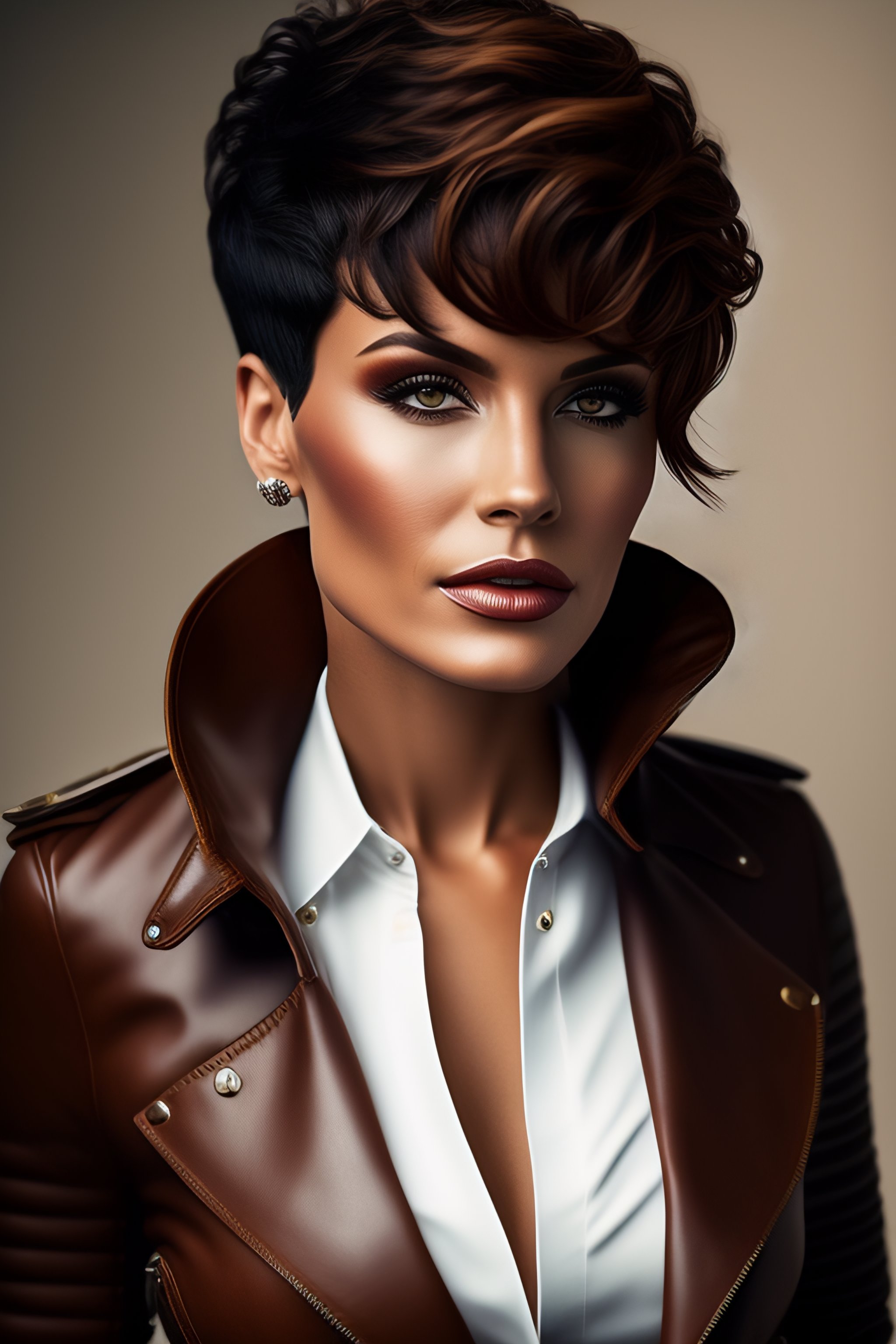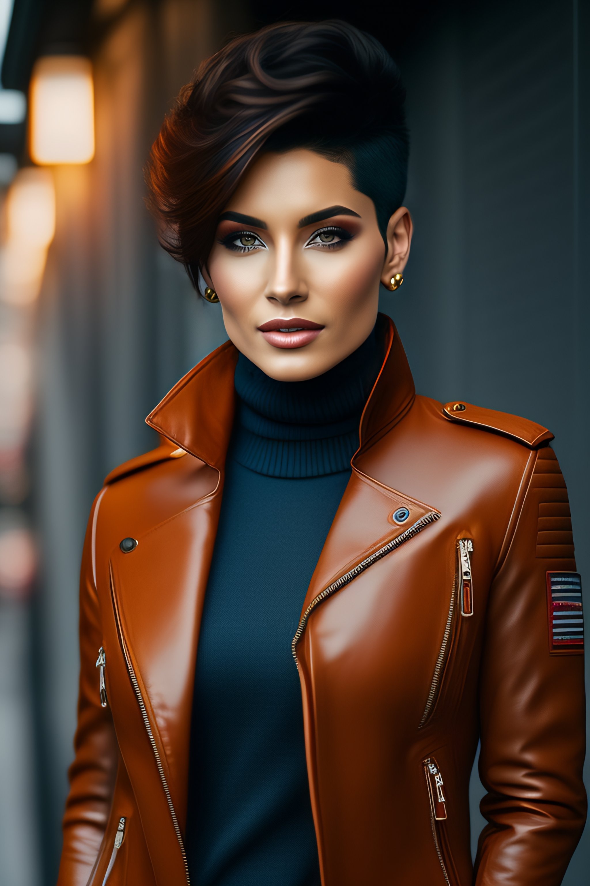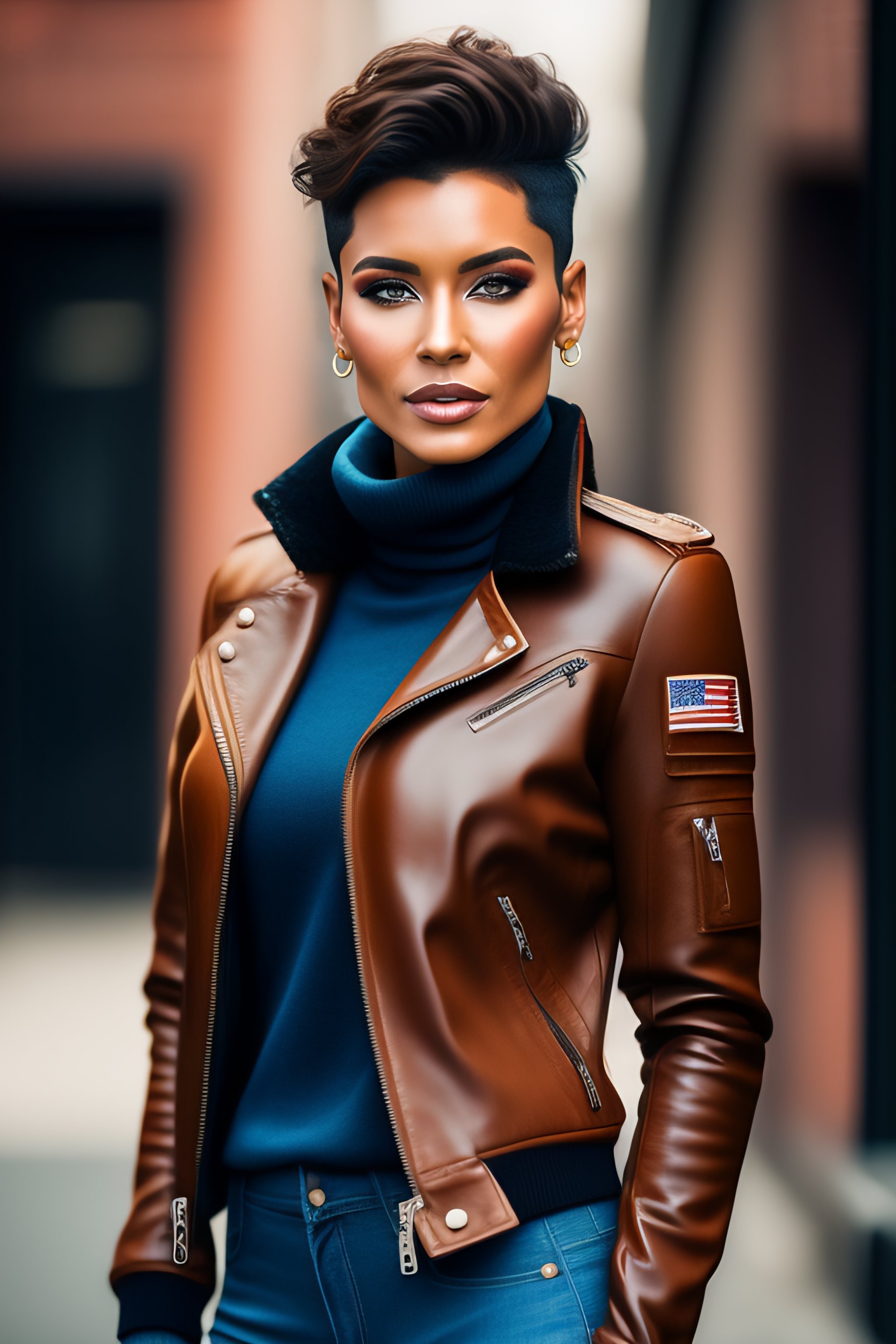 Beautiful woman in brown leather pilot jacket, very short hair, photography, extreme detail, full body, denim pants, short hairstyle