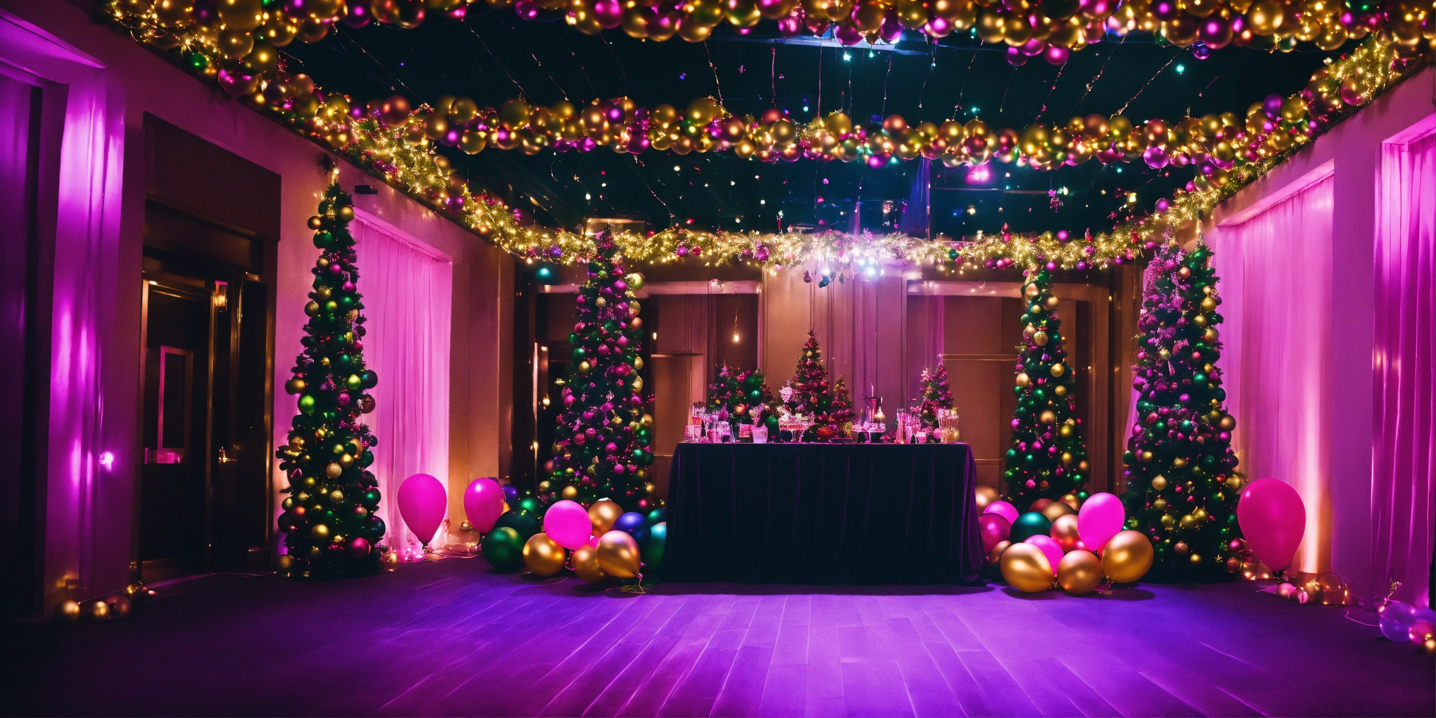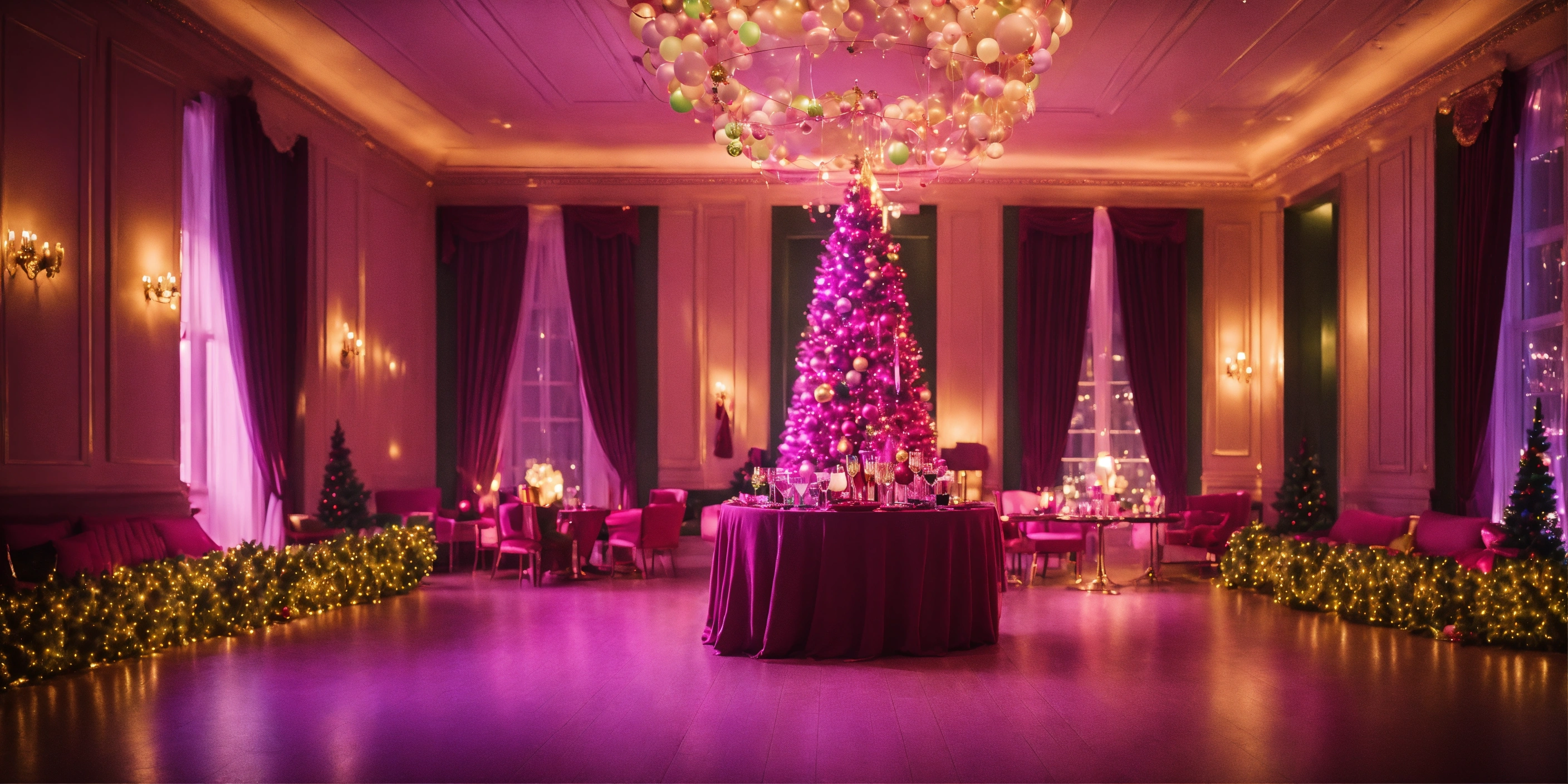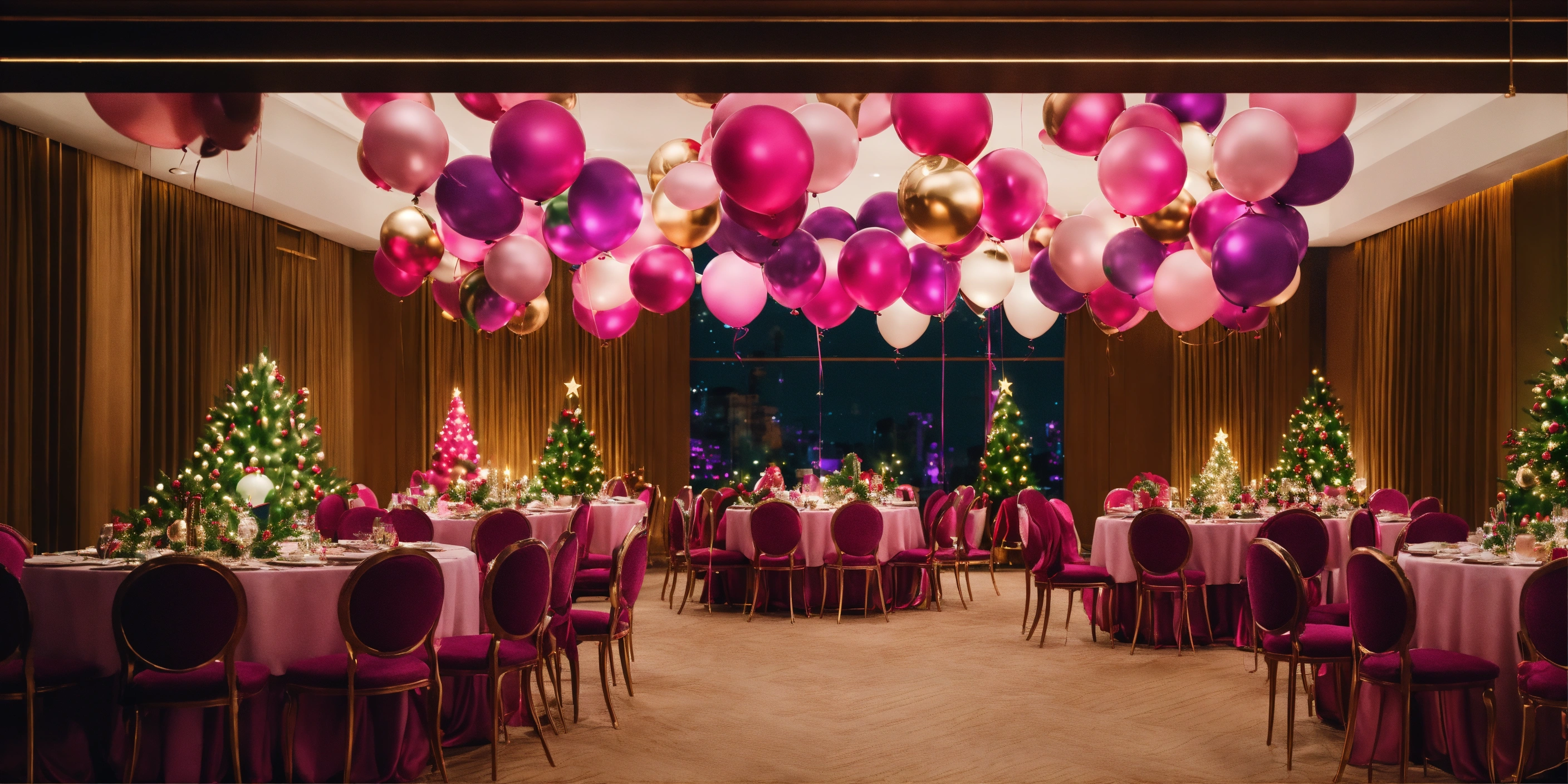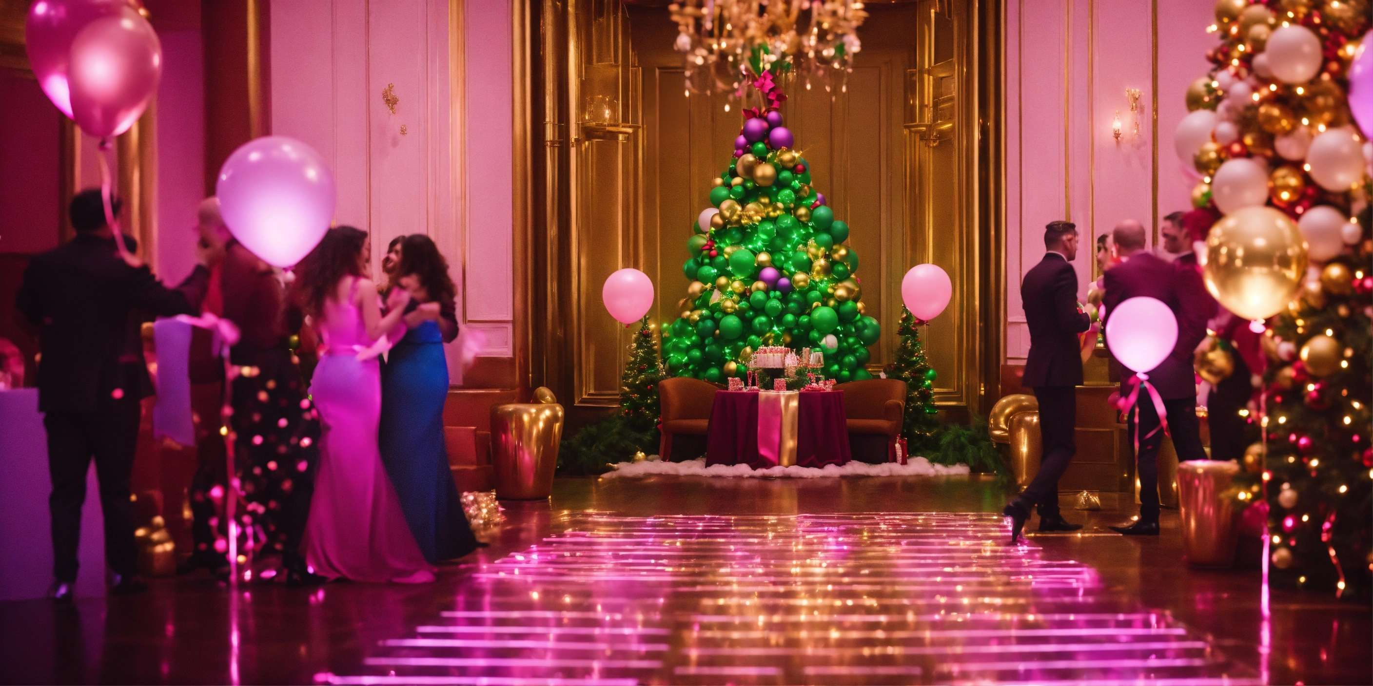Christmas party - luxury hotel - lots of decorations - balloons - lights - couples dancing - drinks - pink - purple - gold - dark green - 8k cinematic