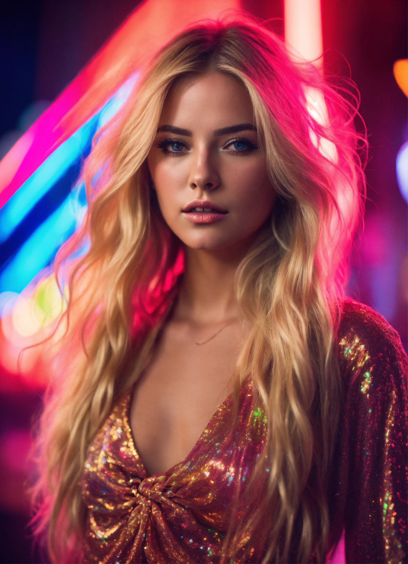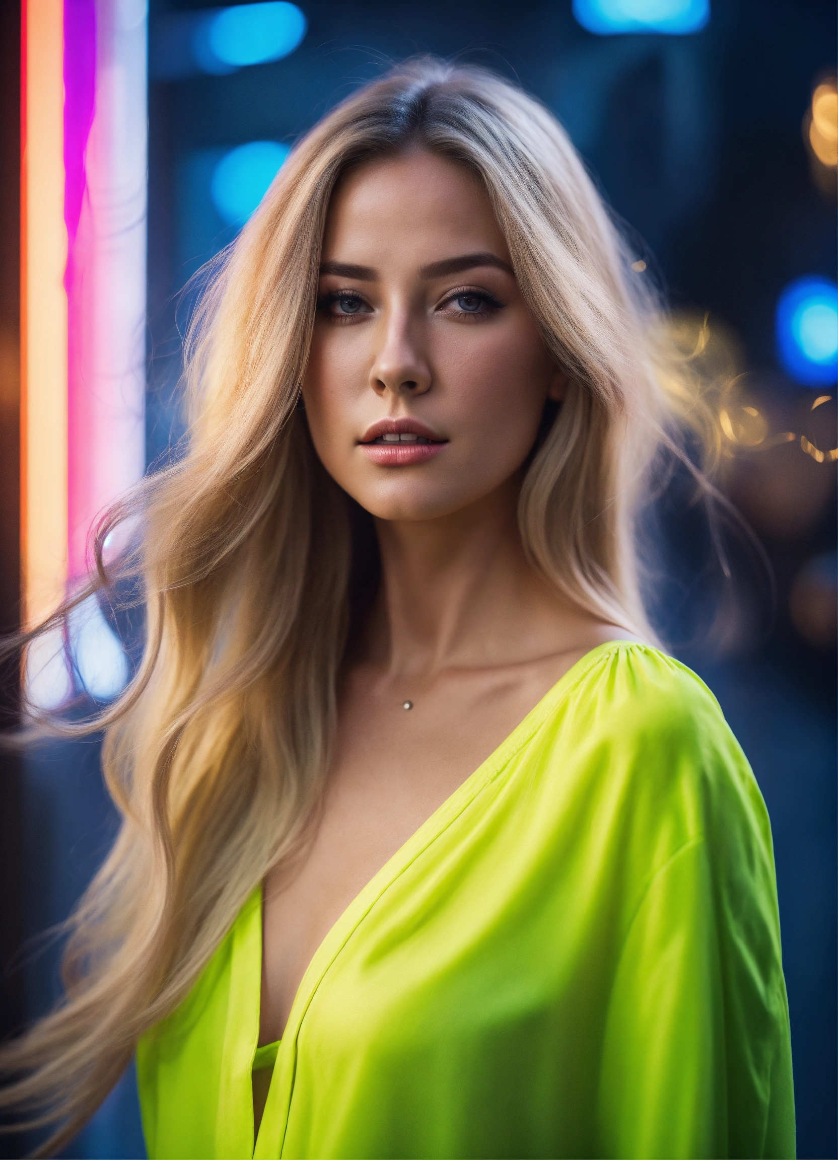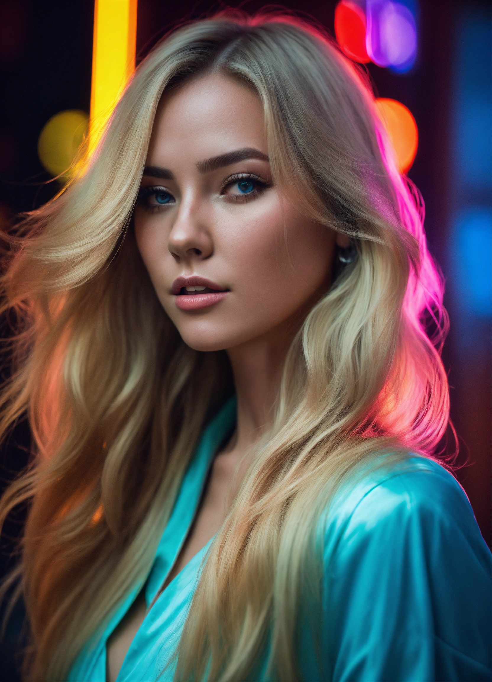Cinematic photography, modern, beautiful woman long blonde flowing hair, coquette archetype, chic boutique, proportionate, neon colors details, realistic, ultra 8k resolution
