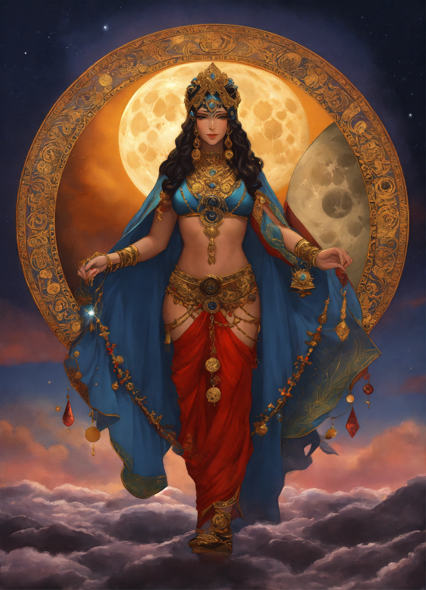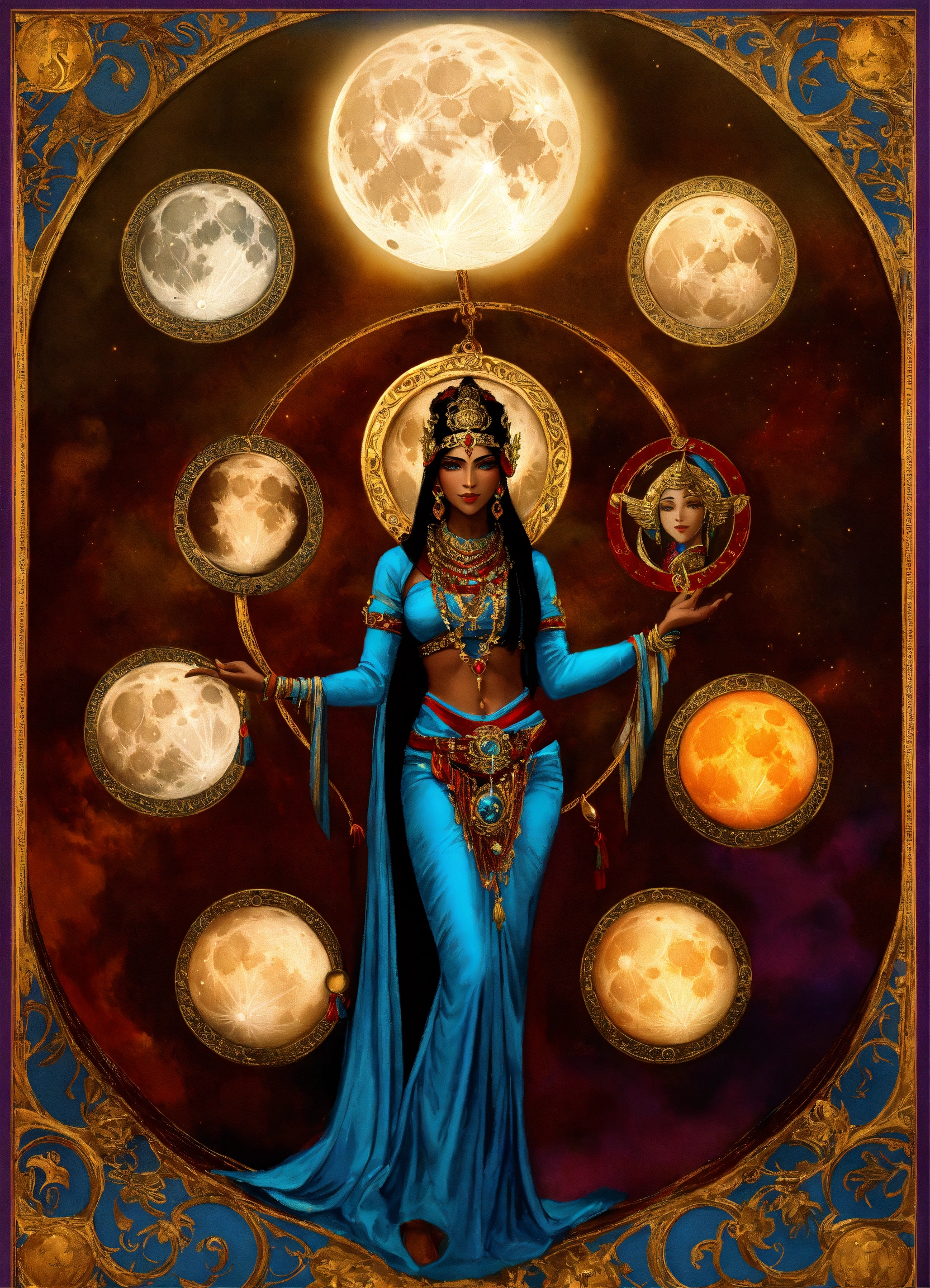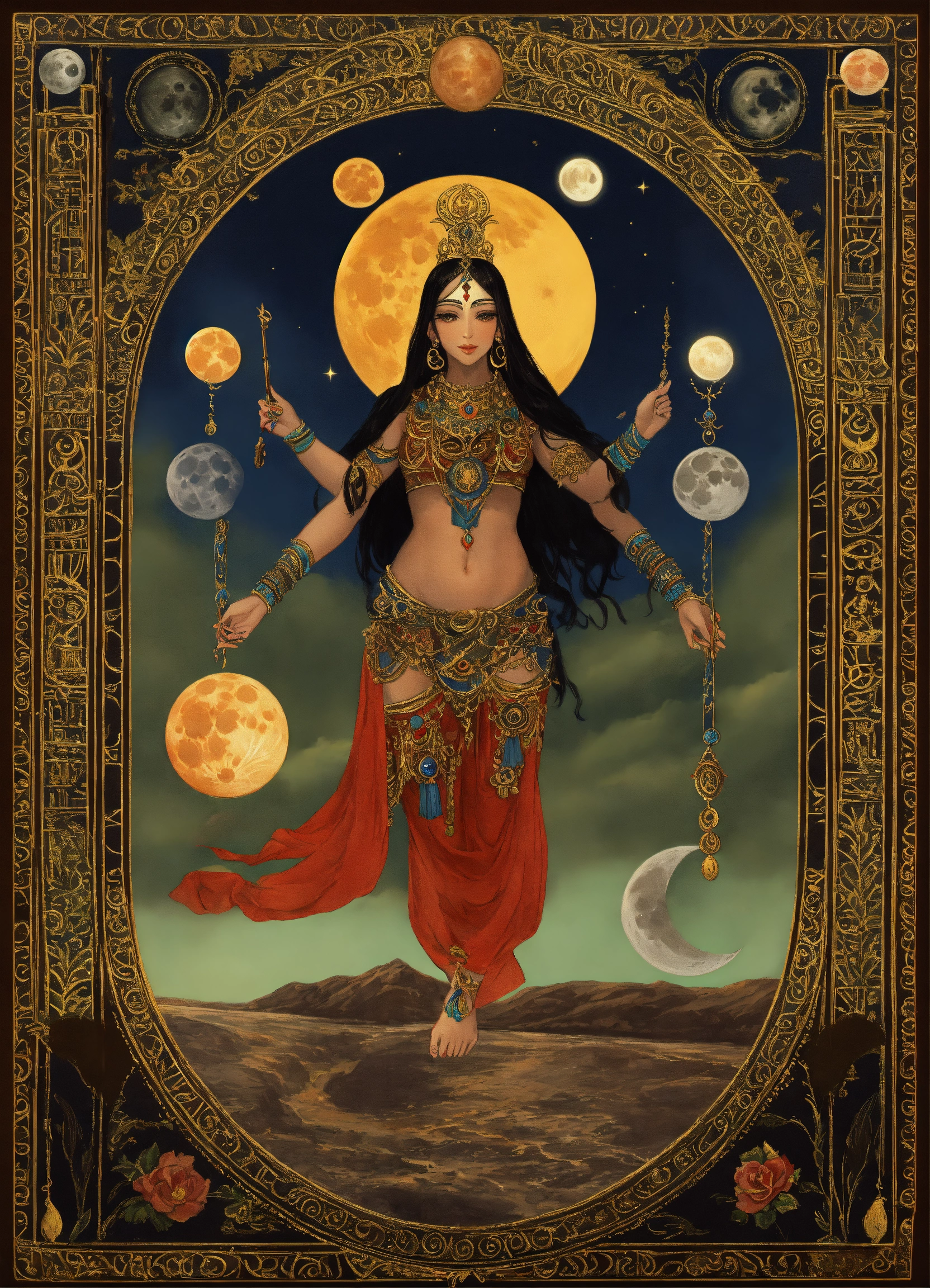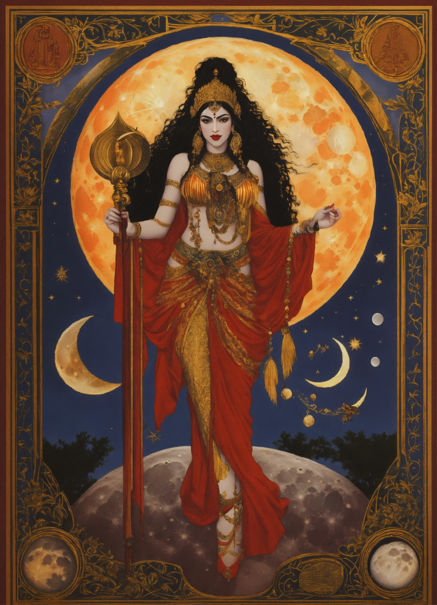 Artwork for an oracle card of kali holding the stages of the moon above her - from left to right in an arc the stages of the moon can be seen from new moon to full moon back to new moon