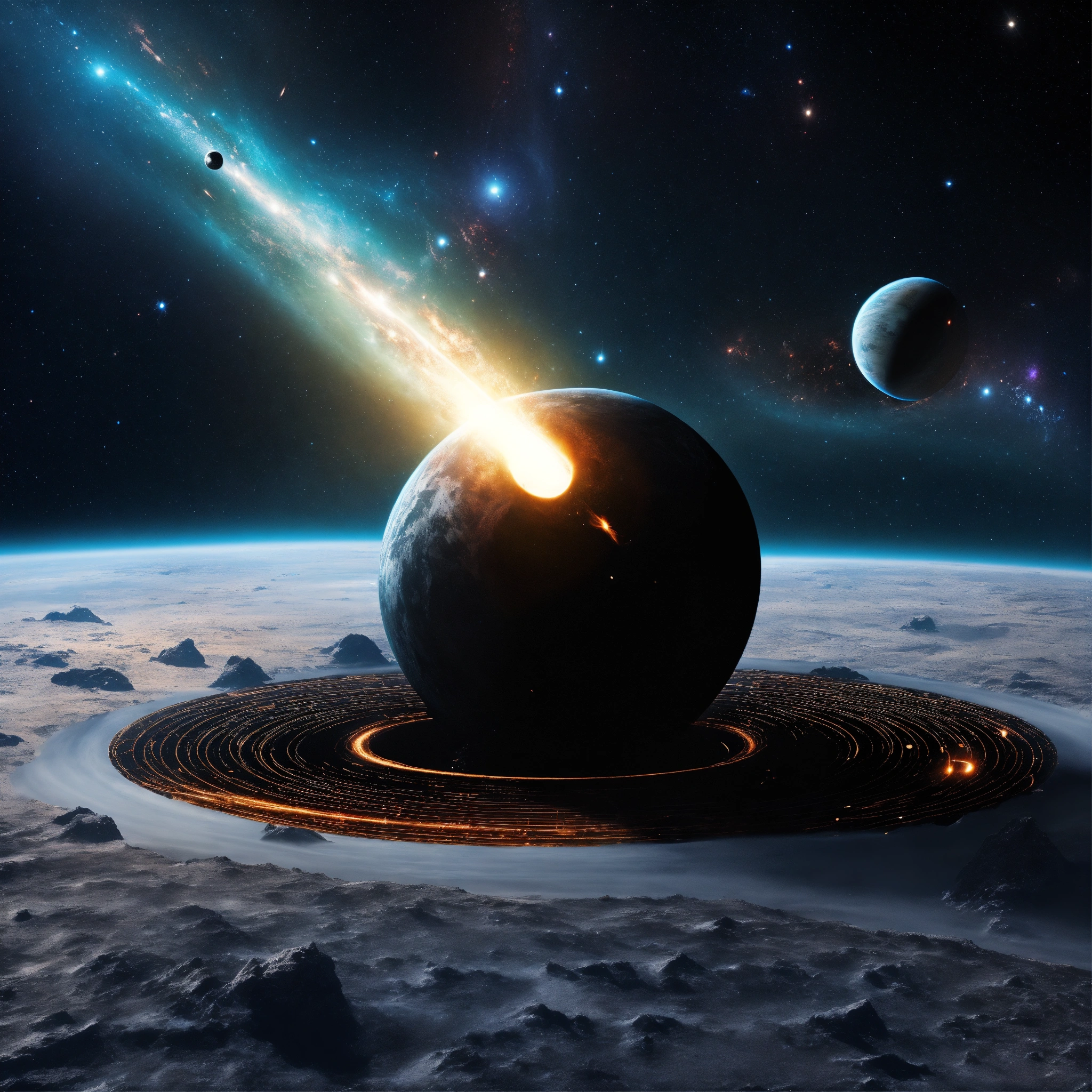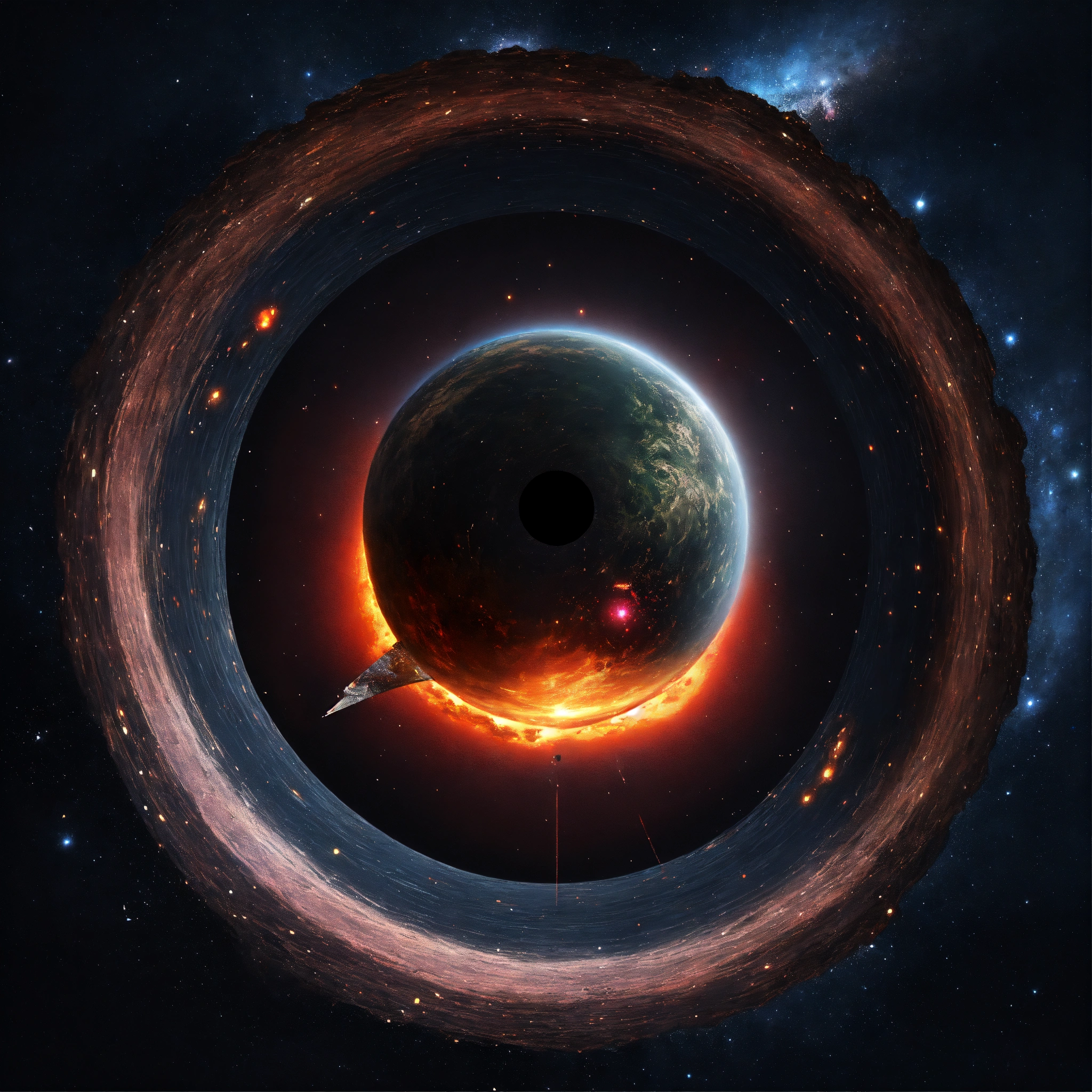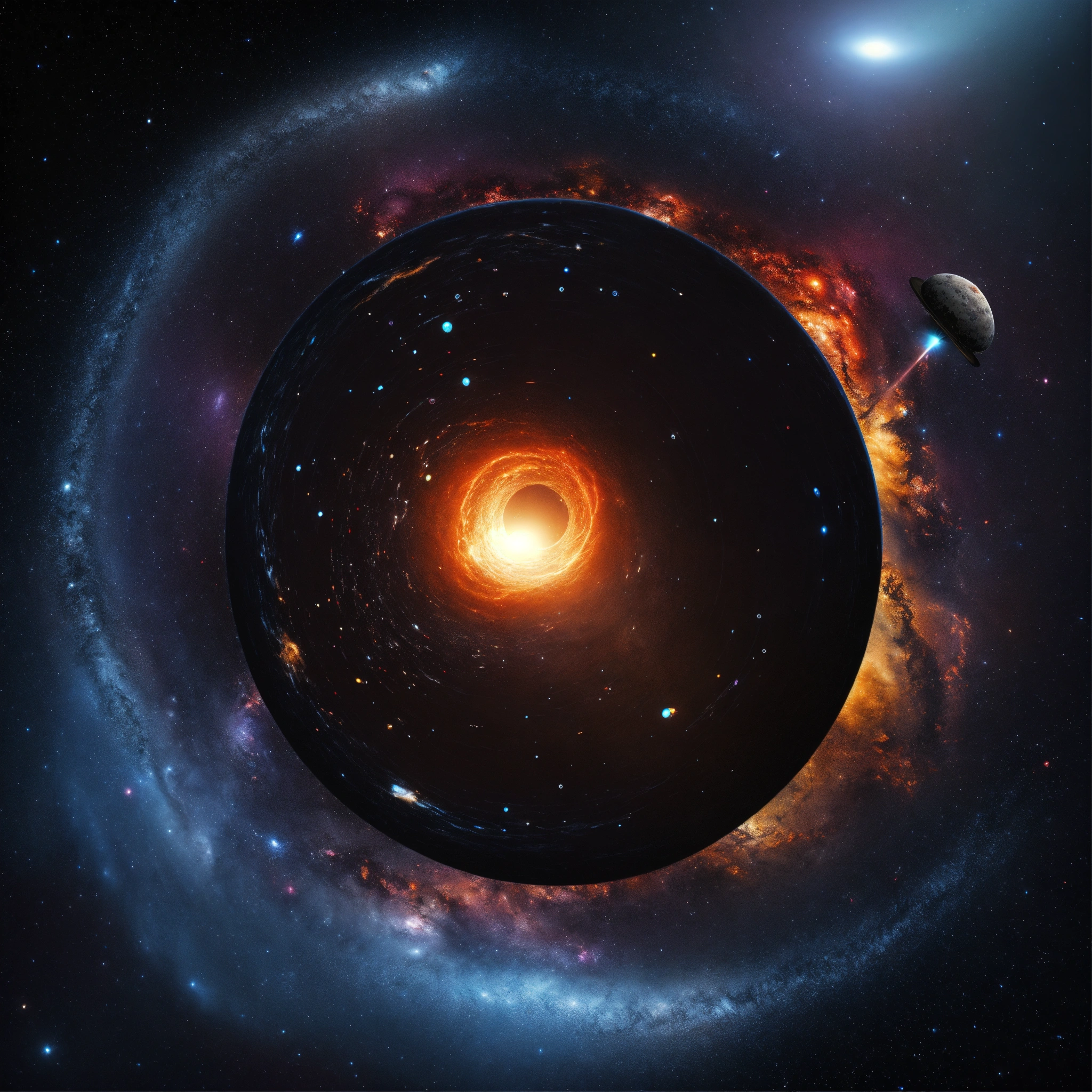 Digital art black hole containing satellite object succking up everything