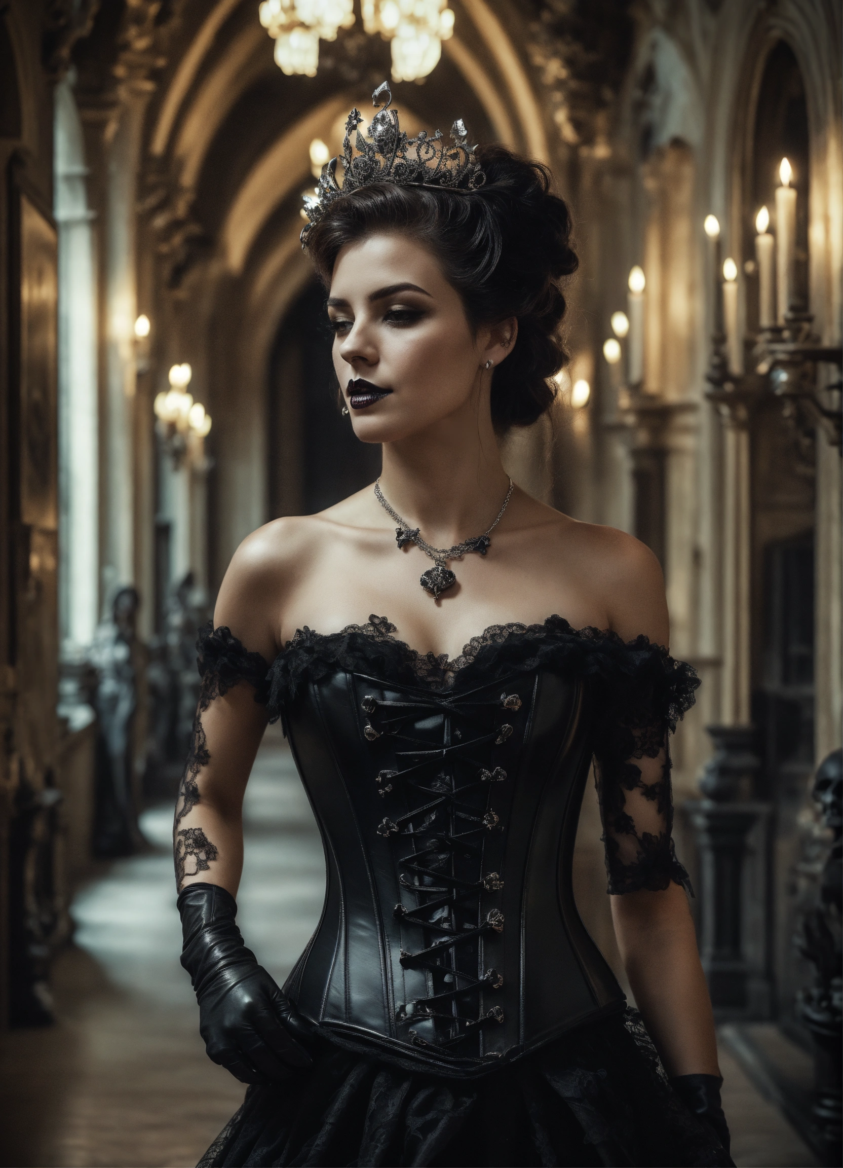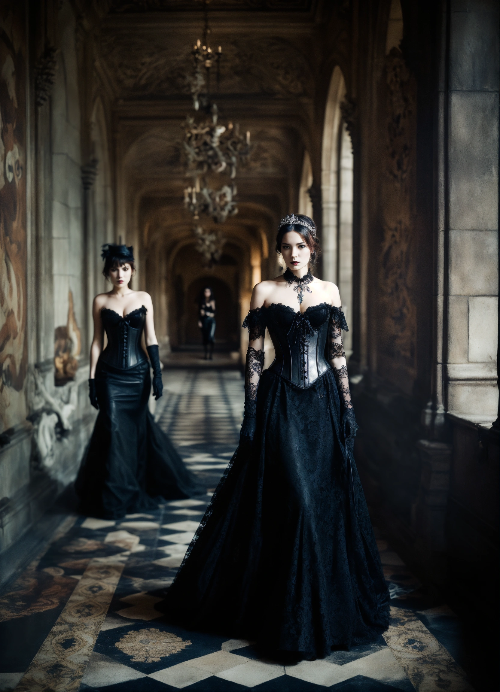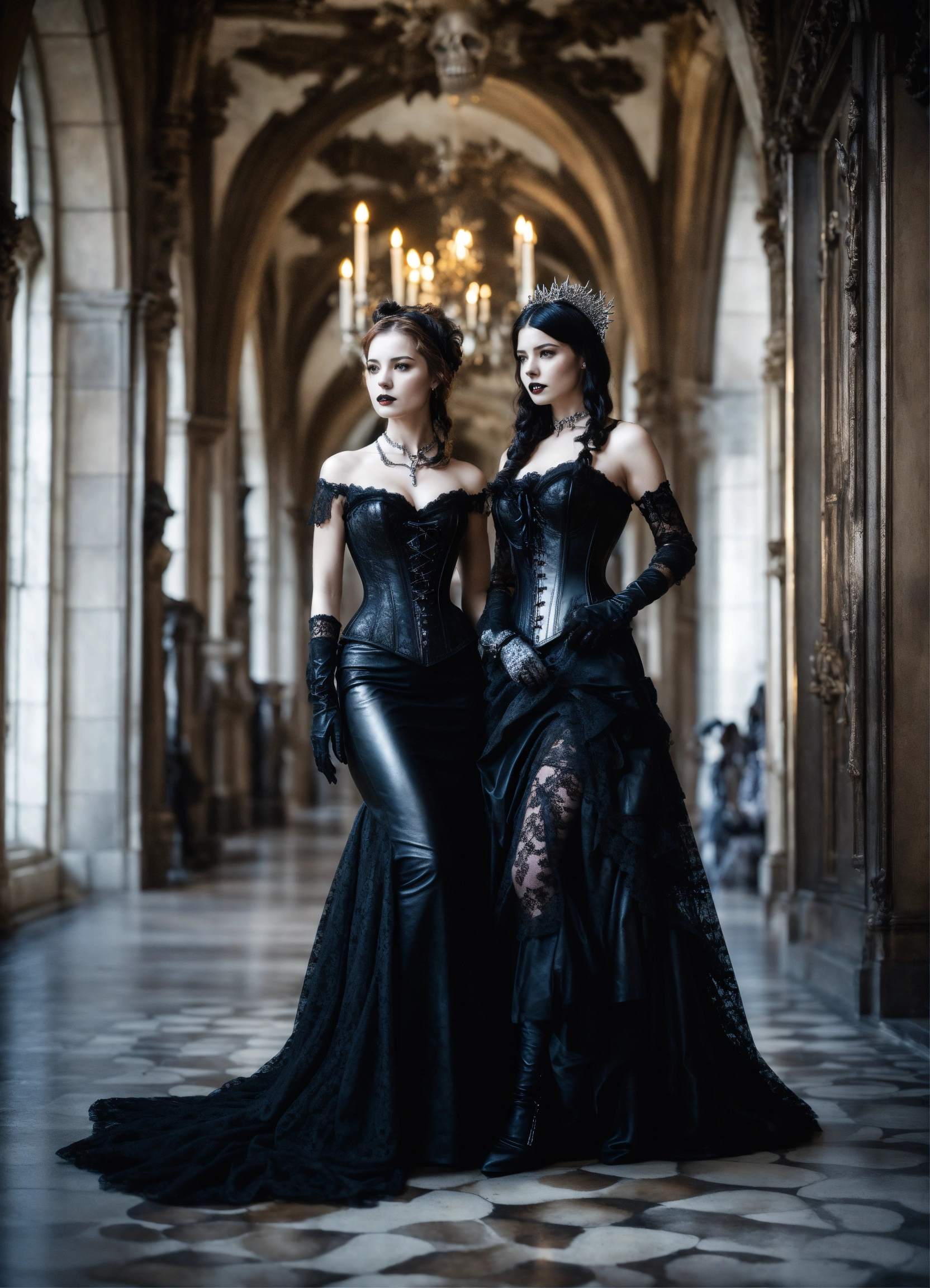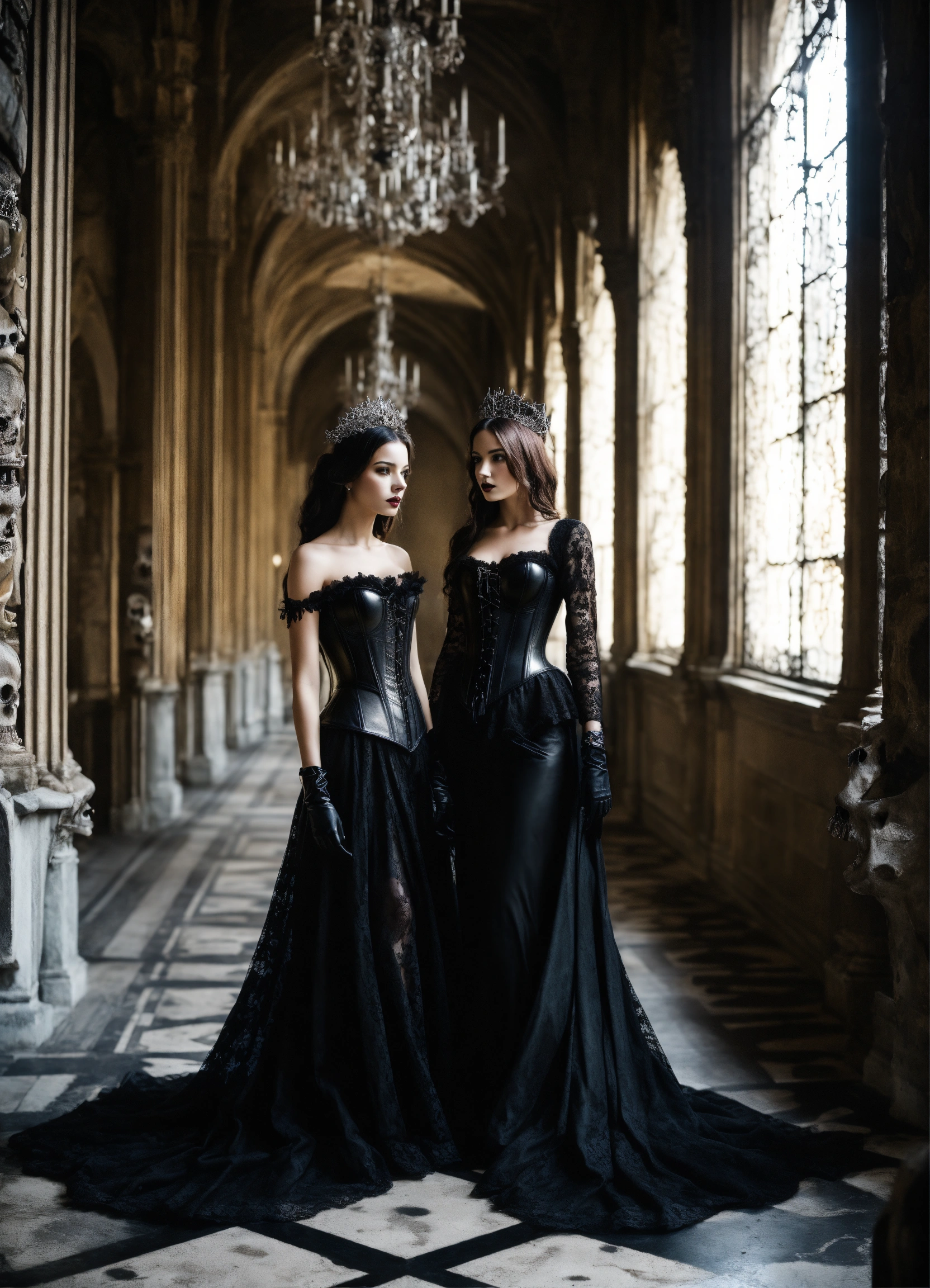 Two stunning young gothic women walking in a castle hallway wearing a black leather corset and black lace dresses black leather gloves silver tiaras, hyper-realistic, photographic portrait floor strewn with skulls and bones