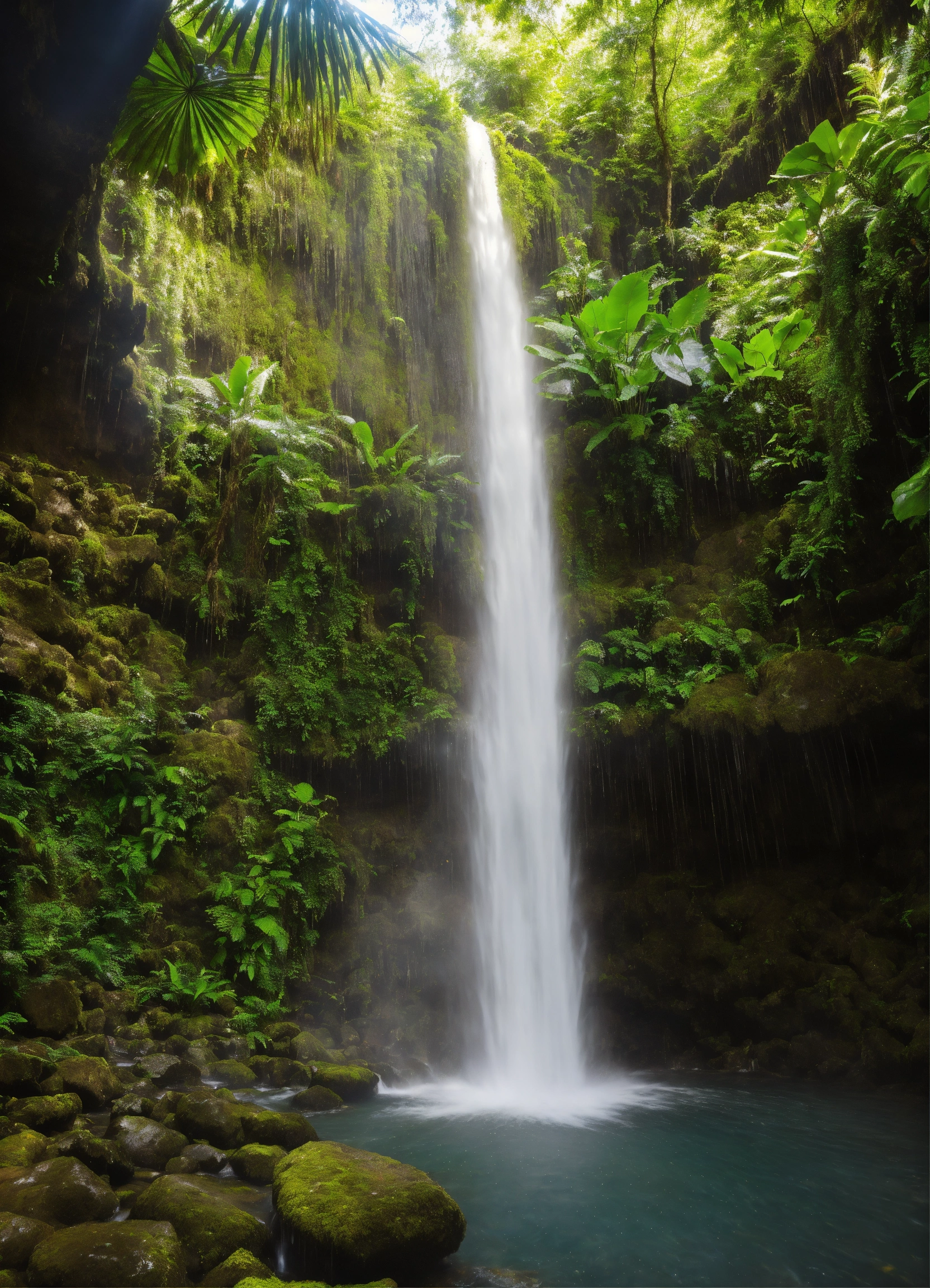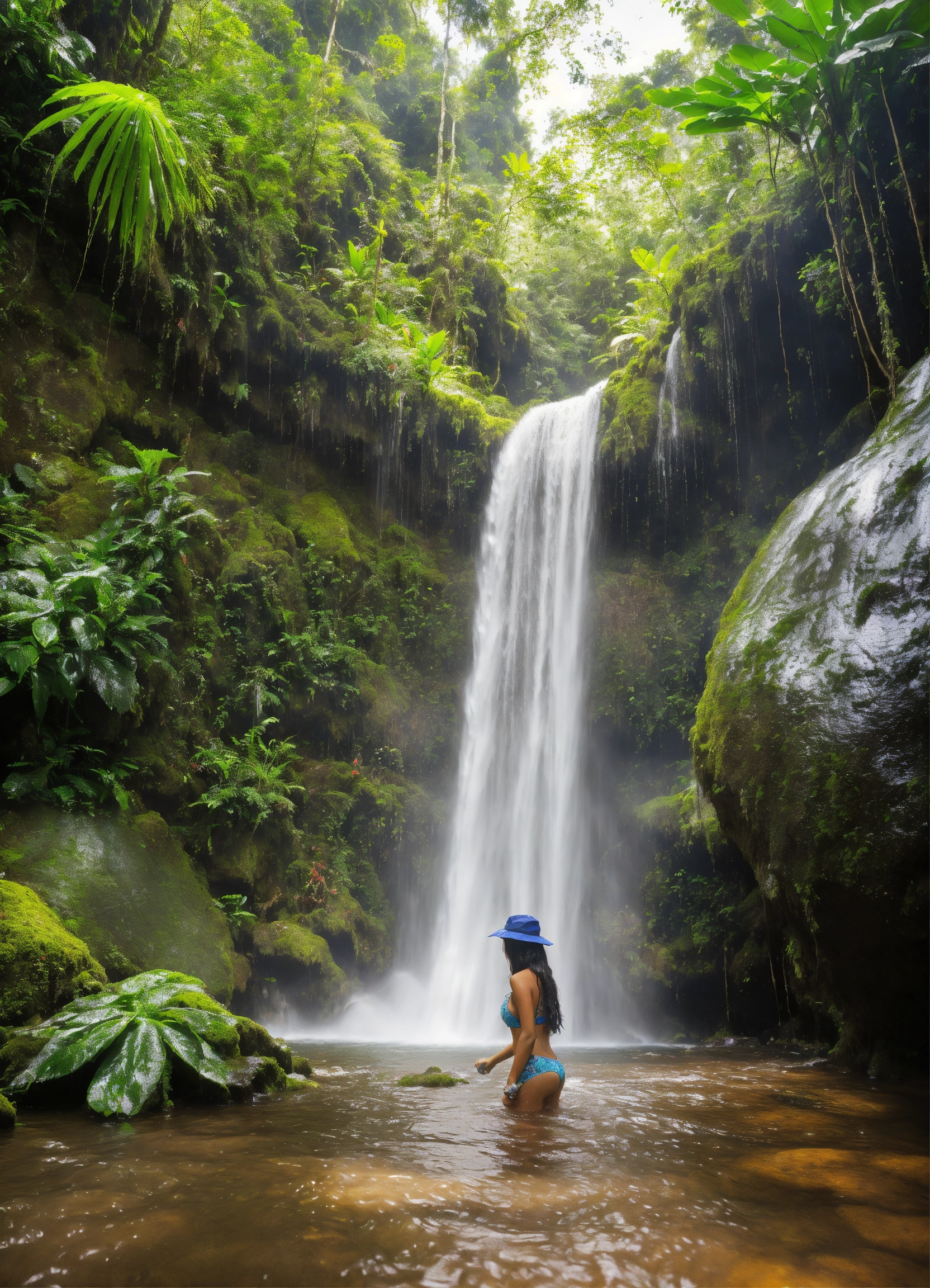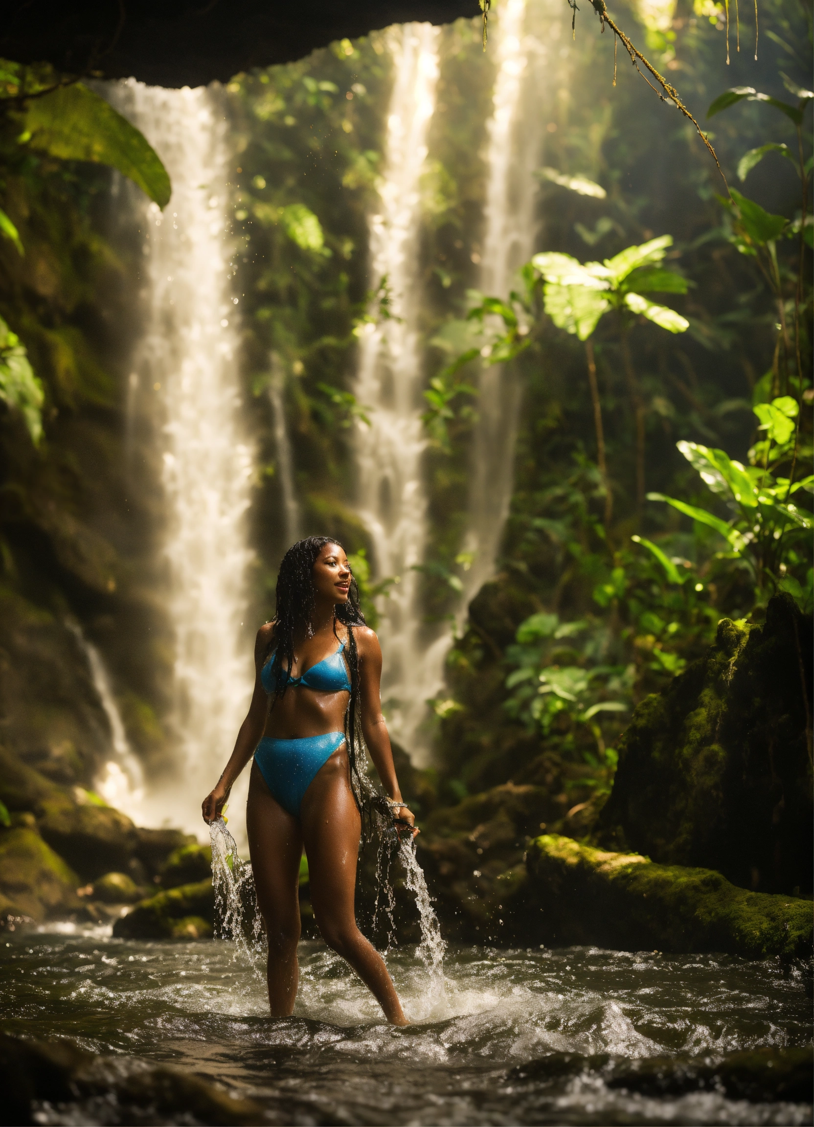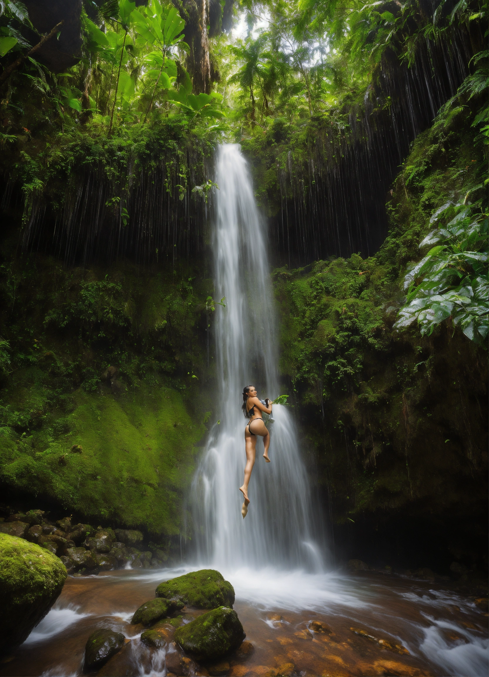 Nayade is splashing in an enchanted rainforest waterfall