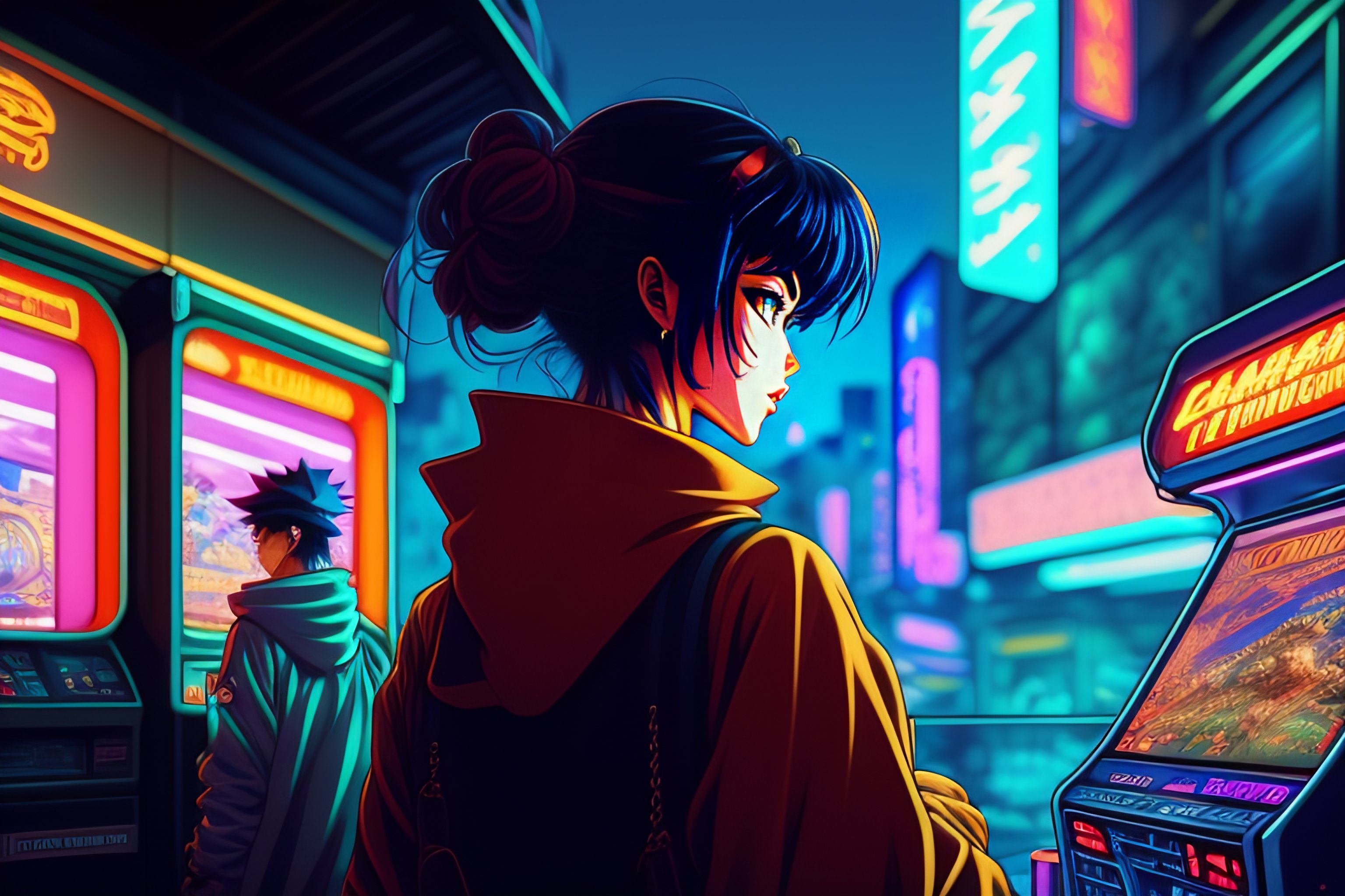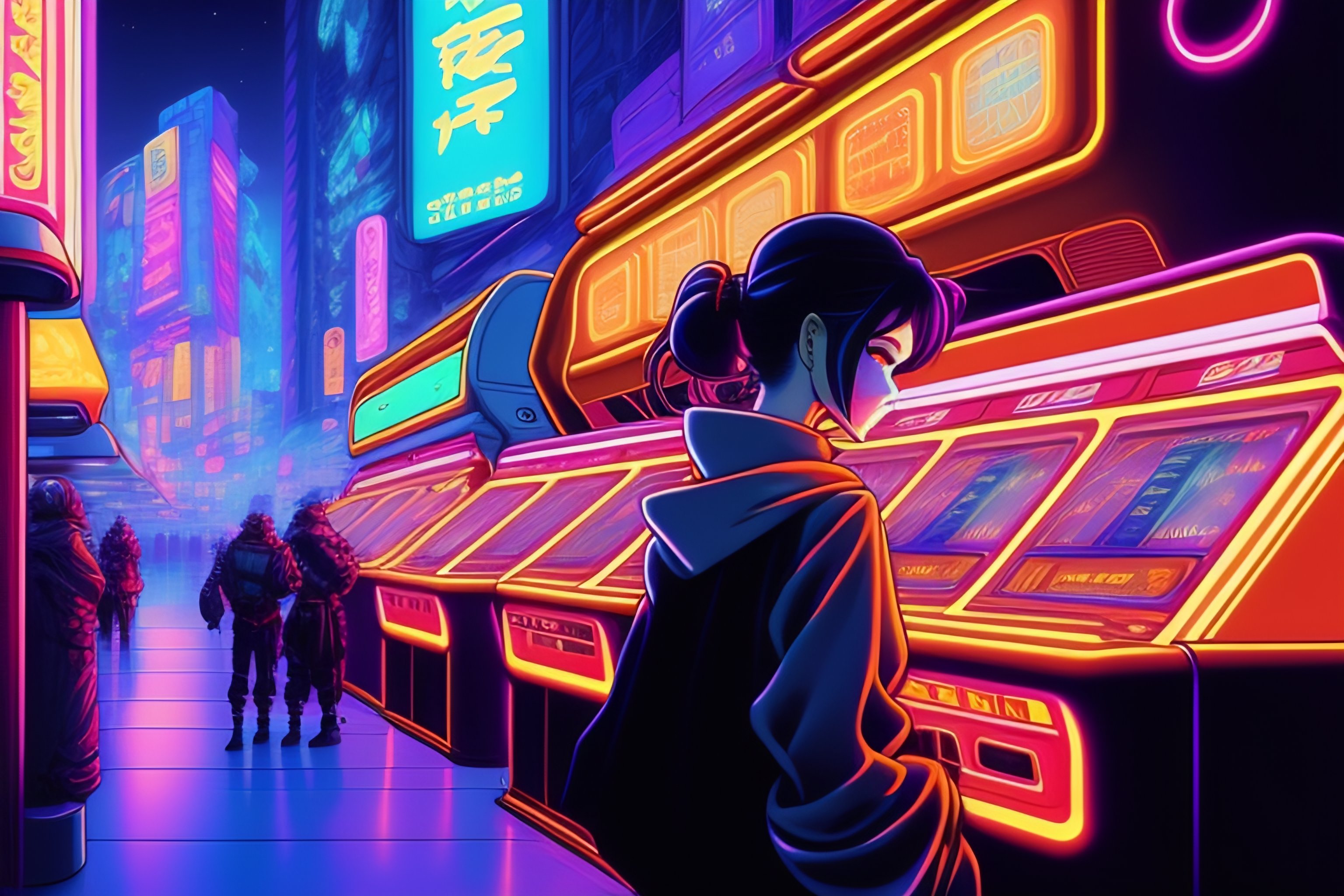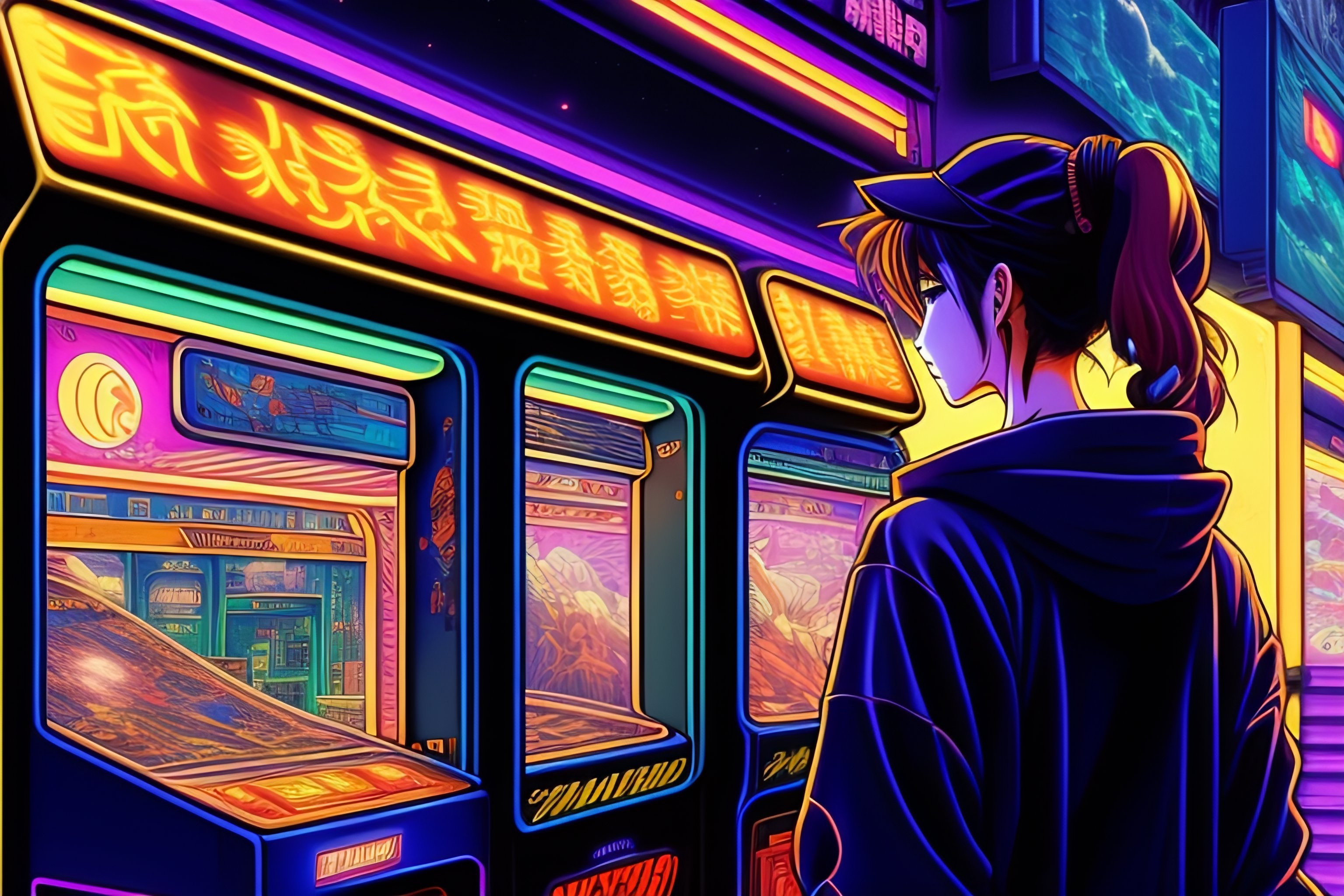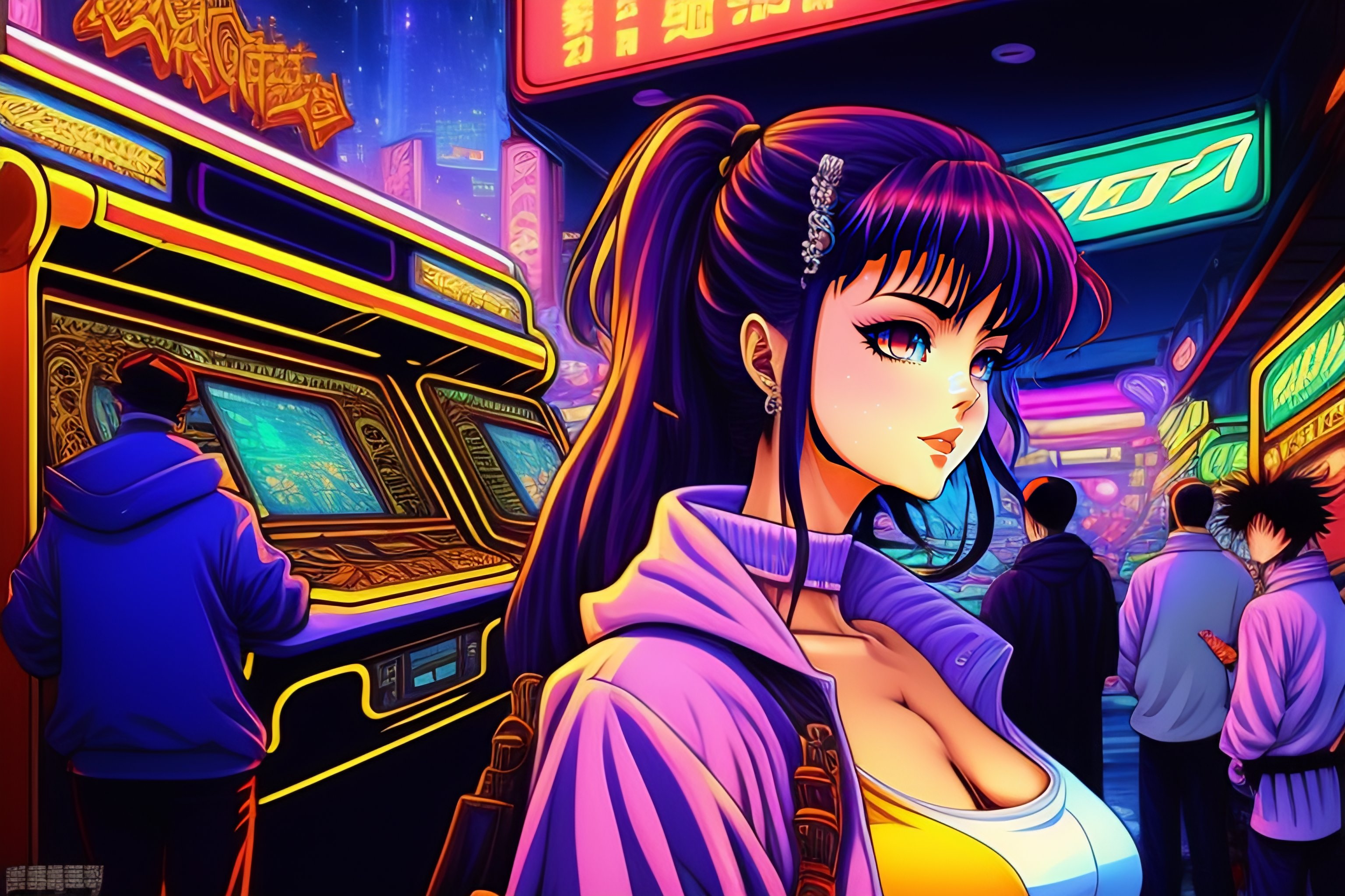 Vintage 90's anime style environmental wide shot of a chaotic arcade at night; a woman wearing streetwear playing an arcade game; by hajime sorayama, greg tocchini, virgil finlay, sci-fi. line art. environmental arcade art.