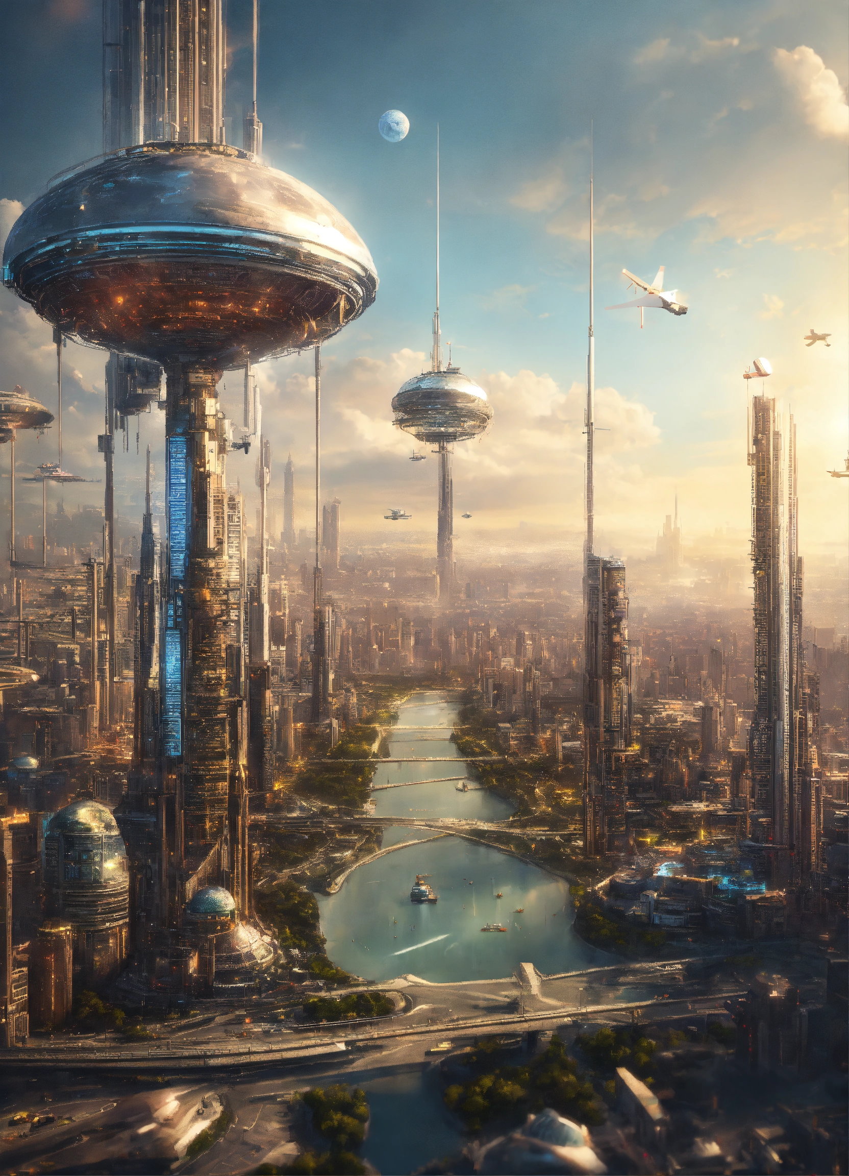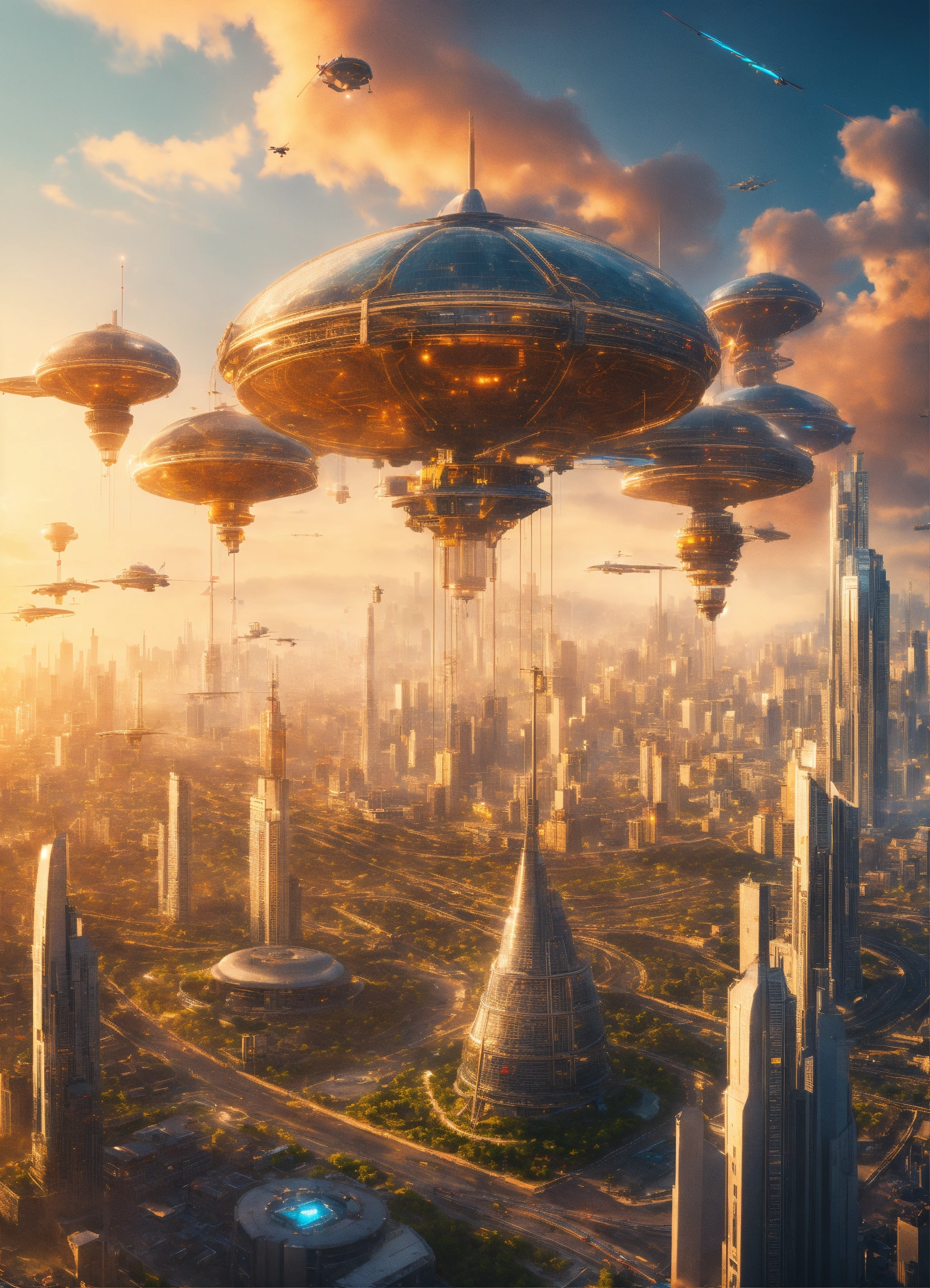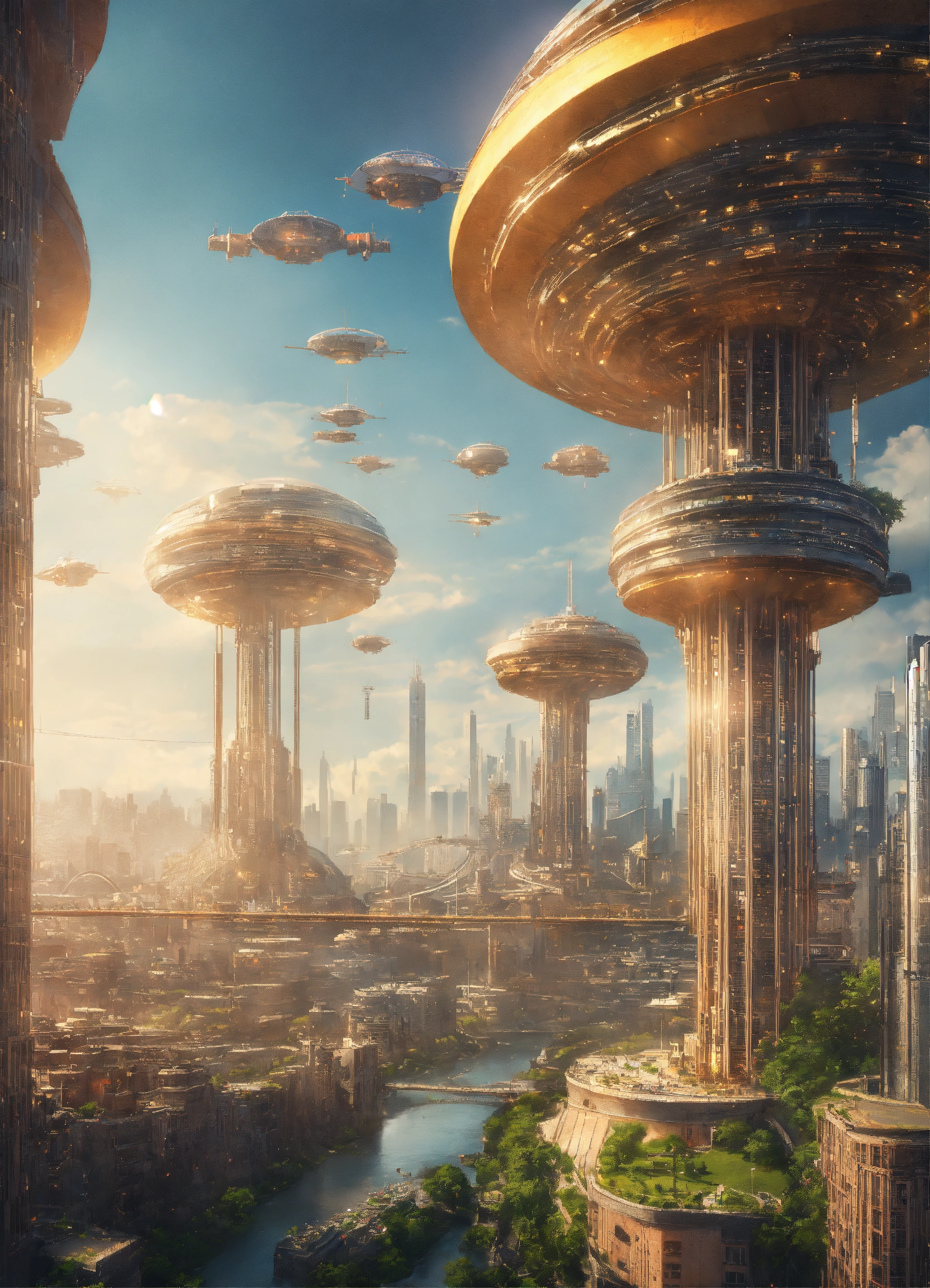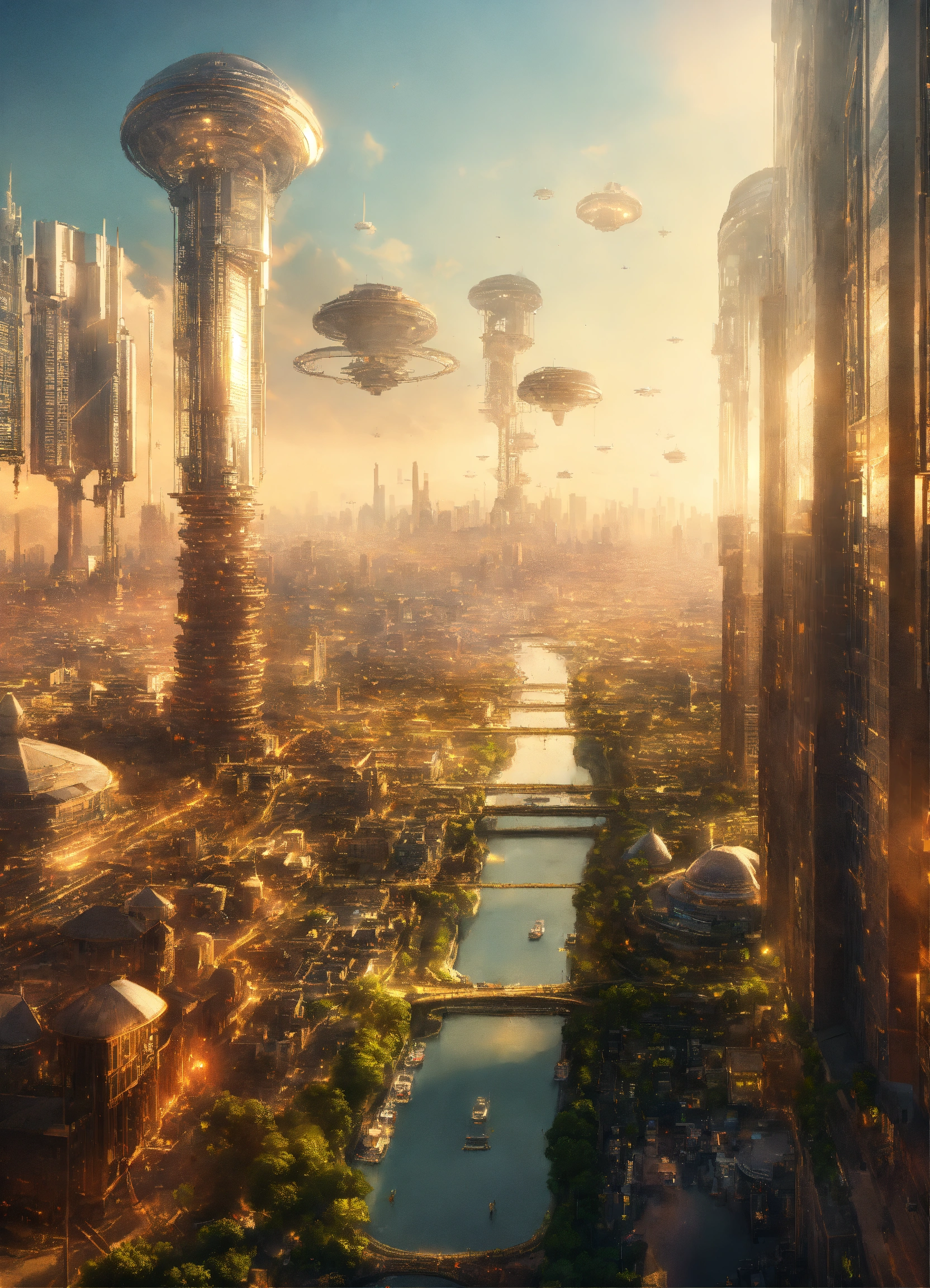 A harmonious city where humans and machines coexist. utopian future. cinematic light, aerial machines in the air.