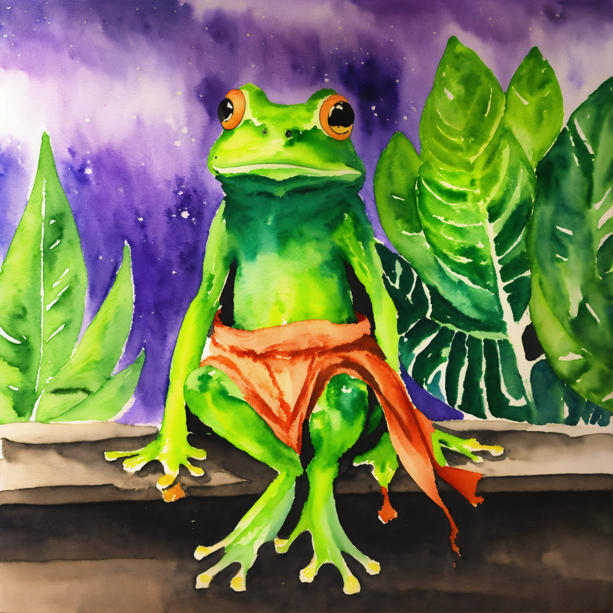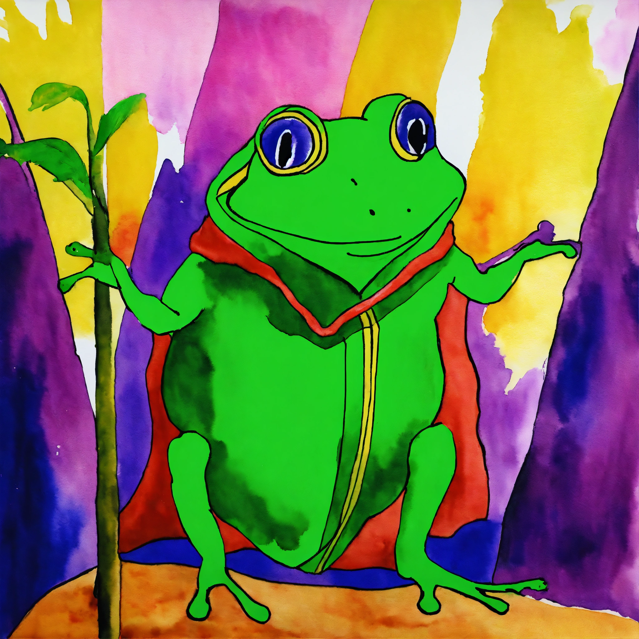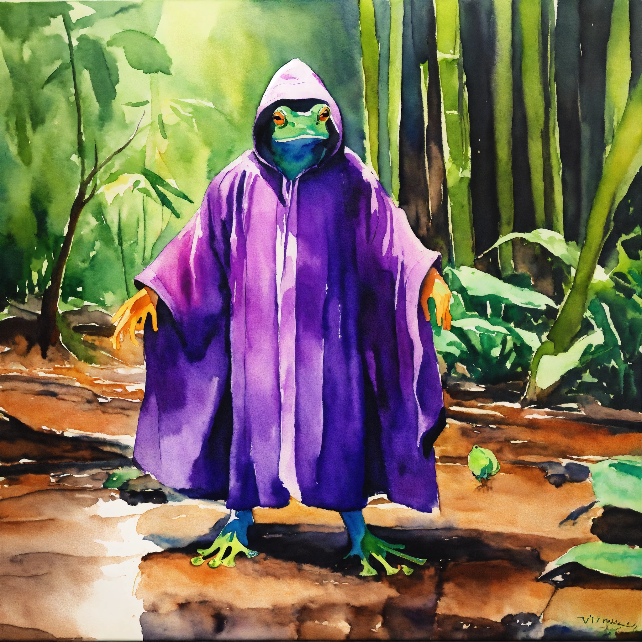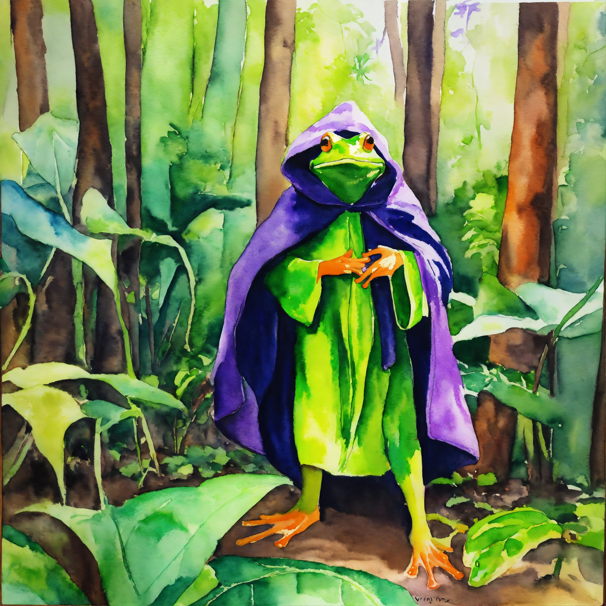 Amateur watercolor painting, high school art, basic watercolor, simple watercolor on canvas, vivid colors, bright colors, bright green, tropical rainforest, bad art, simple, vivid colors, frog wearing hooded purple robes, frog man with robes on, humanoid frog standing up wearing purple robes with a hood
