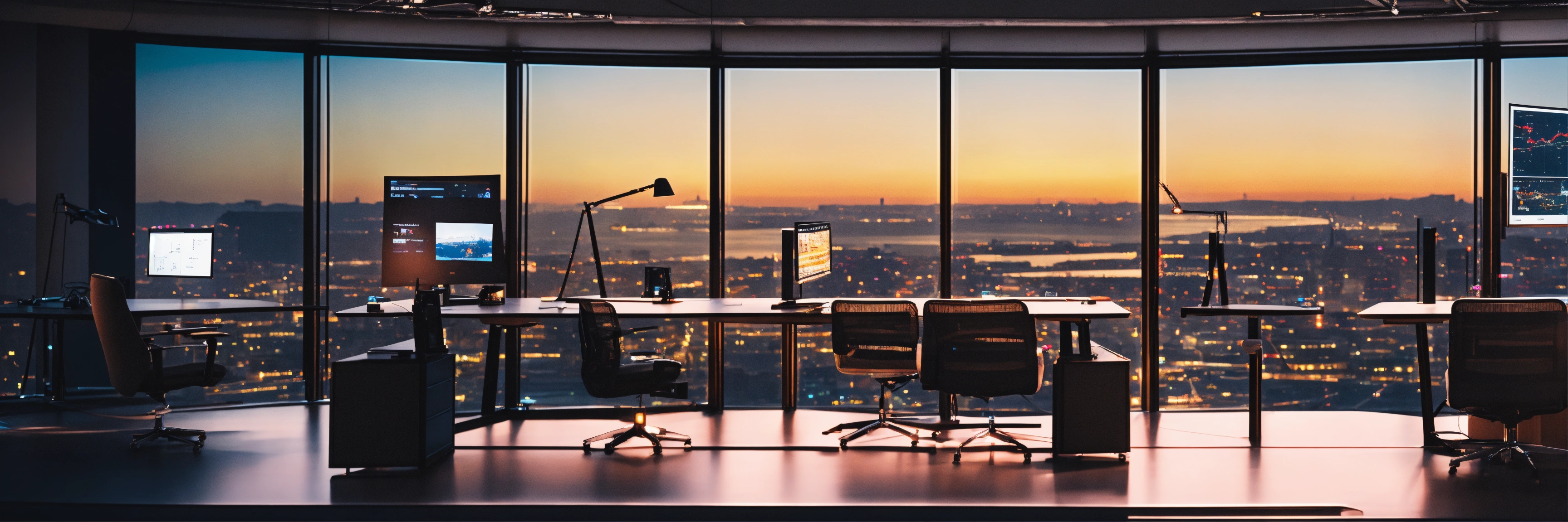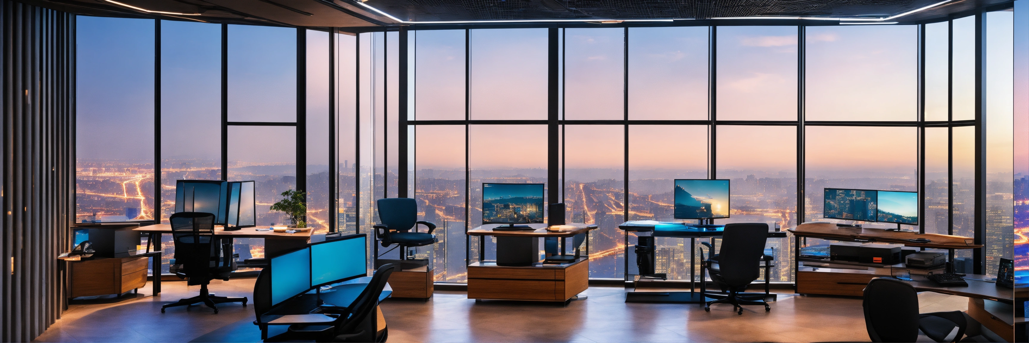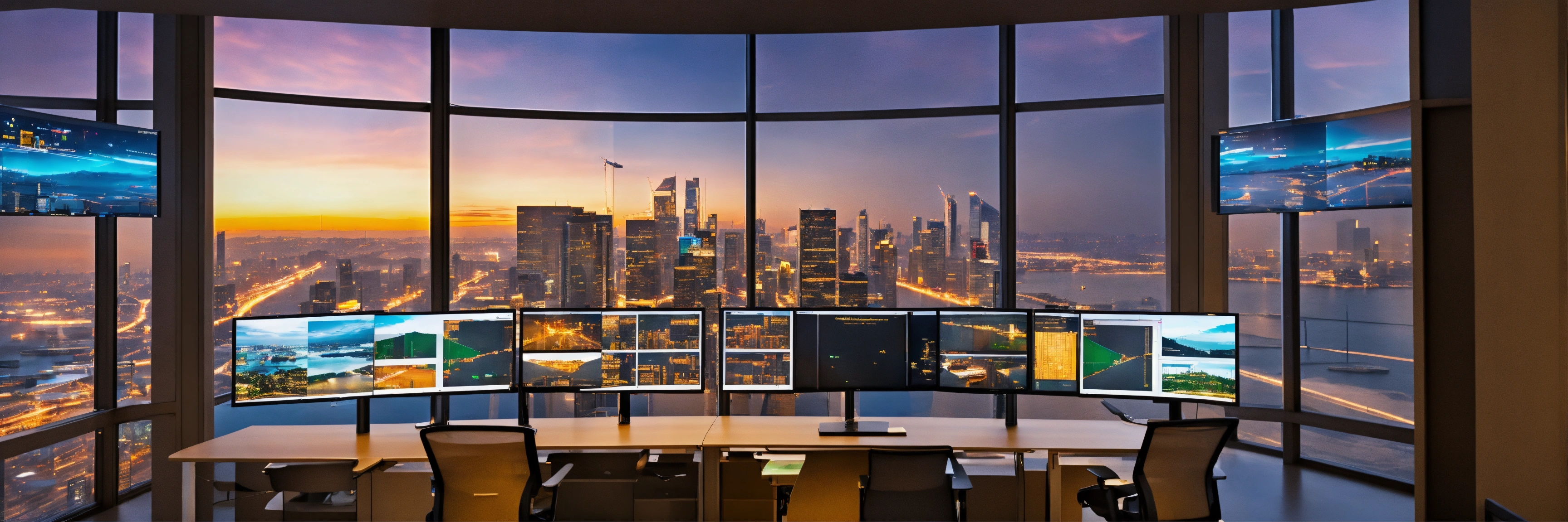Design multiple monitors displaying real-time data, neat, organized space with modern furniture. view skyscrapers and financial district scenery. lighting a blend of natural and artificial light ensuring clear visibility of data on screens.