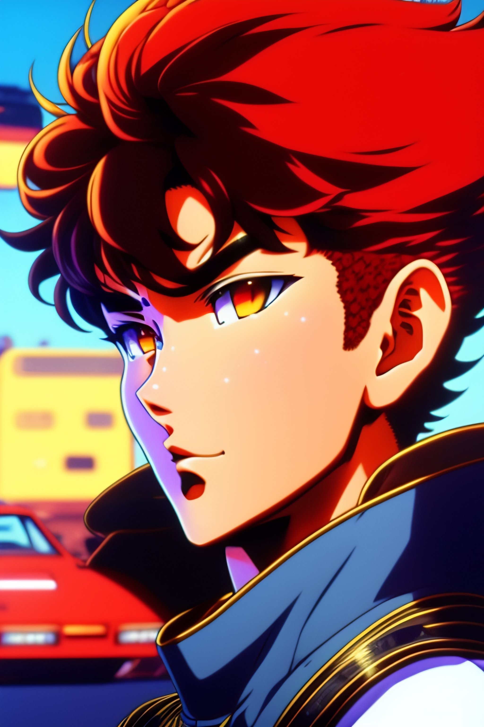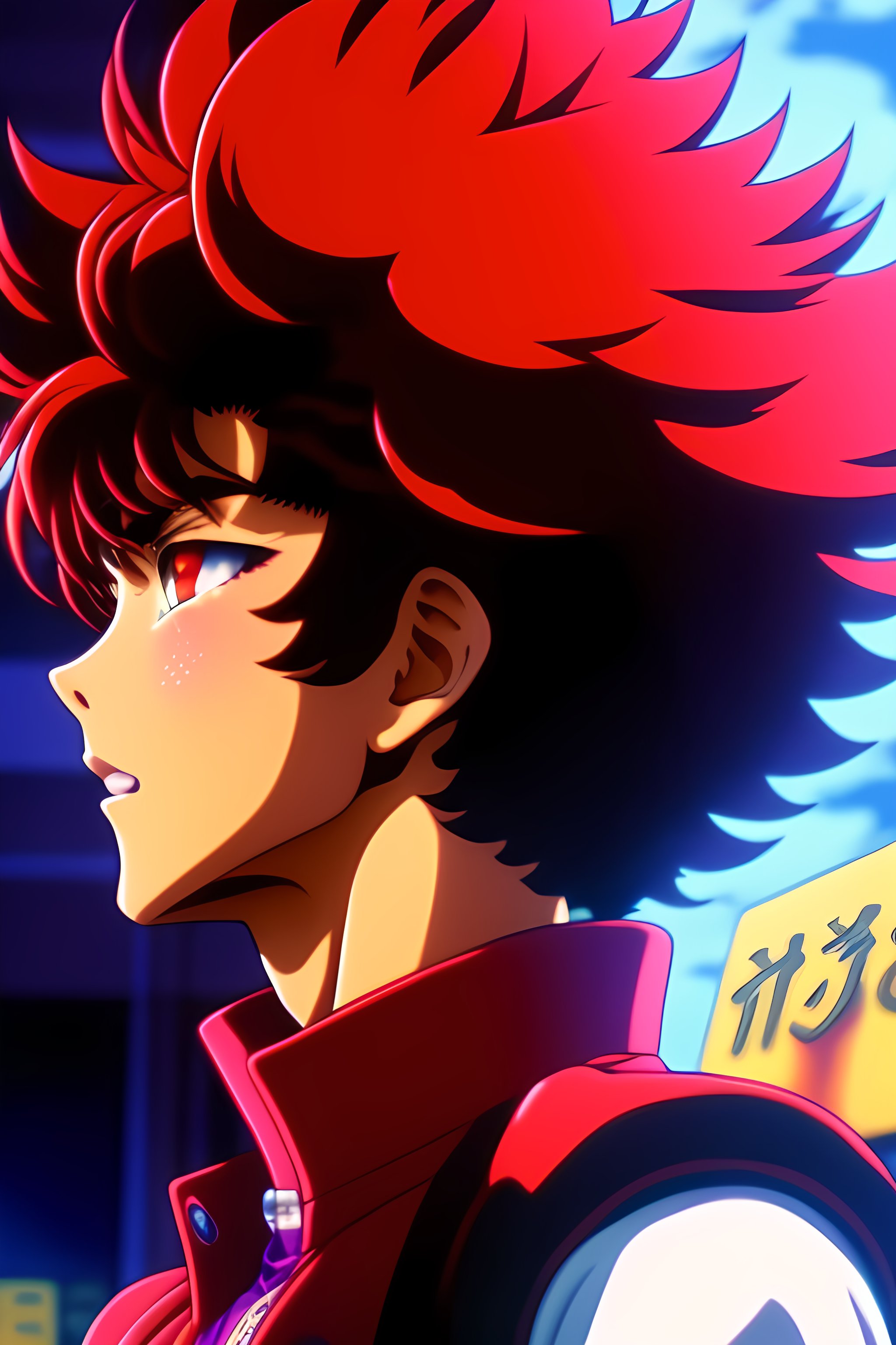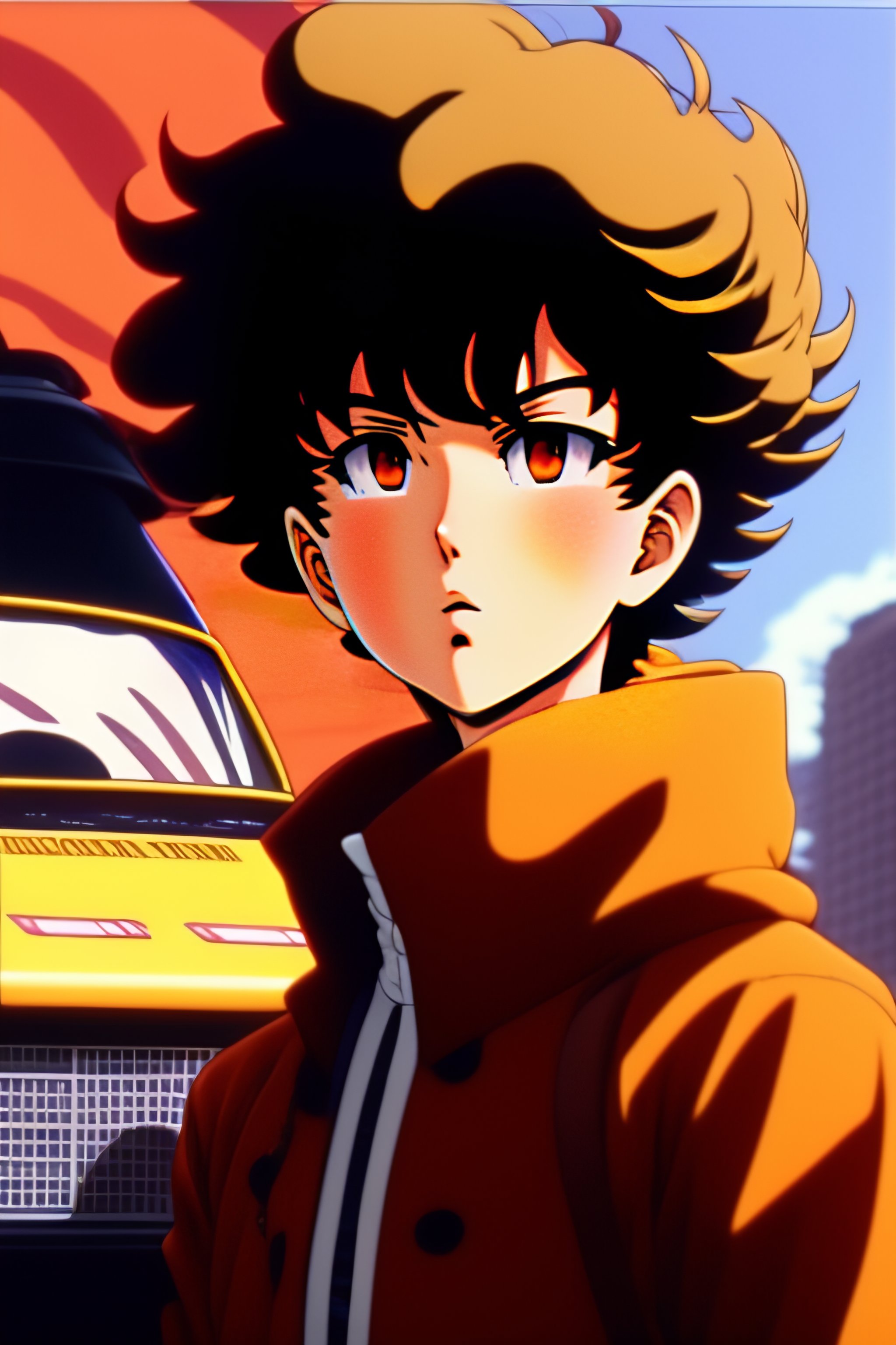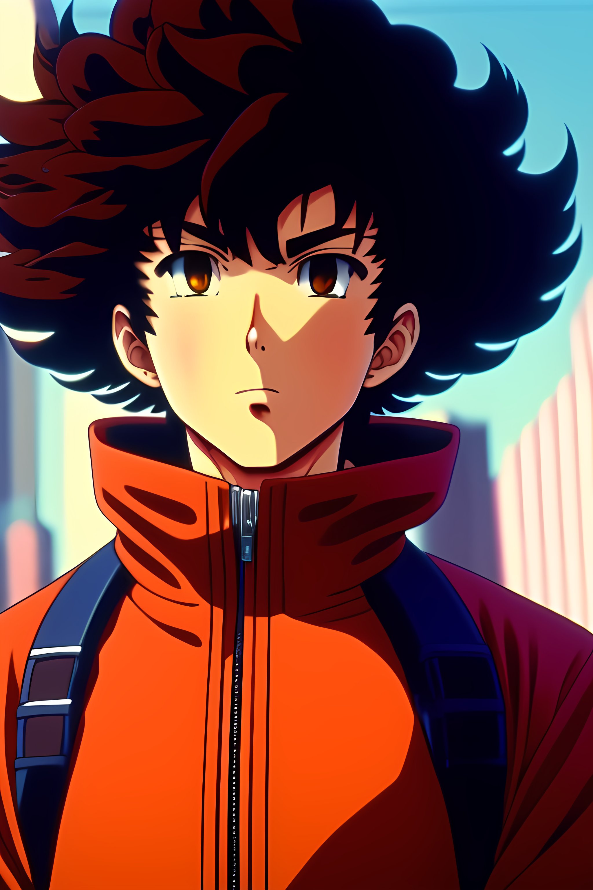 Vintage anime screenshot of akira, 90s anime aesthetic. stunning maximalist action shot of the protagonist with curly brown hair escaping from the police