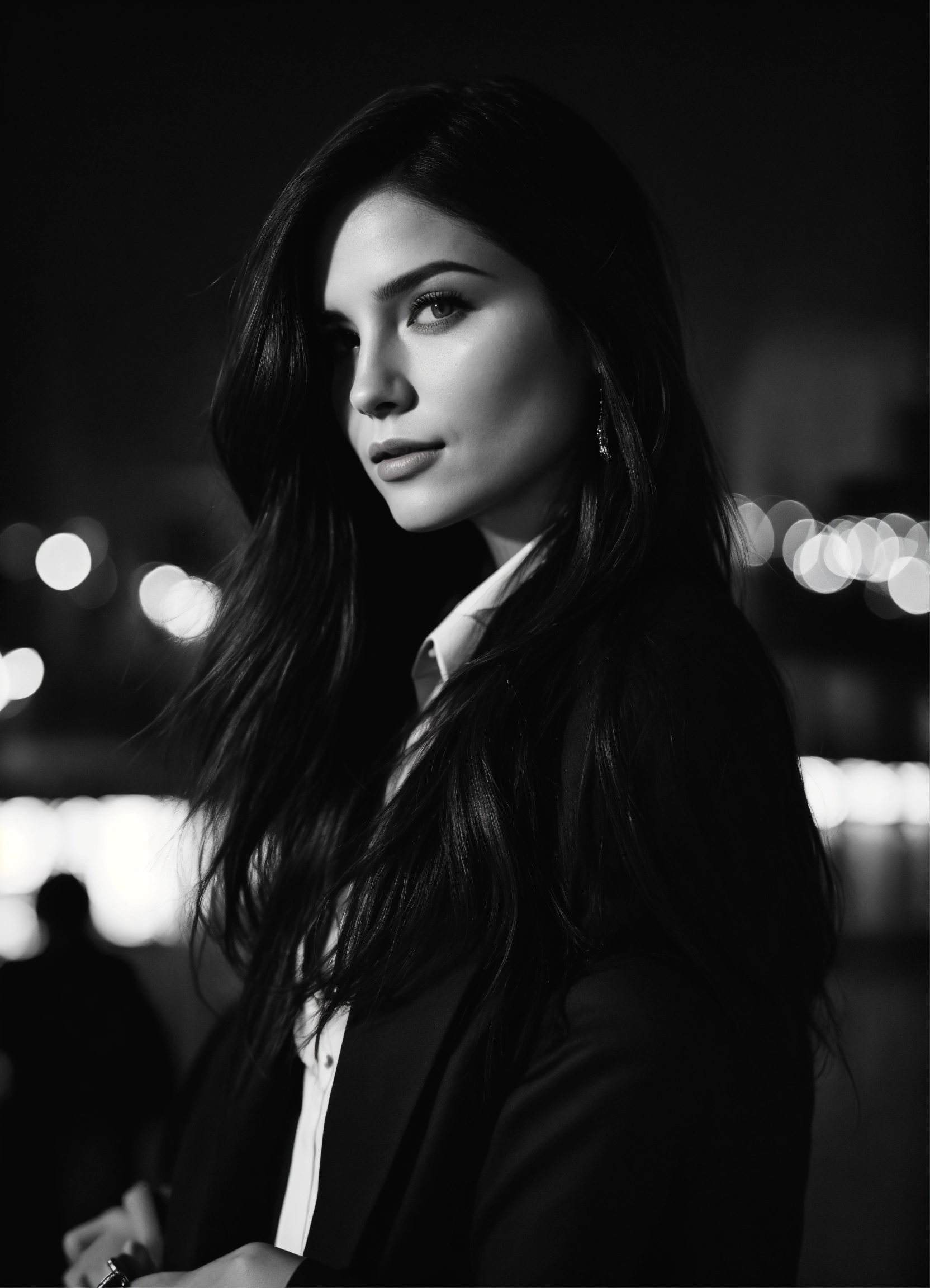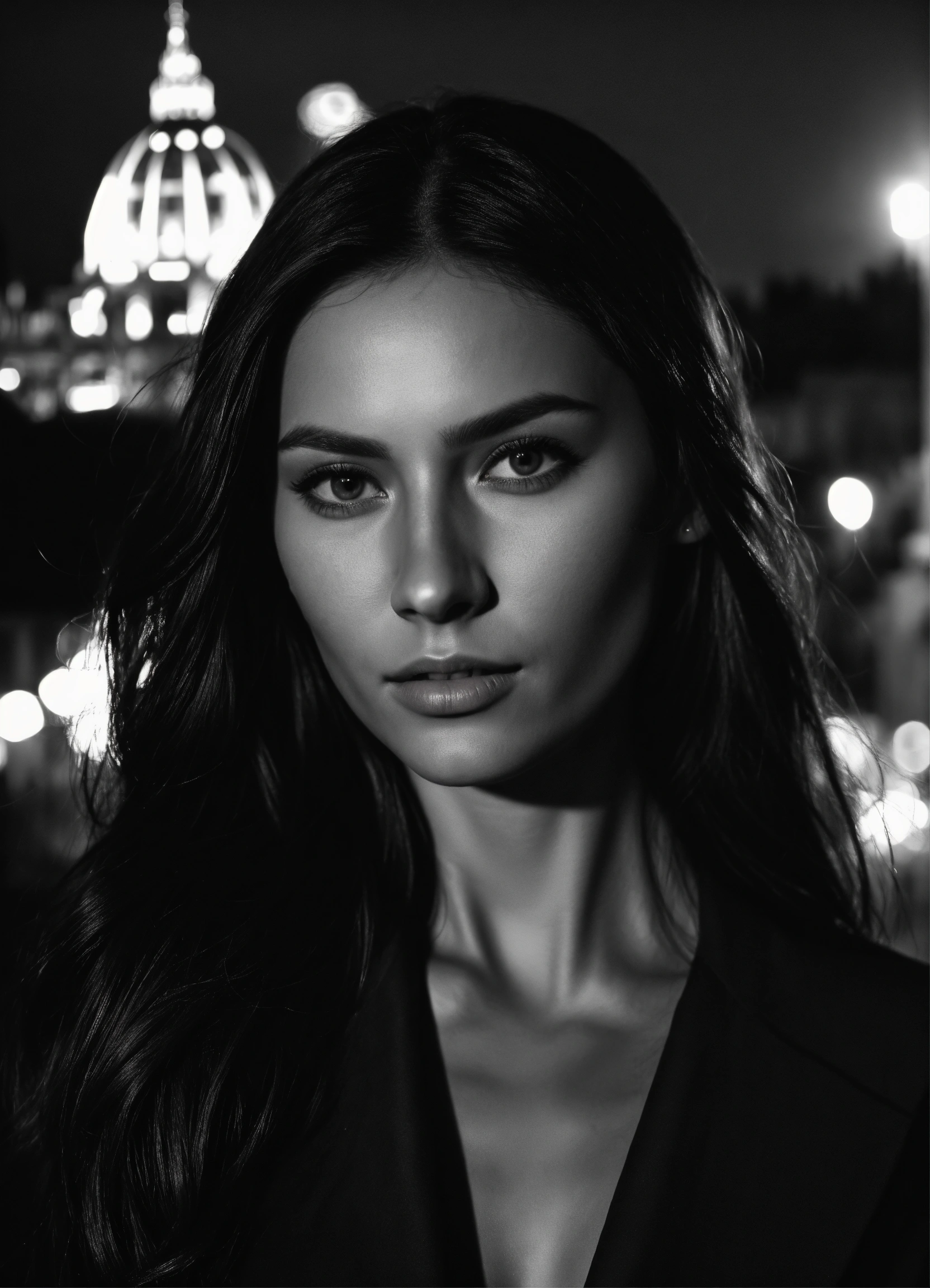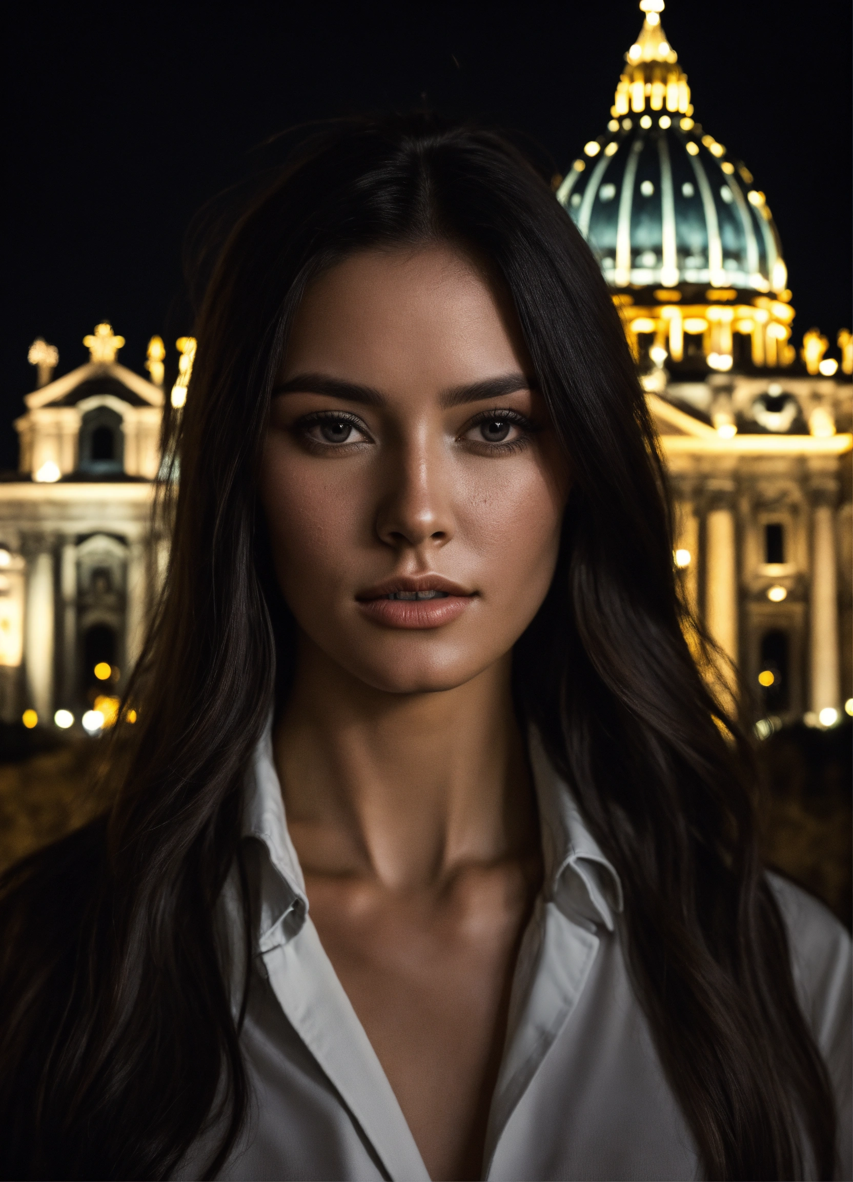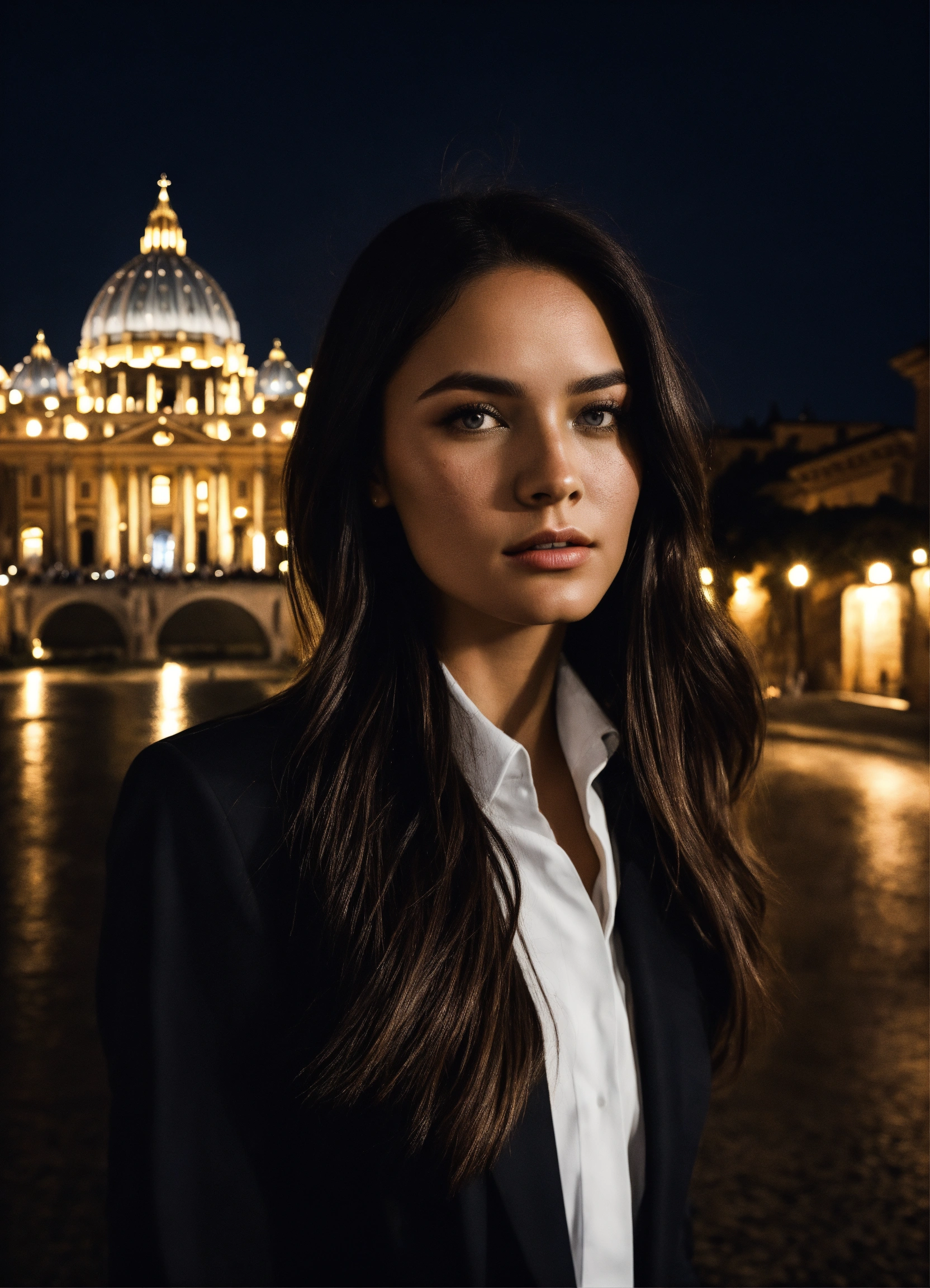 Photo of model women long dark hair, black and white, realistic, portrait, not painted, very detailed faces, skin with pores, 4k, dark suit, skin not smoothed, looking into the camera, dark shirt. vatican in rome in full view at night as background
