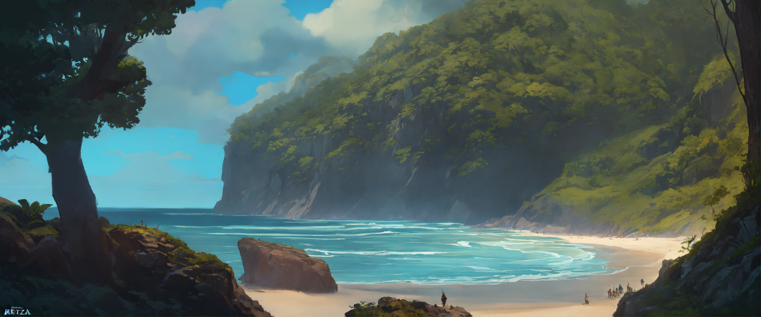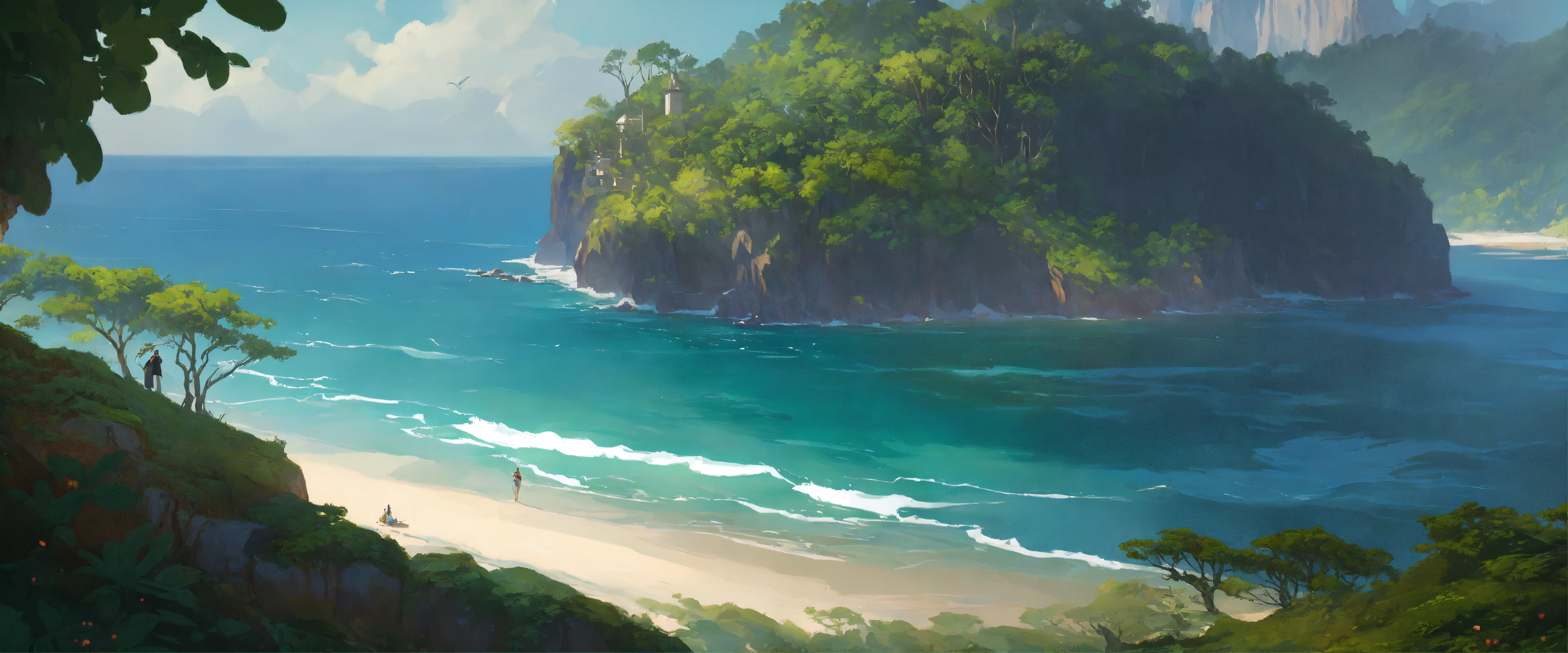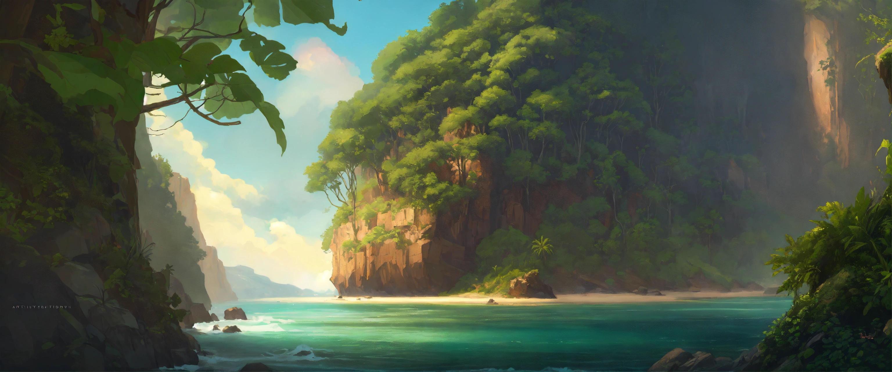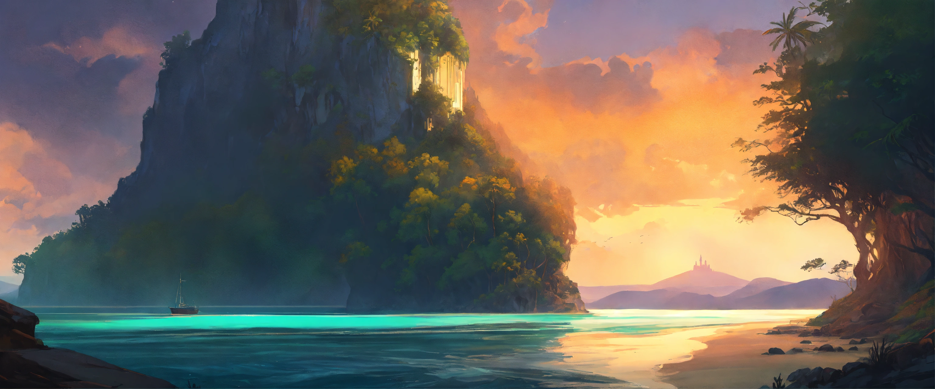 Forested island cliff with beach, caravel, dark atmosphere, highly detailed, digital painting, artstation, concept art, smooth, sharp focus, illustration, art by artgerm and greg rutkowski and alphonse mucha, erte, 8 k