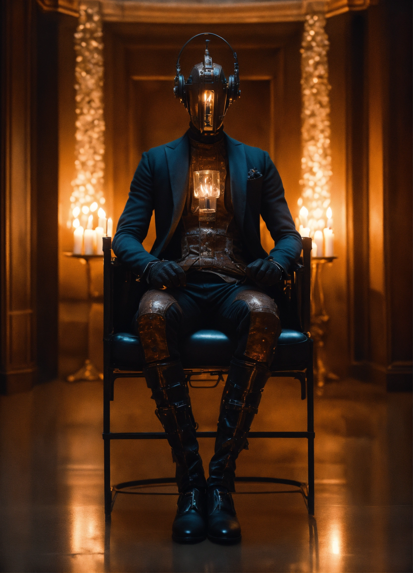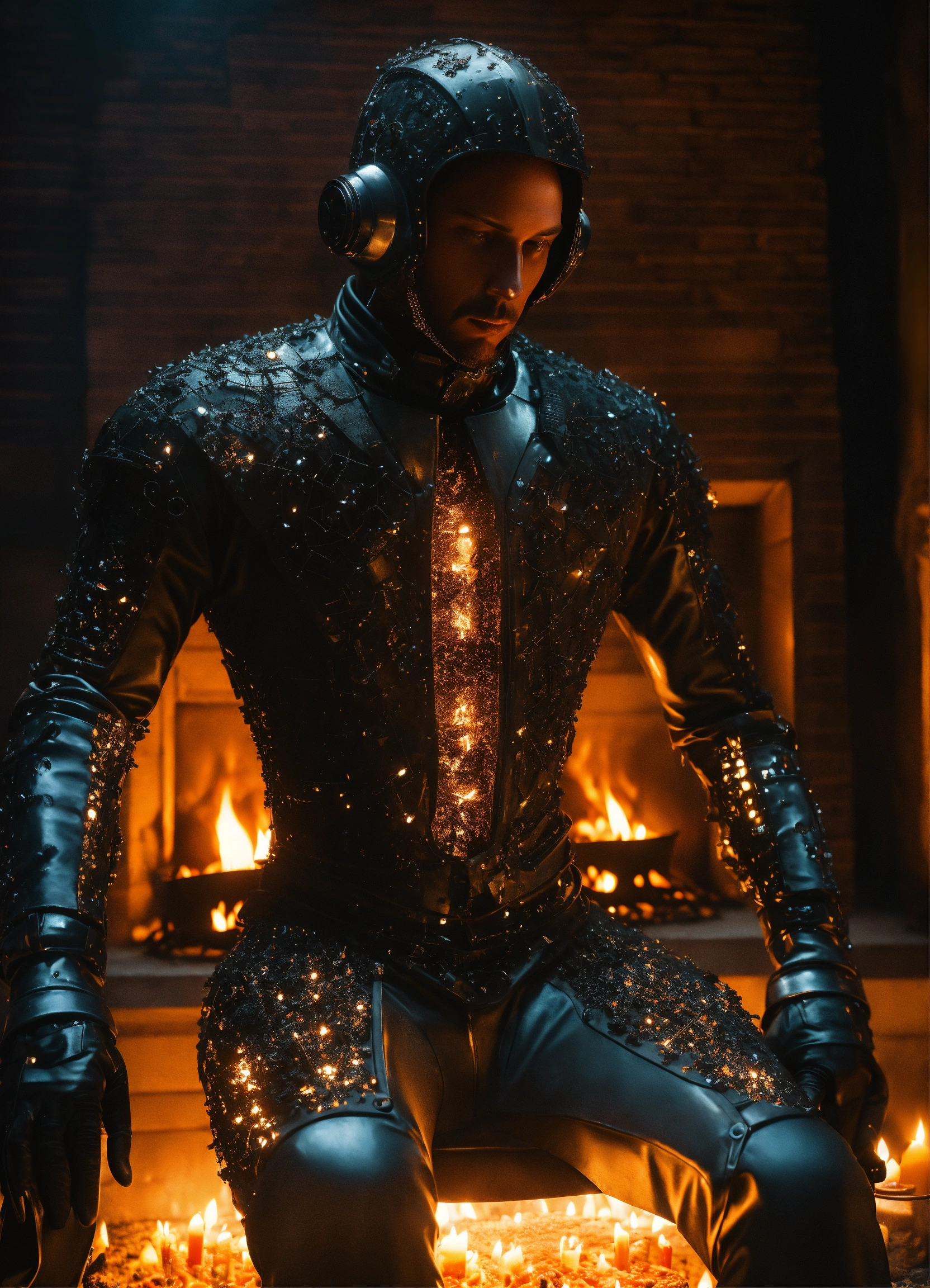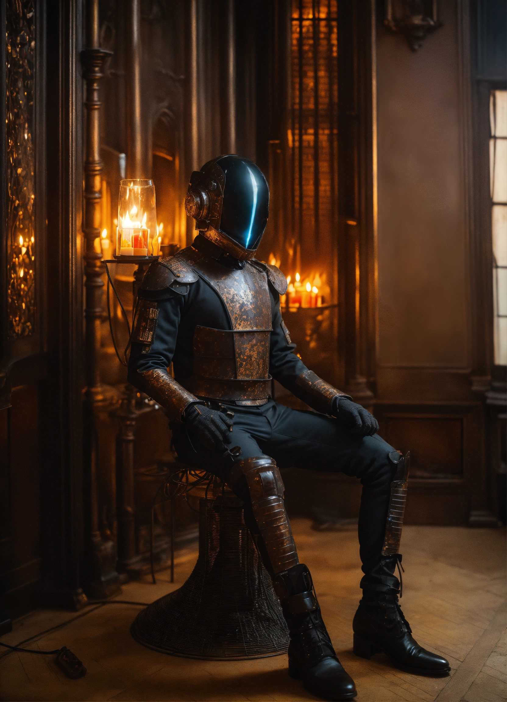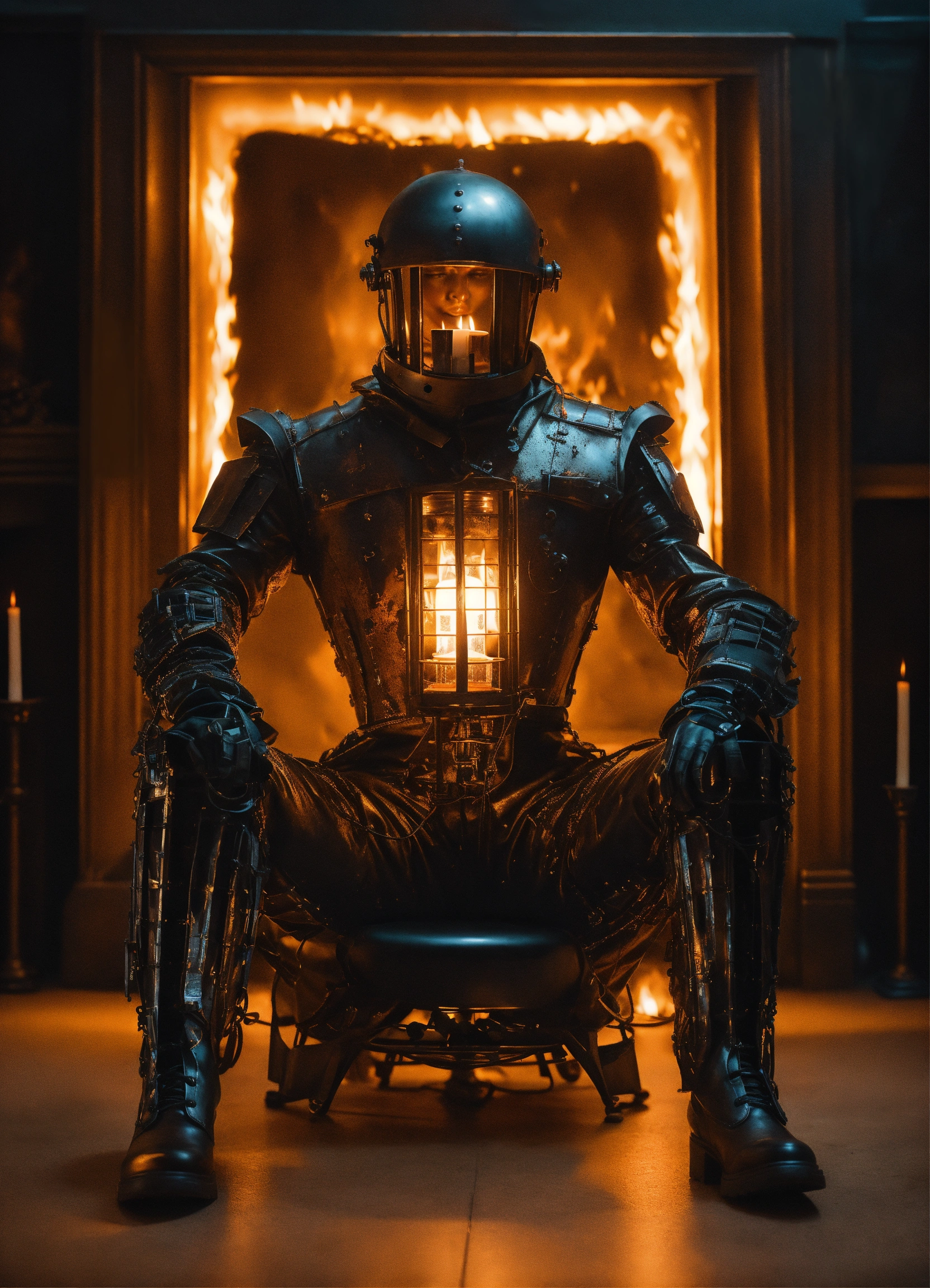 An ultrarrealistic photograph of a futuristic full body victorian style power suit, made of black mate rusted metal and polymer, full crystal hull, for a man, visible wires, sitting in a chir in a fireplace imposing, modern minimalism, elegant, dystopia, mysterious, godlike, scary, in a victorian era large room whit candle lights, 8k