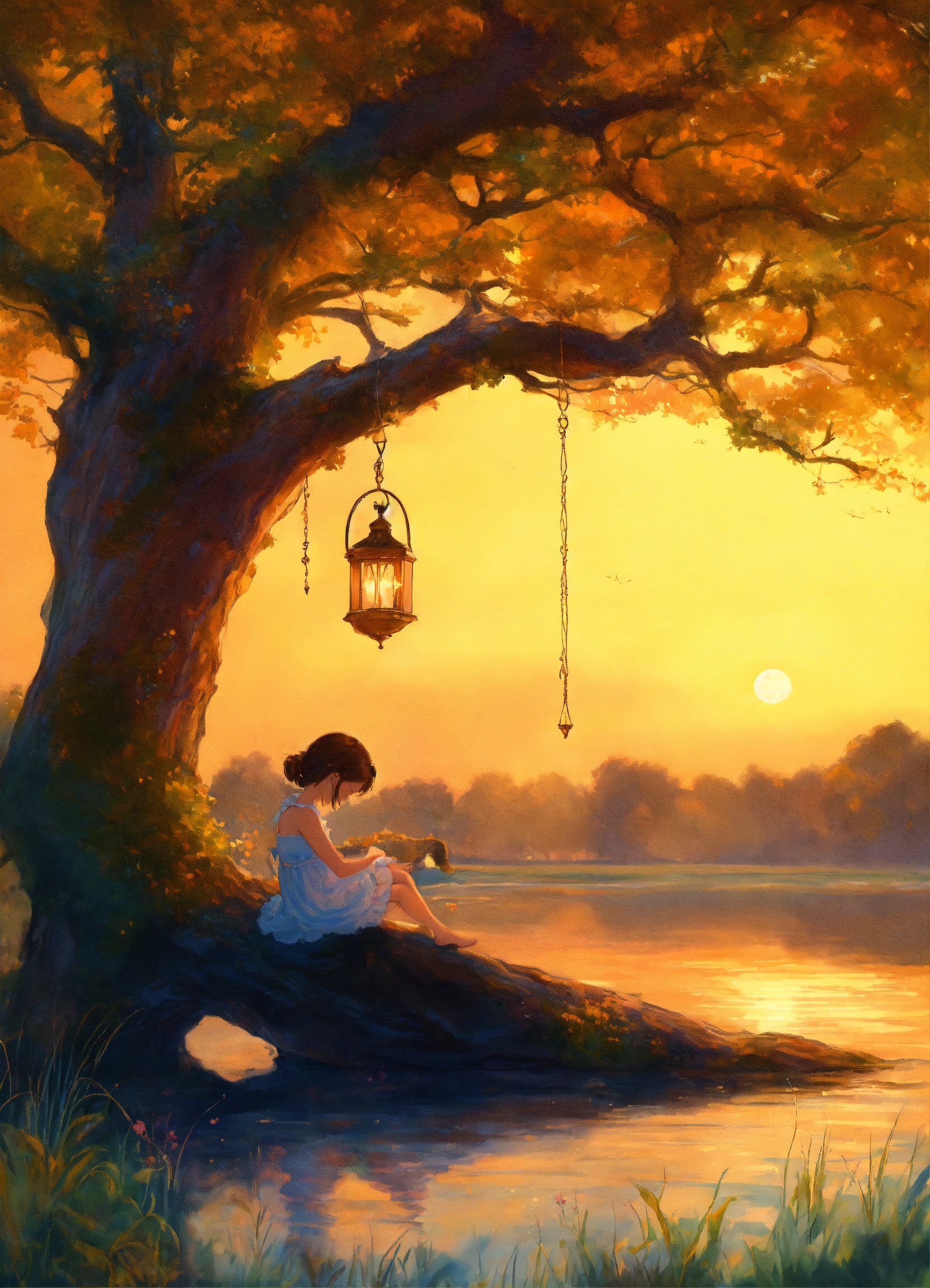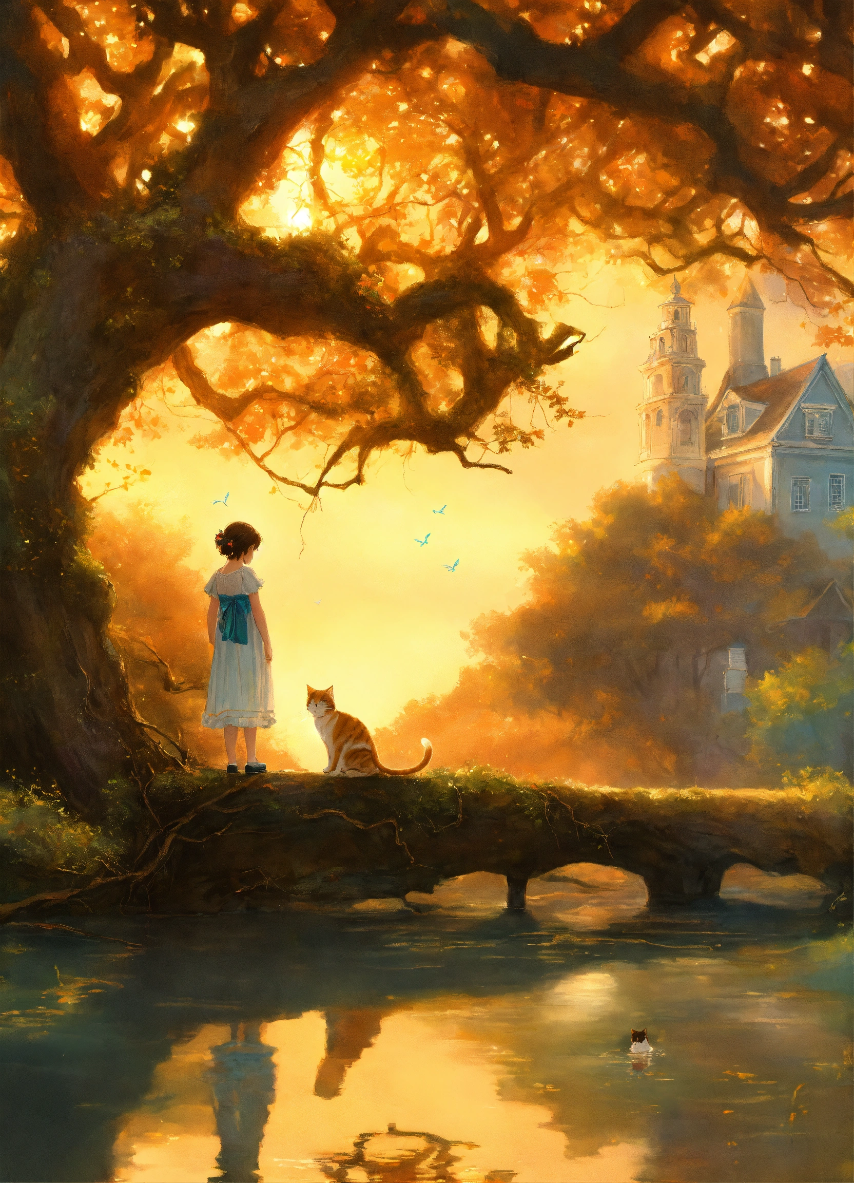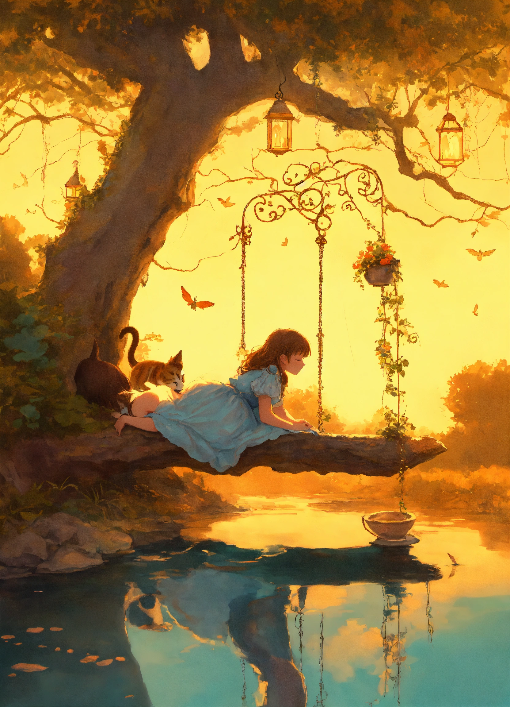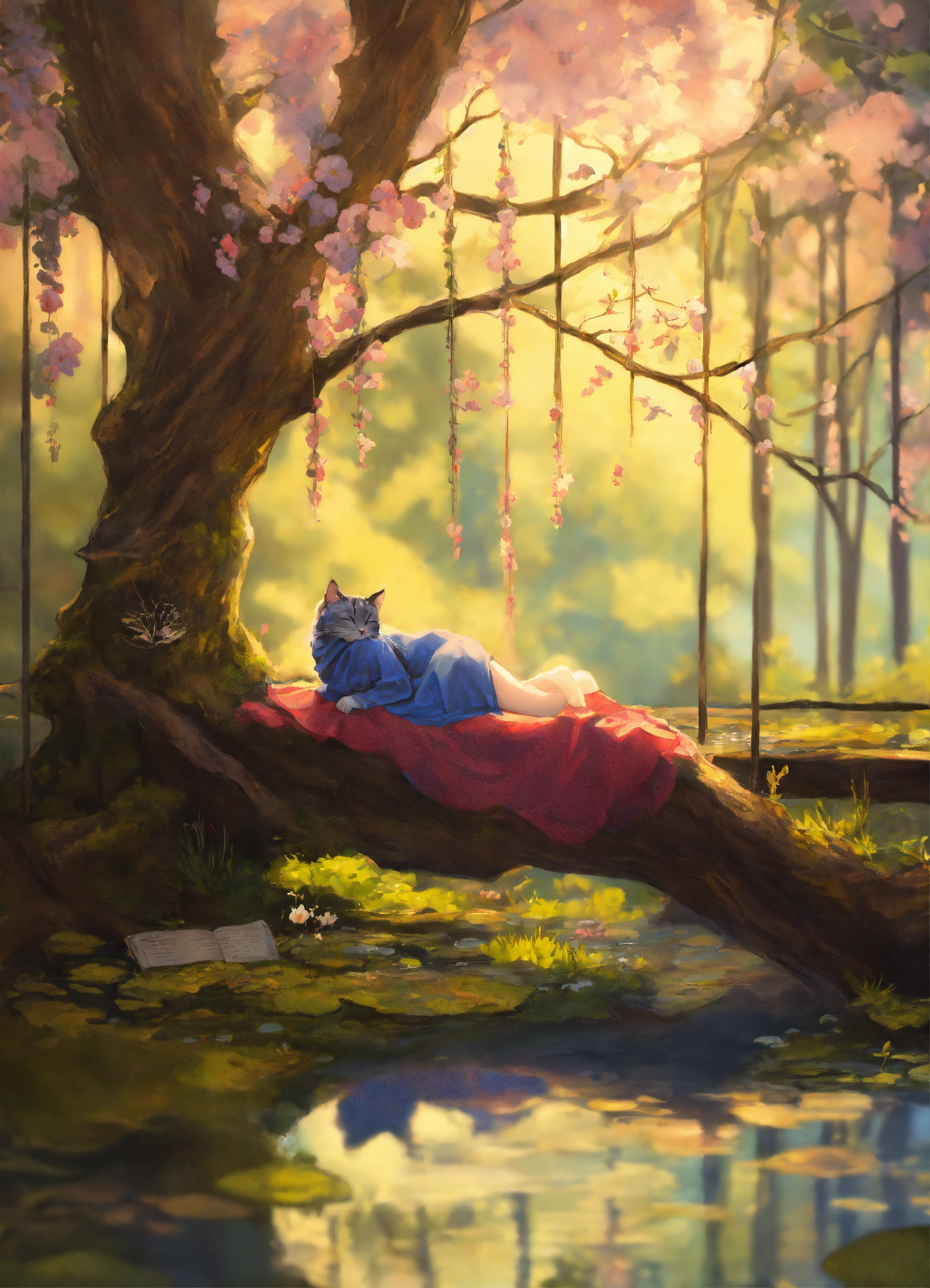Devant un petit plan d'eau, sur une grosse branche d'un chêne ange de charleston, une petite fille dort paisiblement avec son chat allongé sur son ventre. art fantaisie