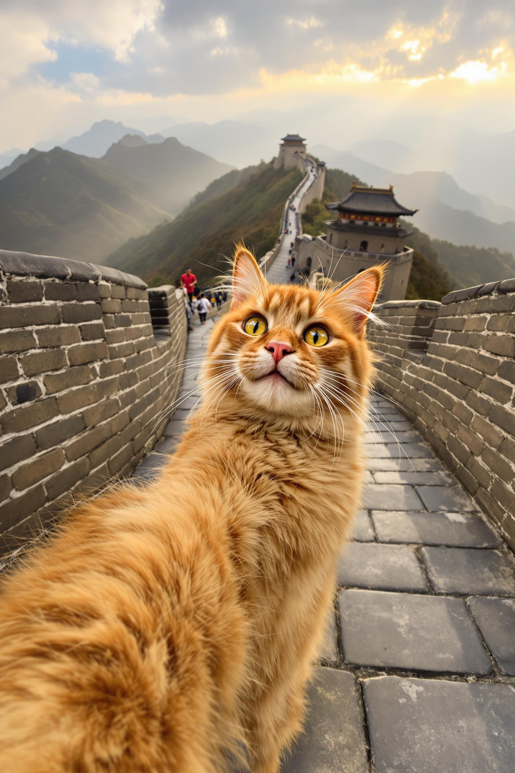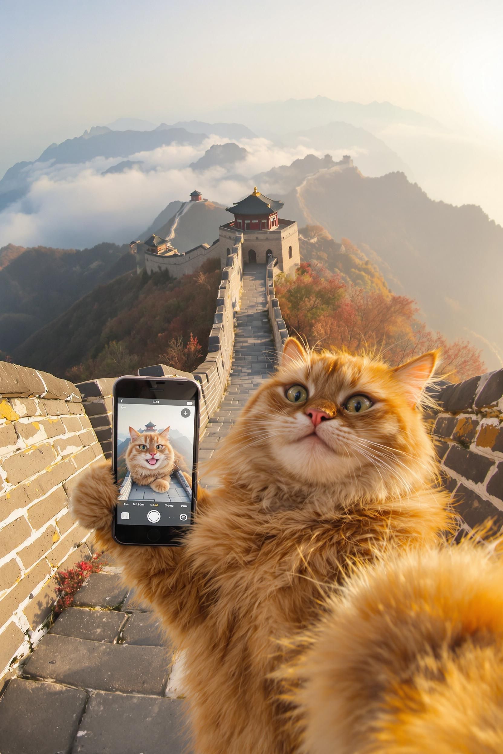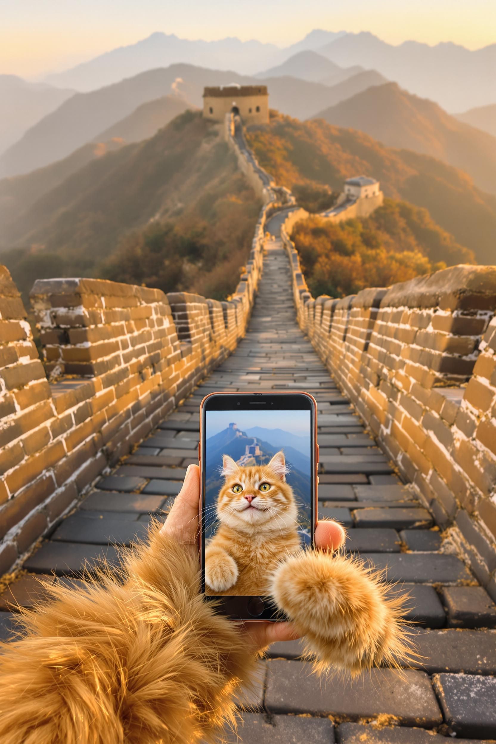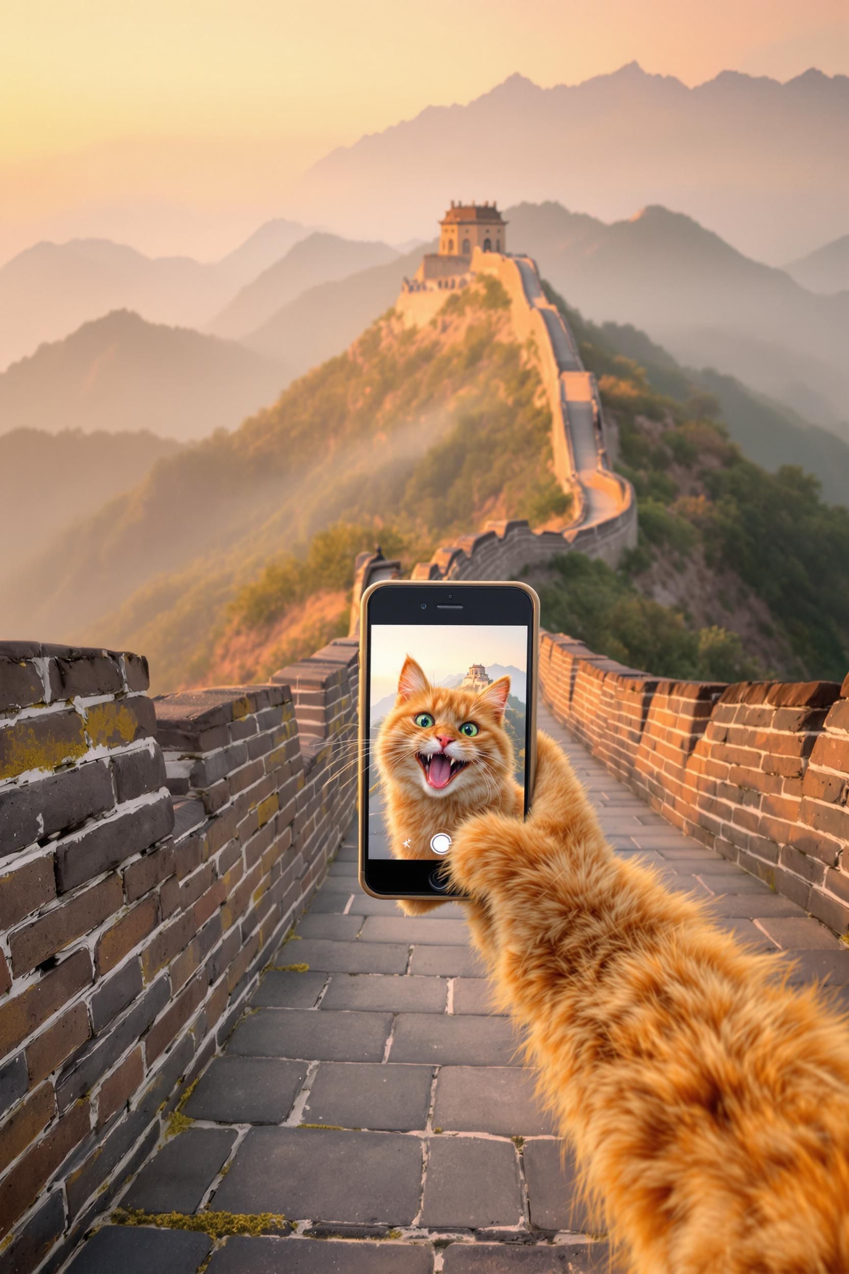 First-person pov of a fluffy ginger cat taking a selfie on the great wall, holding a smartphone with its paw, ancient stone bricks and watchtowers in background, morning mist over mountains, cat grinning at camera, warm sunlight, ultra-detailed fur texture, shallow depth of field, shot on canon eos r5a=