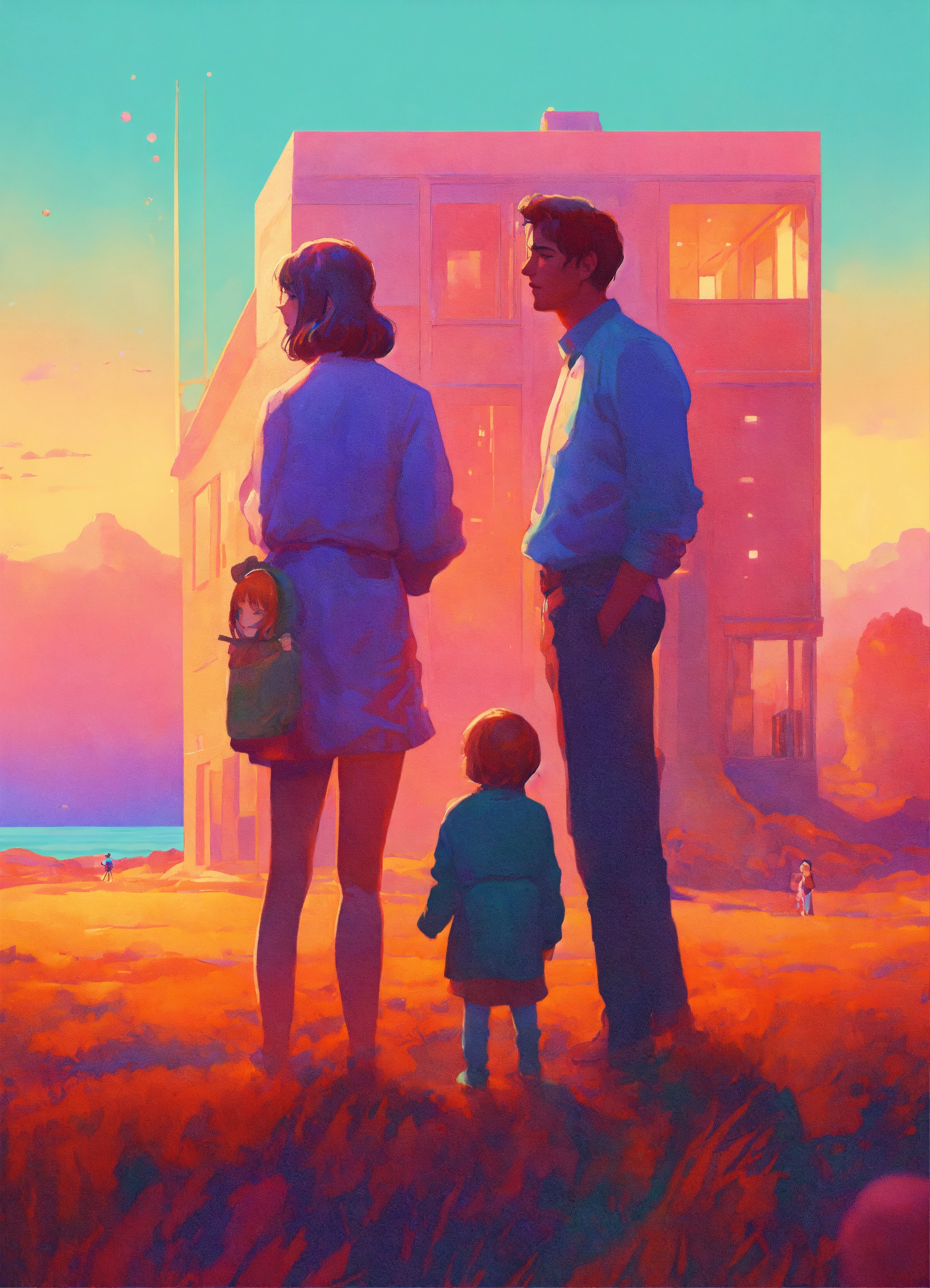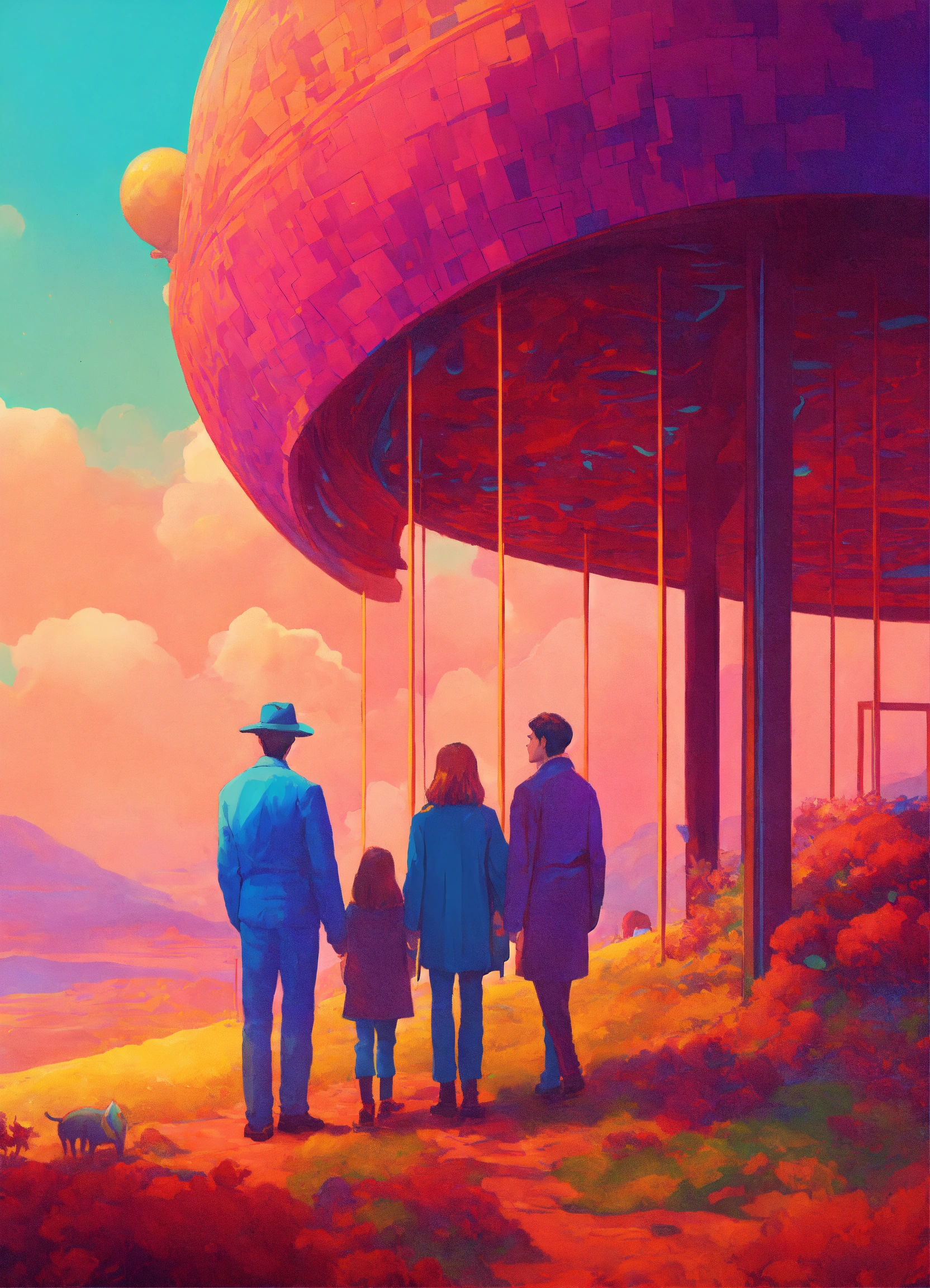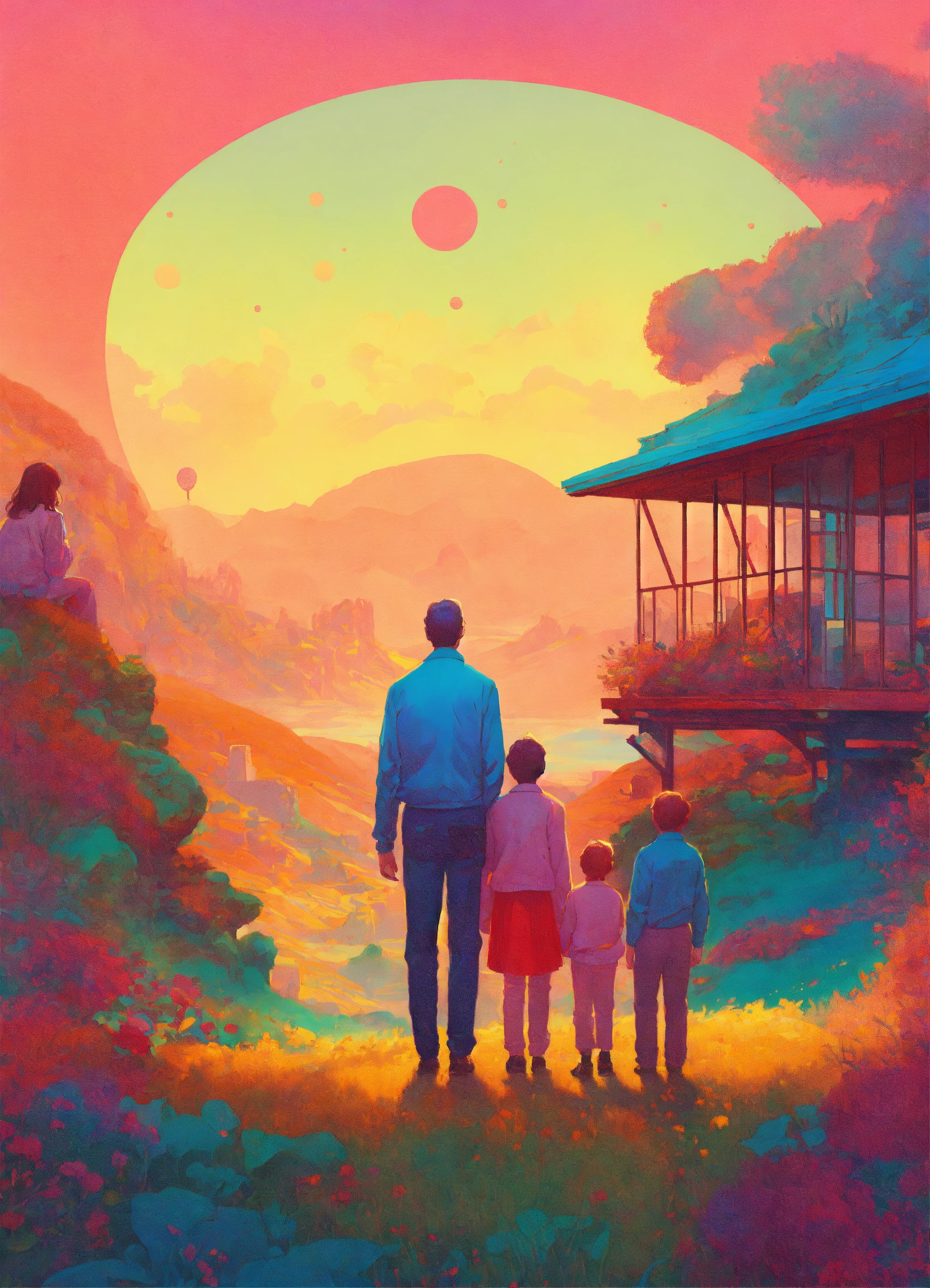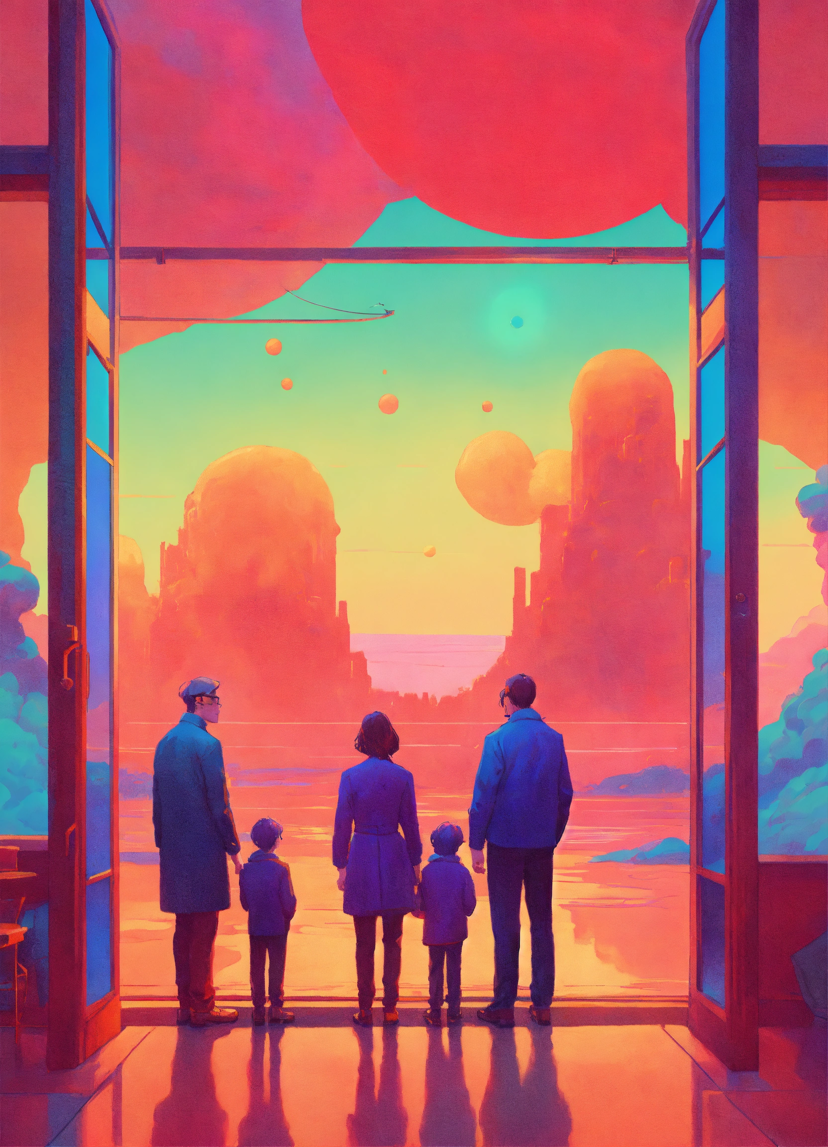 A colorful vibrant portrait of a family holding each other in a dreaming psychedelic hallucinations, moebius, edward hopper and james gilleard, zdzislaw beksinski, steven outram colorful flat surreal design, hd, 8 k, artstation