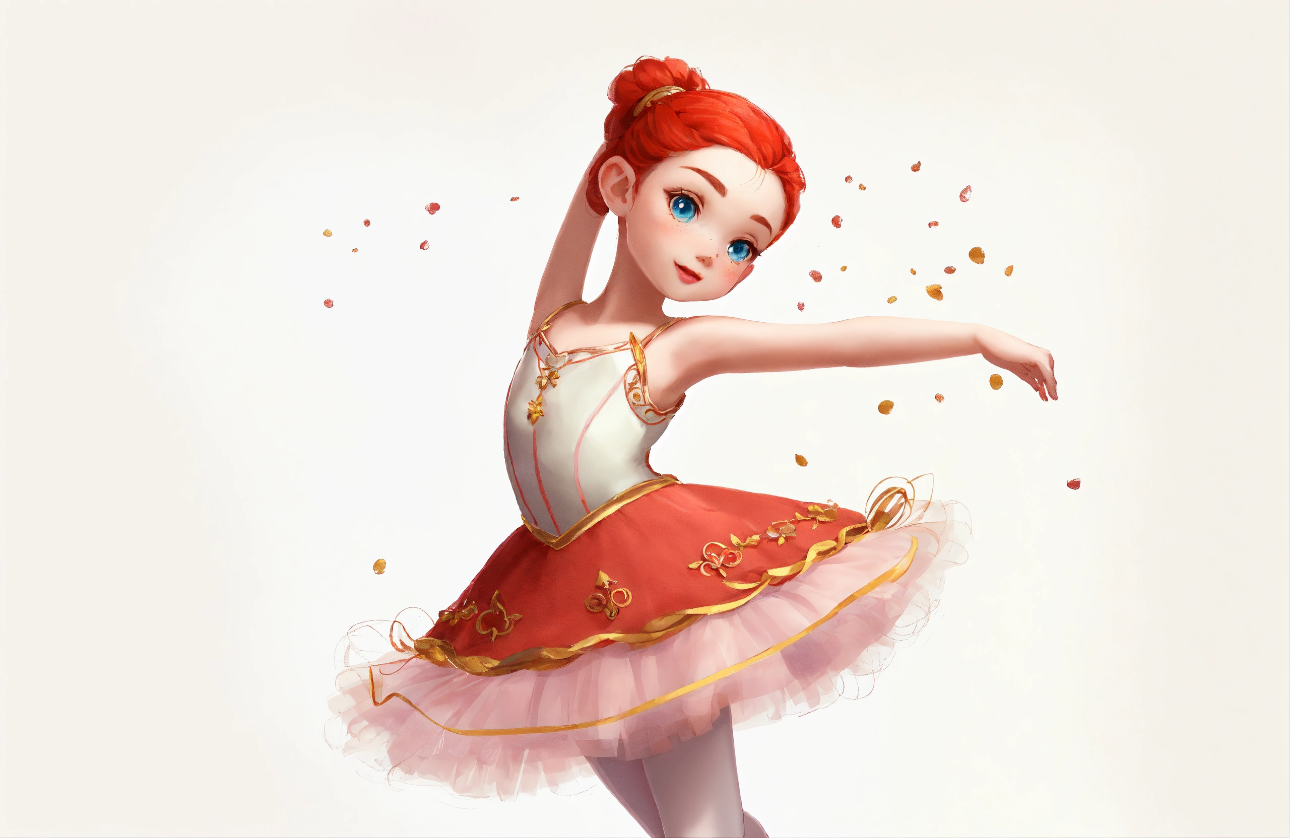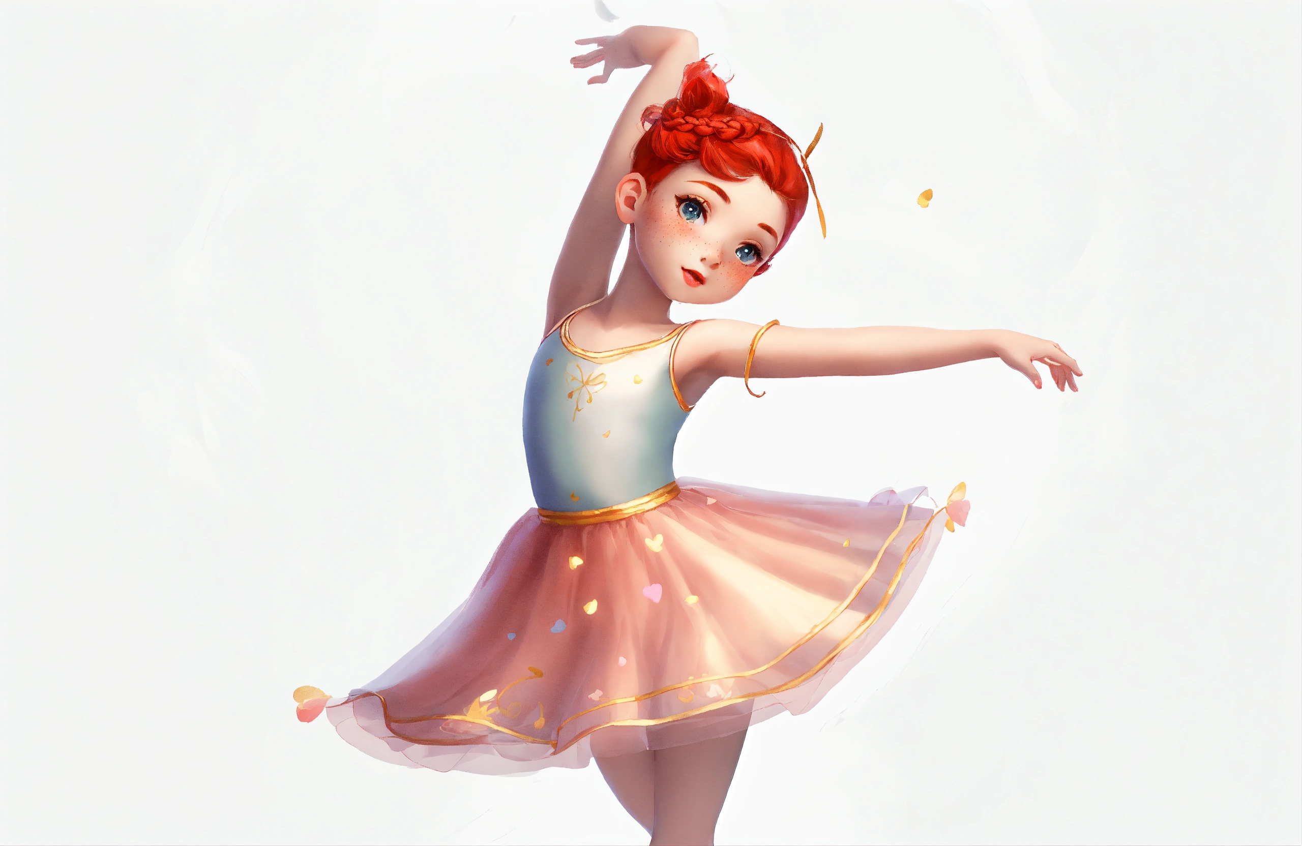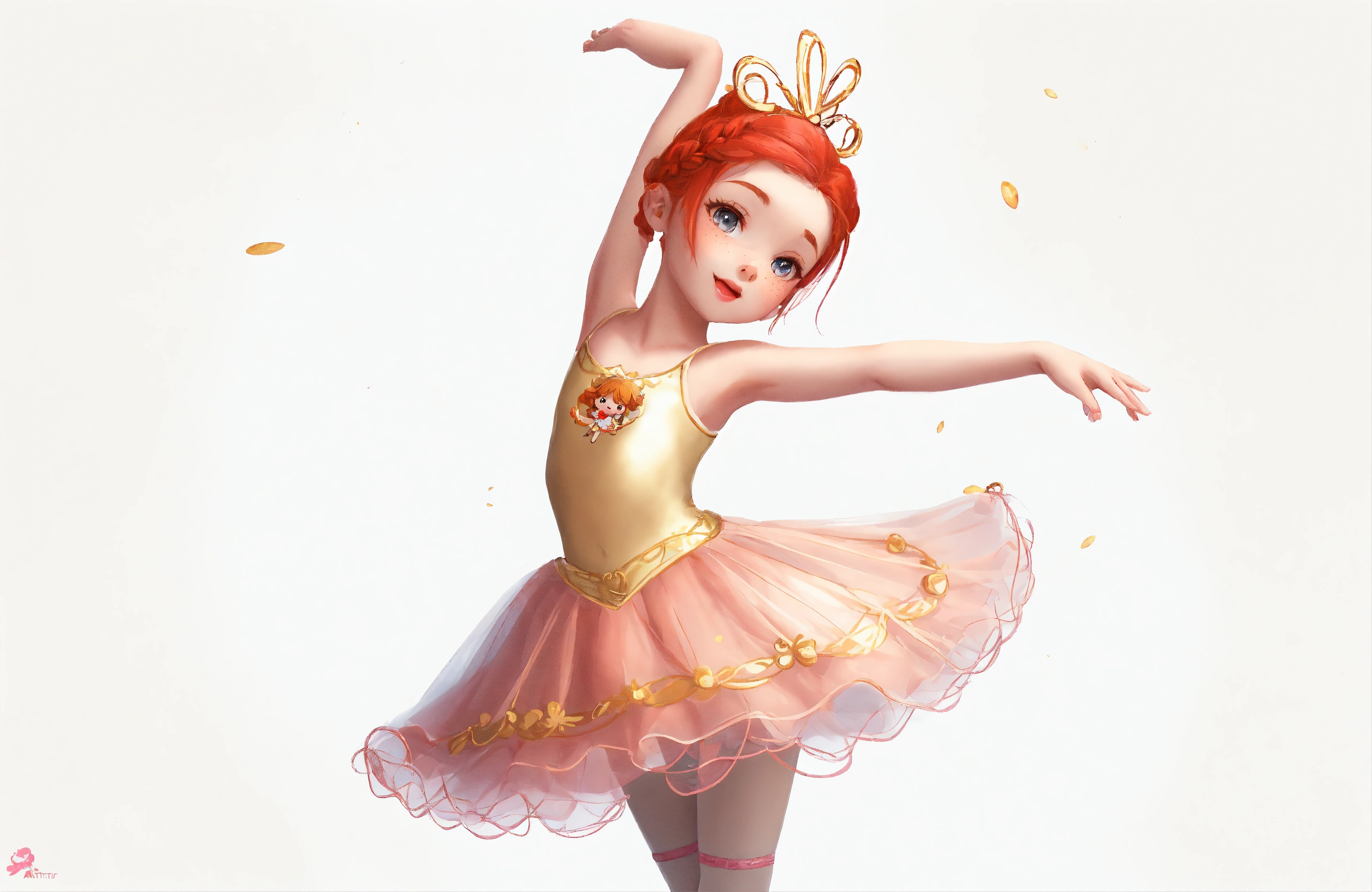 Cute and adorable game character cartoon it baby ballerina red hair with braids, pale skin, freckled, she is dressed in a ballet tutu with gold trim, sandals shoes, fantasy style, pixar style, dreamlike, surrealism, super cute, trending on artstation.