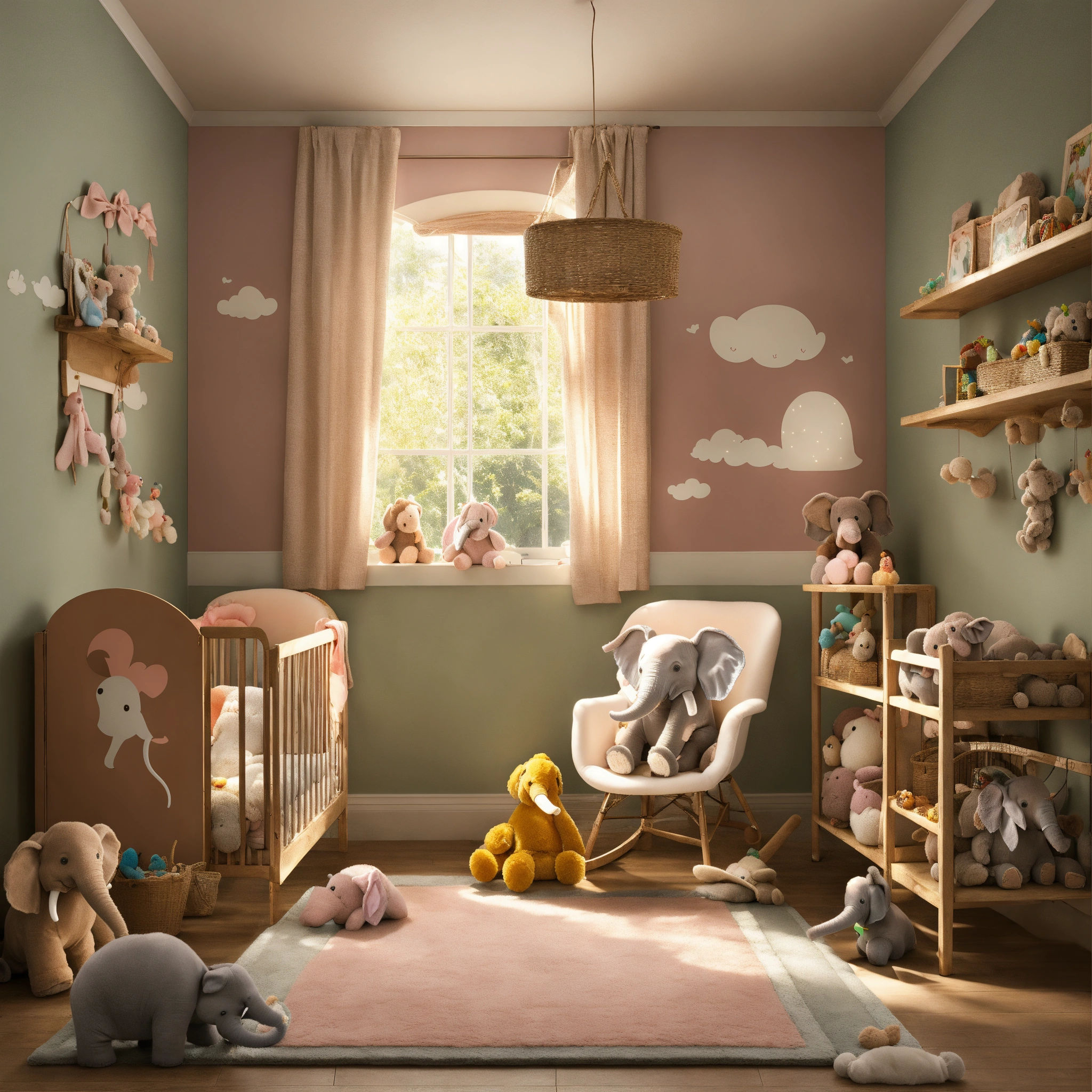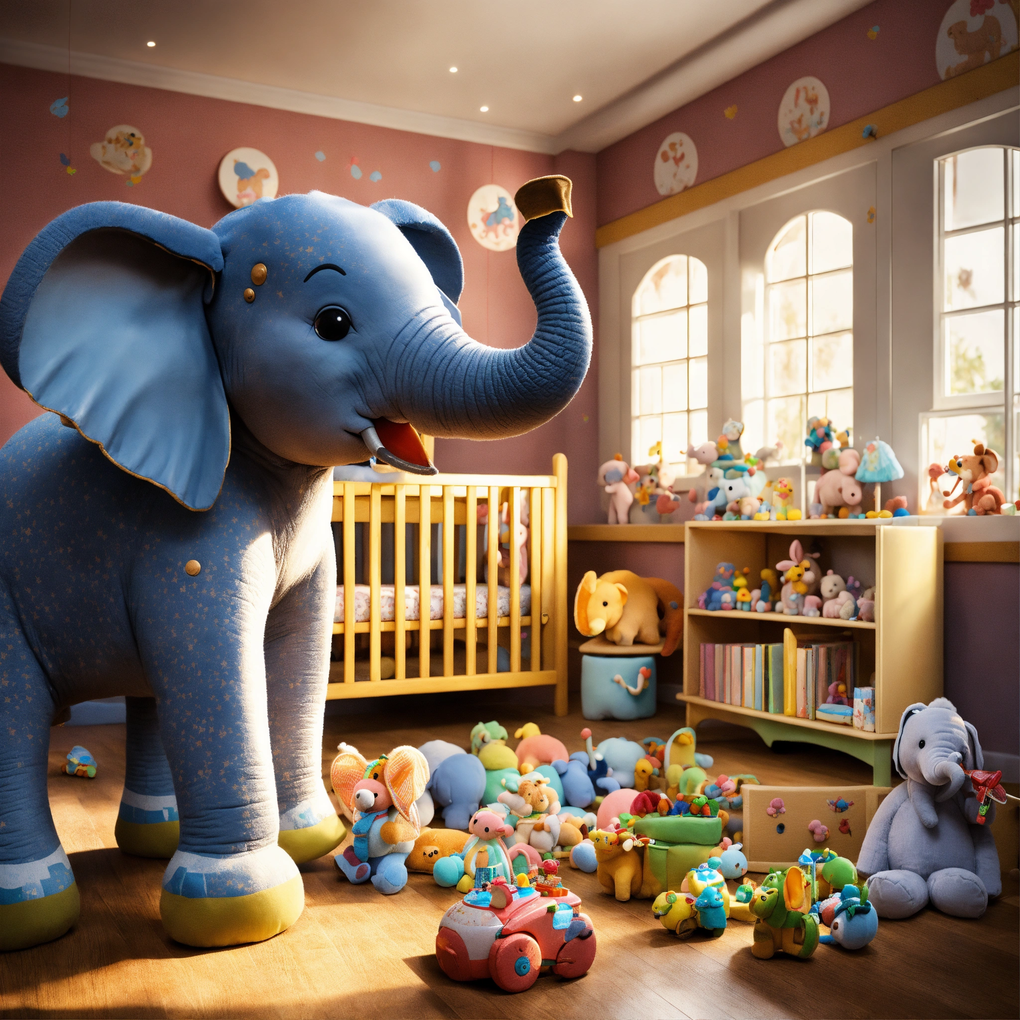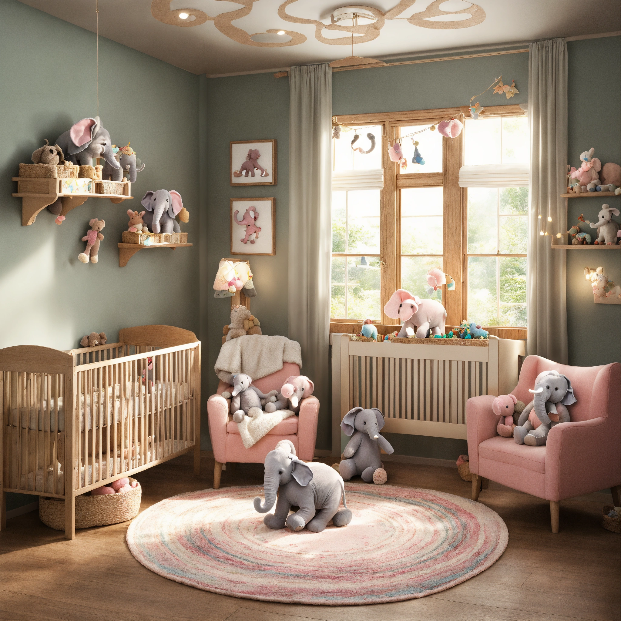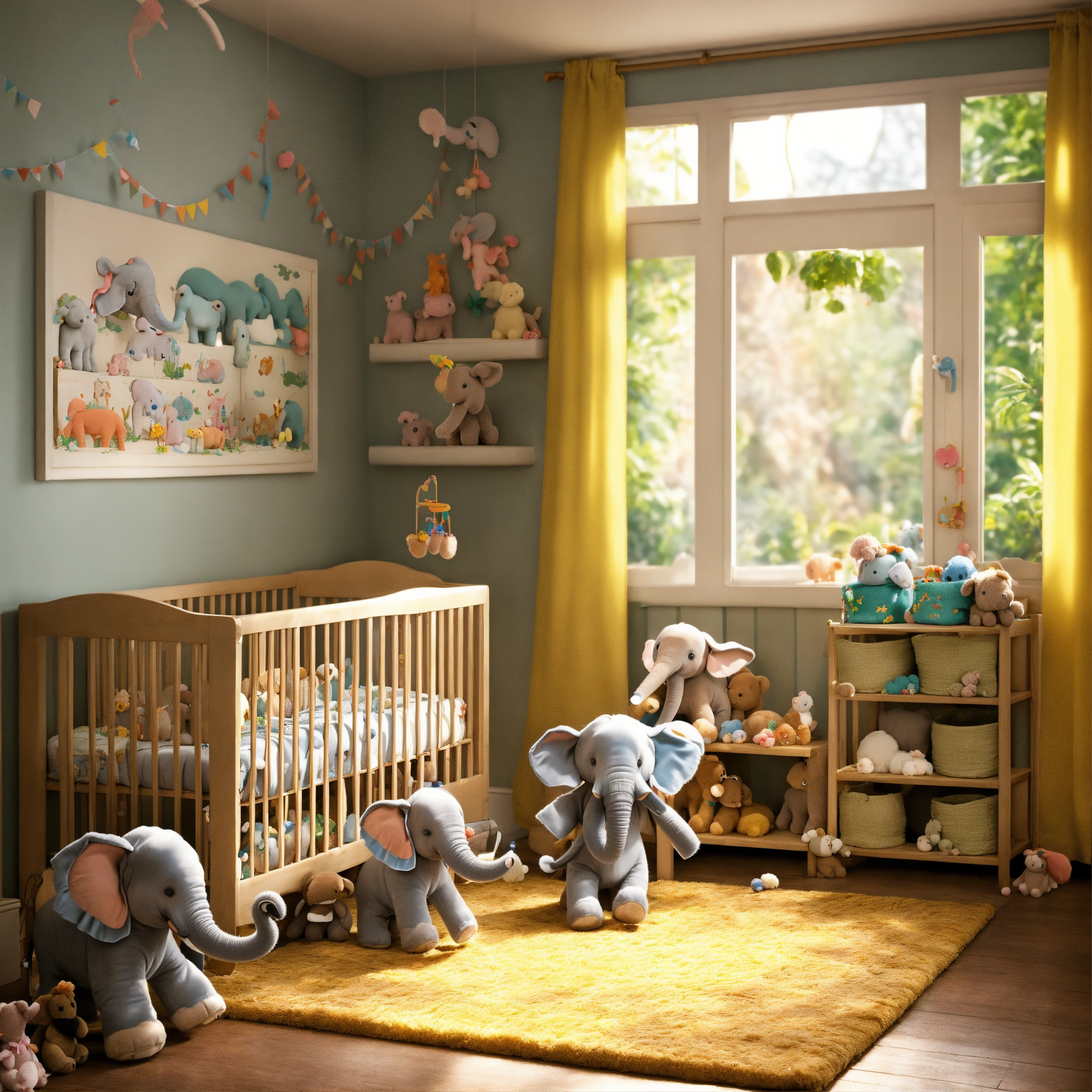 Please create a realistic image of a nursery filled with elephant toys