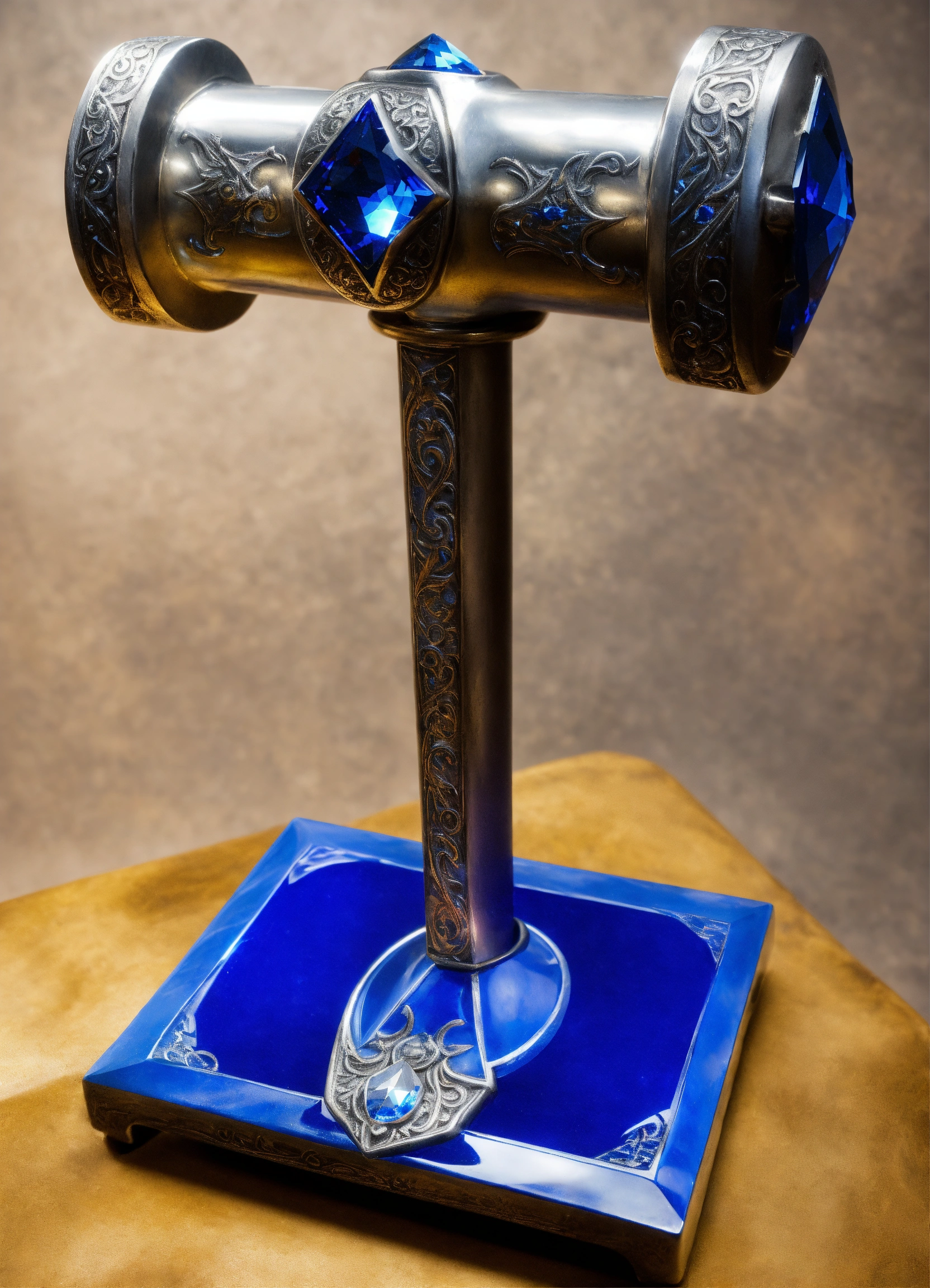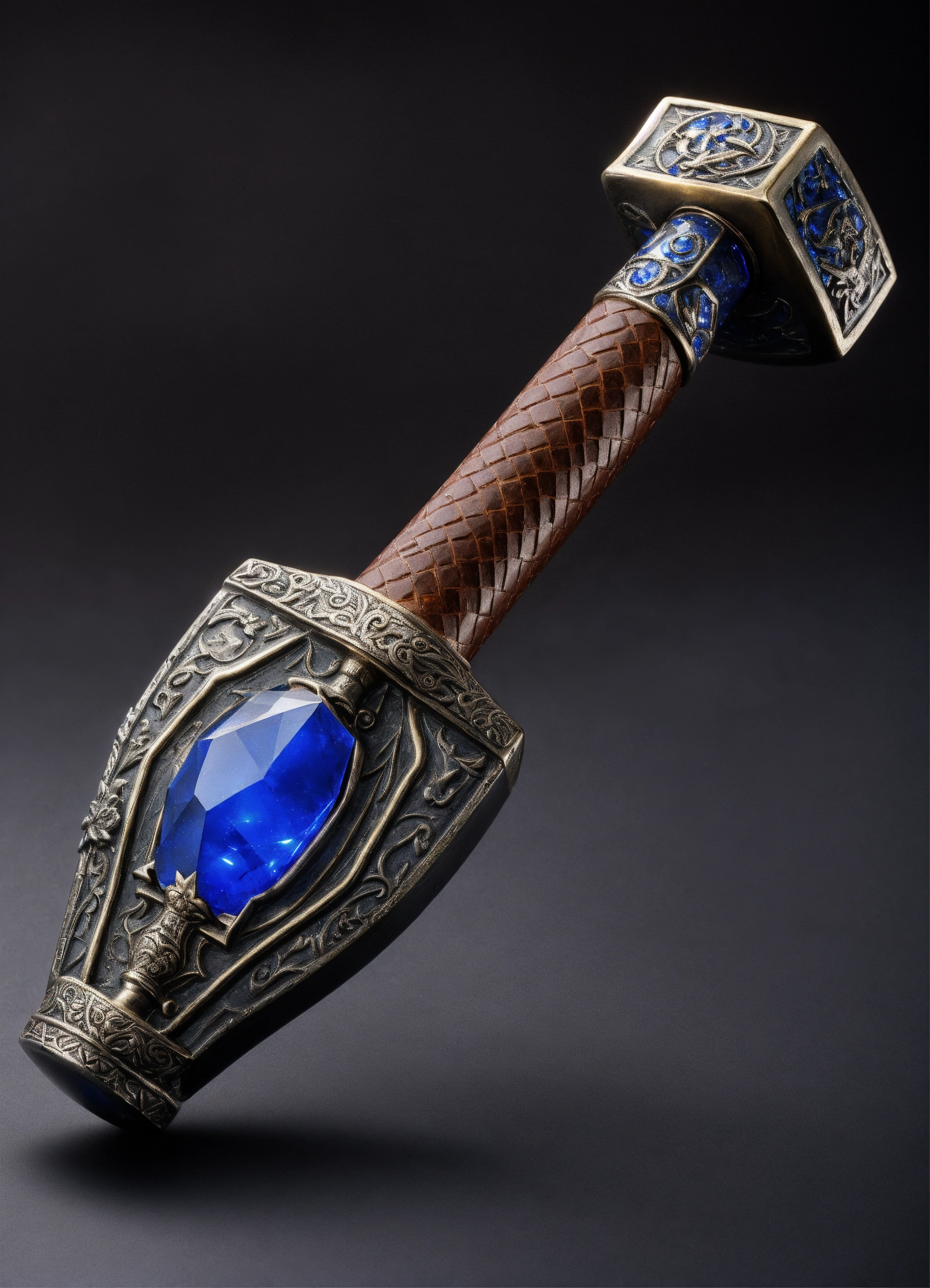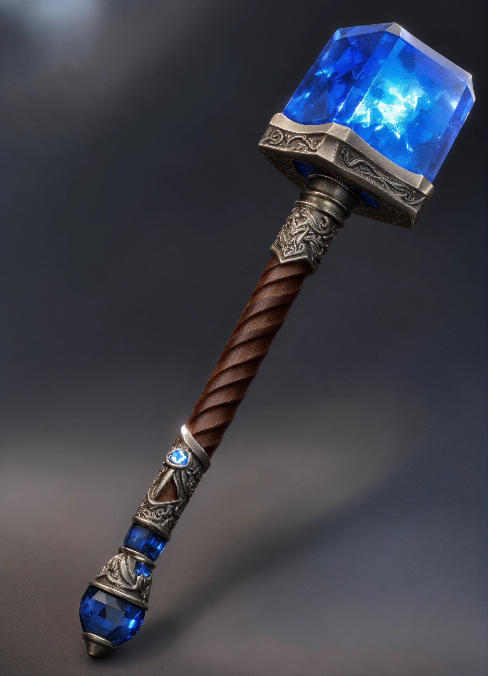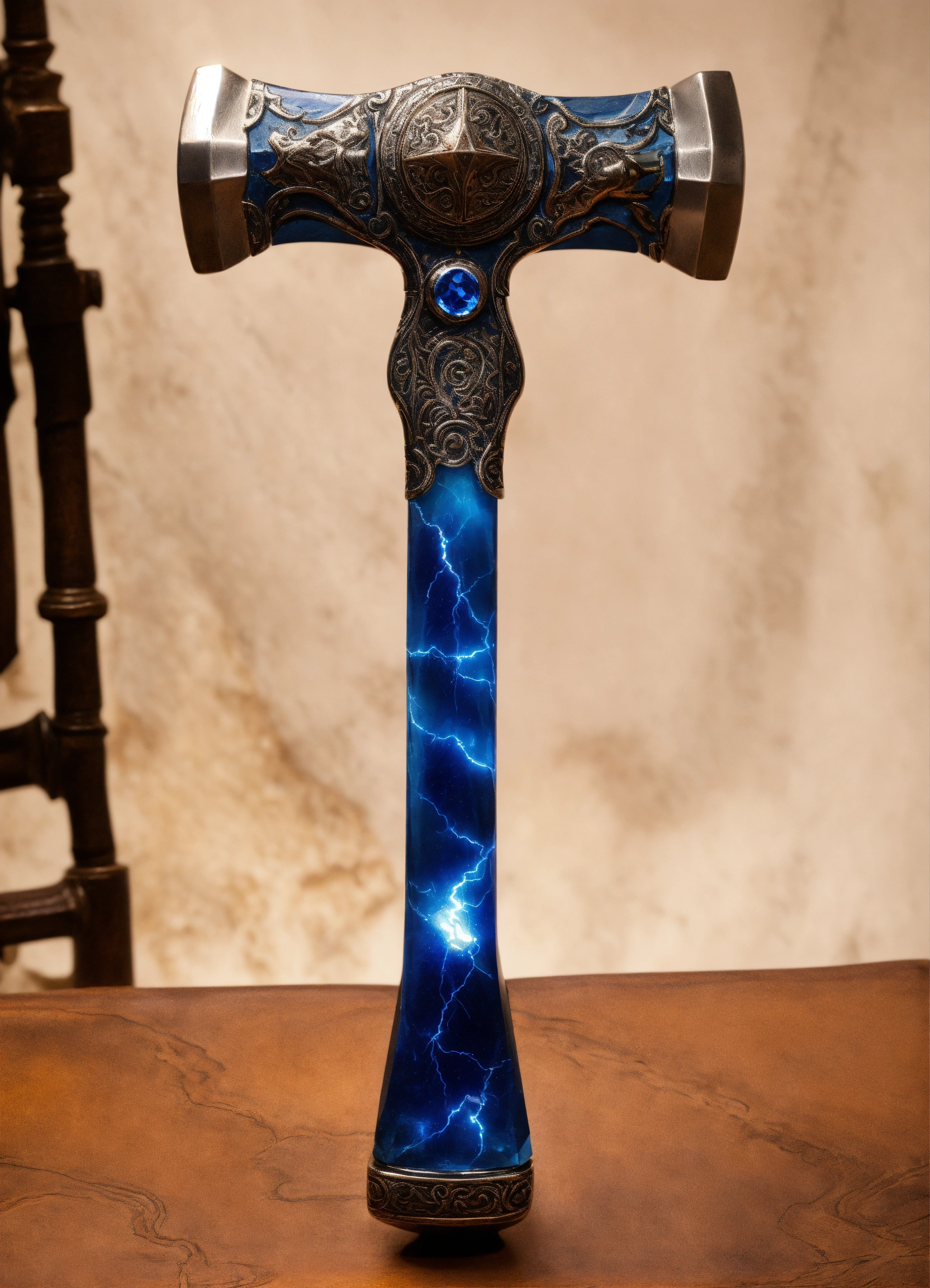 Great hammer. lightning. weapon. d&d. hammer head is rectangular in shape and large, anvil-sized, with sapphire-silver material that is carved with lightning and thunder theme. extra-long handle is 10 feet wrapped with blue leather allows for a comfortable grip. the handle ends with a luminous sapphire gem. pommel. realistic. plain backdrop.