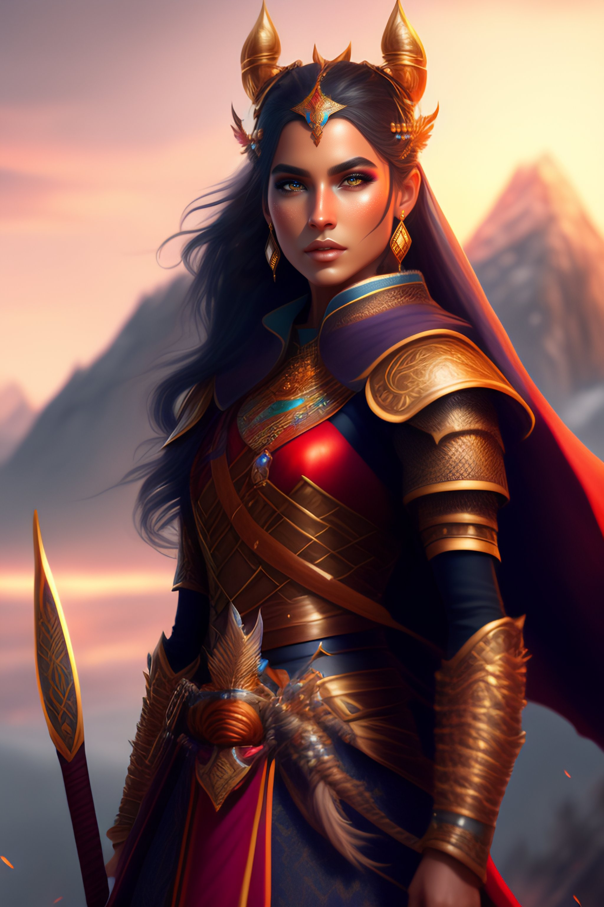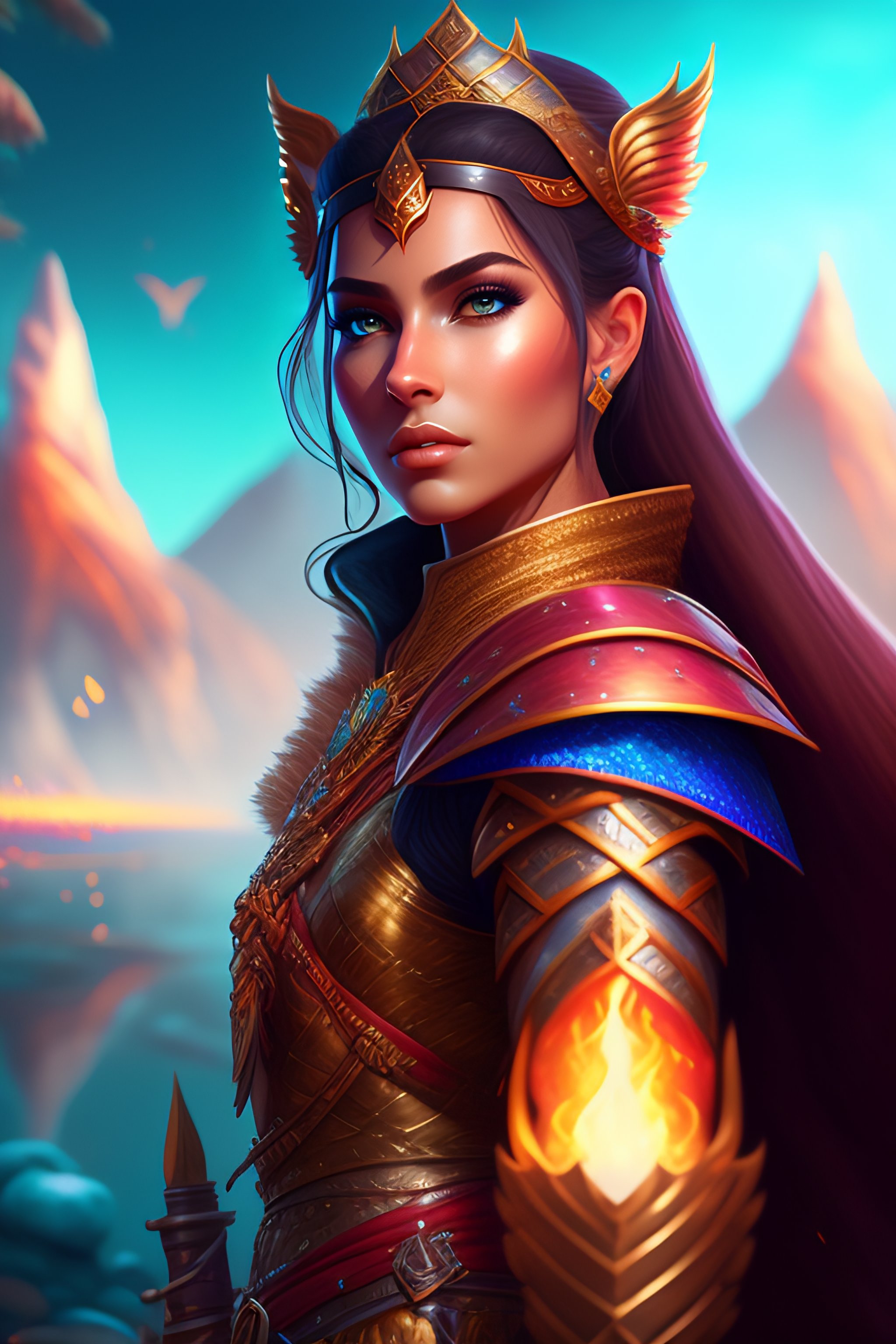 Full portrait of a beautiful 4 years old princess worrier, solo character!, realistic, an alluring dragon hunter, chestnut dark hair, long eyelashes, small egyptian eyes, swords, battle pose, a background composed of mountains and fire and snow and flying small creatures behind!!!, epic, intricate, elegant, decent, divine, heightened details, intense emotion, poised, centered, concept art, smooth, illustration, organed, 8k, sharp focus, digital painting, artstation, d & d, fantasy art, leather tunic, extremely hyperdetailed, cinematic lighting + masterpiece, vibrant colors