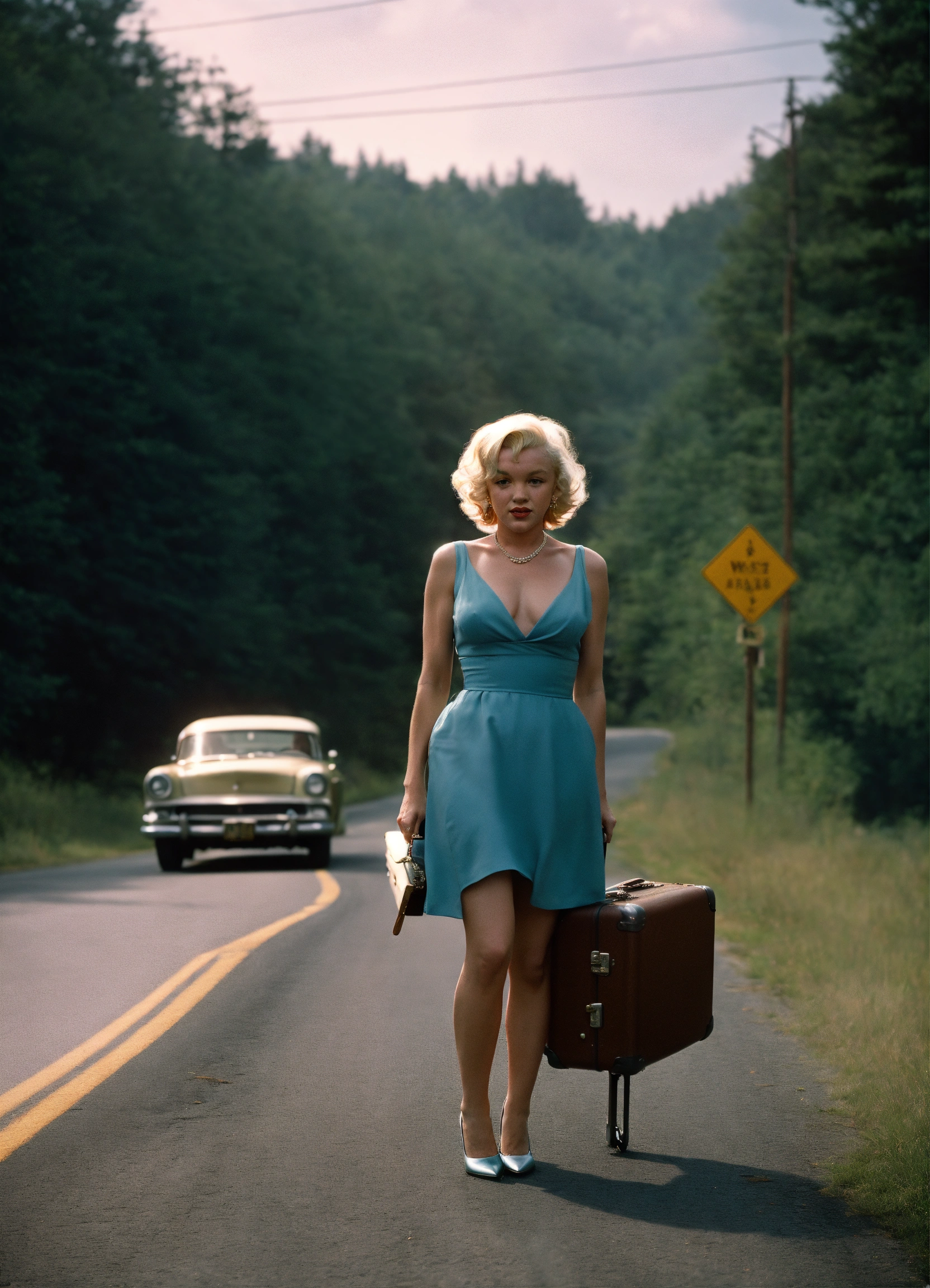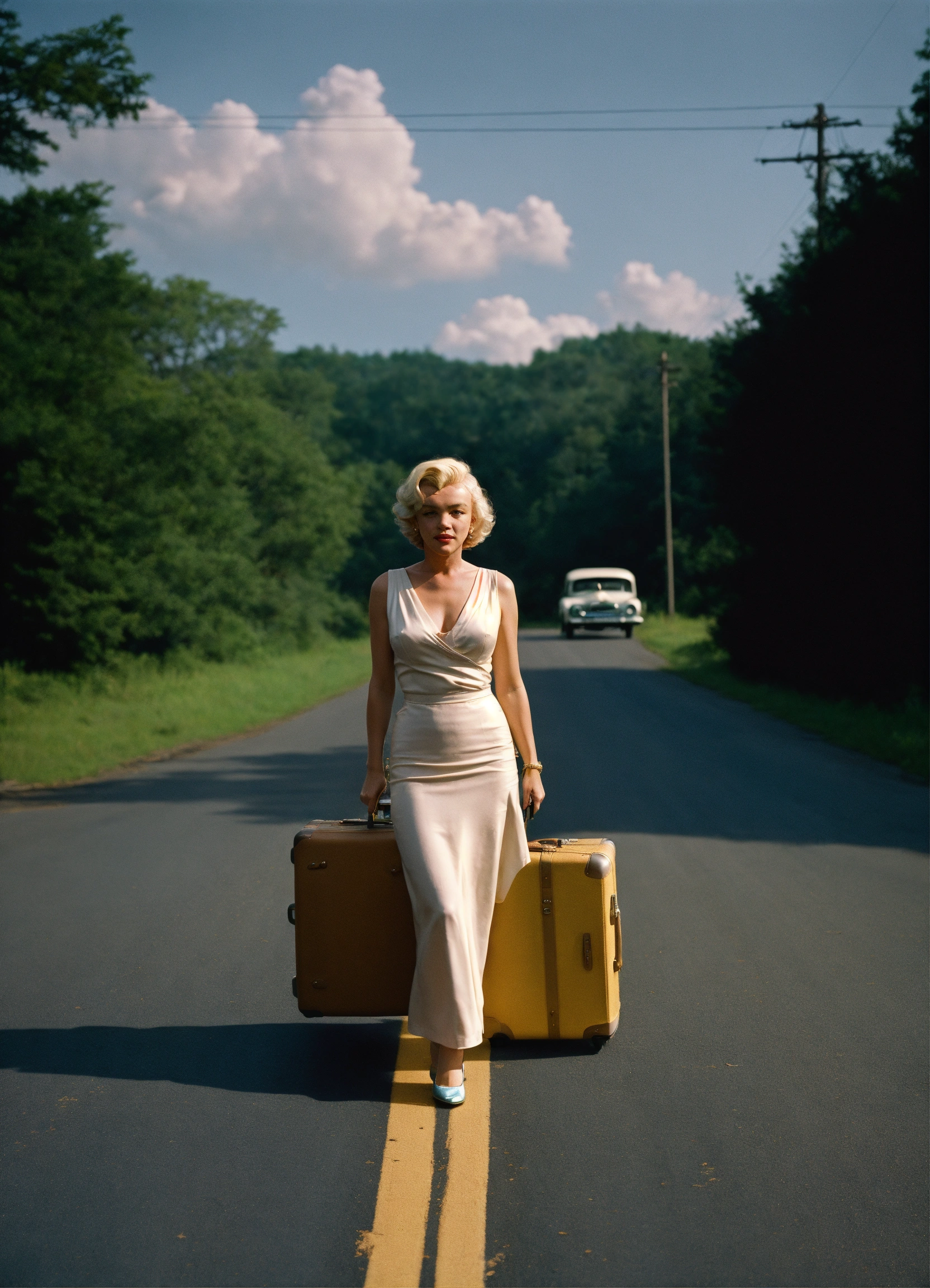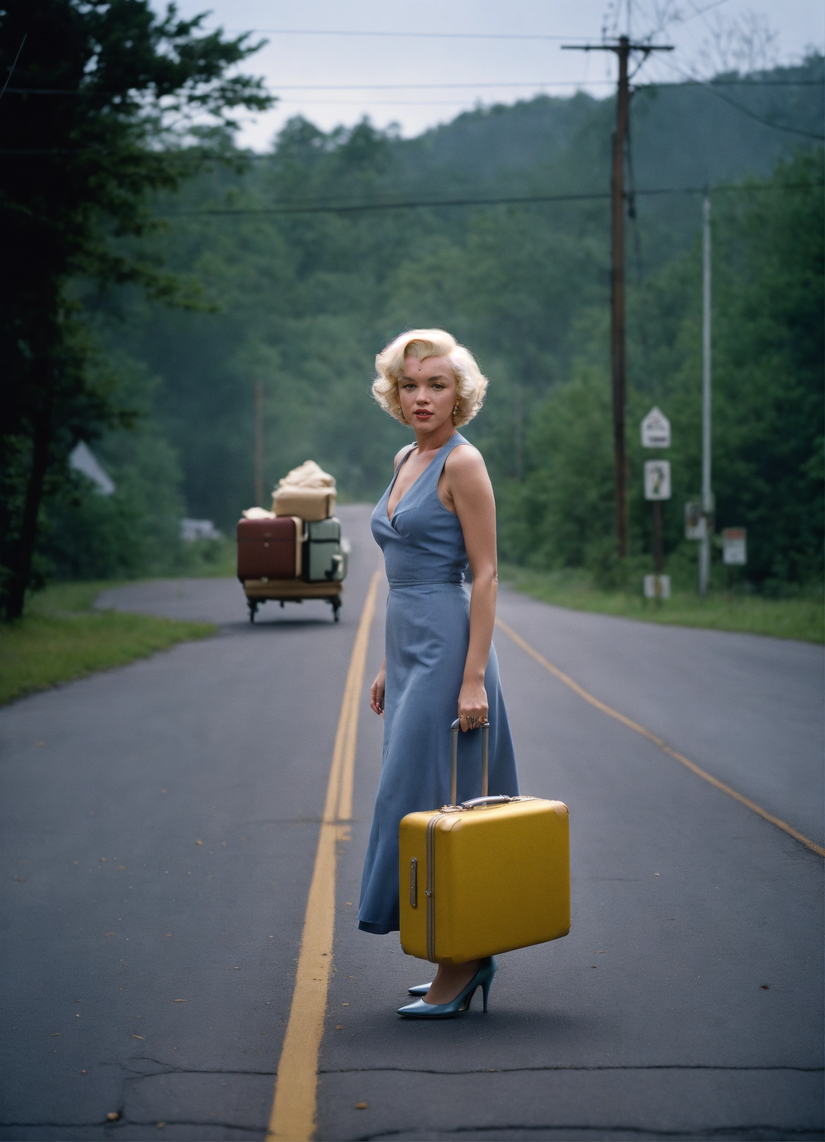 A photograph of marilyn monroe standing on a road with a suitcase, gregory crewdson wide format, wes anderson colour grading, diffuse lighting at daytime