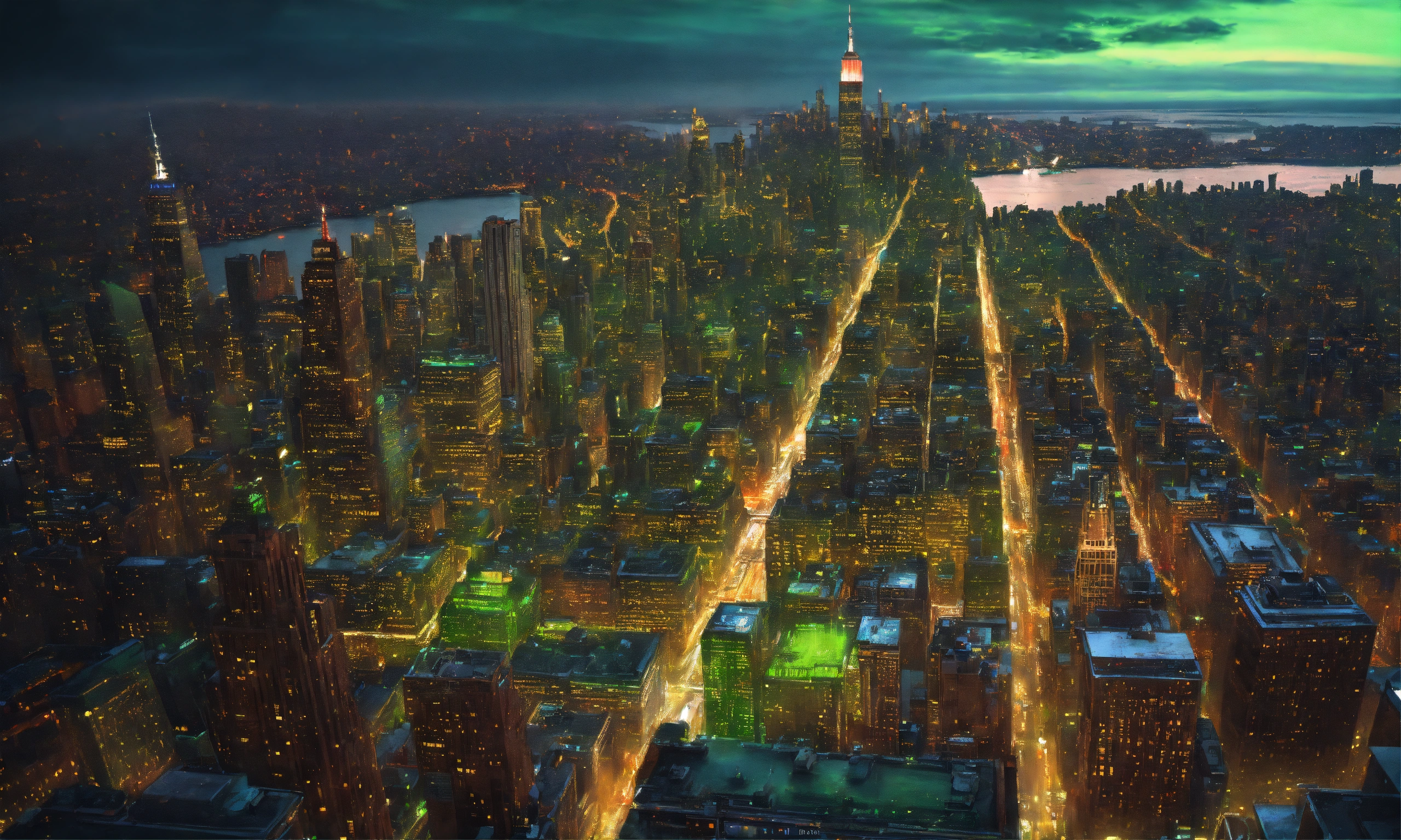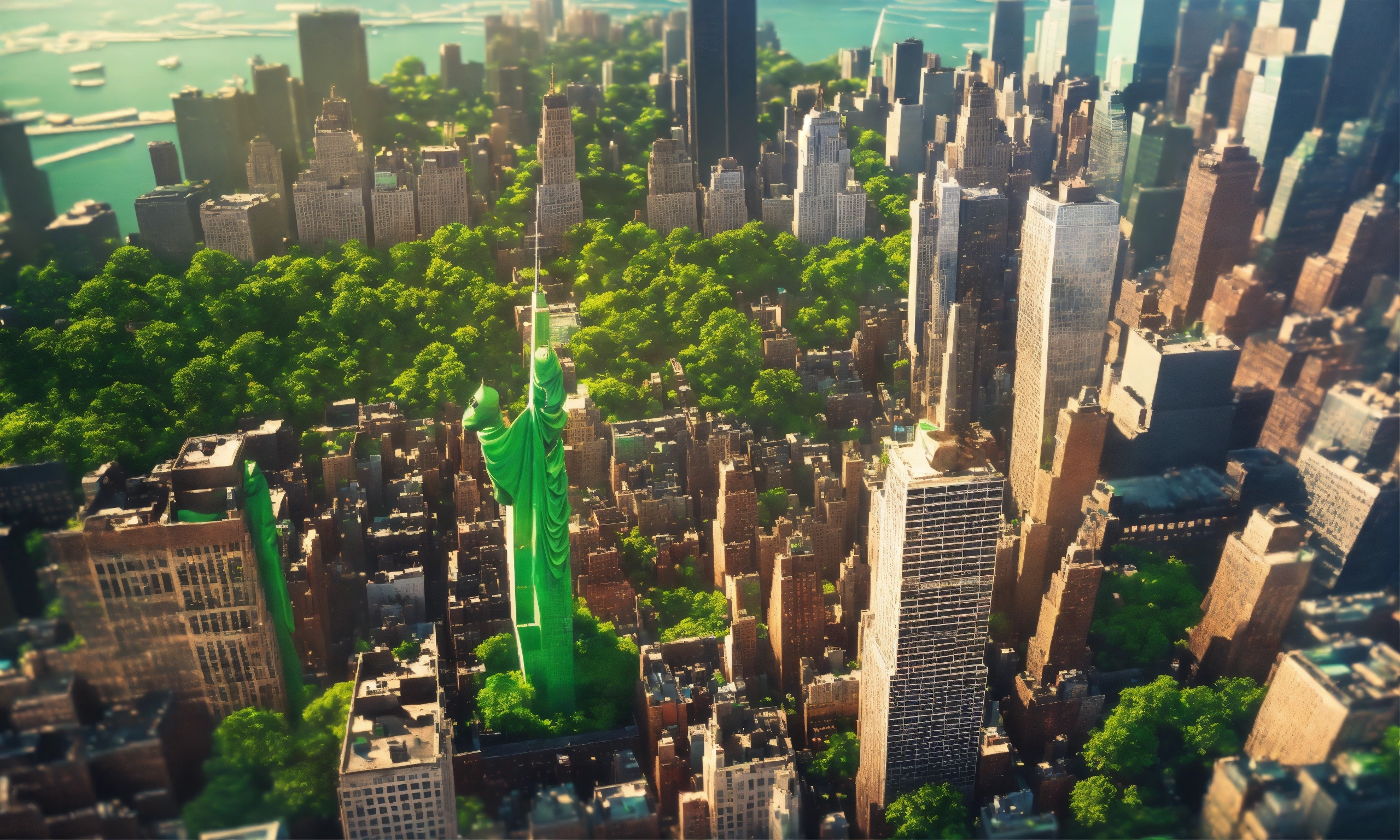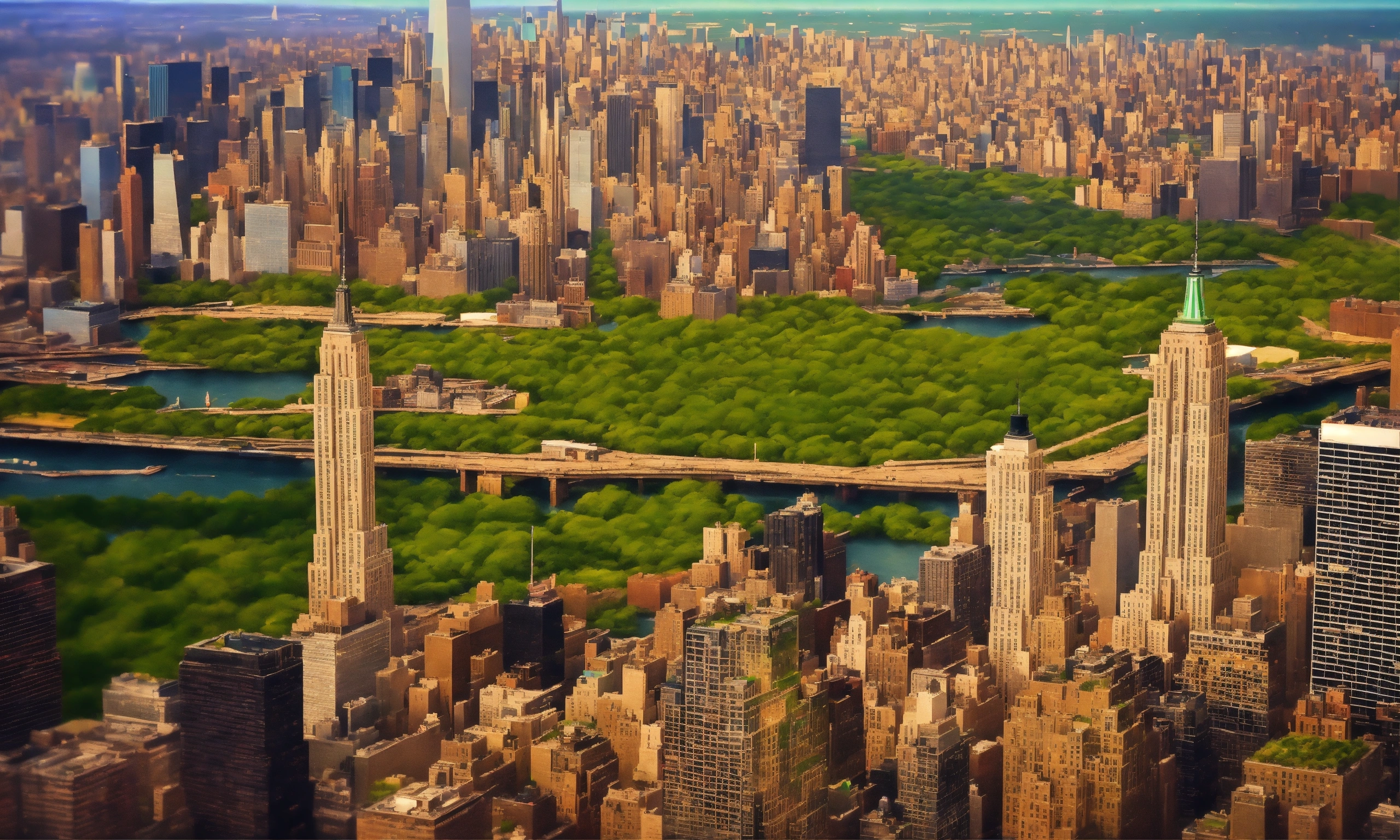 Epic shot of new york 50s from birds view, green, ultra cozy, ultra cozydigital painting, little photorealistic, sharp focus, ultra cozy and inviting, wish to be there. very detailed, arty, should rank high on youtube for a dream trip.