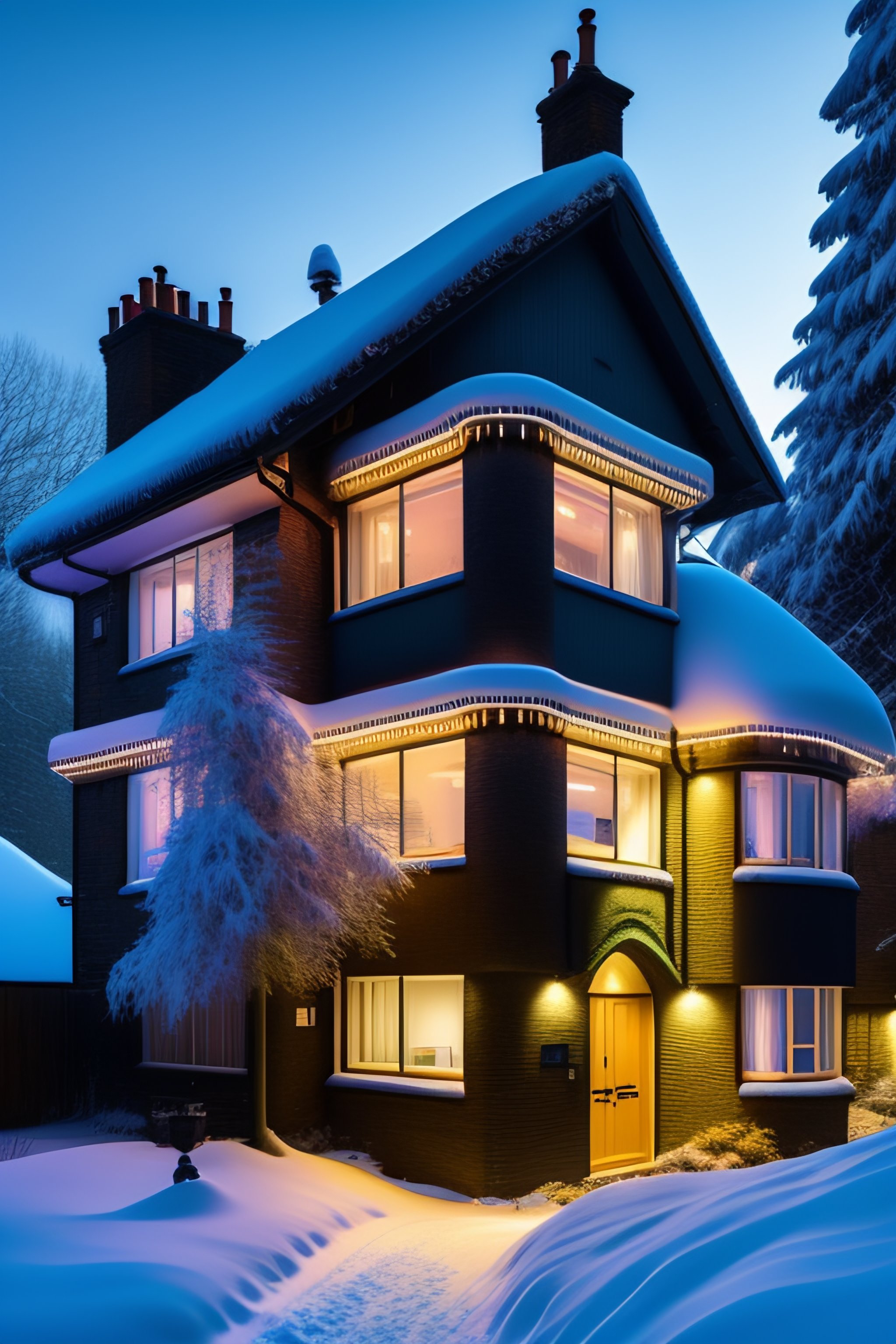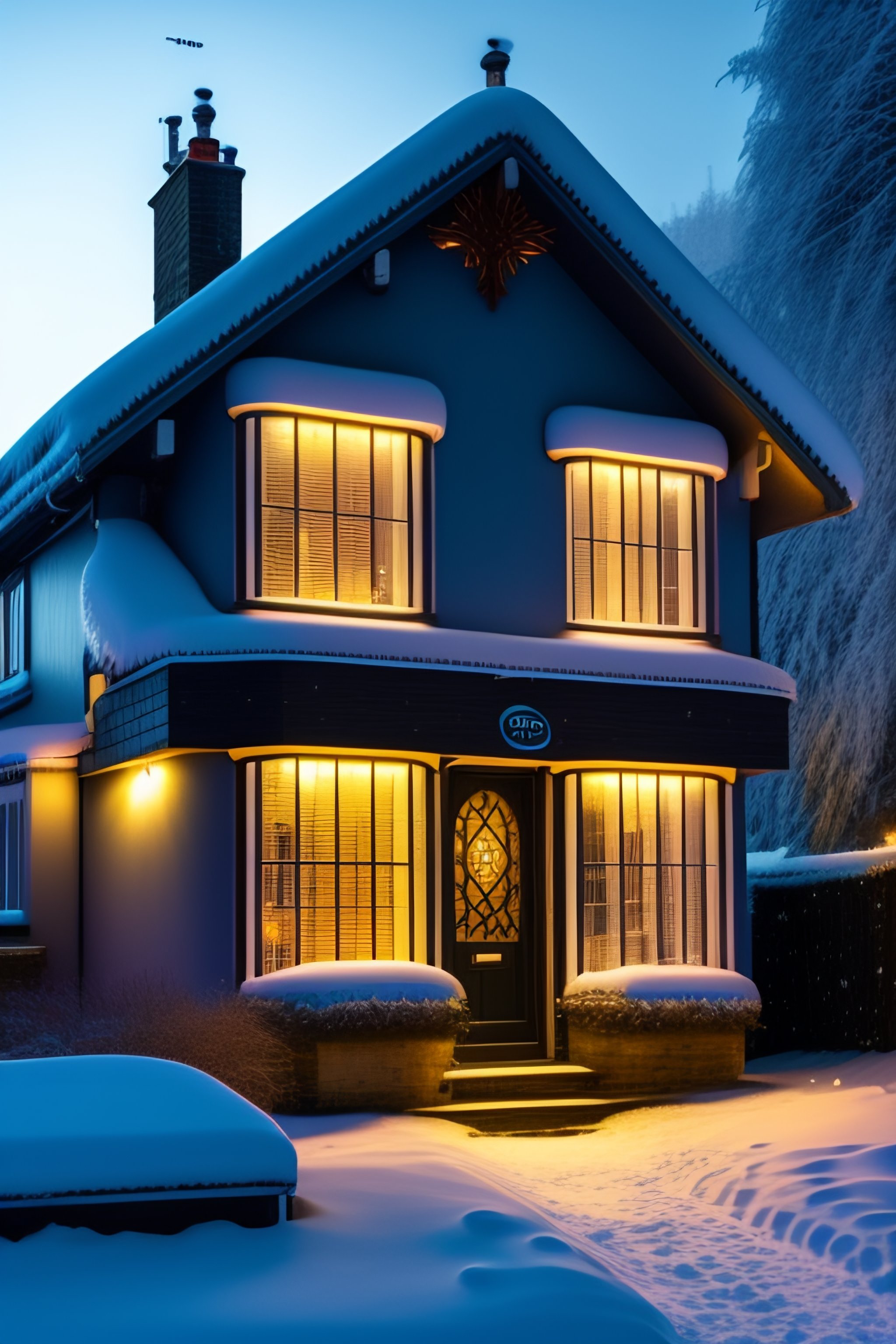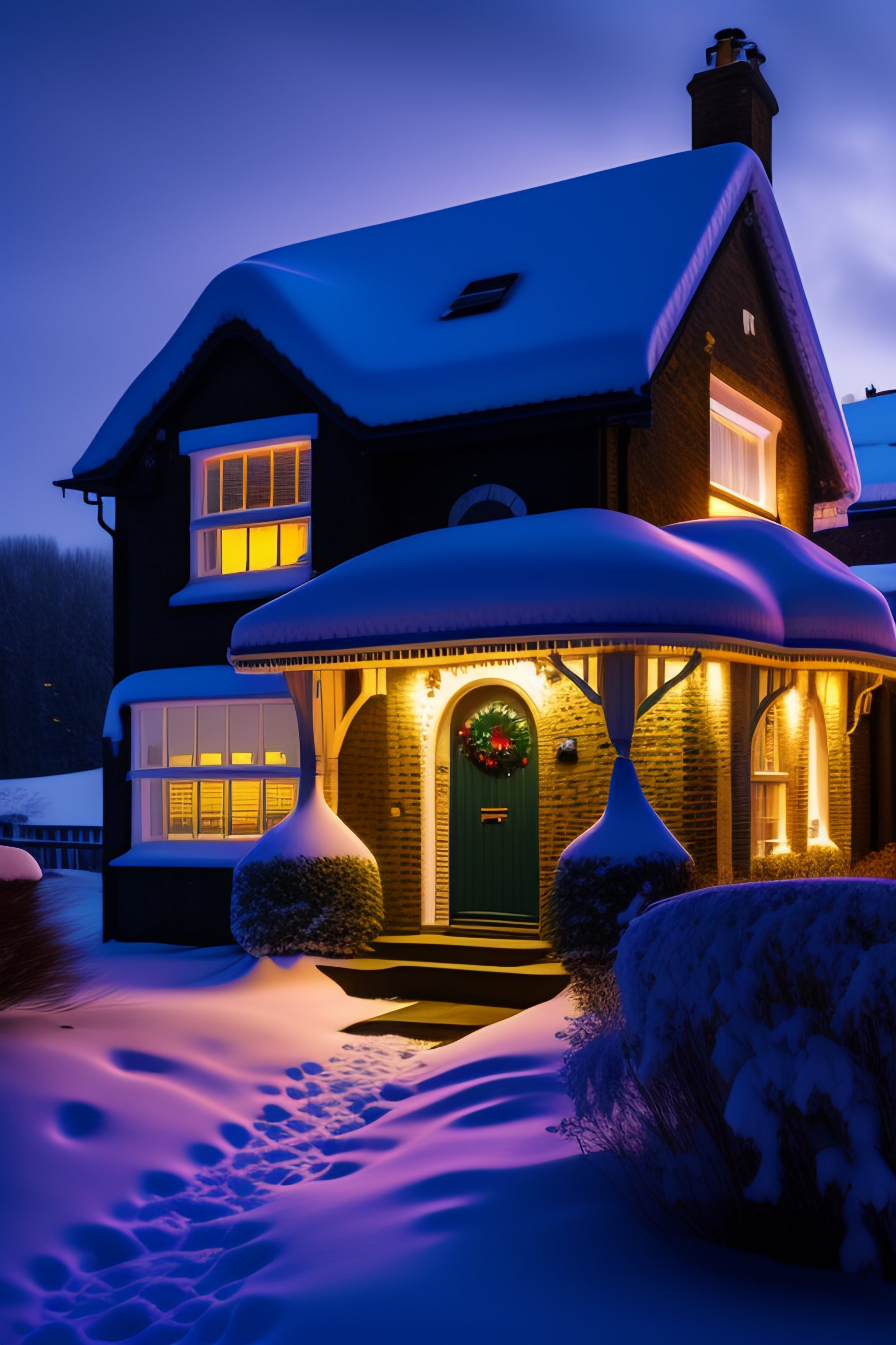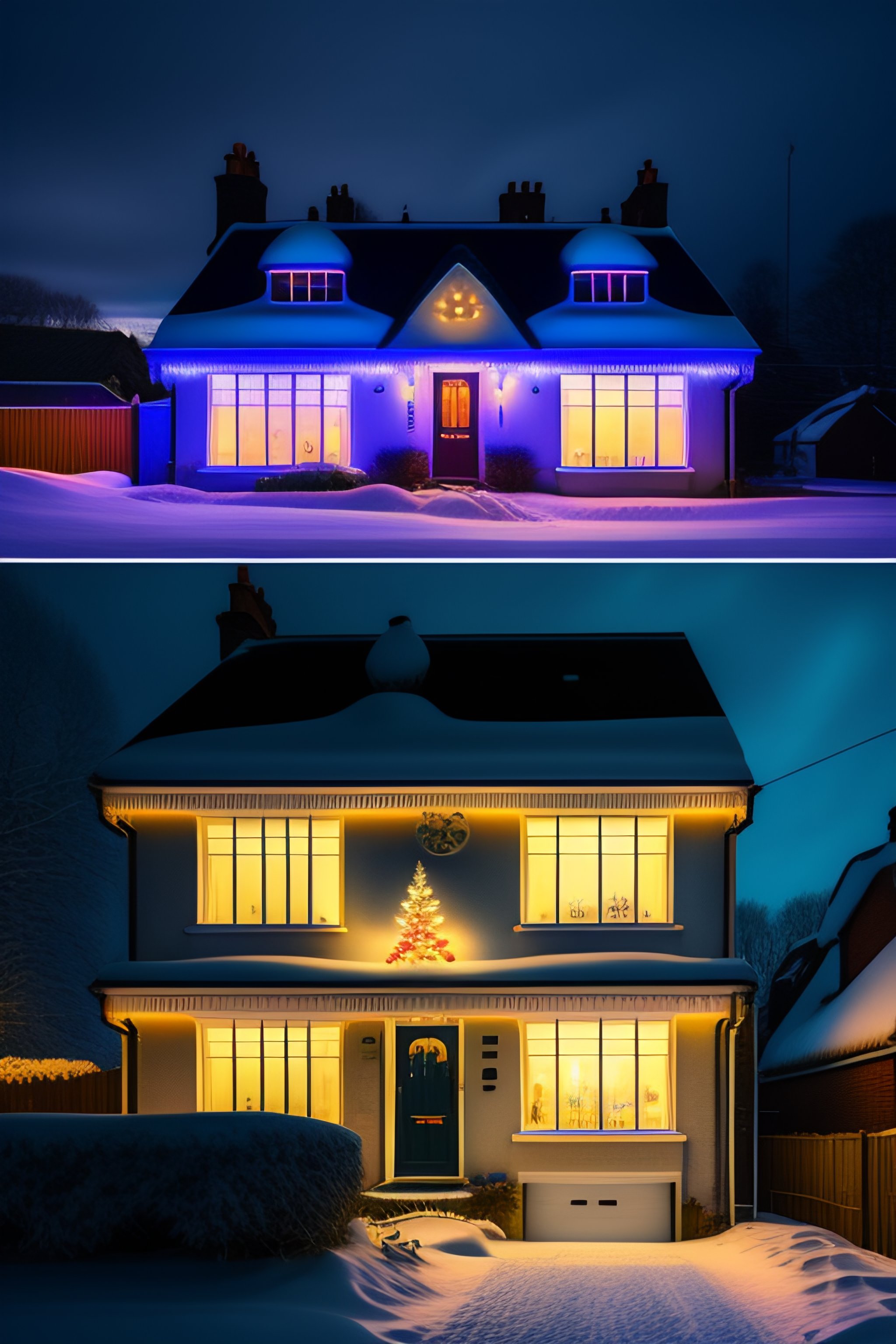Cyberpunk, winter in the snow, christmas lights, external view of a 5 bedroom detached cyberpunk house in the uk