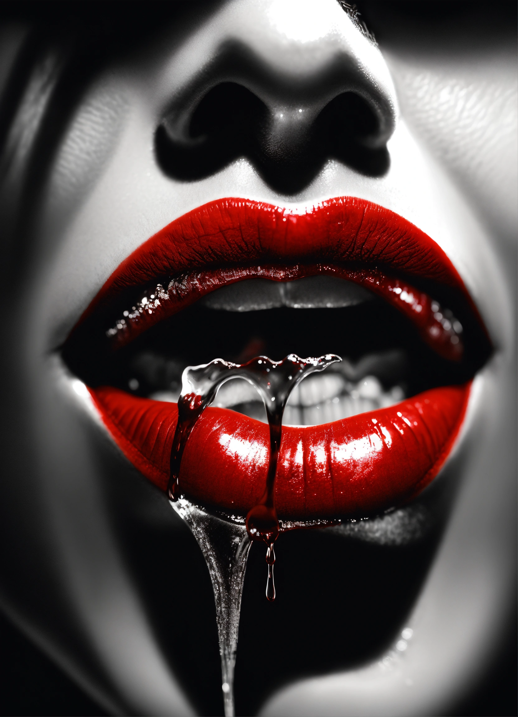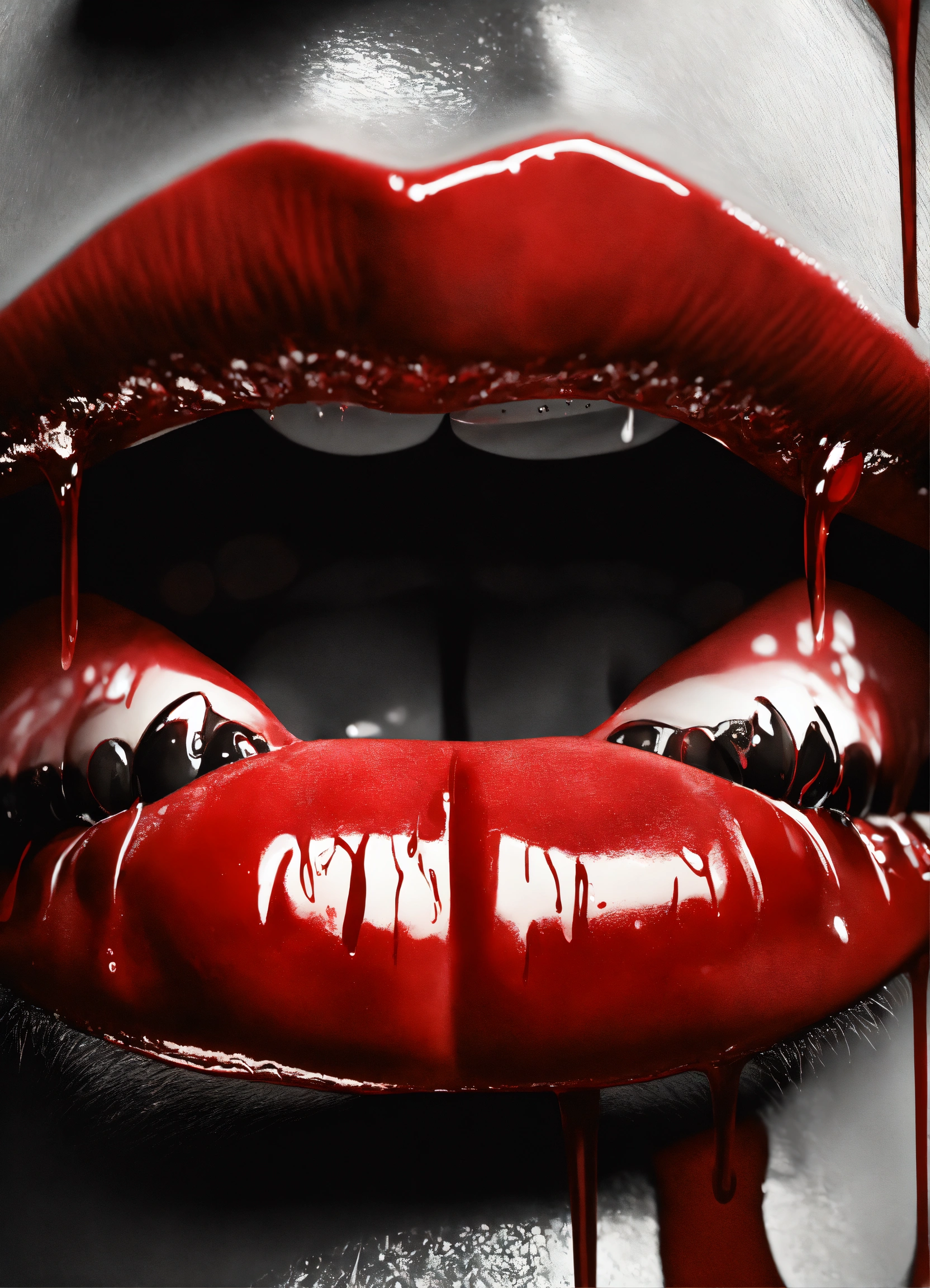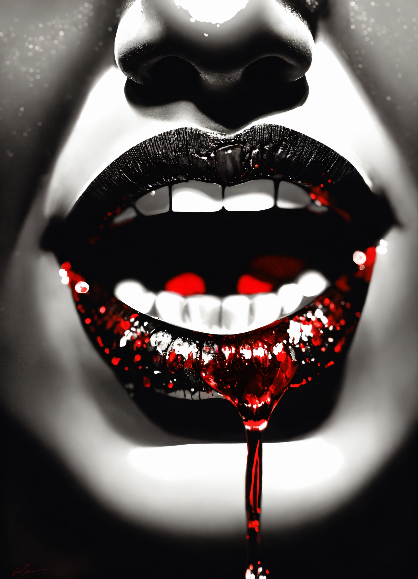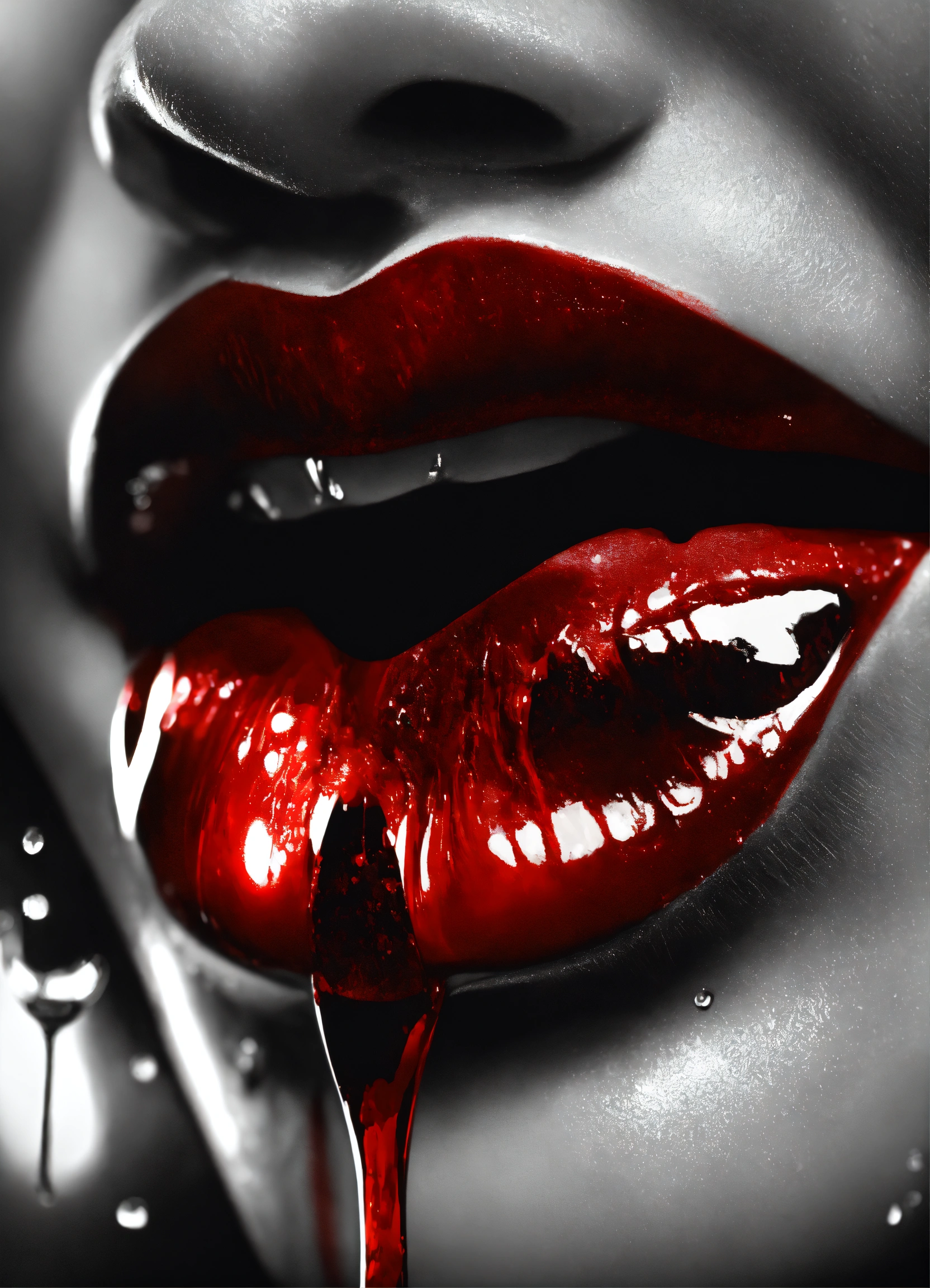 Photorealistic, black and white, extreme close up, lips, liking red drops dripping, vampire teeth, glowing, highly detailed, 8k, q2