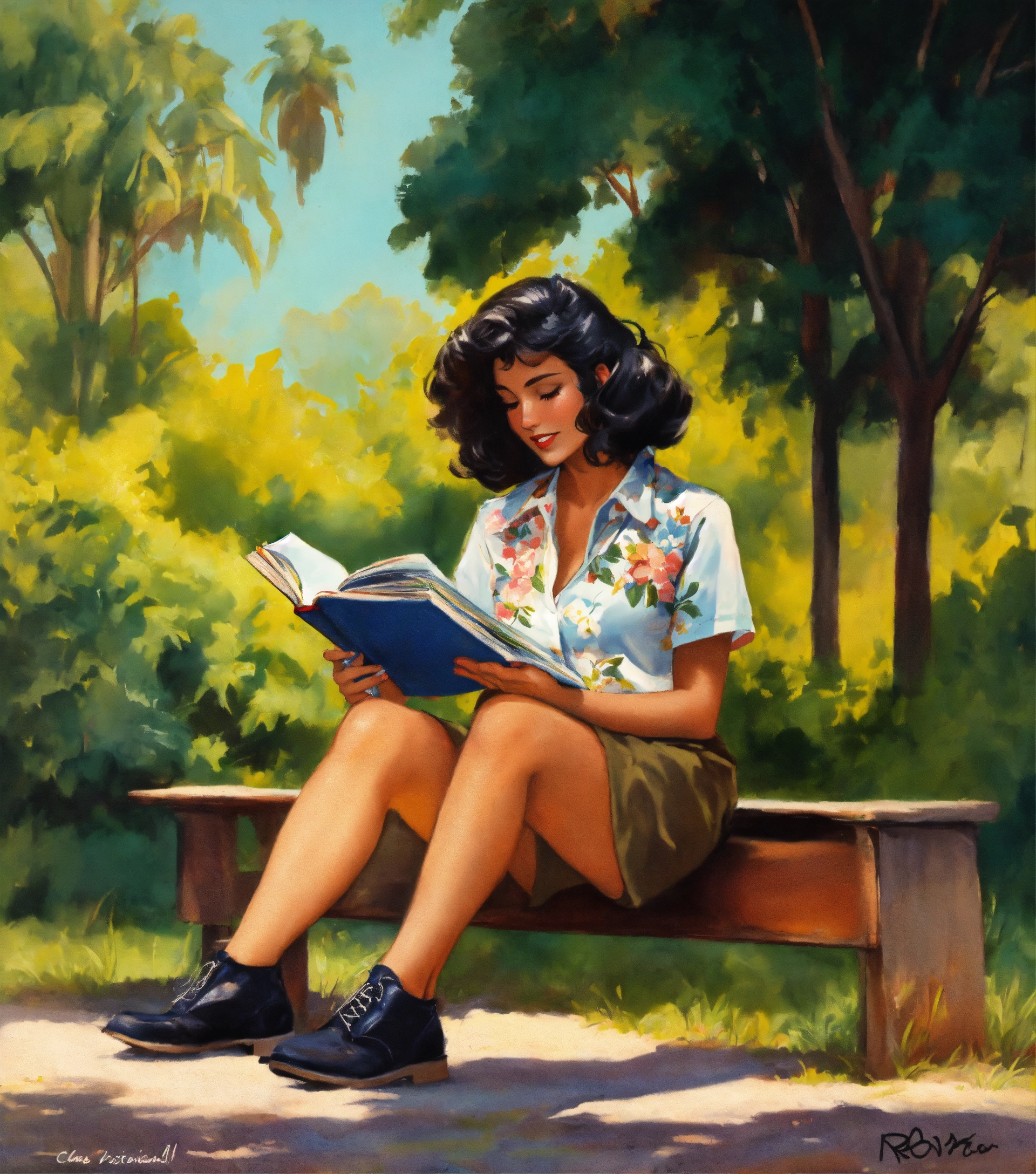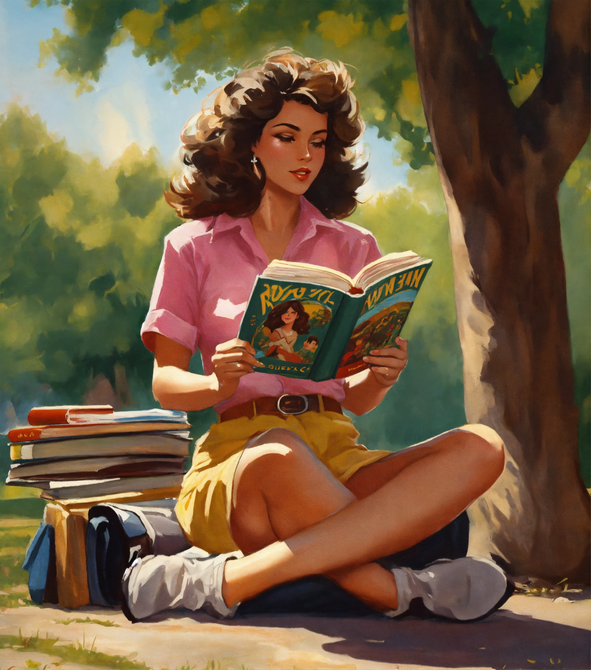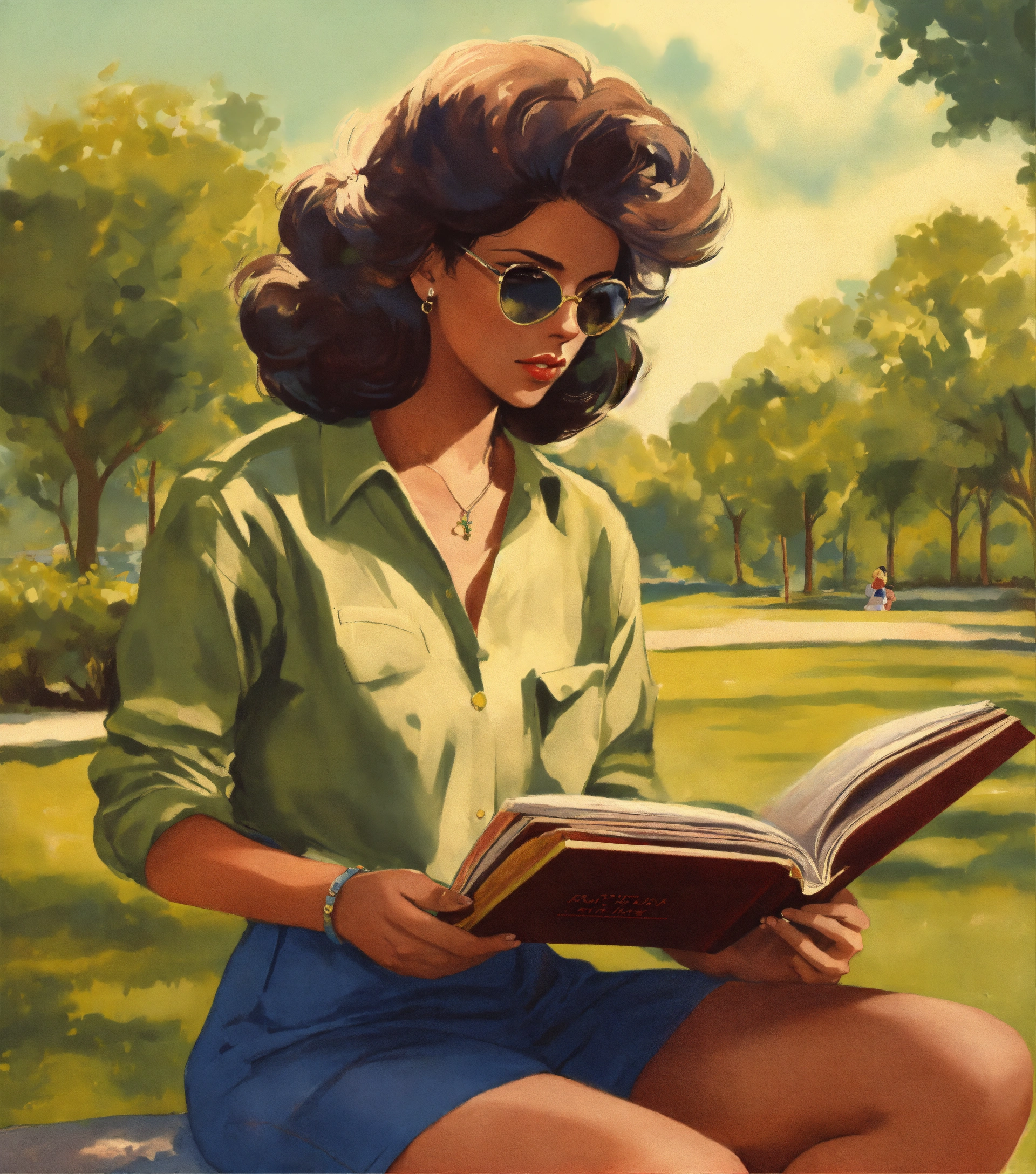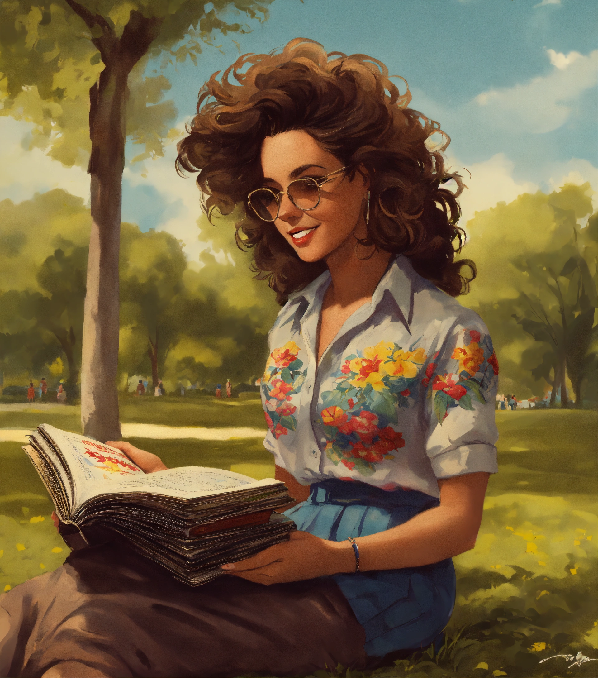 Mujer de los 80 leyendo un libro en un parque, vistiendo ropa estilo caricatura vintage, con pelo corto y una camisa que diga venezuela.