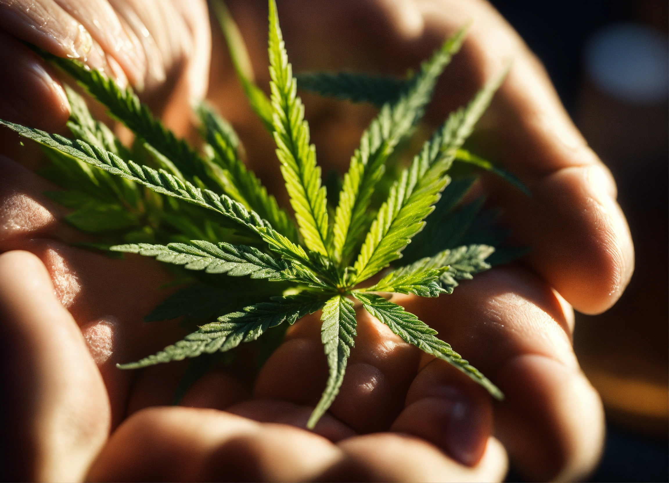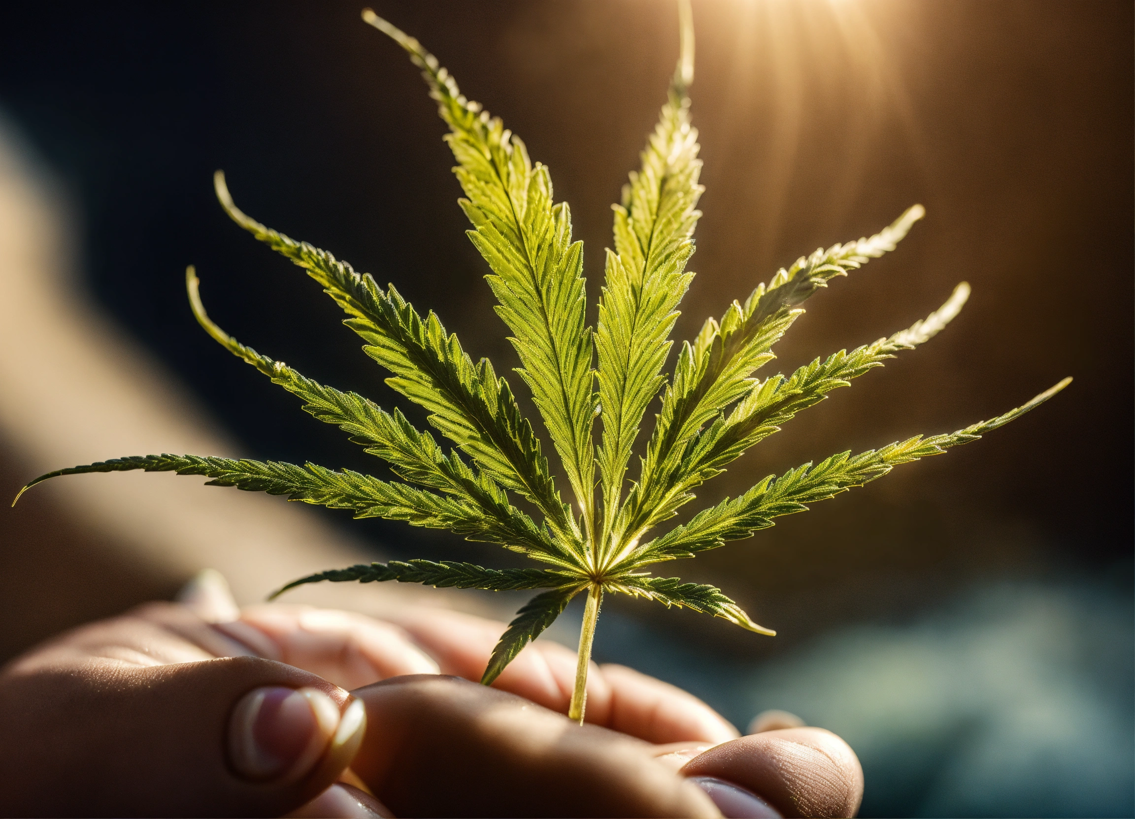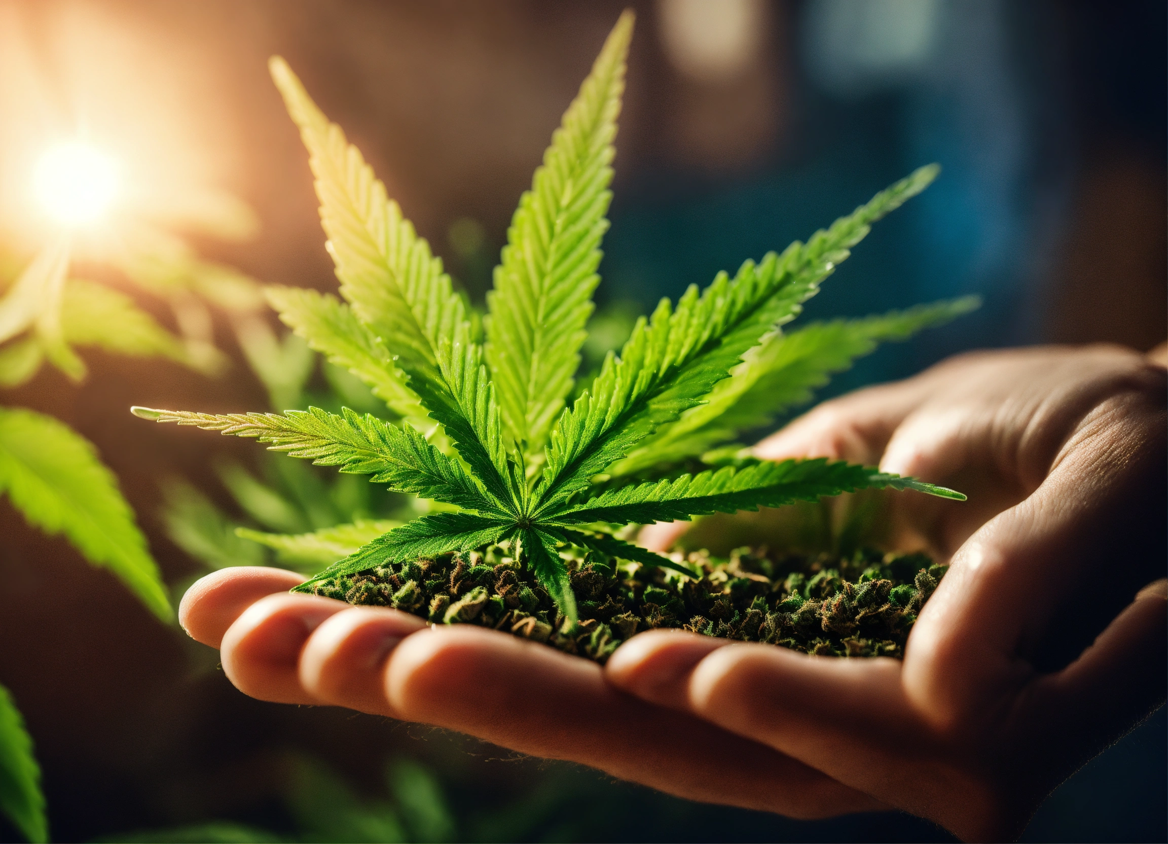 Create a photo realistic image of a hand, holding cannabis. the picture is very light and a sunbeam shins directly on it. photography, dslr with macro lens to capture the intricate details in a super-realistic photography hr image.resolution 300dpi