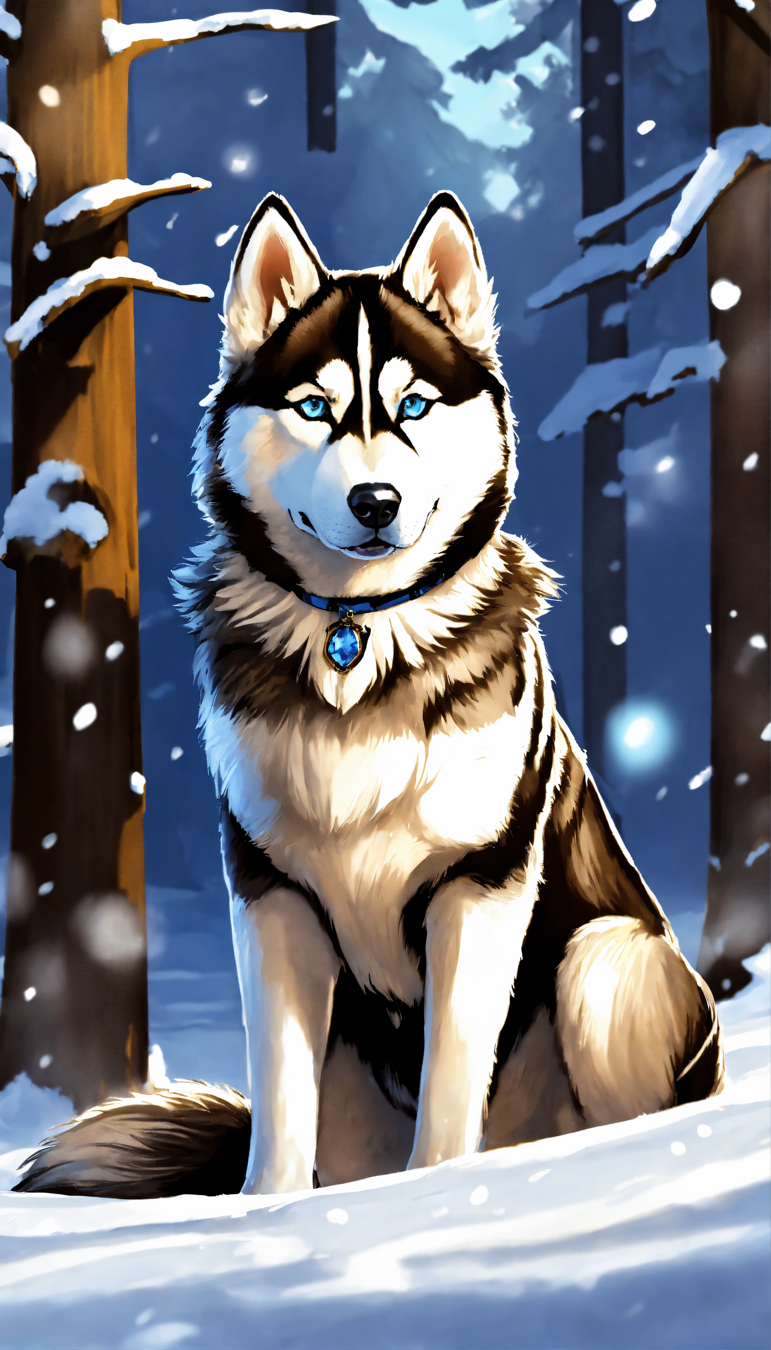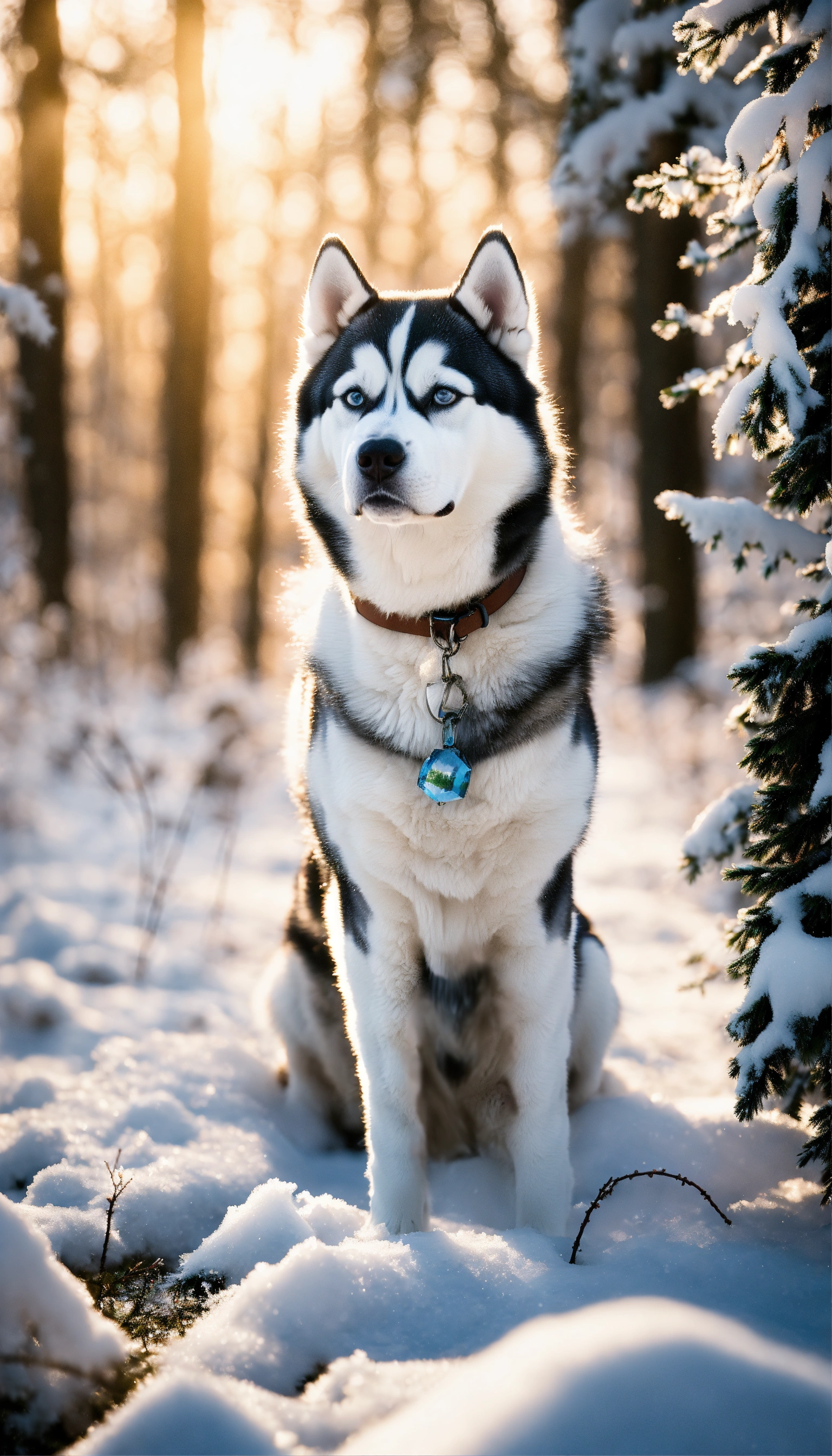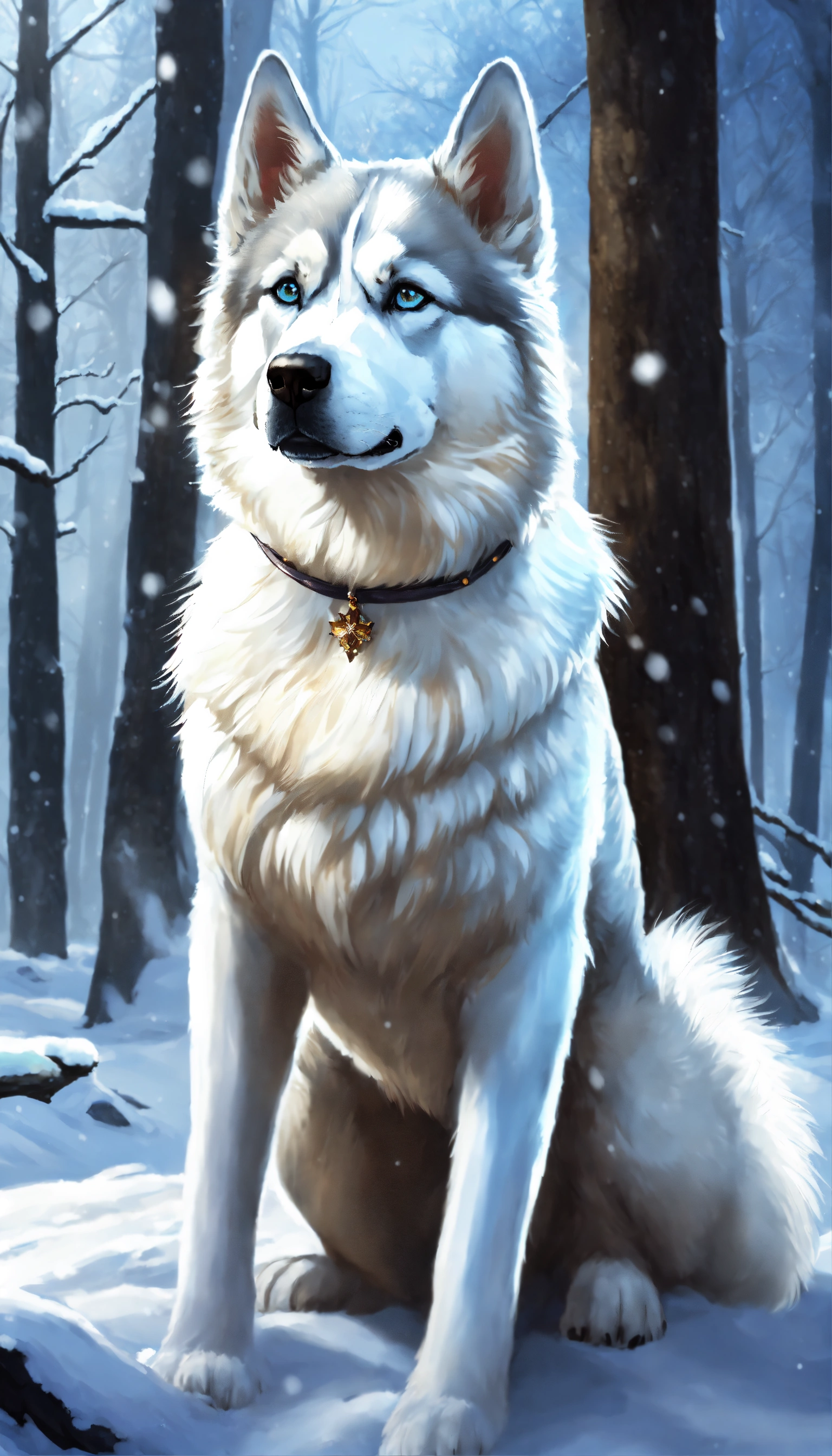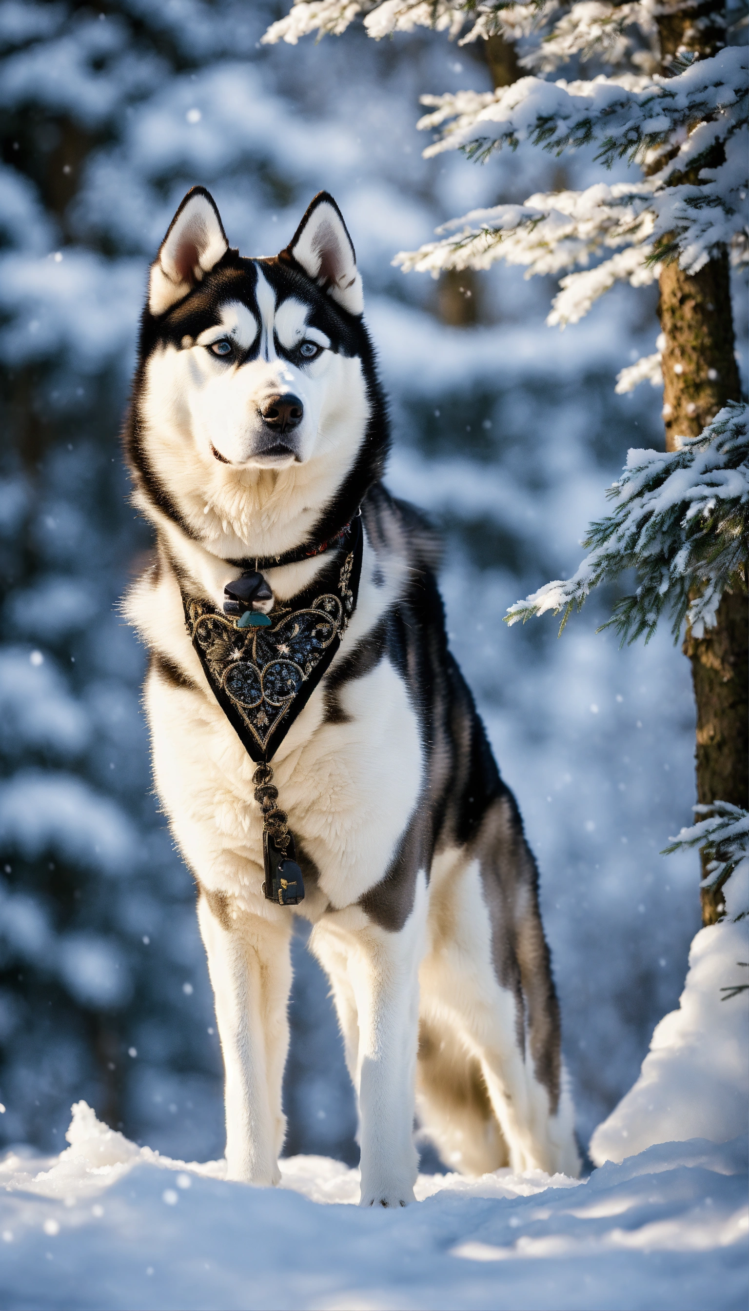 "envision a siberian husky, poised and regal, amidst a snow-laden forest. drape the dog in a sleek, metallic-hued winter cape that flows with the icy breeze, complementing its striking eyes. frosty trees and soft snowflakes should surround the husky, cementing its status as the winter woods' ruler."