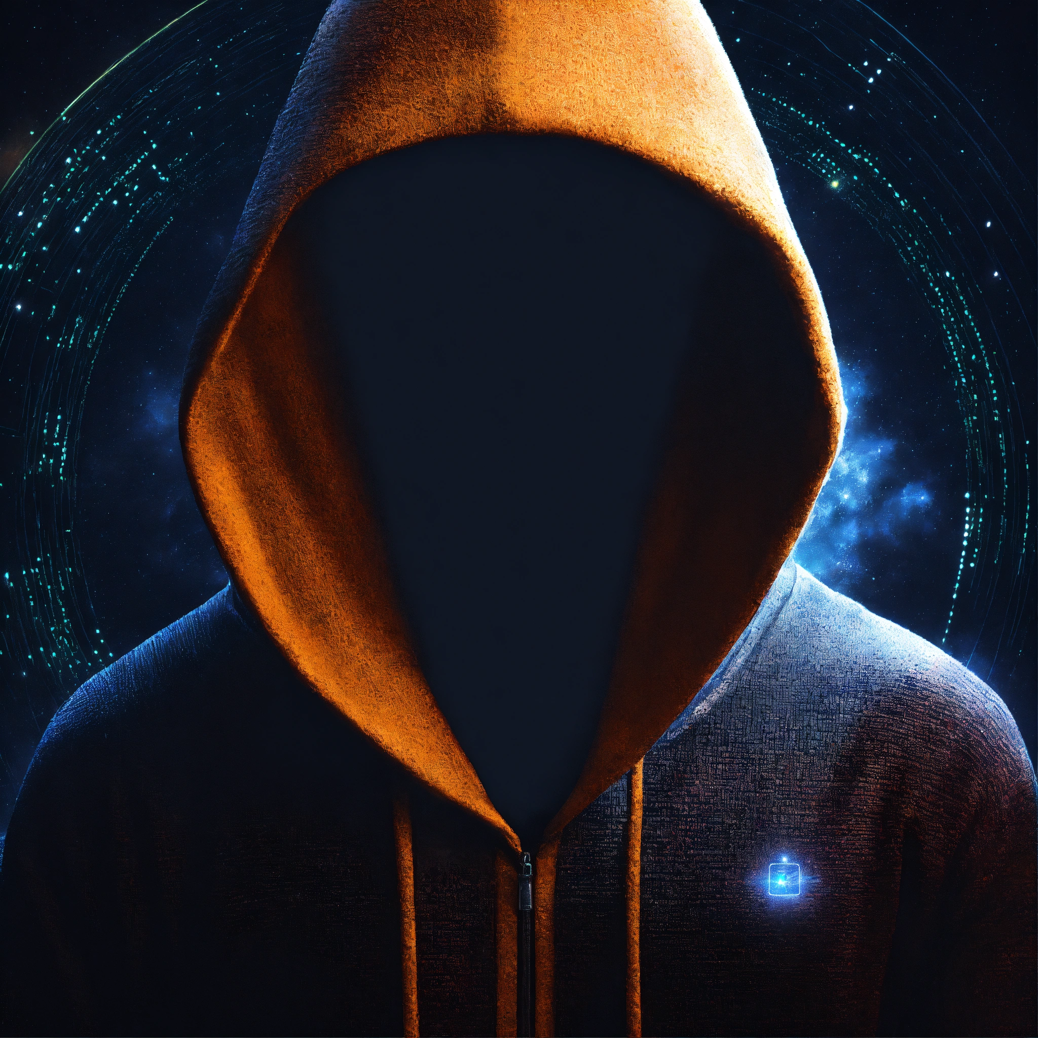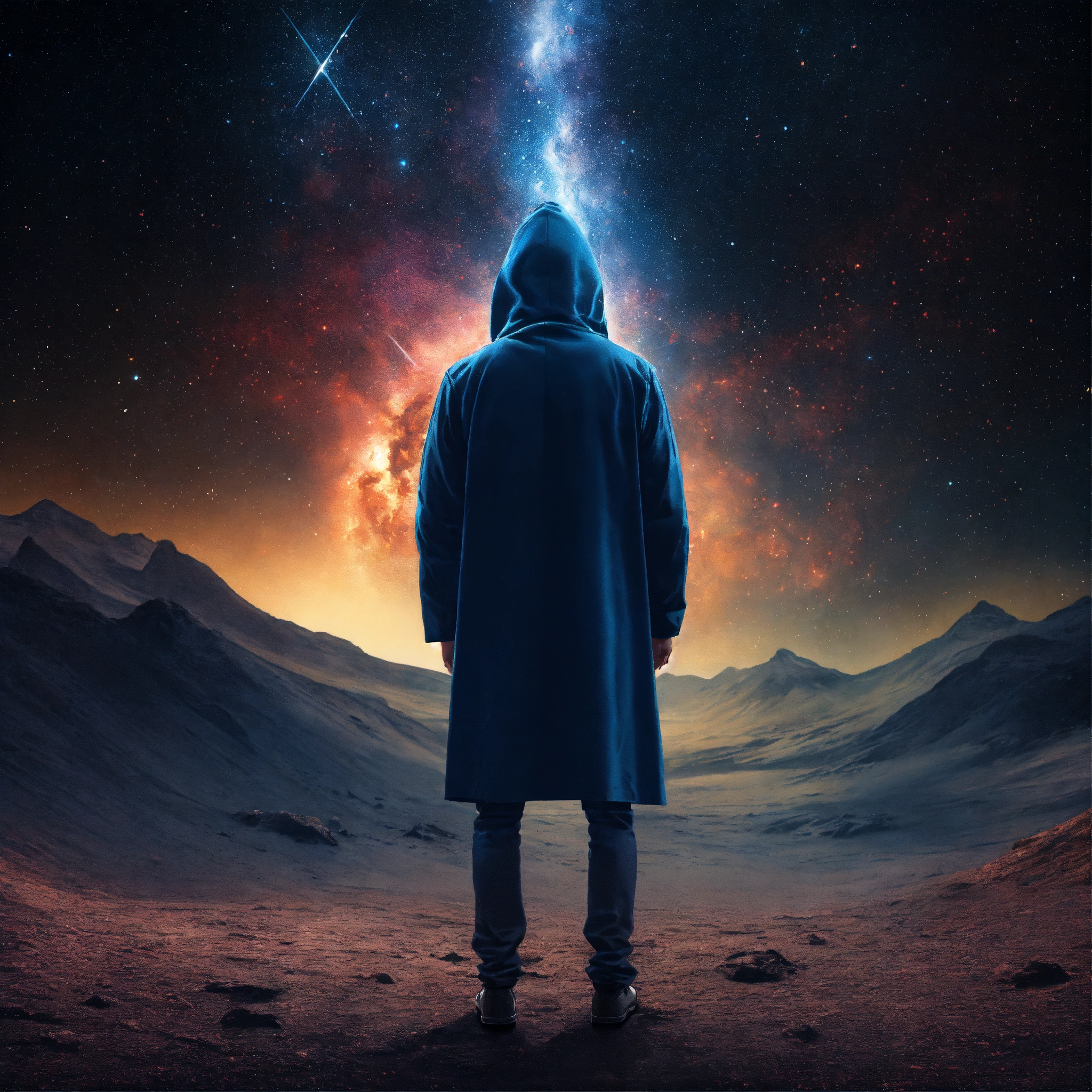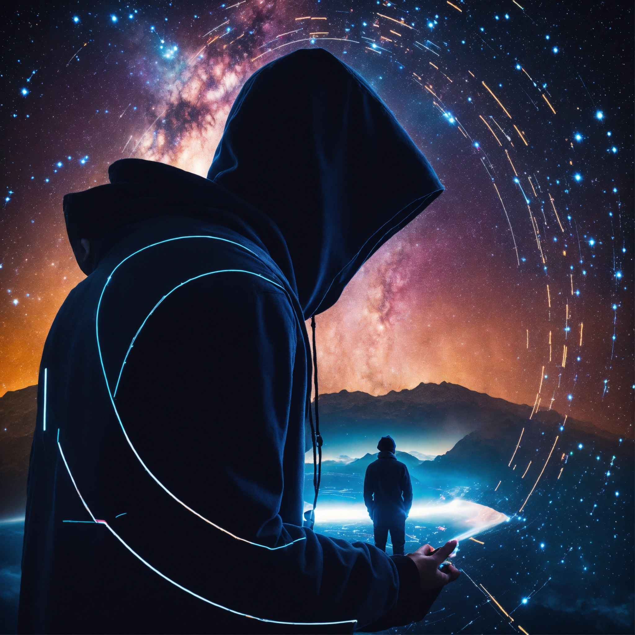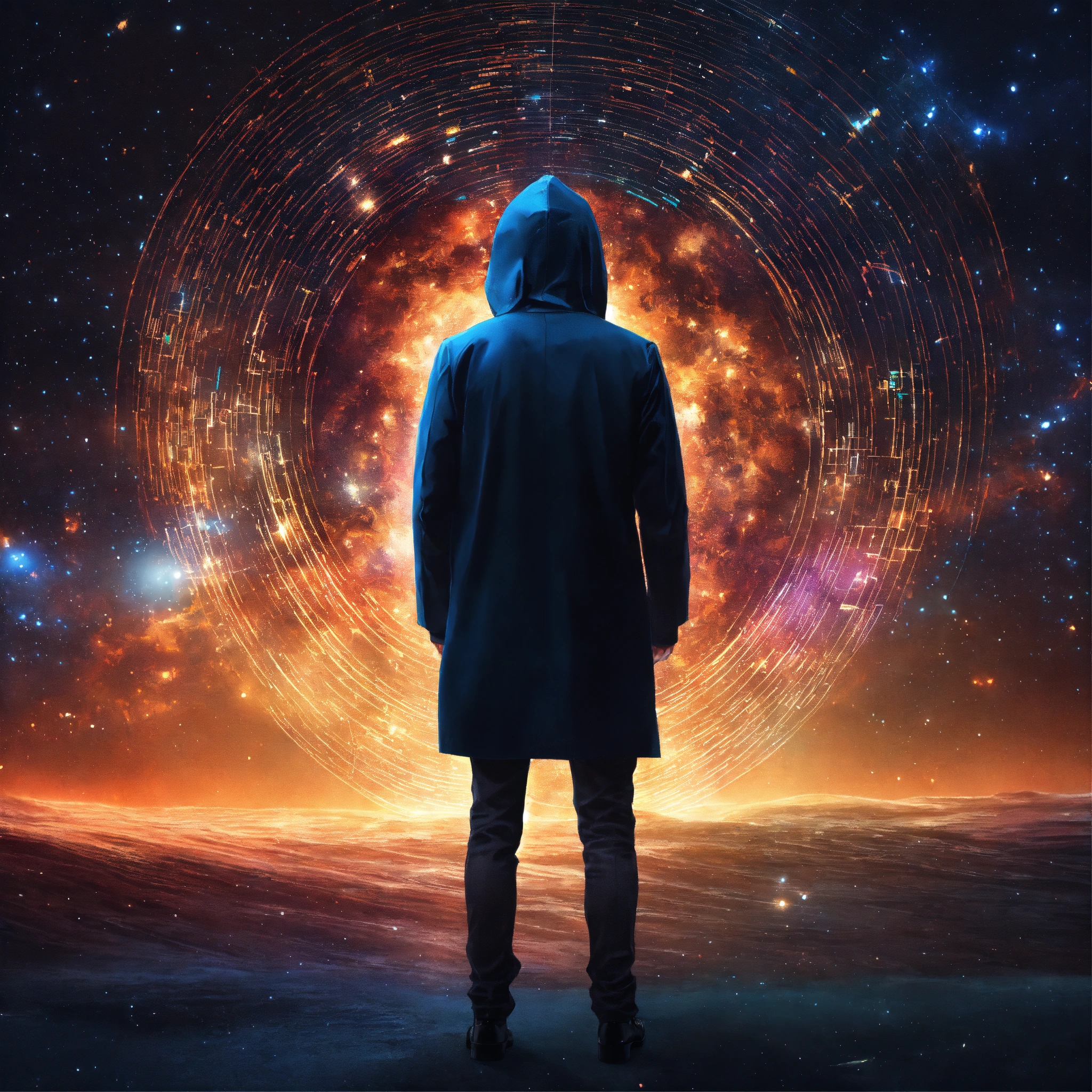 Un homme vu de dos avec une capuche dans un univers galactique et une ligne de code informatique