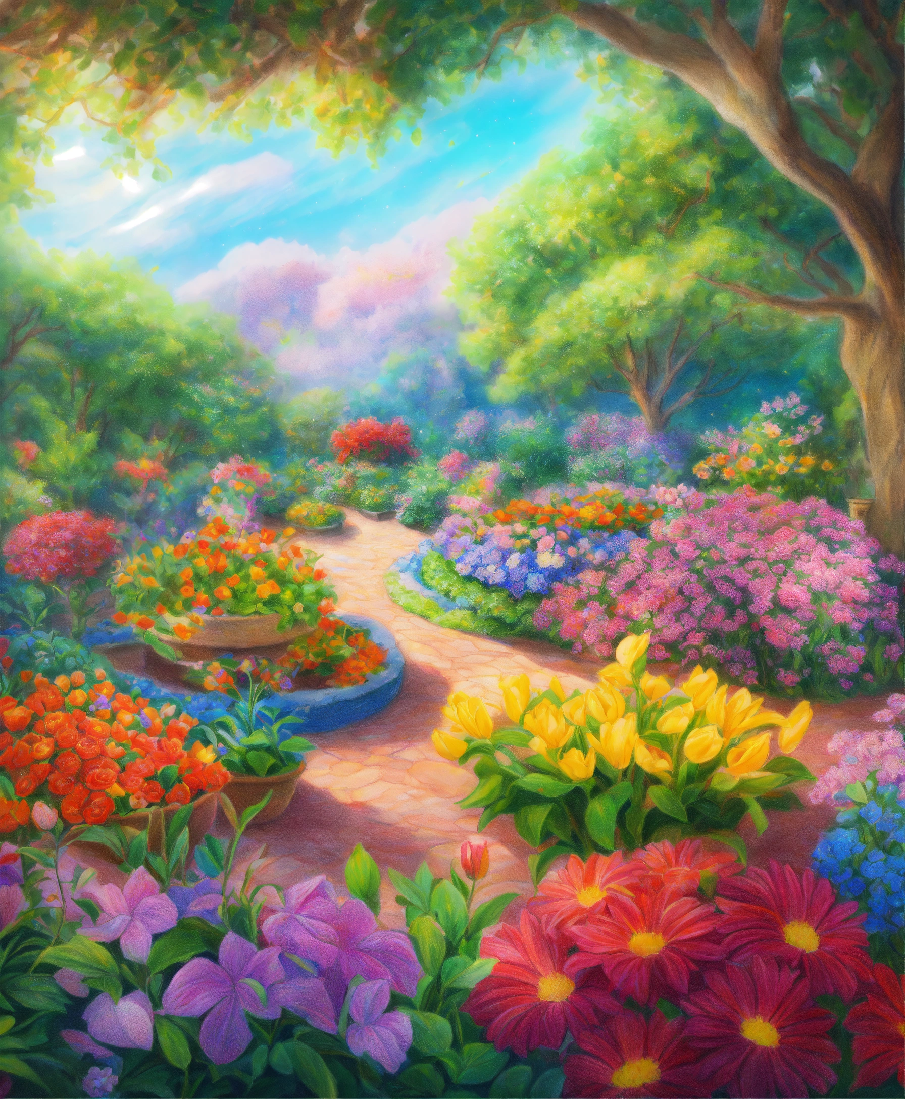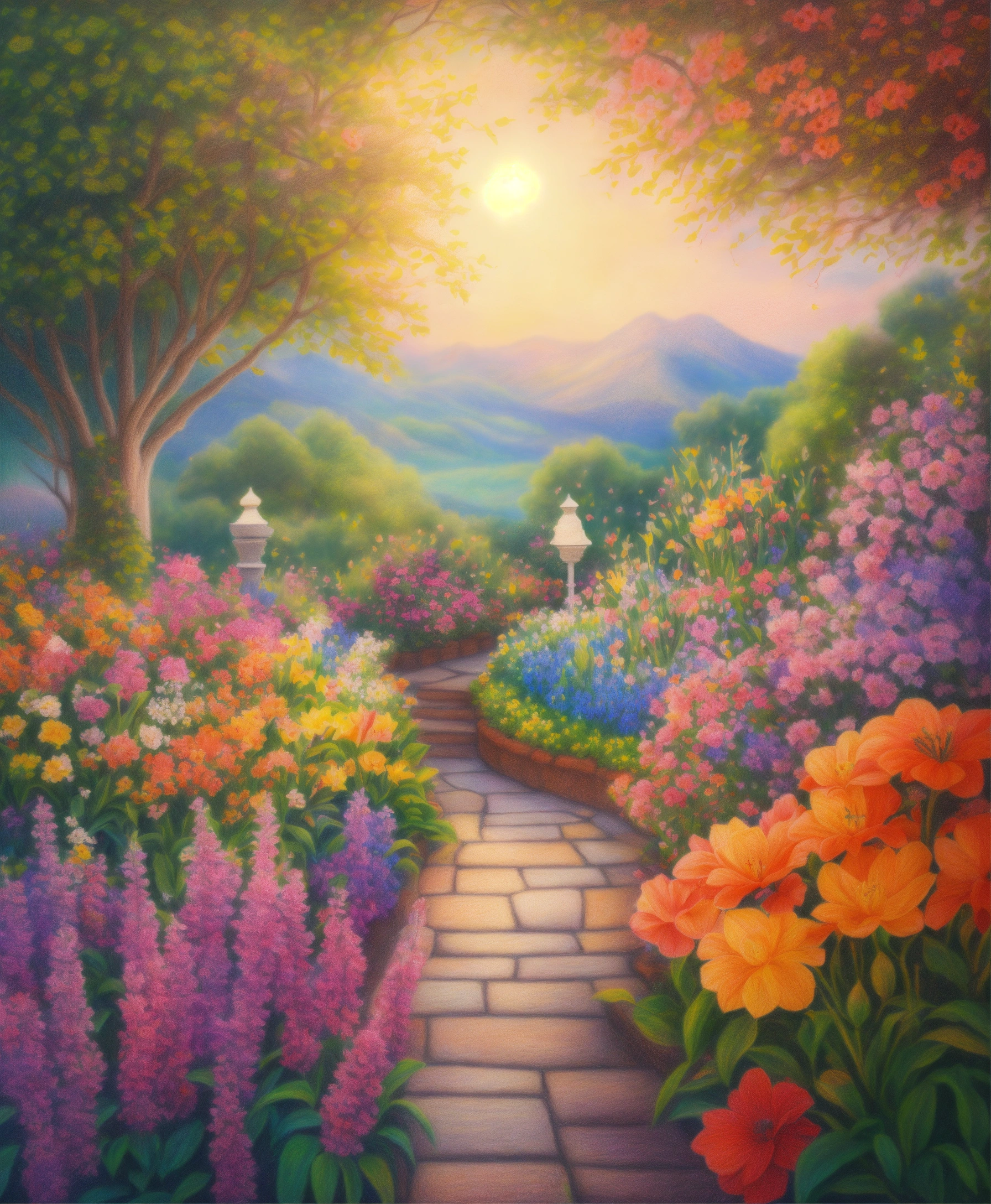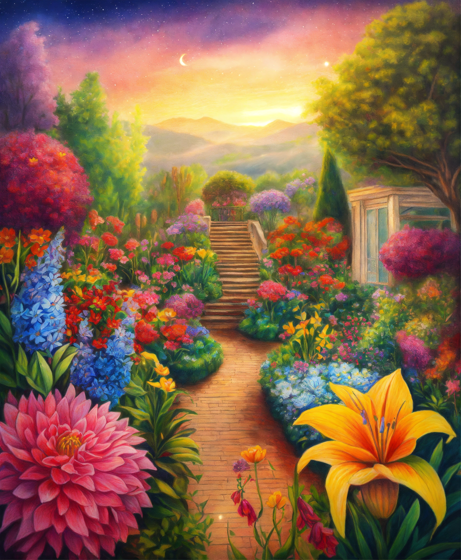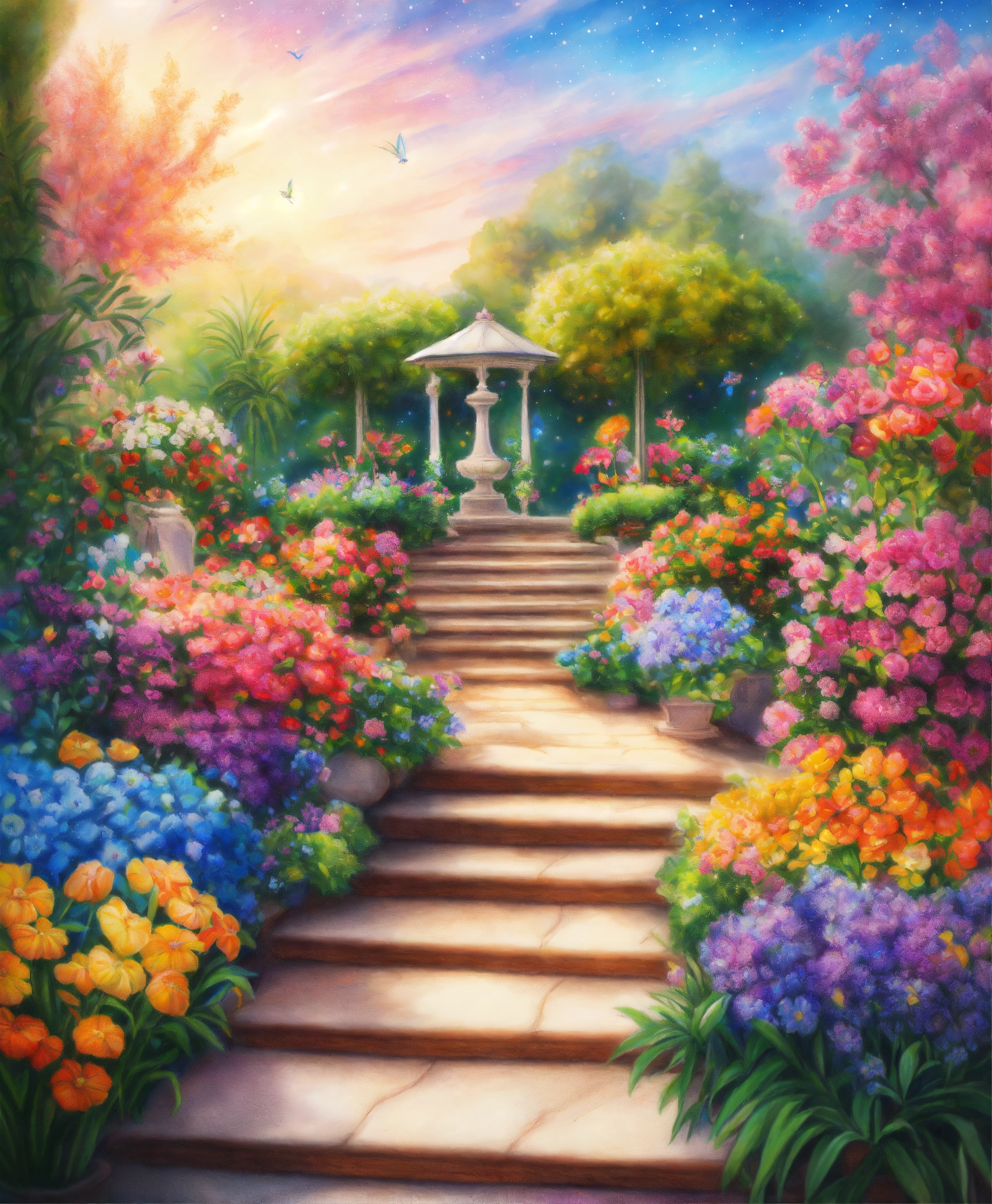 Colored pencil drawing of a beautiful garden with exotic and very colorful flowers, lots of etheric beauty, lots of colors, flower arrangements everywhere, a heavenly landscape, heavenly garden.. galaxy background. 4k.