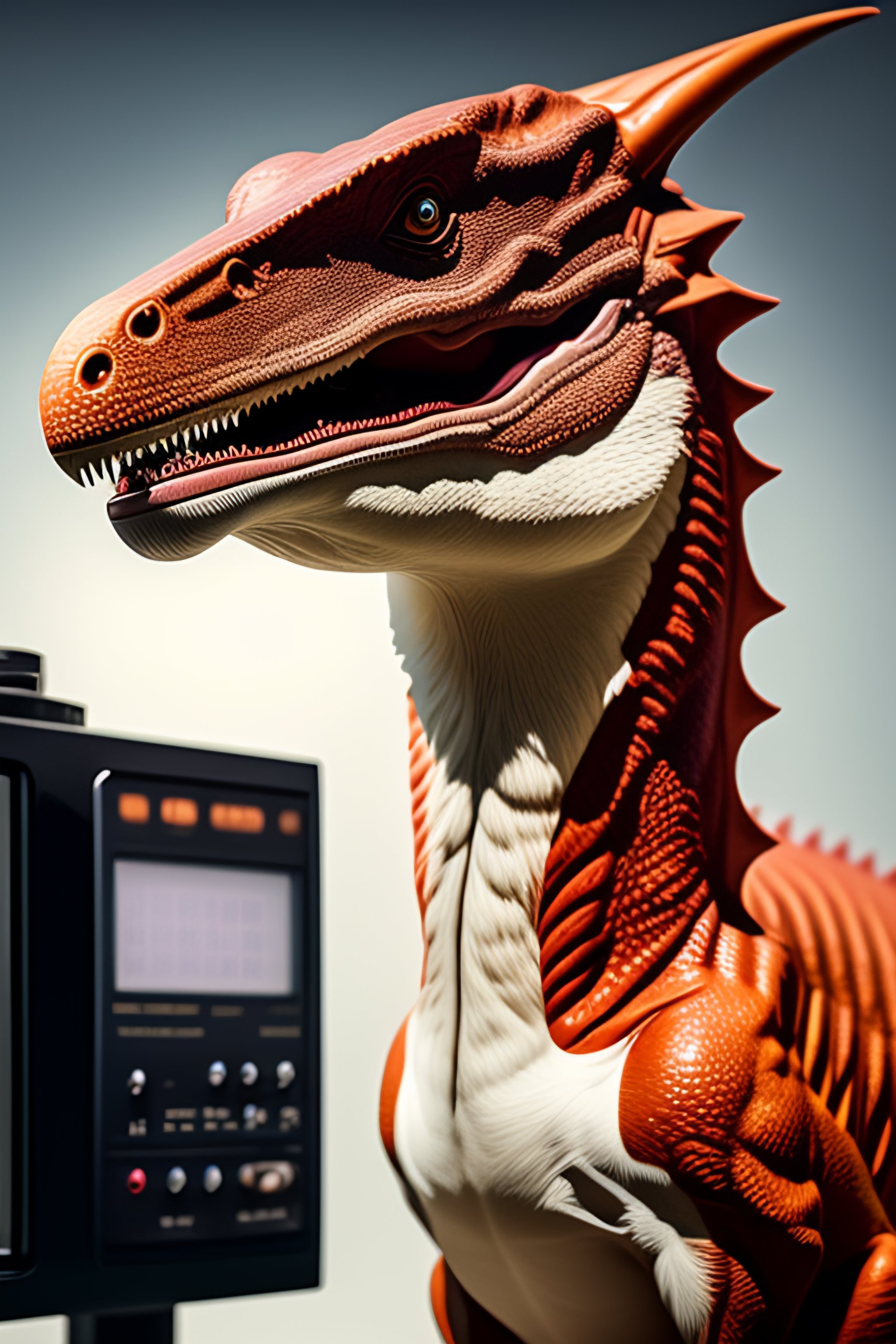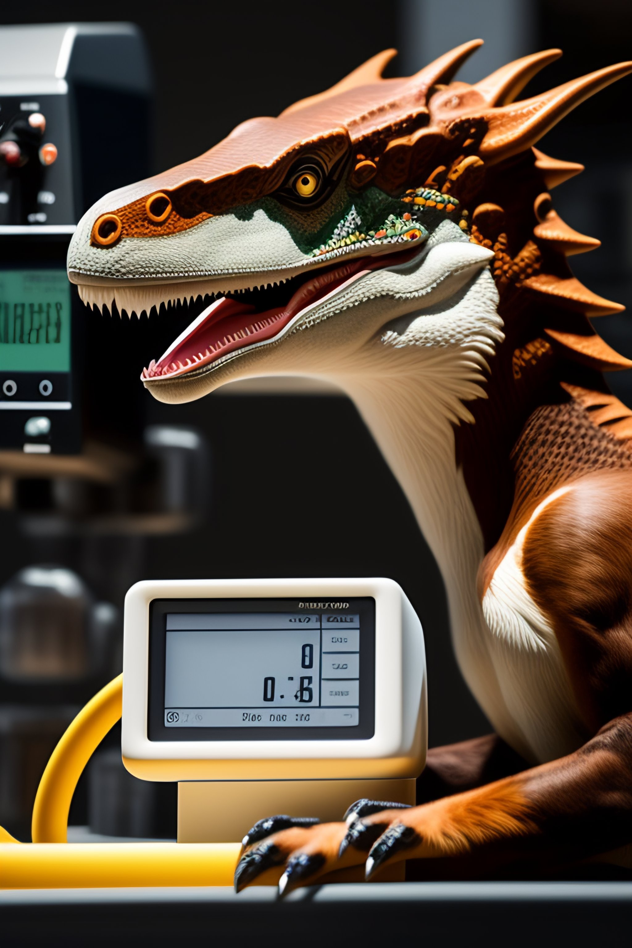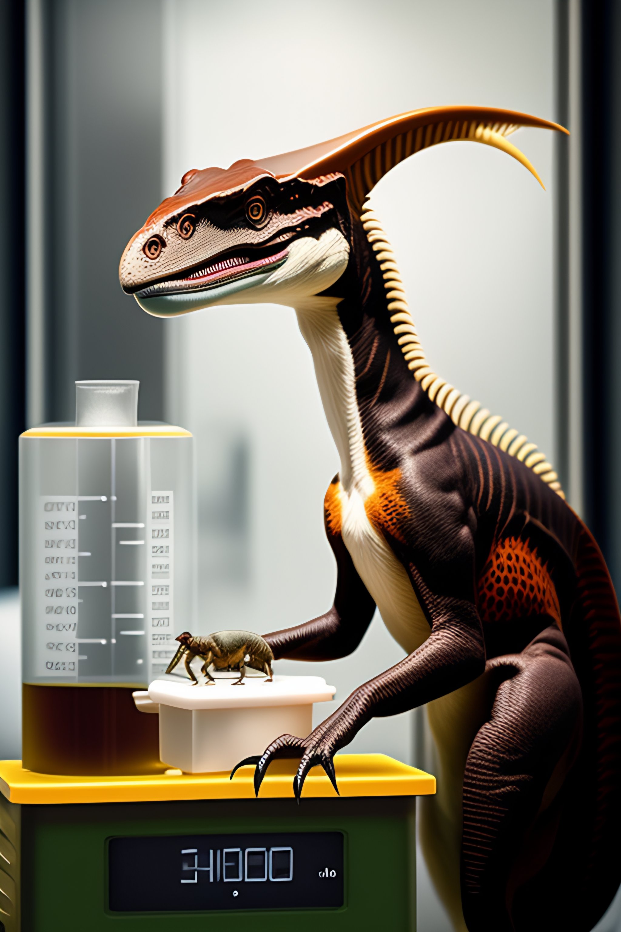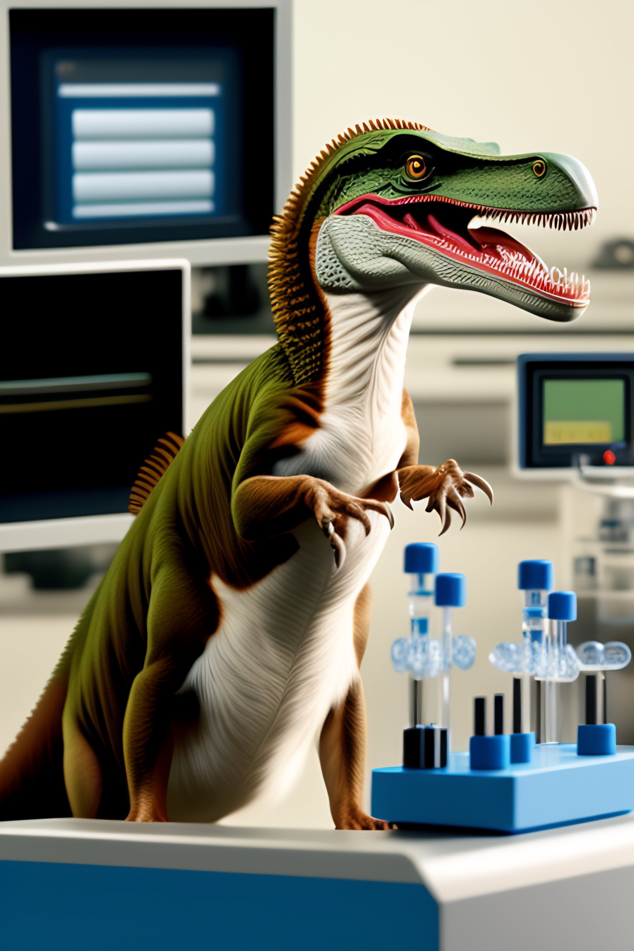 Velociraptor wearing lab equipment